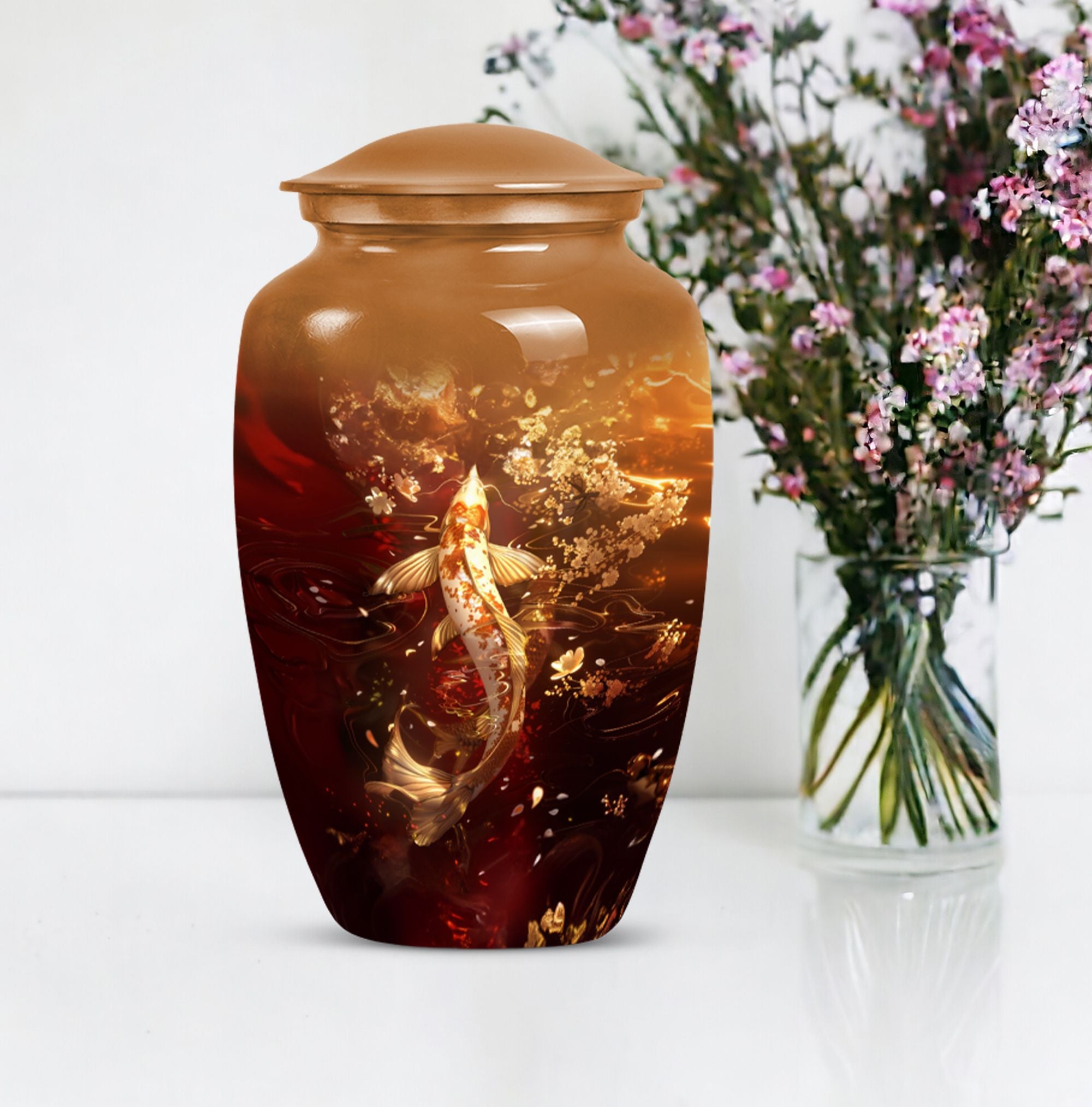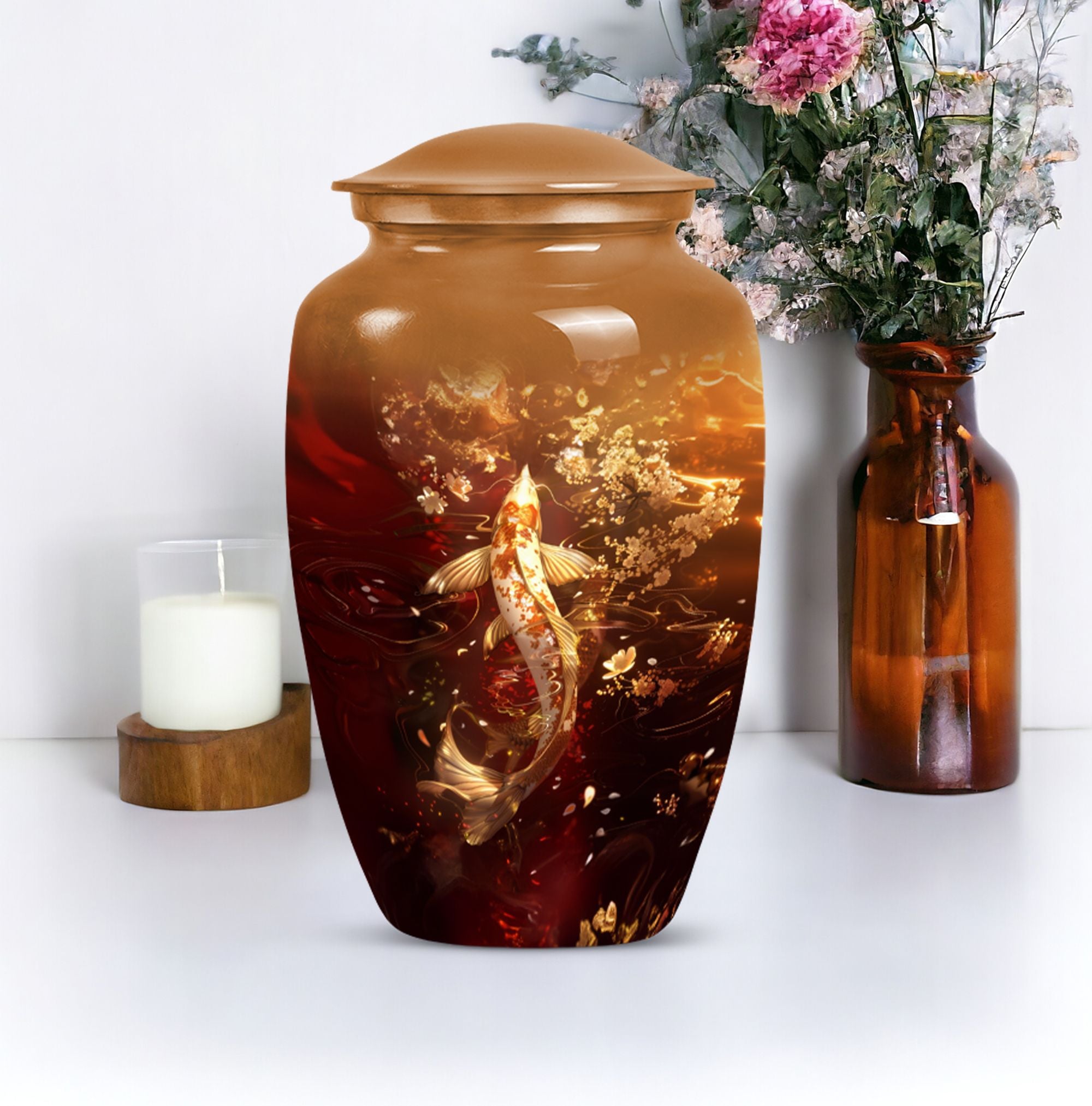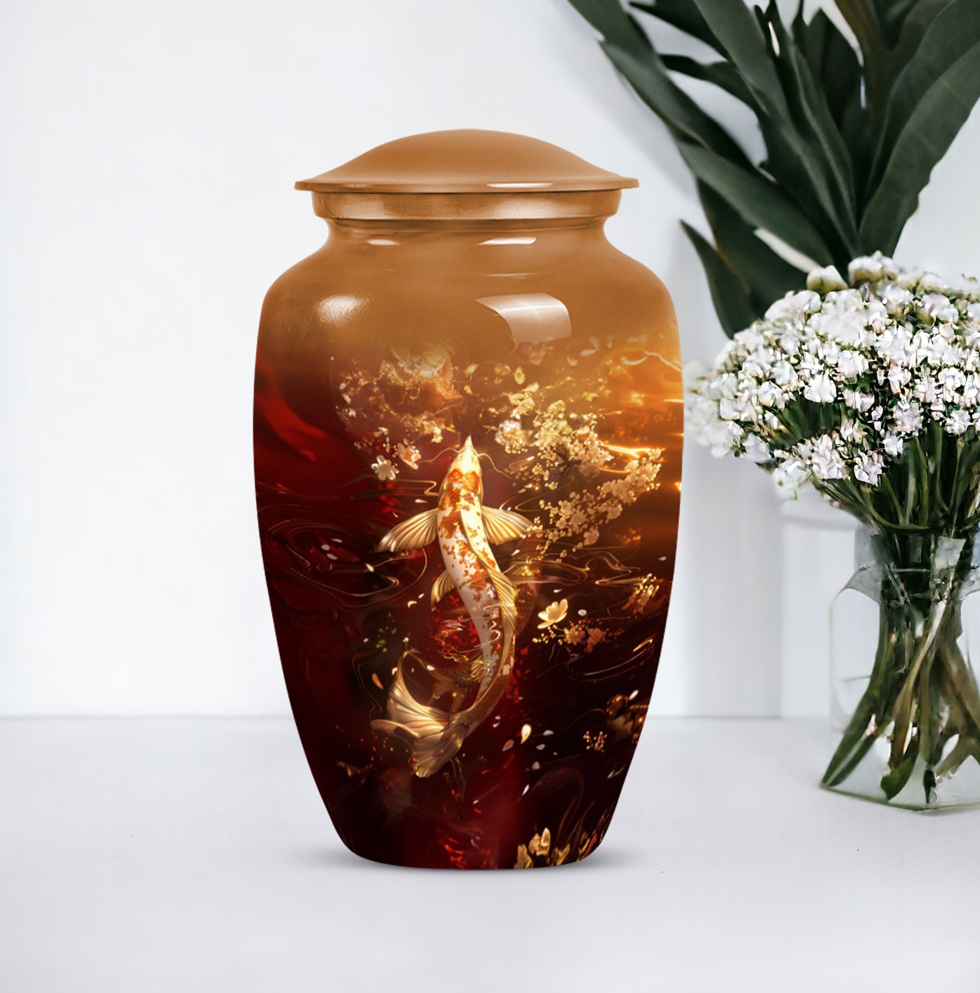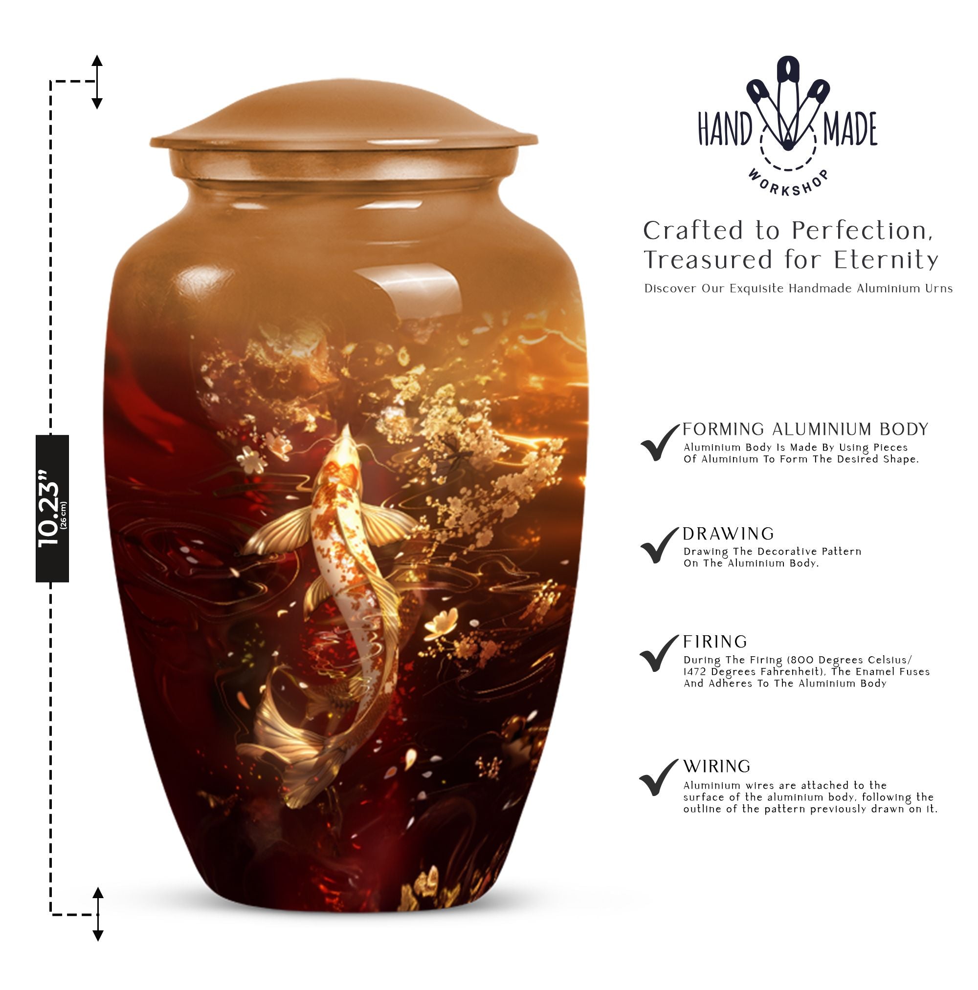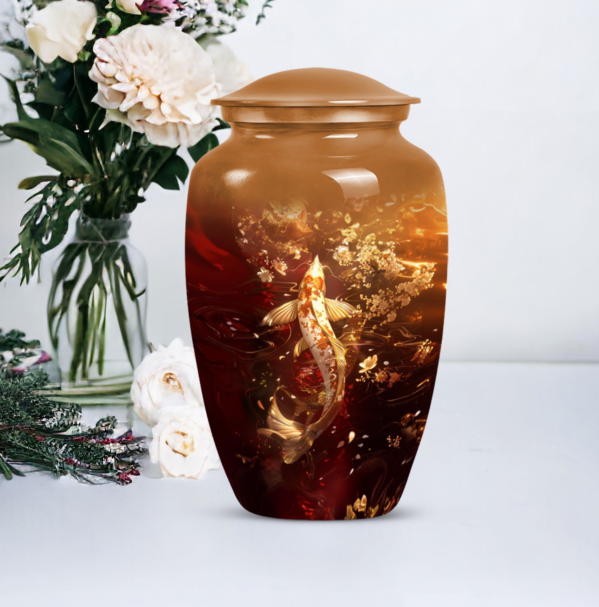 Cherish the memory of your loved ones with our elegantly crafted 10-inch Golden Fish urn for human ashes. This cremation urn is of the classic urn thematic design featuring butterflies, symbolizing peace, renewal, and the spirit's flight. Weighing roughly 3.3 pounds, it's made of high-quality aluminum ensuring it's built to last. The urn can easily hold up to 200 cubic inches which is more suitable for adults. This classic large urn provides you the option to personalize it with engraved names, making it unique for your loved one. Further, it comes with a velvet pouch for the containment of ashes, ensuring the precious content remains secured. This urn is a perfect blend of elegance and resilience and hence, an ideal funeral urn for both men and women. With the unique butterfly theme, this Metallic cremation urn is a tribute fitting for those who loved nature, making it one of the finest cremation urns for human ashes, perfect for memorial ceremonies.