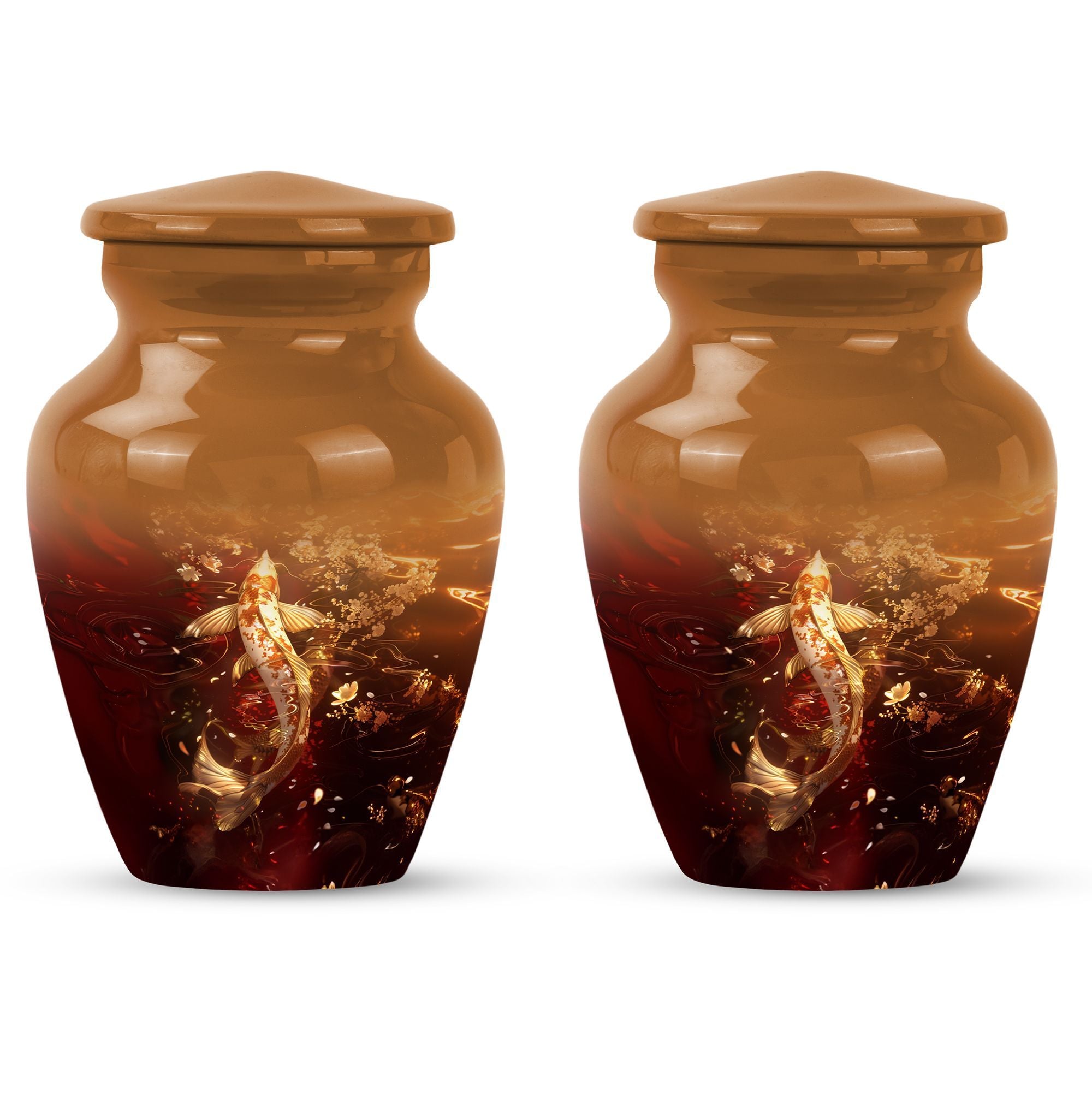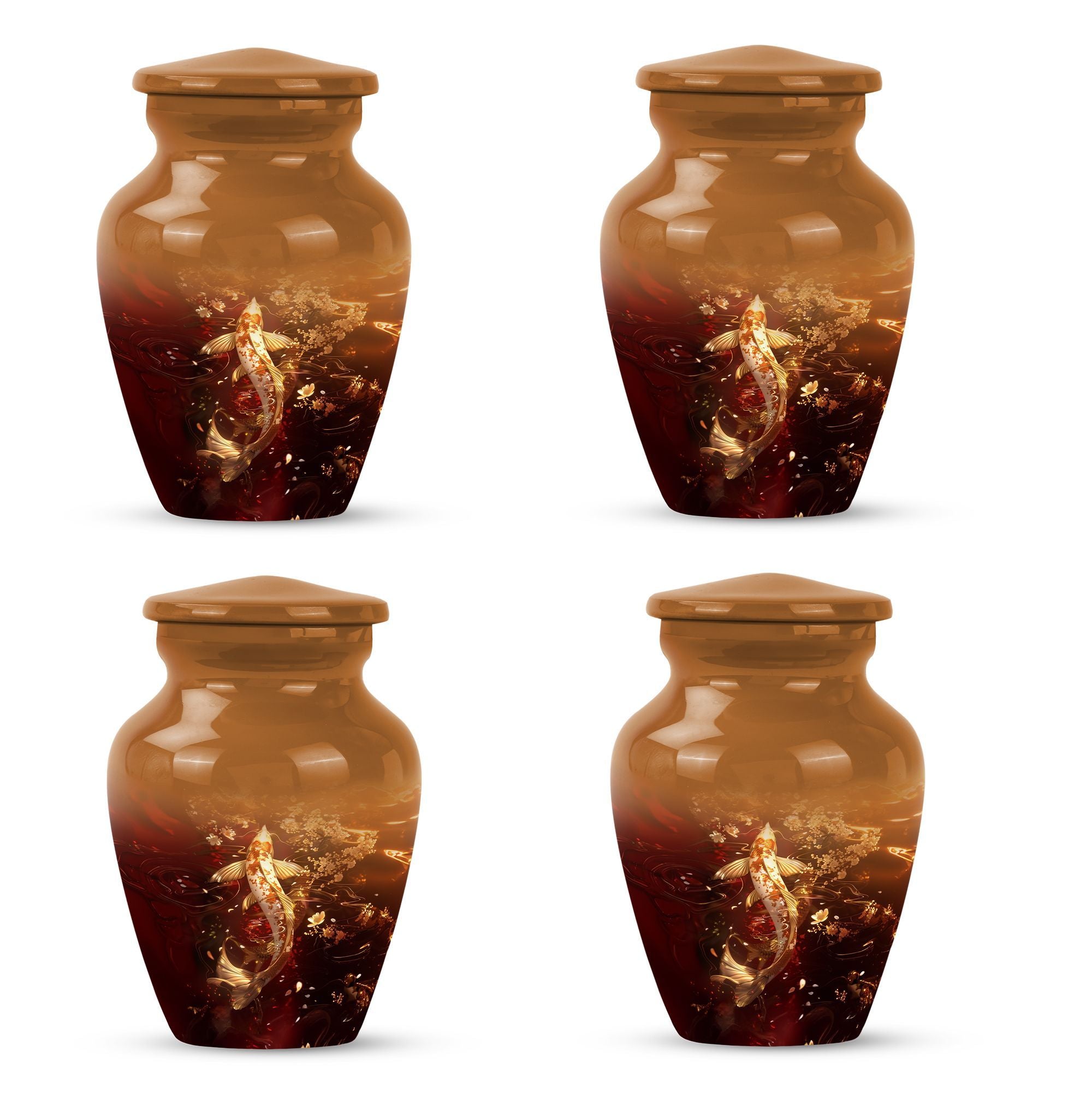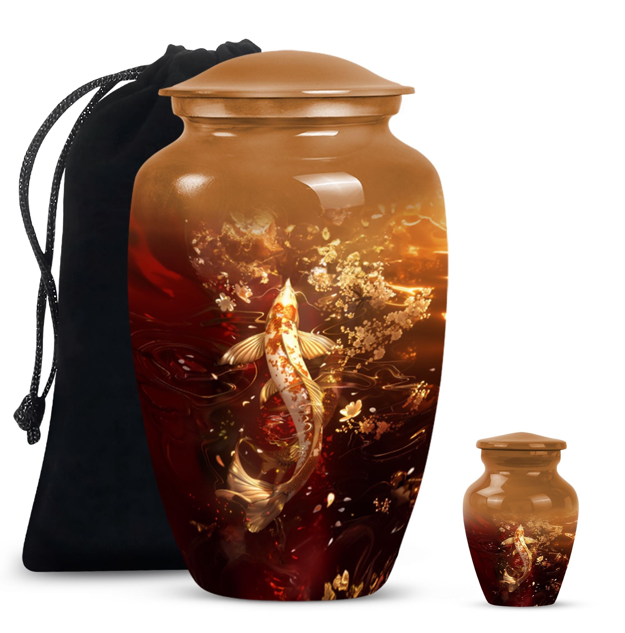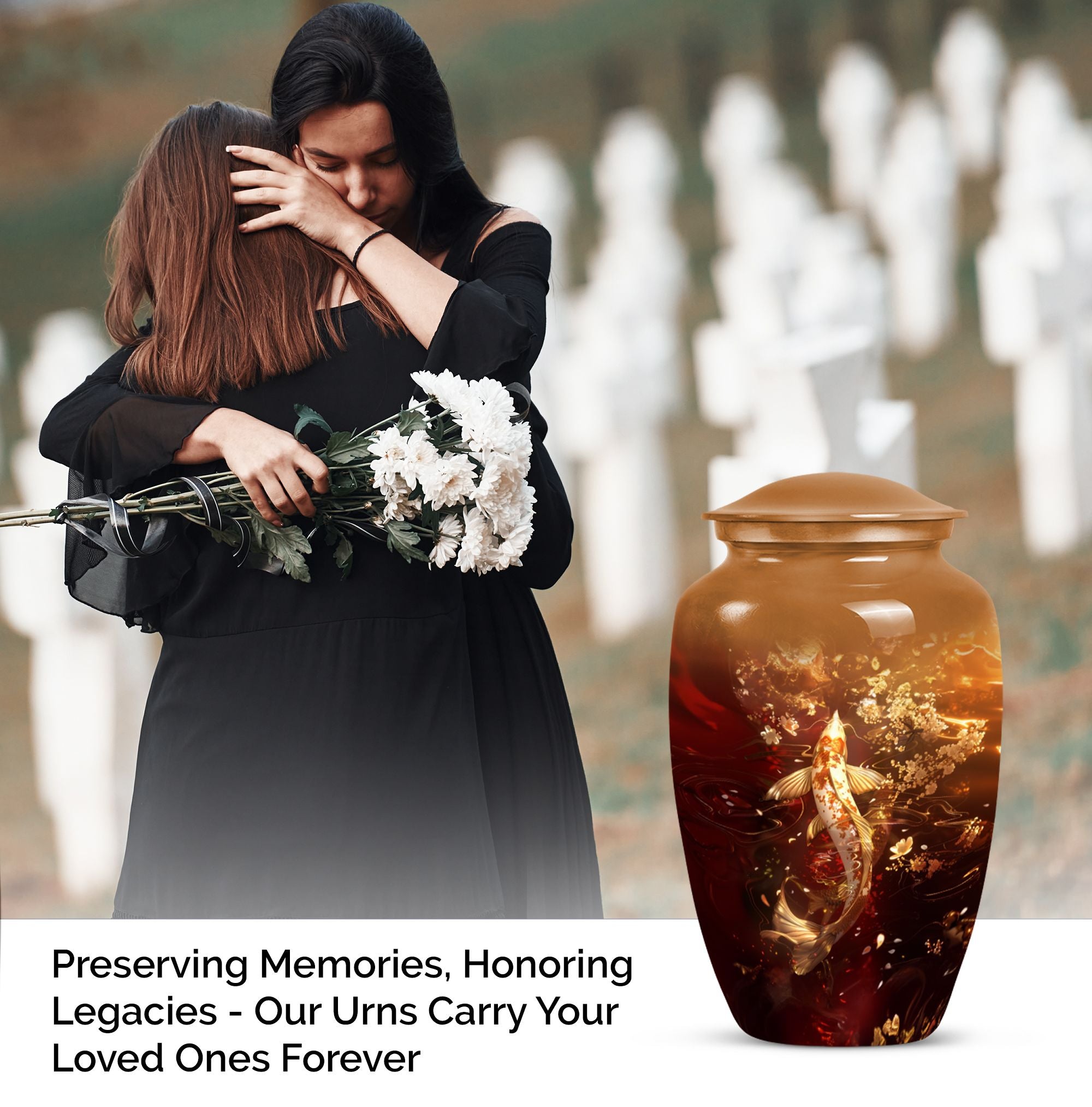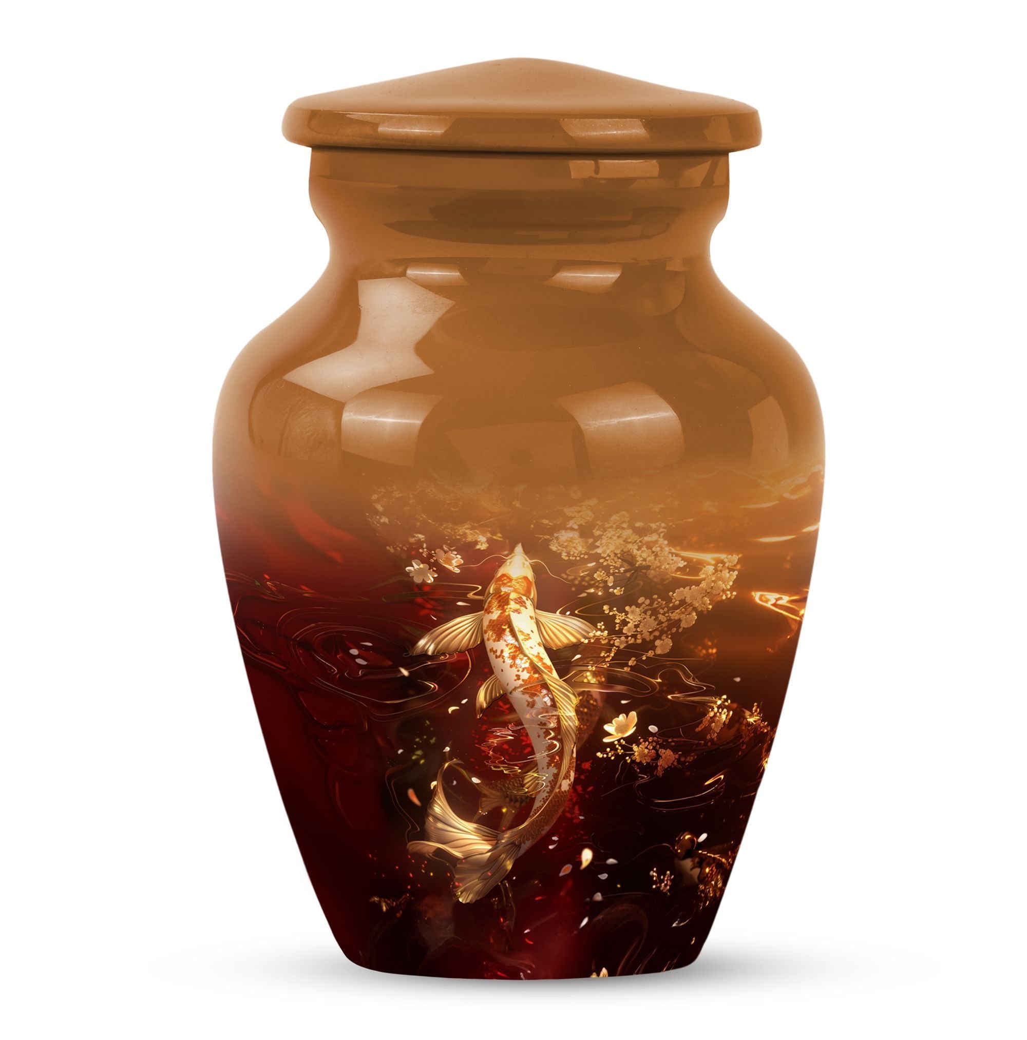 Cherish the memory of your loved ones with our elegantly crafted 10-inch Golden Fish urn for human ashes. This cremation urn is of the classic urn thematic design featuring butterflies, symbolizing peace, renewal, and the spirit's flight. Weighing roughly 3.3 pounds, it's made of high-quality aluminum ensuring it's built to last. The urn can easily hold up to 200 cubic inches which is more suitable for adults. This classic large urn provides you the option to personalize it with engraved names, making it unique for your loved one. Further, it comes with a velvet pouch for the containment of ashes, ensuring the precious content remains secured. This urn is a perfect blend of elegance and resilience and hence, an ideal funeral urn for both men and women. With the unique butterfly theme, this Metallic cremation urn is a tribute fitting for those who loved nature, making it one of the finest cremation urns for human ashes, perfect for memorial ceremonies.
