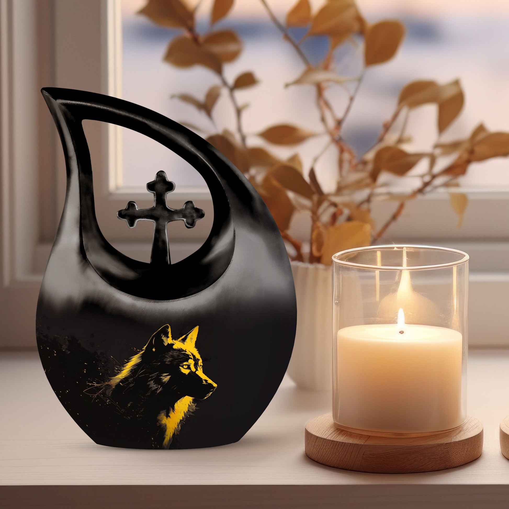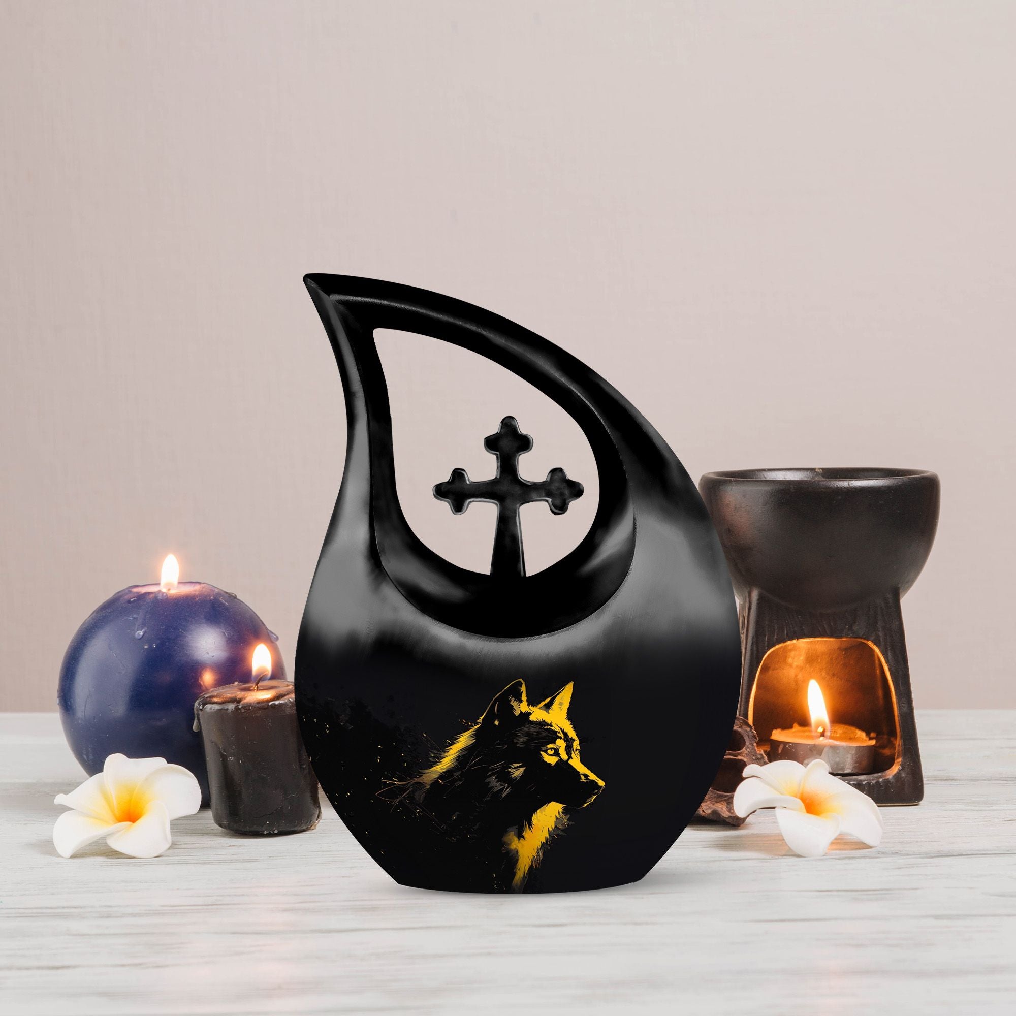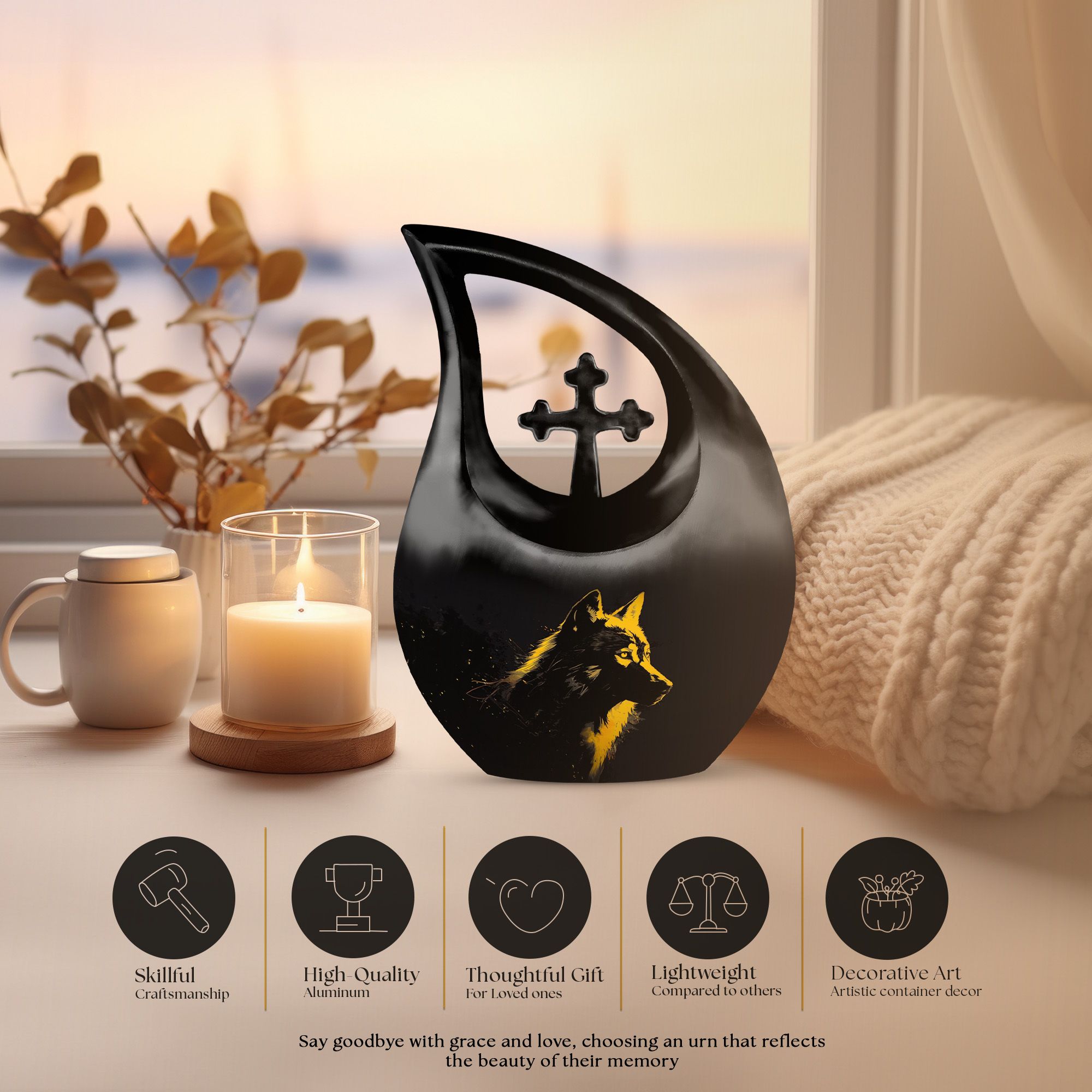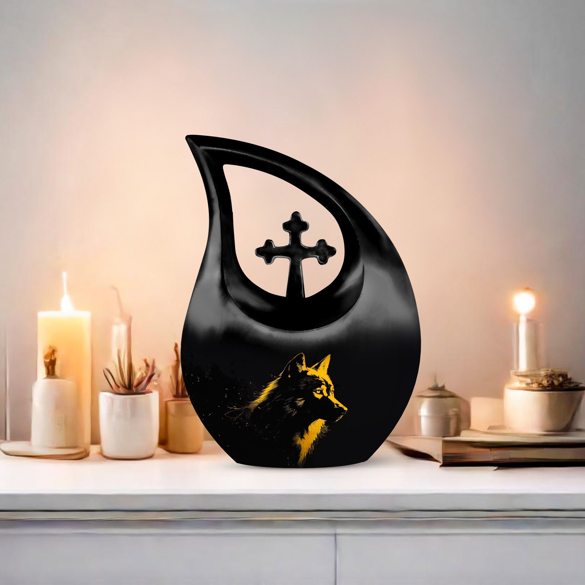 Embrace a timeless respect for loved ones lost with our Gold Nocturnal Aspect Urn. This beautifully rich and solemn piece measures a stately 10 inches in height with a capacity accommodating up to 200 cubic inches. This tranquility-evoking urn, ideal for adults and seniors, is crafted meticulously from robust aluminum. Its defining Cross Drop design establishes an enduring remembrance of the departed. The urn is just right in weight at 3.3 pounds, presenting no trouble for handling. Each purchase comes complete with a soft velvet pouch, assuring secure containment of your precious ashes. Our Gold Nocturnal Aspect Urn invites personal connection with a customizable engraving feature. Imprint the names of your dear departed and lend an individual touch to the exalted memorial. Cherish the memories uniquely with our Gold Nocturnal Aspect Urn - one of our smallest urns for mom, gracefully coupling function with aesthetic, perfect for peaceful remembrance. Being an essential in memorial ceremony supplies, this cremation urn for burial is more than just a vessel; it’s a tribute to love ever-lasting.