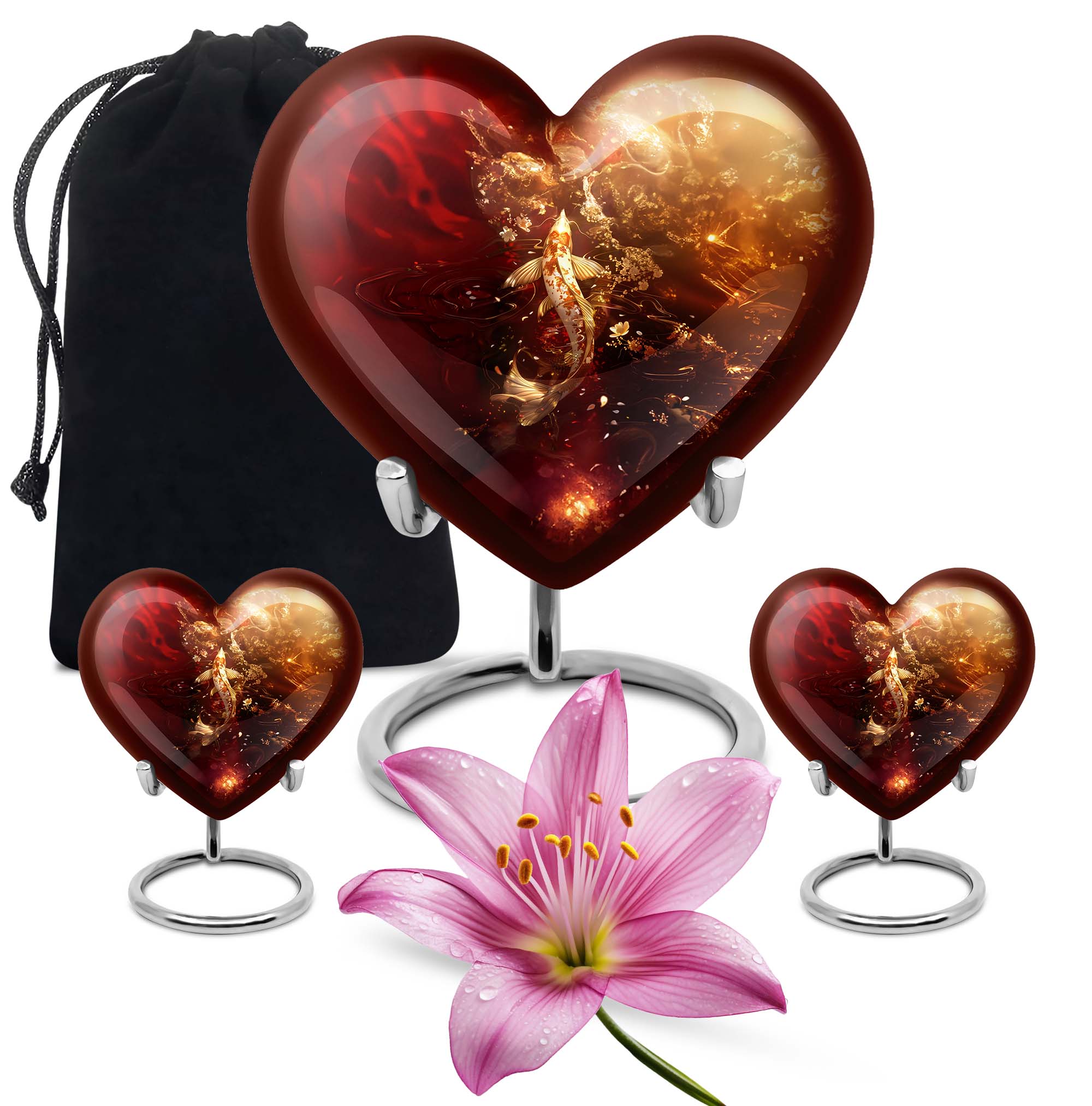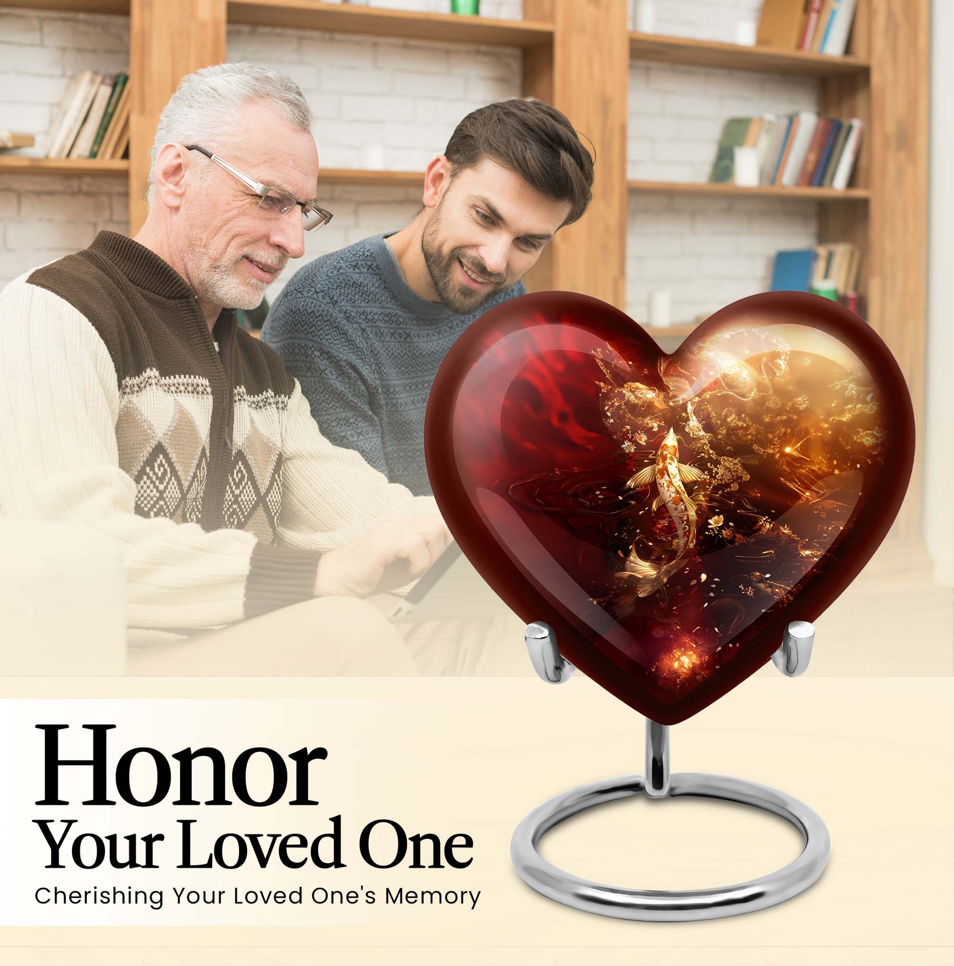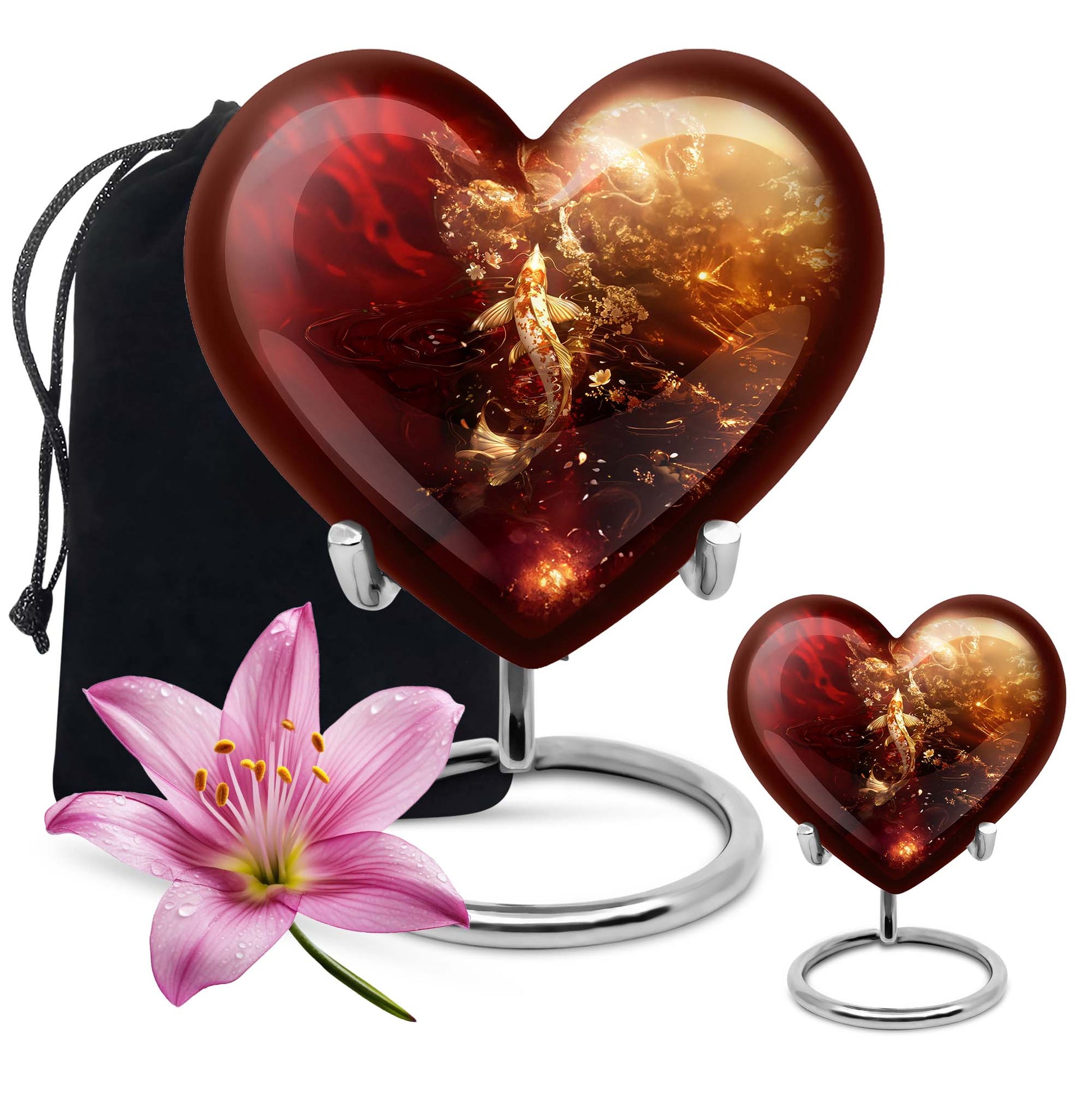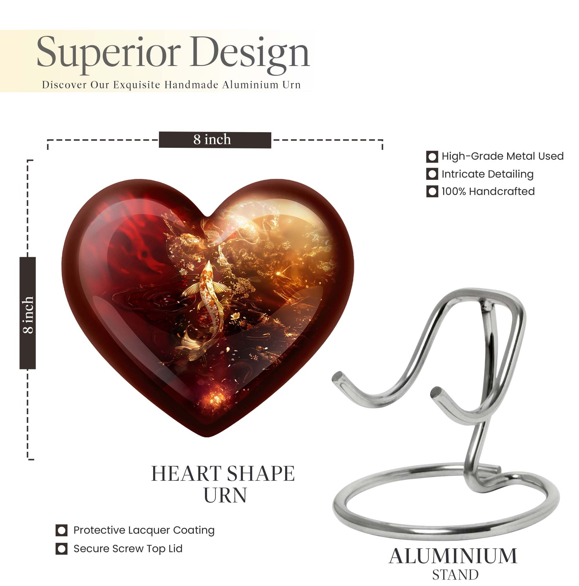 Honor and cherish the fond memories of your loved ones with our thoughtfully crafted 10-Inch Gold Fish Urn. Resonating with the tranquility of a heart design, it ebbs an enduring testament of temporal insignificance to the departed souls. Fabricated meticulously from durable Aluminium, this large urn weighs about 3.3 pounds and can hold up to 200 cubic inches of human ashes. It's not just another cremation urn; it's a tangible remembrance of the life lived. The urn's treasurable theme features a serene butterfly impression, invoking an essence of everlasting spiritual connection. To make it even more special, you have the option to personalize it with engraved names. Your purchase includes a velvet pouch, ideal for the containment of ashes. This peaceful symbol, often searched as 'cremation urns for men' and 'funeral urns for women', serves as an eternal resting place for your lost beloved. Despite the pain of loss, the Heart Urn is a sweet consolation that they are in a better place. Make this heart urn a part of your memorial ceremony supplies today.