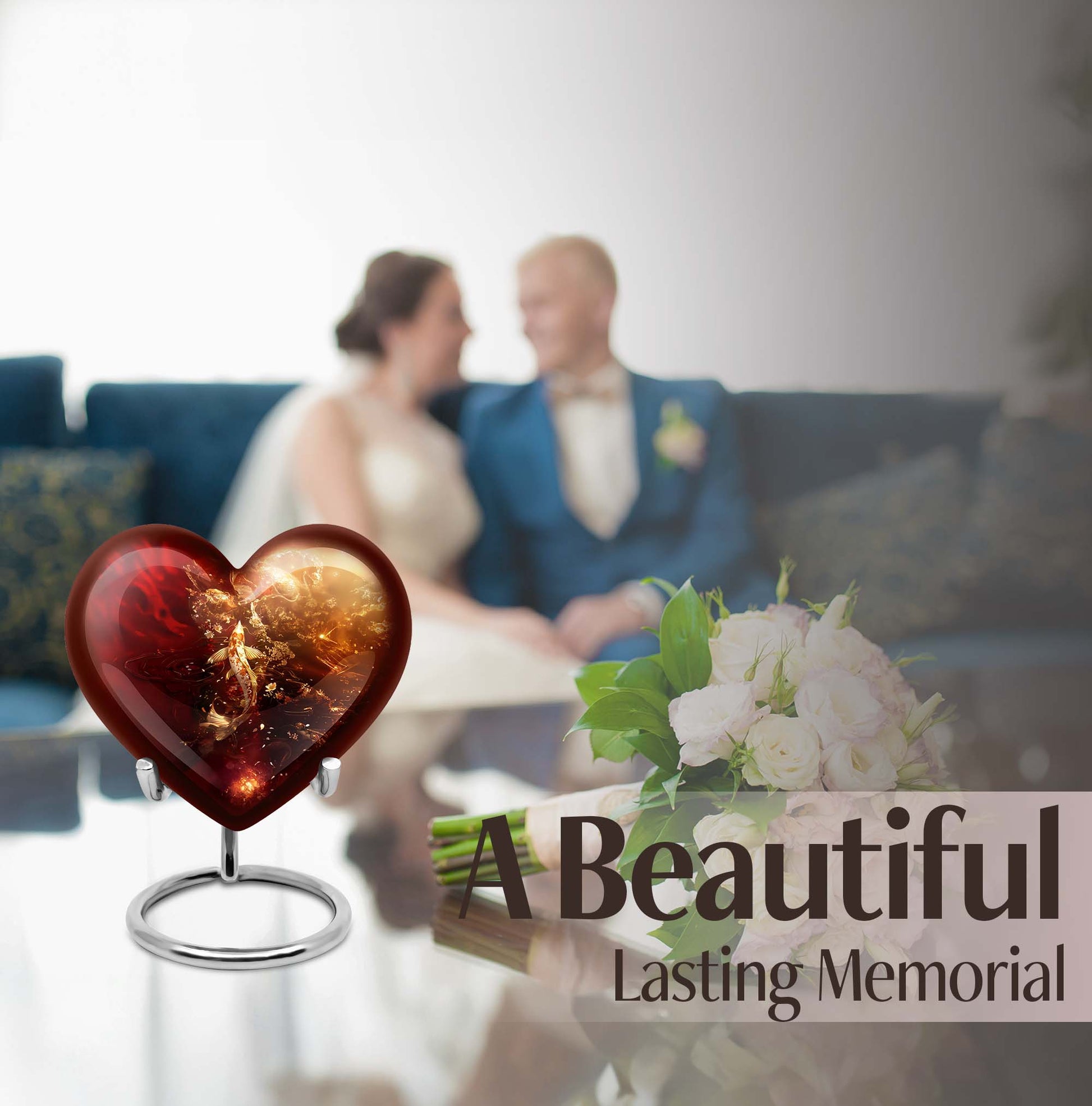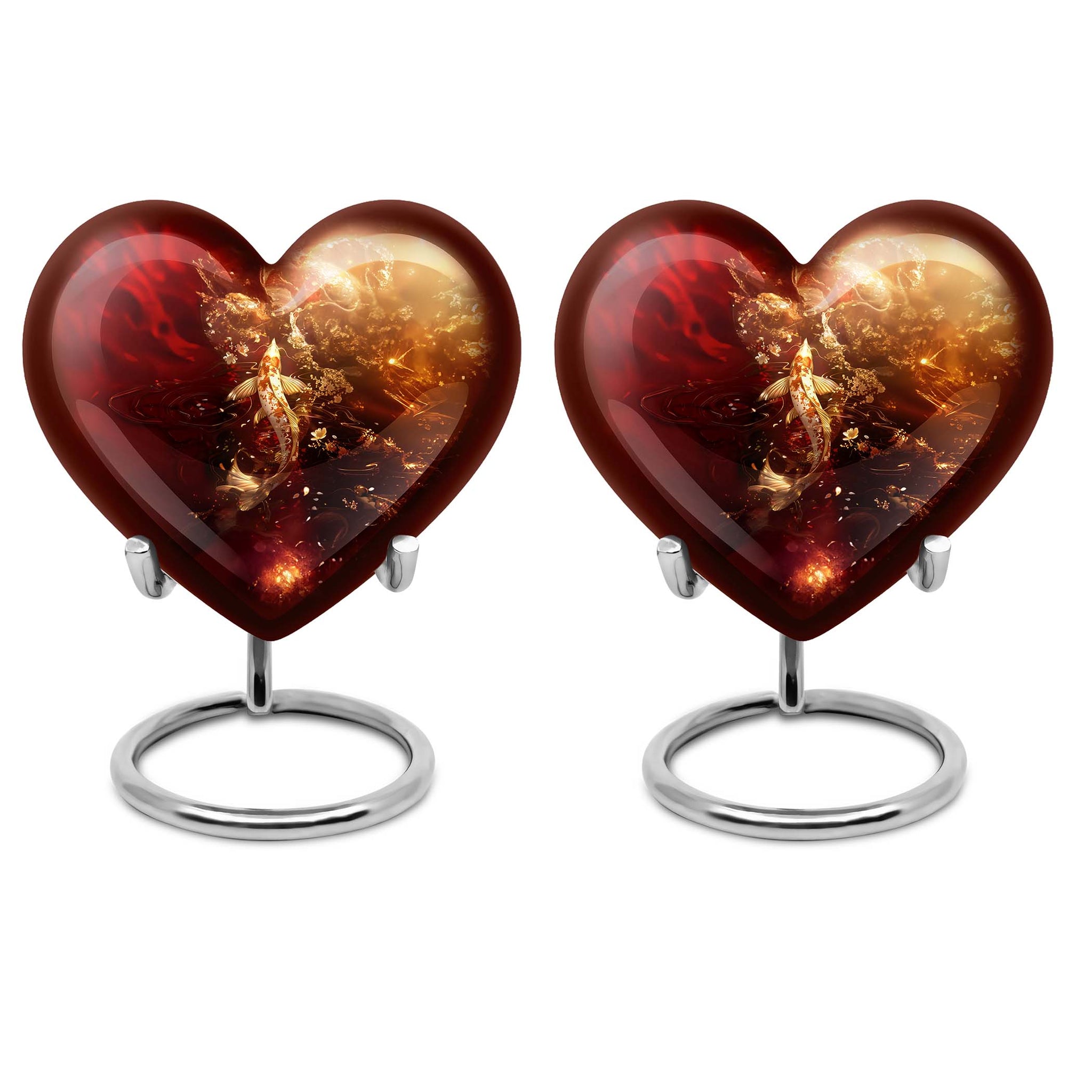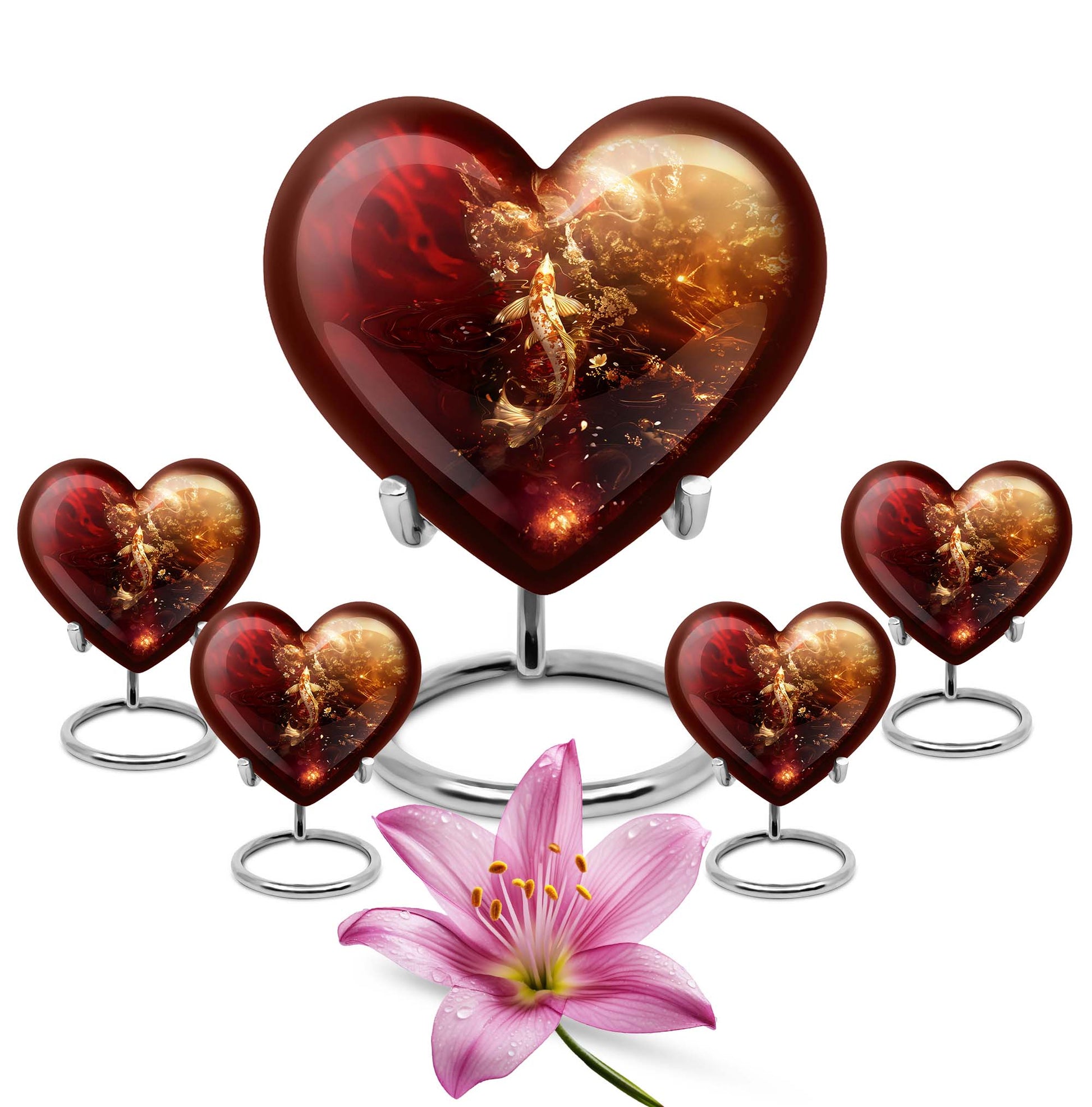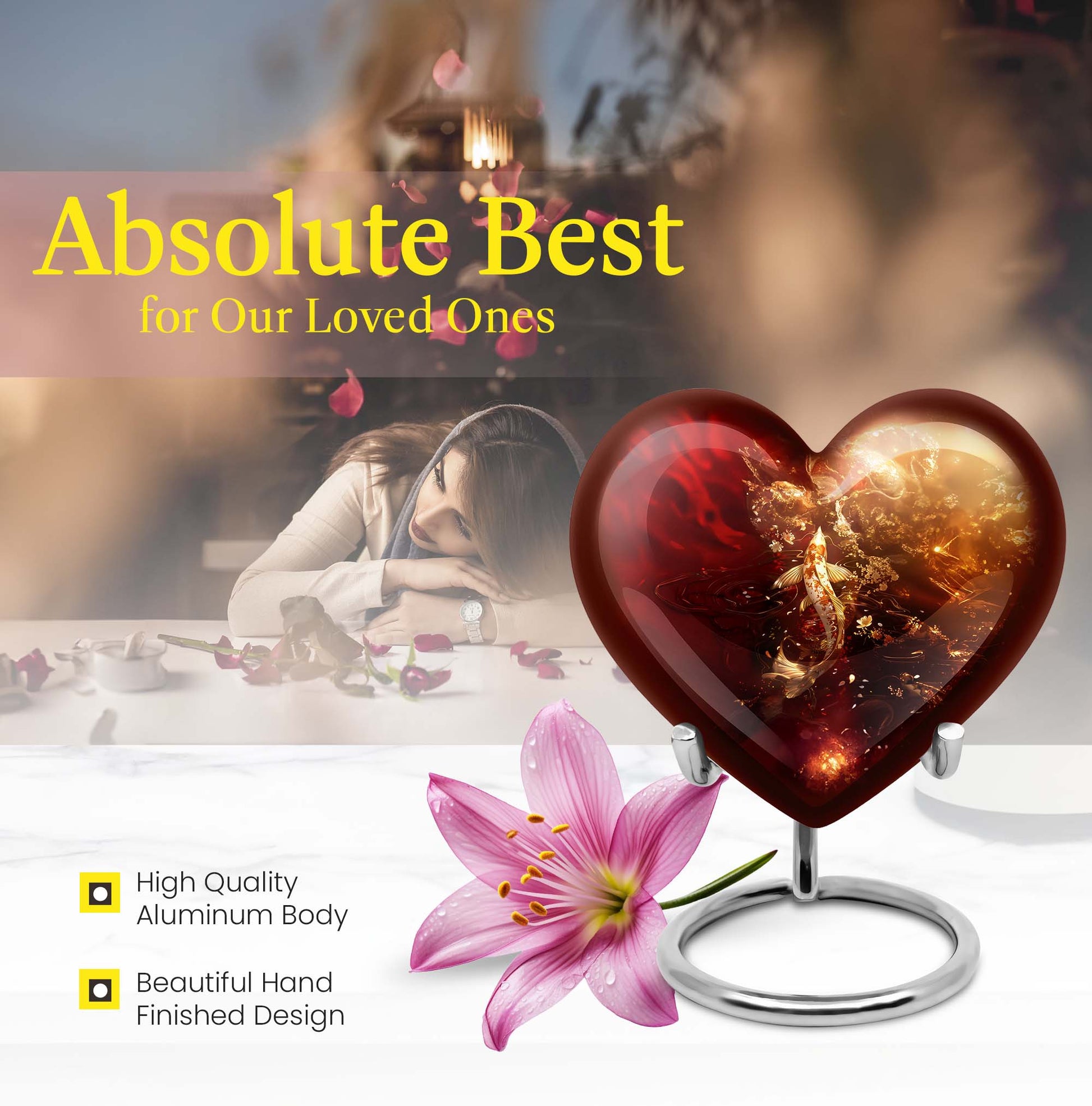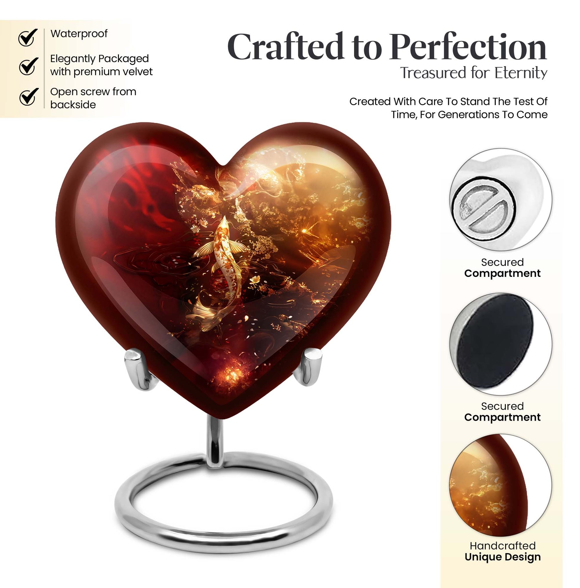 Honor and cherish the fond memories of your loved ones with our thoughtfully crafted 10-Inch Gold Fish Urn. Resonating with the tranquility of a heart design, it ebbs an enduring testament of temporal insignificance to the departed souls. Fabricated meticulously from durable Aluminium, this large urn weighs about 3.3 pounds and can hold up to 200 cubic inches of human ashes. It's not just another cremation urn; it's a tangible remembrance of the life lived. The urn's treasurable theme features a serene butterfly impression, invoking an essence of everlasting spiritual connection. To make it even more special, you have the option to personalize it with engraved names. Your purchase includes a velvet pouch, ideal for the containment of ashes. This peaceful symbol, often searched as 'cremation urns for men' and 'funeral urns for women', serves as an eternal resting place for your lost beloved. Despite the pain of loss, the Heart Urn is a sweet consolation that they are in a better place. Make this heart urn a part of your memorial ceremony supplies today.