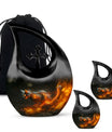 Expertly made from premium ceramic, this pet urn box showcases a sculpted cat figure surrounded by golden and ember-toned flame motifs. Its polished surface and handcrafted detailing reflect elegance and strength. The secure screw-top lid ensures ashes remain safely enclosed, while the smooth finish adds sophistication, placing it among the best cat urns available today.