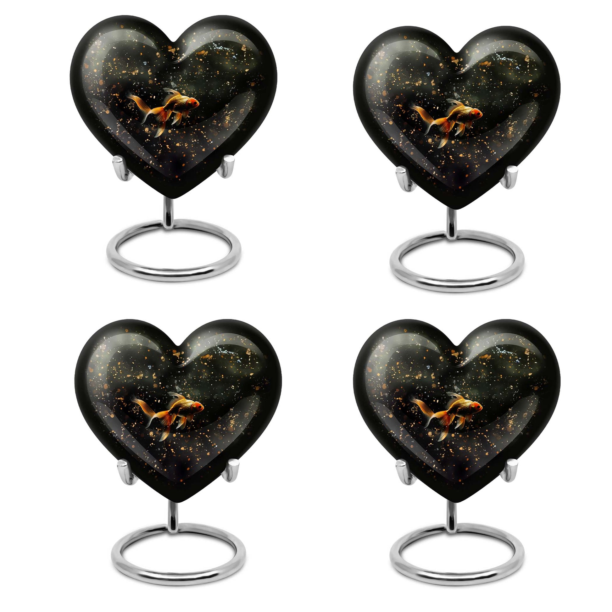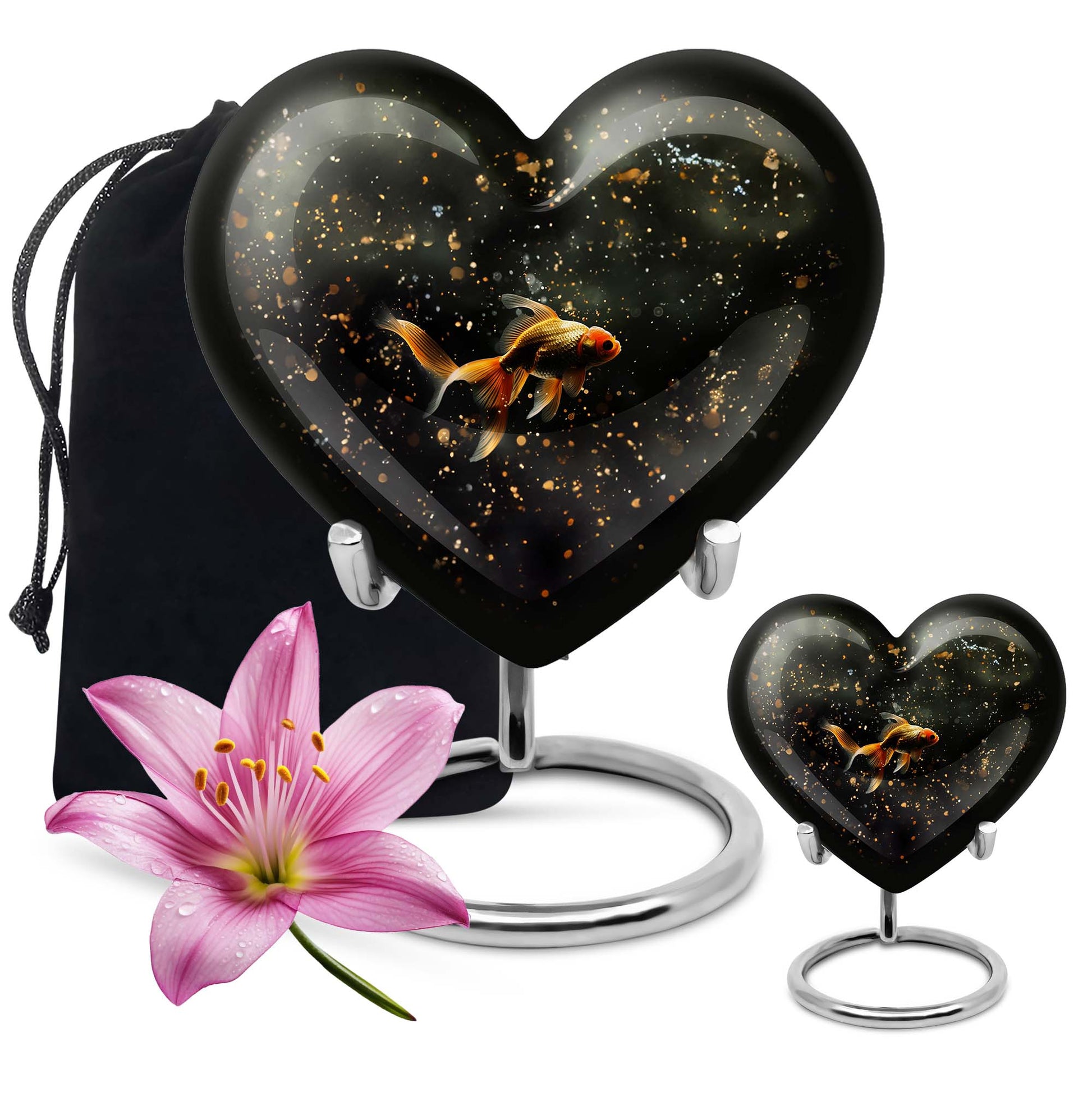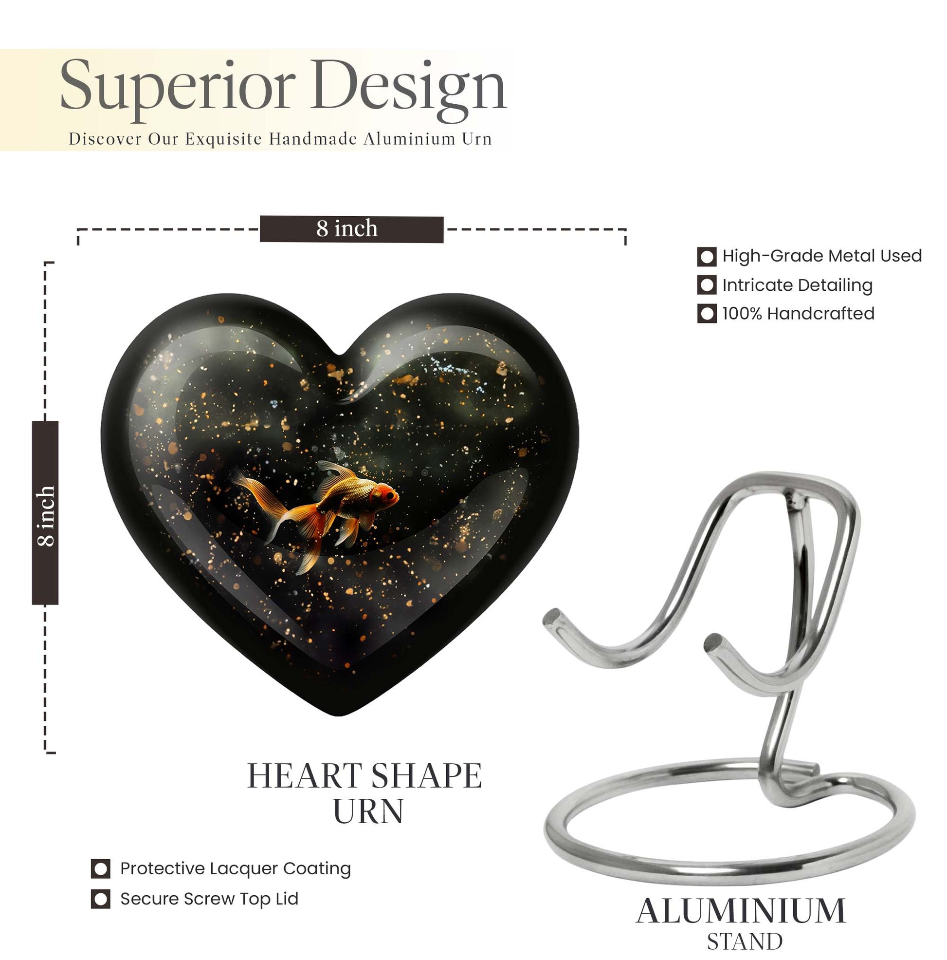 Commemorate your loved ones with our stunning 10-inch gold fish urn, the perfect resting place for cremation ashes. This ethereal heart urn, crafted from durable aluminium, embodies a tender motif of delicate butterflies, symbolizing transformation and rebirth. With an impressive capacity of 200 cubic inches, it is categorized among the large urns, accommodating adult human ashes subtly and respectfully. Weighing 3.3 pounds, this burial urn stands majestically at a height of 10 inches. Personalize this urn with the names of your dearly departed, adding a layer of intimacy and fond remembrance. Moreover, the urn is accompanied by a velvet pouch that serves as a dignified containment for the ashes. Honor your departed with this memorable piece that artistically combines a sacred aura with tasteful aesthetics. Frequently searched under 'memorial urns', 'cremation urns for burial', or 'cremation urn for human ashes', this urn serves as a testament to life lived and cherished.