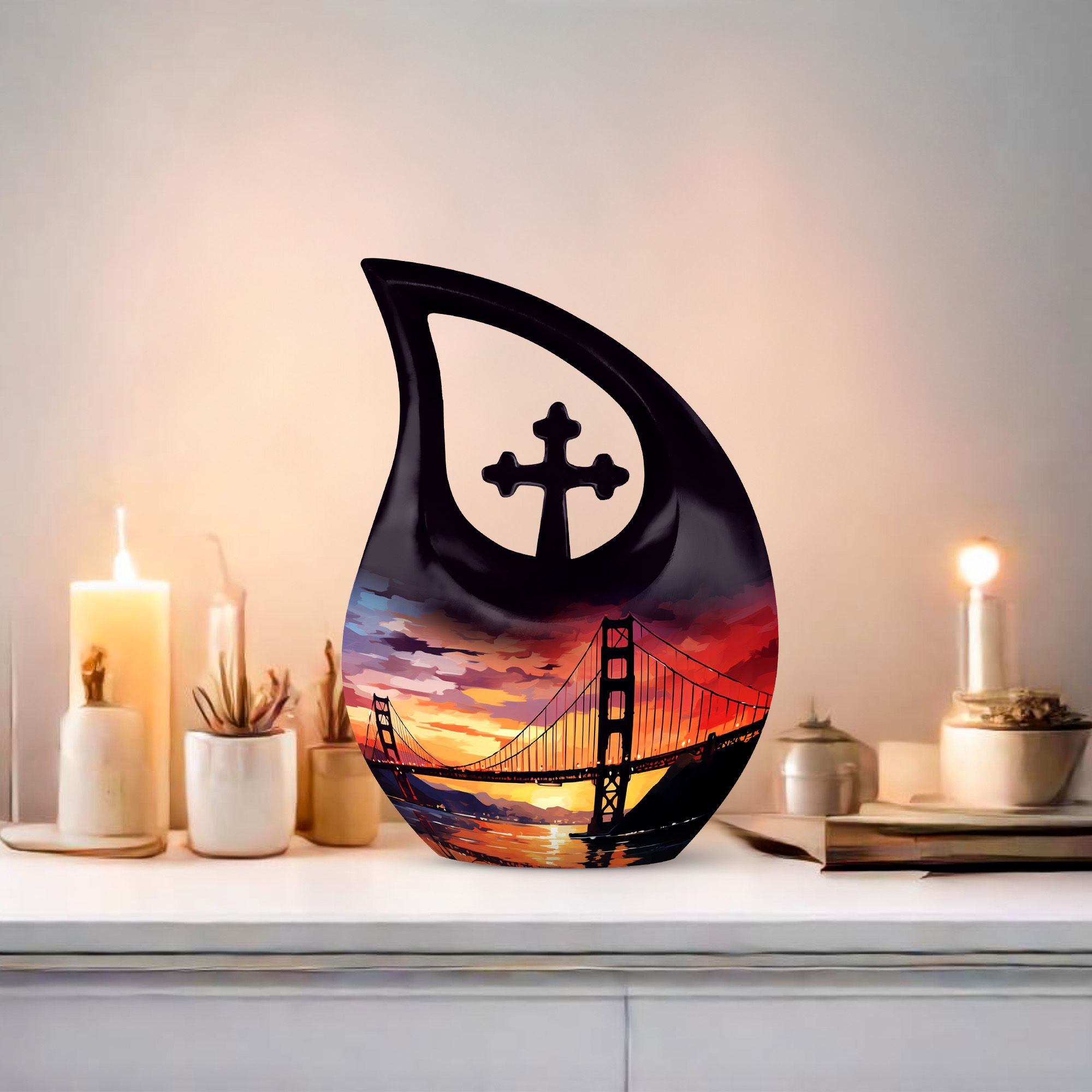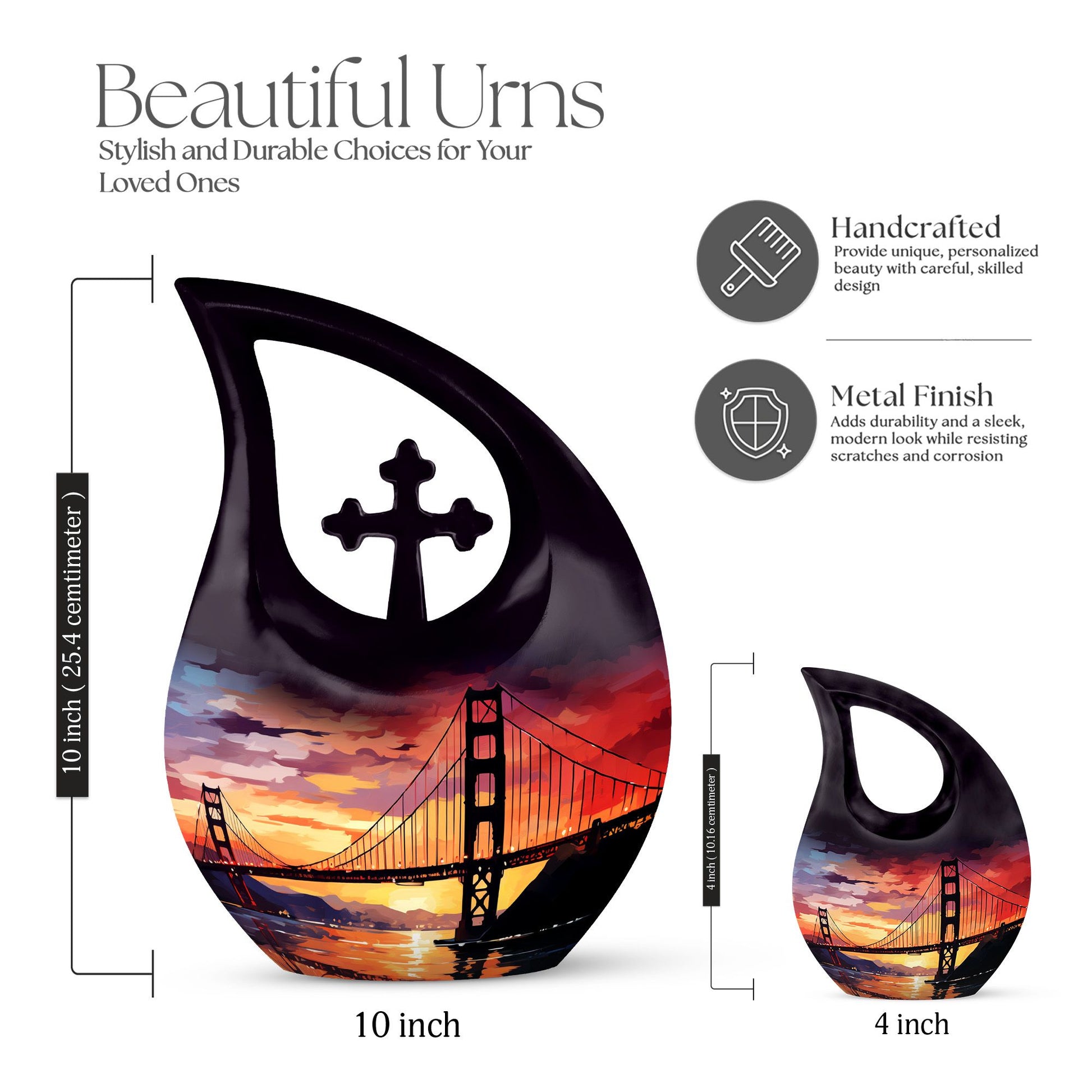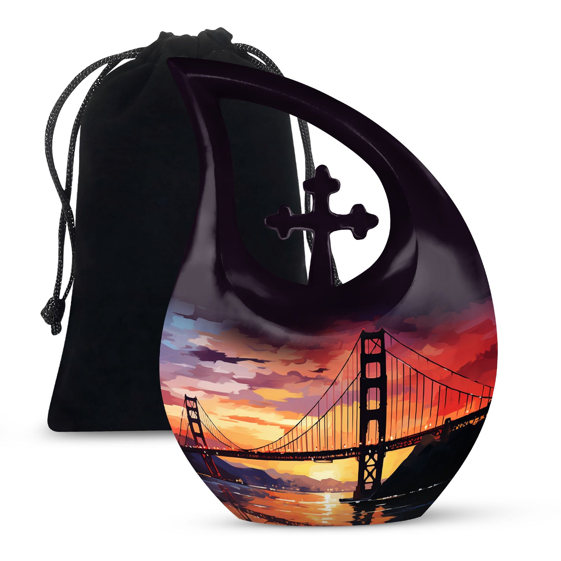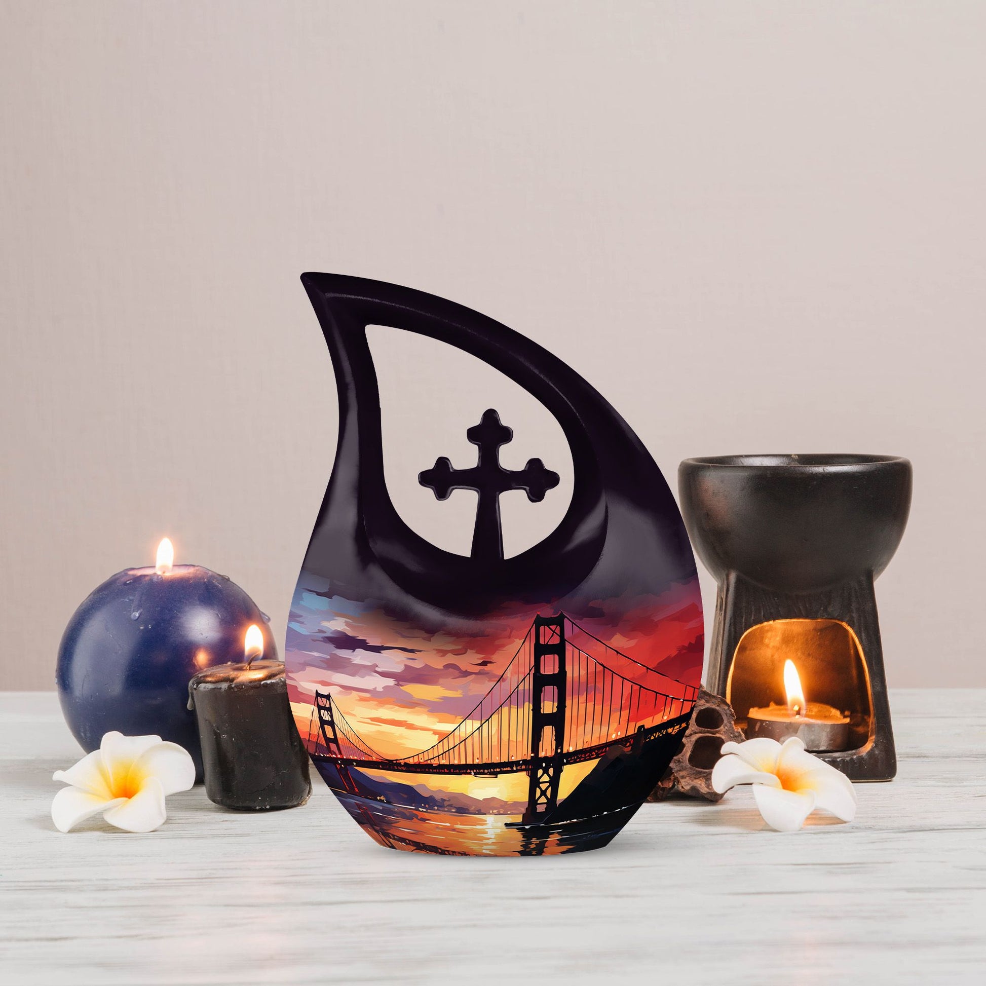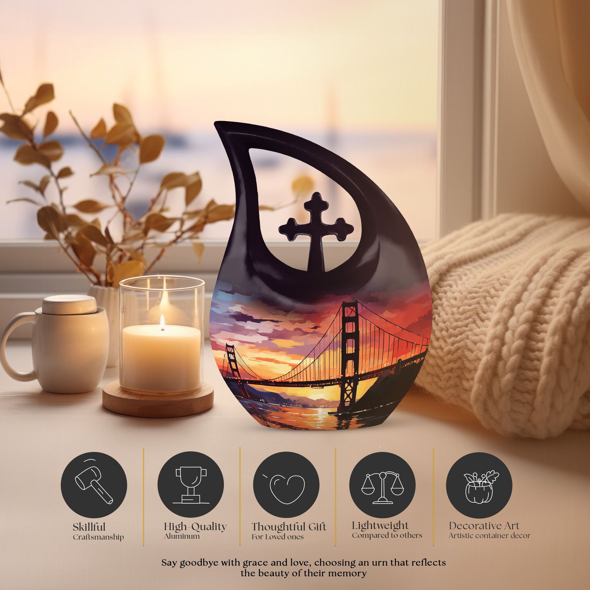 Honor the memory of your dear one with the Golden Gate Bridge Urn, a thoughtful choice in memorial urns. Crafted from durable aluminium, this 10-inch urn offers a remarkable capacity of 200 cubic inches, ensuring a tangible tribute to your beloved family member. Weighing in at 3.3 pounds, its substantive feel is a comforting reminder of the presence your loved one held in life. The Cross Drop theme uniquely signifies the hope and faith that carries us through times of loss, and with the possibility to personalize through engraving, the urn can be deeply meaningful for both men and women. Additionally, the urn comes with a luxurious velvet pouch for respectful containment of ashes. From loved ones ashes keepsakes to unique urns for dad, this Large Urn is an ideal choice, offering comfort and solace during a difficult time. Enrich your online search with keywords such as 'cremation box for ashes' or 'medium size urn for human ashes' for optimal results.