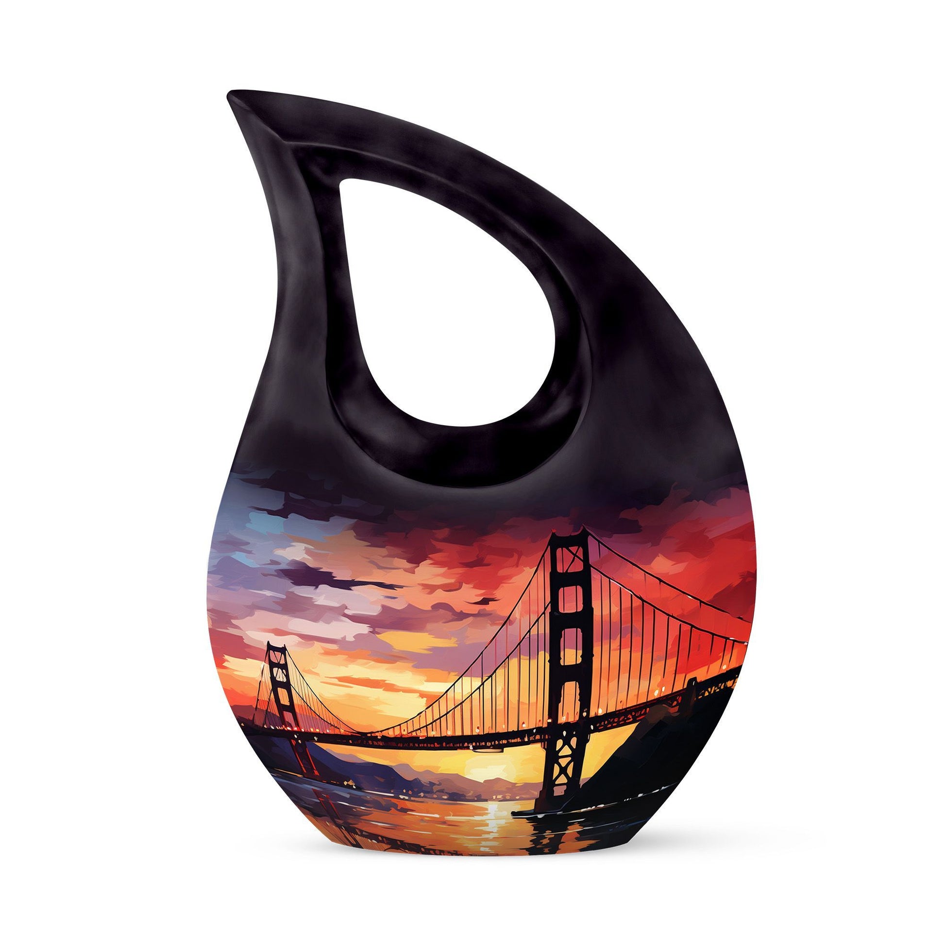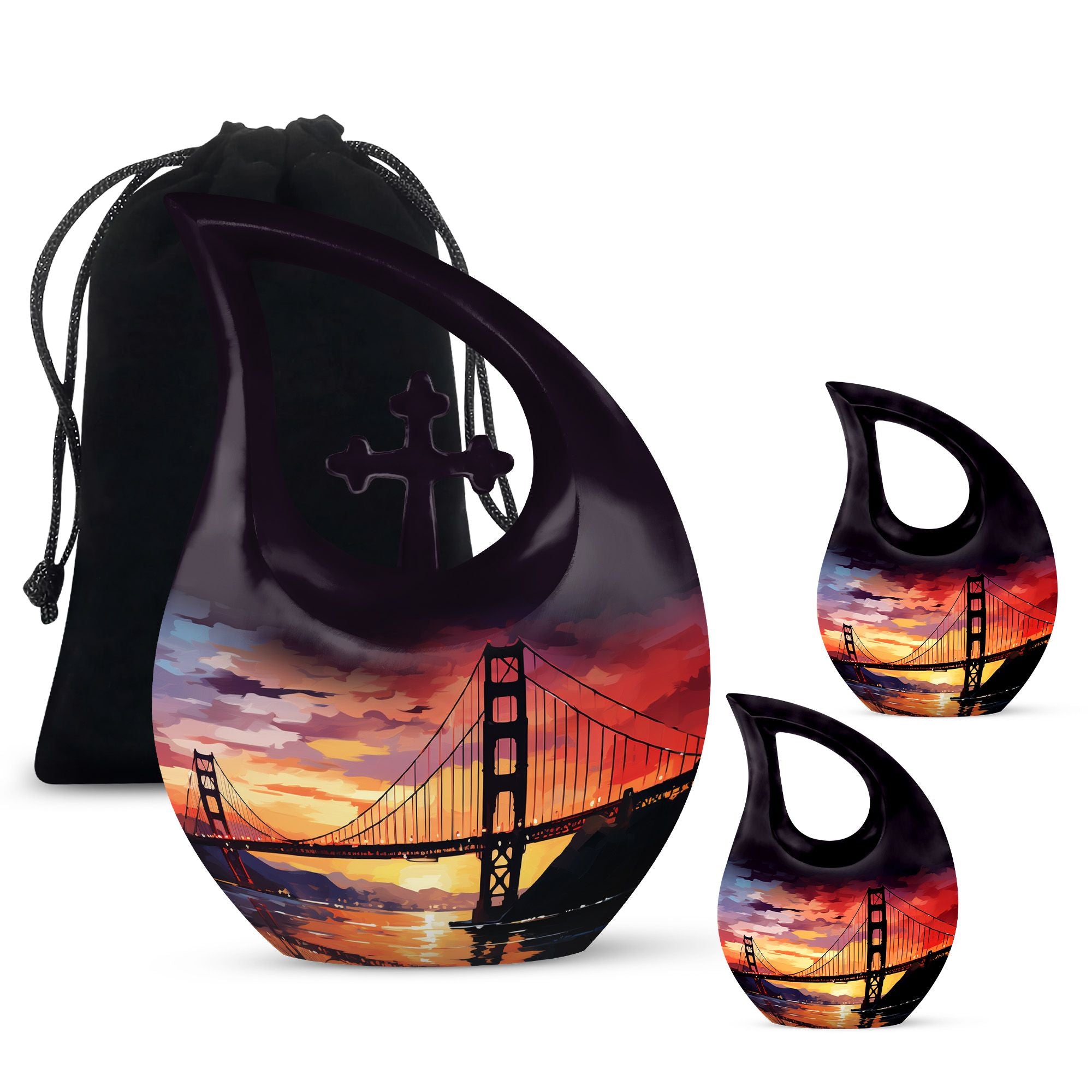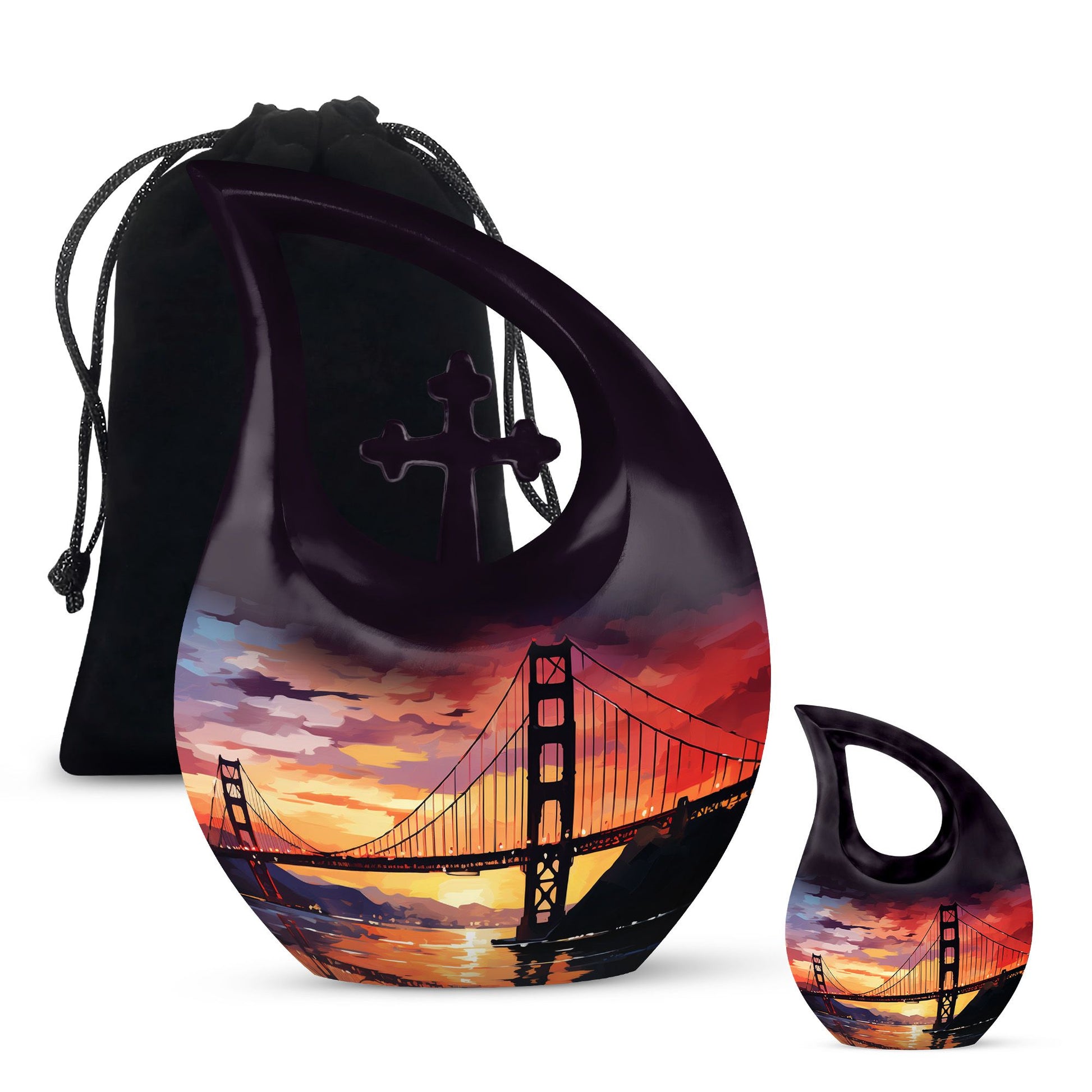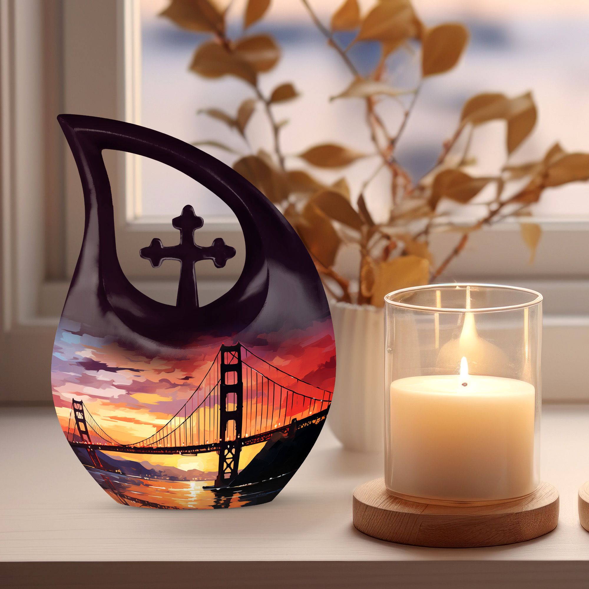 Honor the memory of your dear one with the Golden Gate Bridge Urn, a thoughtful choice in memorial urns. Crafted from durable aluminium, this 10-inch urn offers a remarkable capacity of 200 cubic inches, ensuring a tangible tribute to your beloved family member. Weighing in at 3.3 pounds, its substantive feel is a comforting reminder of the presence your loved one held in life. The Cross Drop theme uniquely signifies the hope and faith that carries us through times of loss, and with the possibility to personalize through engraving, the urn can be deeply meaningful for both men and women. Additionally, the urn comes with a luxurious velvet pouch for respectful containment of ashes. From loved ones ashes keepsakes to unique urns for dad, this Large Urn is an ideal choice, offering comfort and solace during a difficult time. Enrich your online search with keywords such as 'cremation box for ashes' or 'medium size urn for human ashes' for optimal results.