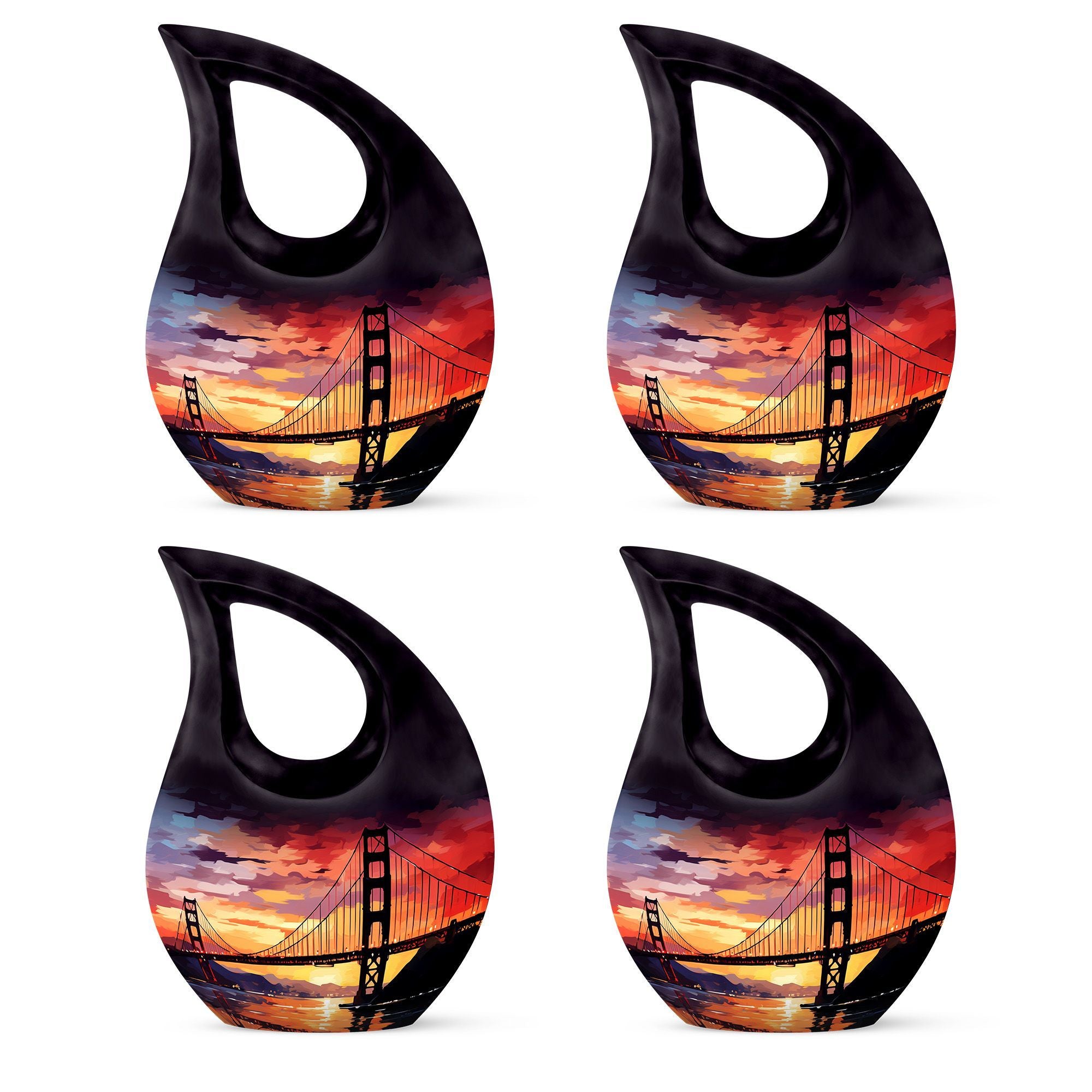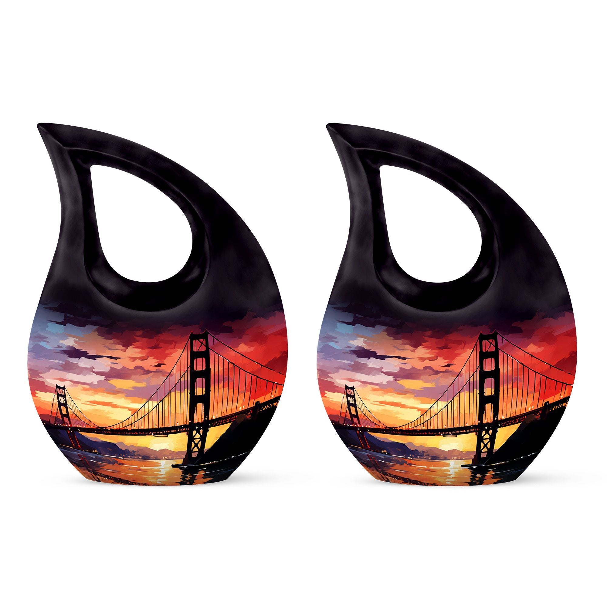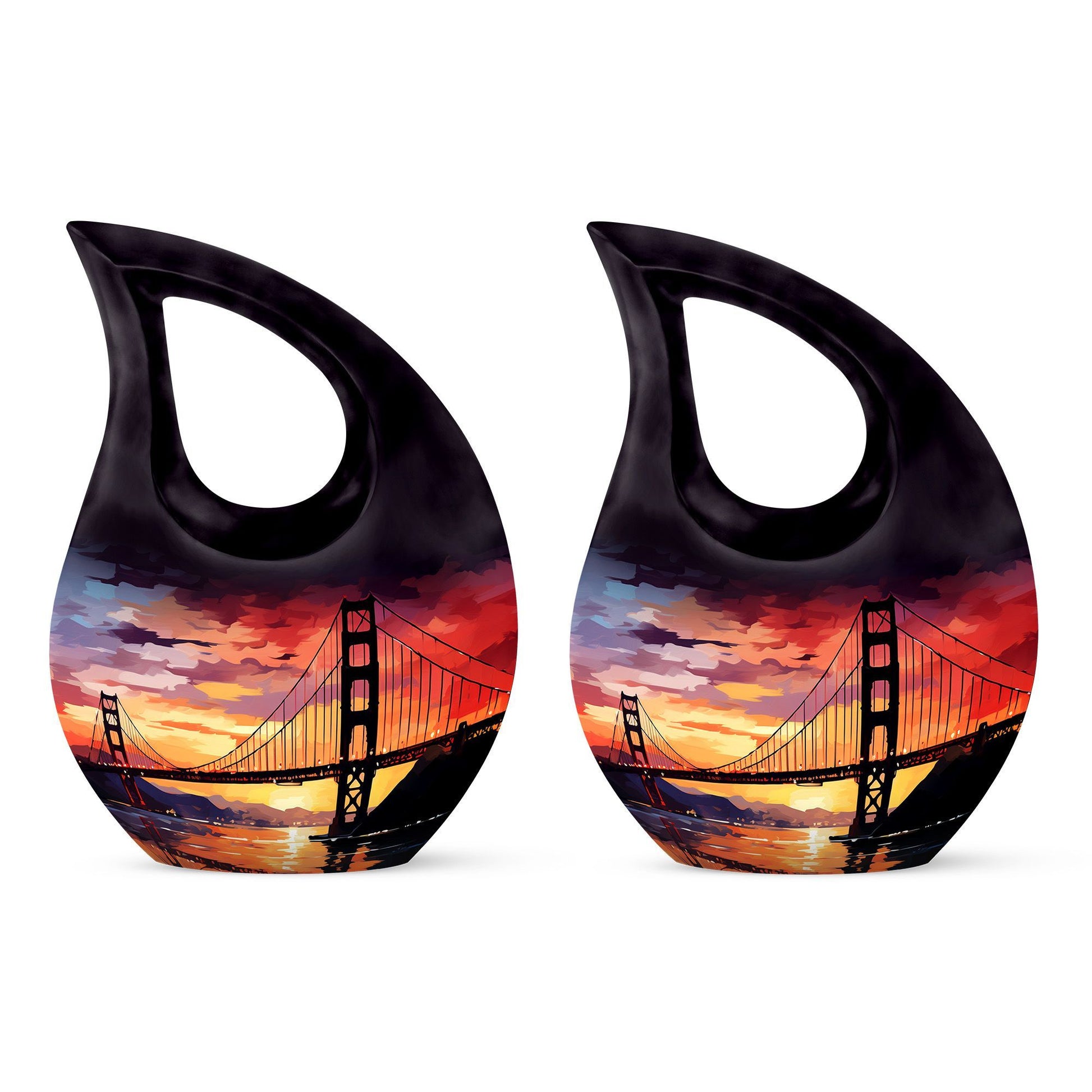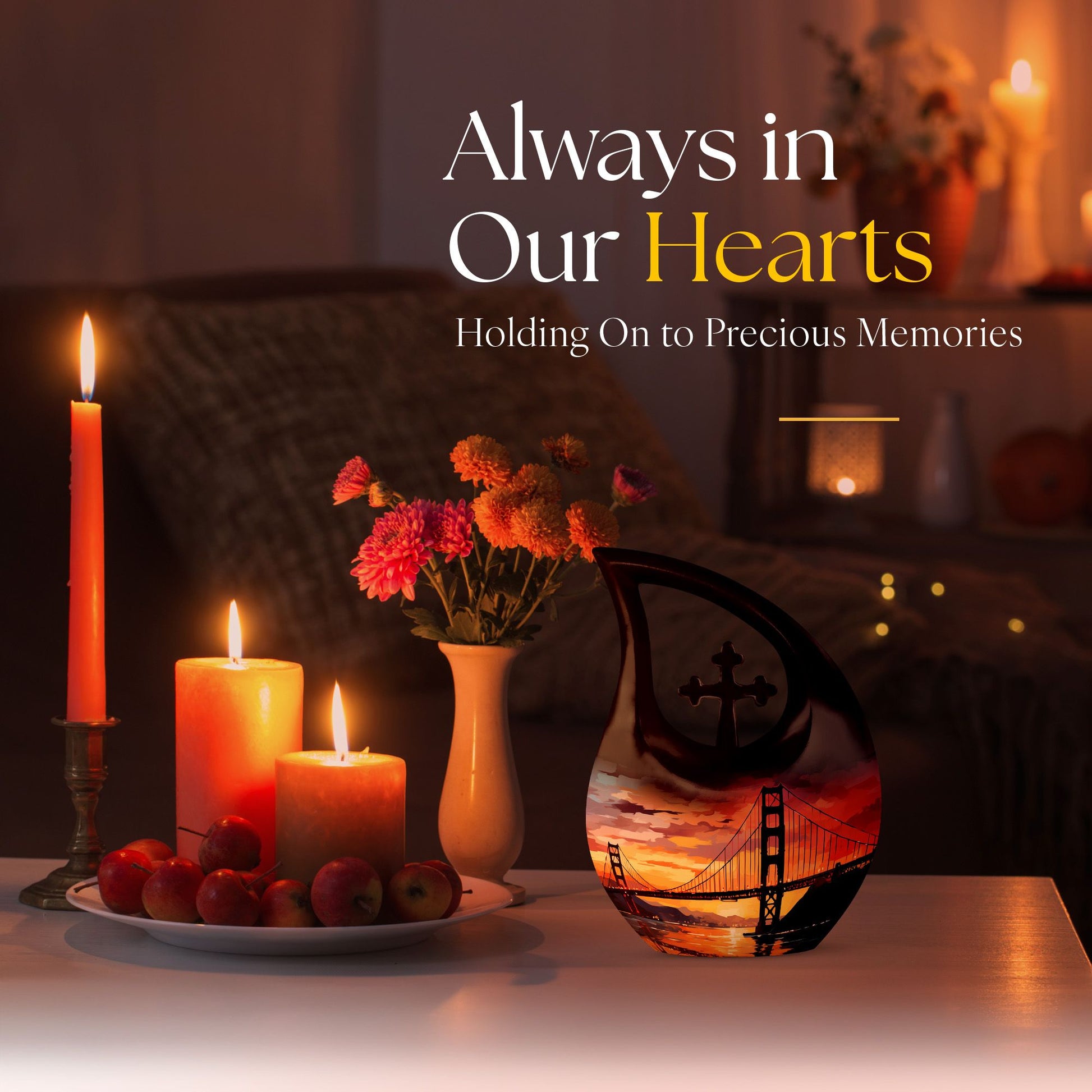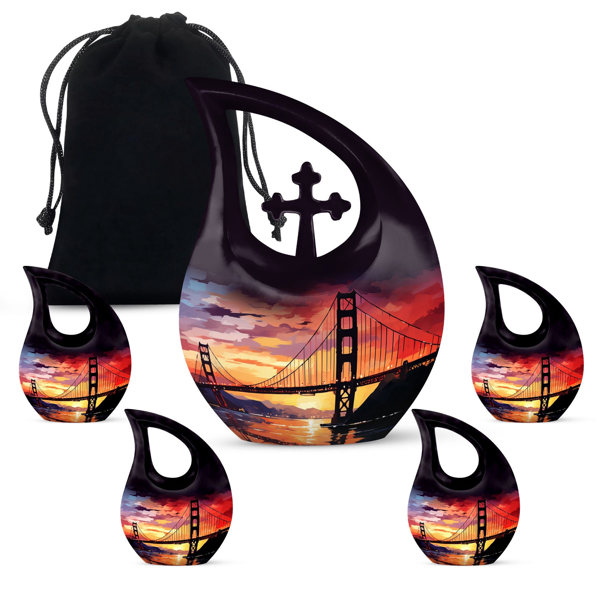 Honor the memory of your dear one with the Golden Gate Bridge Urn, a thoughtful choice in memorial urns. Crafted from durable aluminium, this 10-inch urn offers a remarkable capacity of 200 cubic inches, ensuring a tangible tribute to your beloved family member. Weighing in at 3.3 pounds, its substantive feel is a comforting reminder of the presence your loved one held in life. The Cross Drop theme uniquely signifies the hope and faith that carries us through times of loss, and with the possibility to personalize through engraving, the urn can be deeply meaningful for both men and women. Additionally, the urn comes with a luxurious velvet pouch for respectful containment of ashes. From loved ones ashes keepsakes to unique urns for dad, this Large Urn is an ideal choice, offering comfort and solace during a difficult time. Enrich your online search with keywords such as 'cremation box for ashes' or 'medium size urn for human ashes' for optimal results.