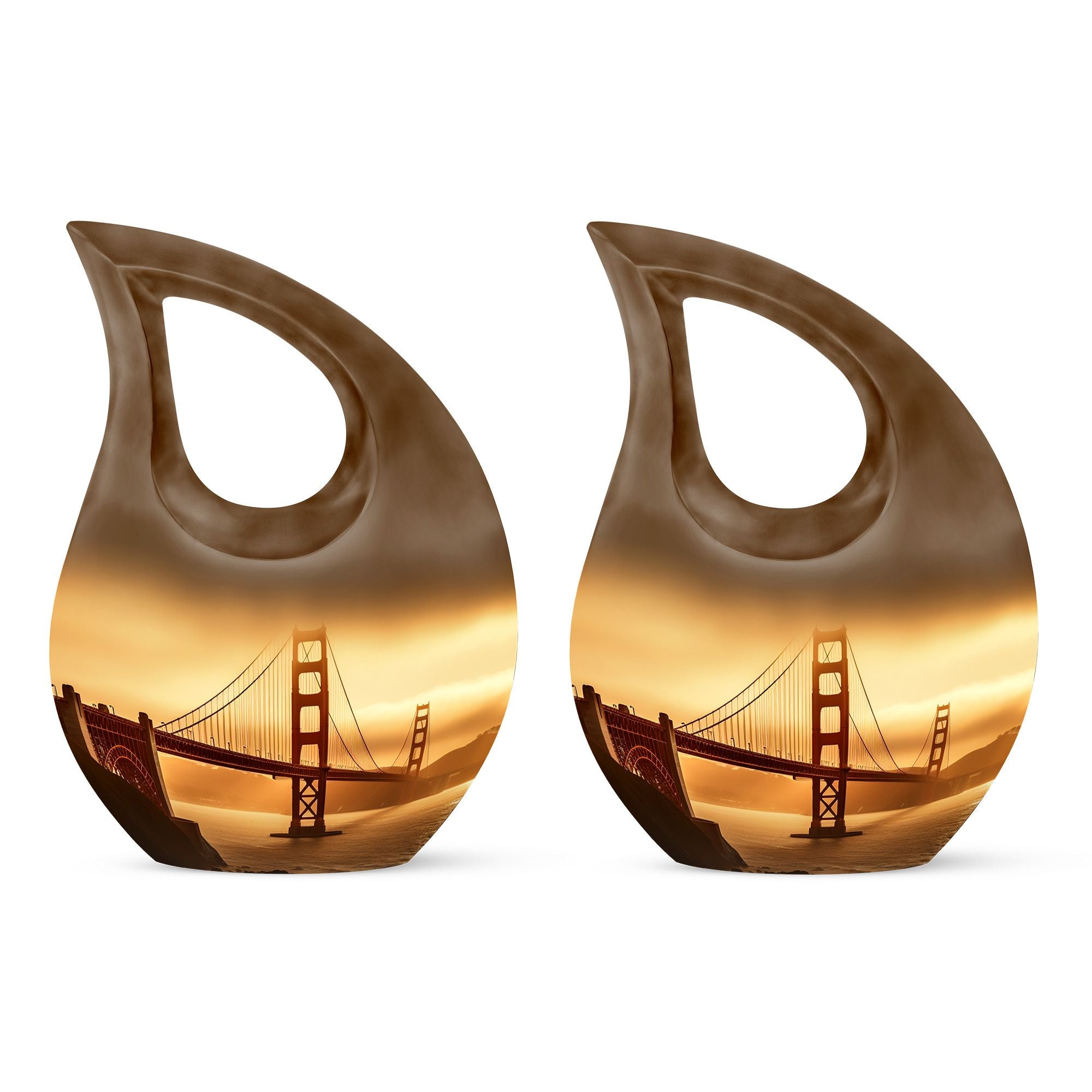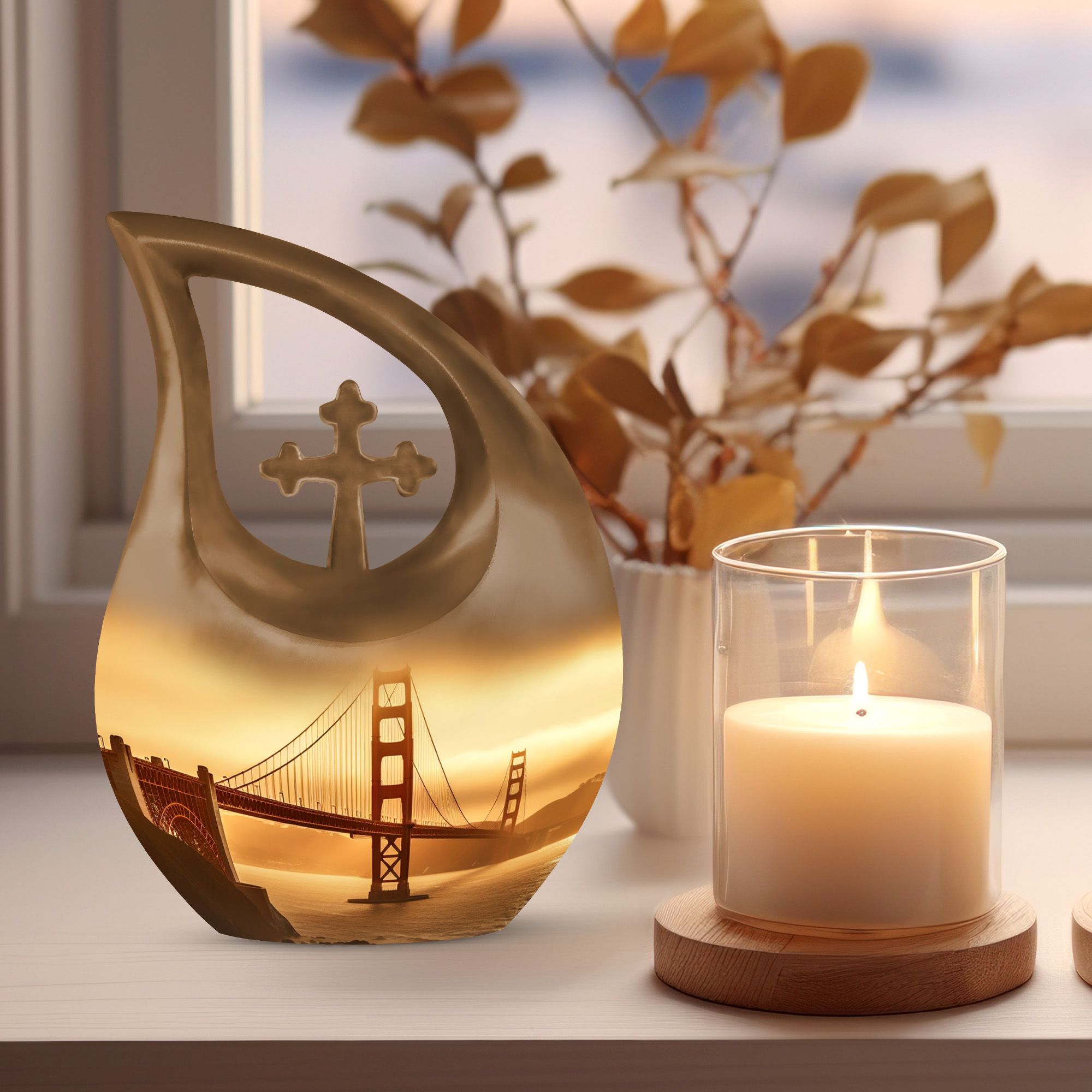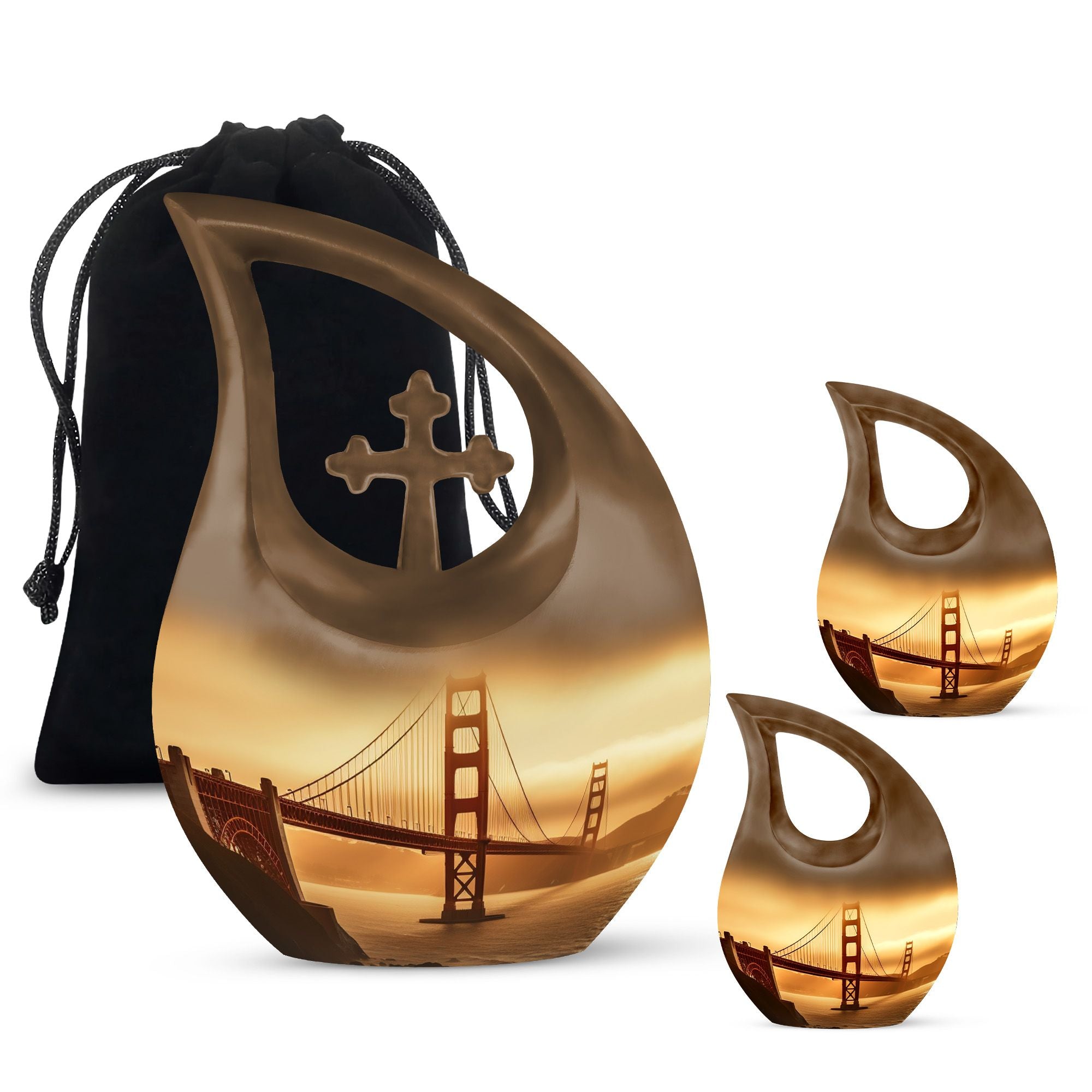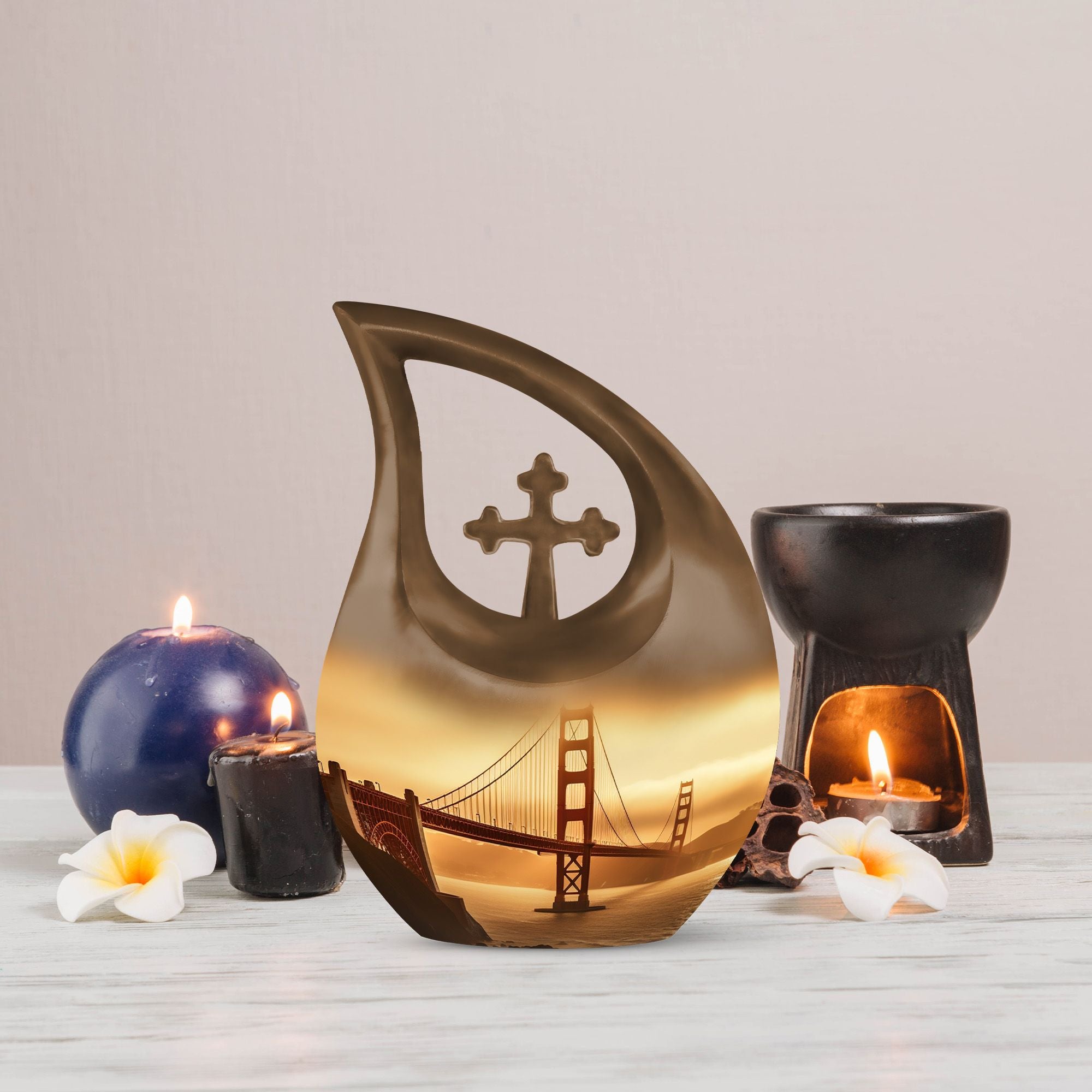 Embrace a reverent remembrance with our Golden Gate Bridge Urn, exquisitely crafted for adult memorial ceremonies. This substantial 10-inch urn weighs 3.3 pounds and features an elegant Cross Drop motif, symbolizing tranquility and the spiritual journey beyond. A touching tribute, the urn offers a capacity of 200 cubic inches, spacious enough to honor loved ones in a meaningful way. Crafted from durable aluminium, the urn's quality and longevity offer peace of mind. Each purchase includes a velvet pouch, ensuring safe containment of ashes. Personalize your urn with engraved names, adding a sentimental touch to this heartfelt keepsake. This urn balances tradition with unique flair, perfect for those seeking memorial urns or cremation urn vaults. As a part of your ceremony or as a comforting presence in your home, the Golden Gate Bridge Urn delivers respectful remembrance with elegance and grace.