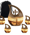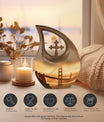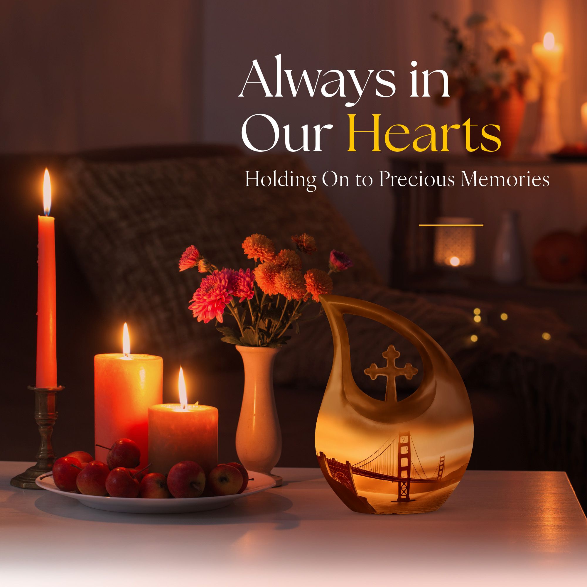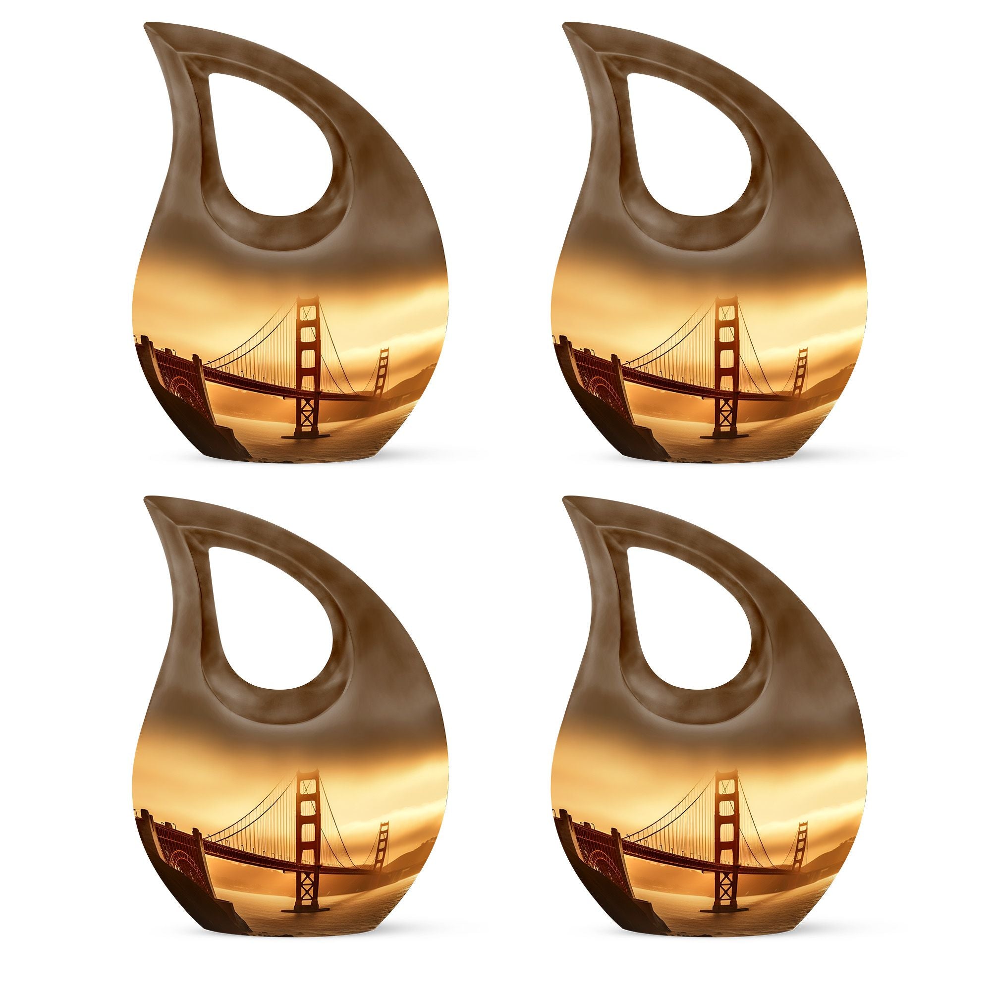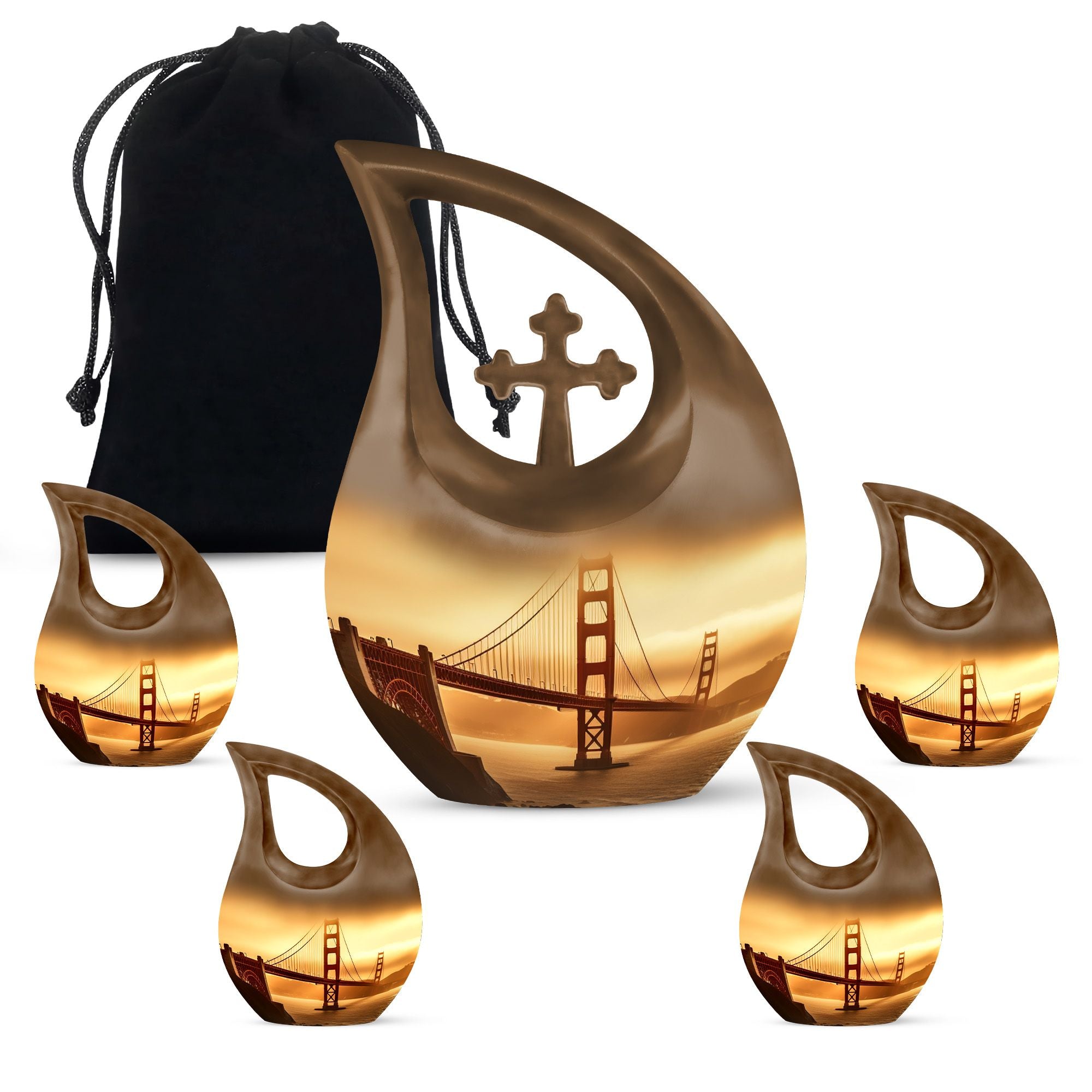 Embrace a reverent remembrance with our Golden Gate Bridge Urn, exquisitely crafted for adult memorial ceremonies. This substantial 10-inch urn weighs 3.3 pounds and features an elegant Cross Drop motif, symbolizing tranquility and the spiritual journey beyond. A touching tribute, the urn offers a capacity of 200 cubic inches, spacious enough to honor loved ones in a meaningful way. Crafted from durable aluminium, the urn's quality and longevity offer peace of mind. Each purchase includes a velvet pouch, ensuring safe containment of ashes. Personalize your urn with engraved names, adding a sentimental touch to this heartfelt keepsake. This urn balances tradition with unique flair, perfect for those seeking memorial urns or cremation urn vaults. As a part of your ceremony or as a comforting presence in your home, the Golden Gate Bridge Urn delivers respectful remembrance with elegance and grace.