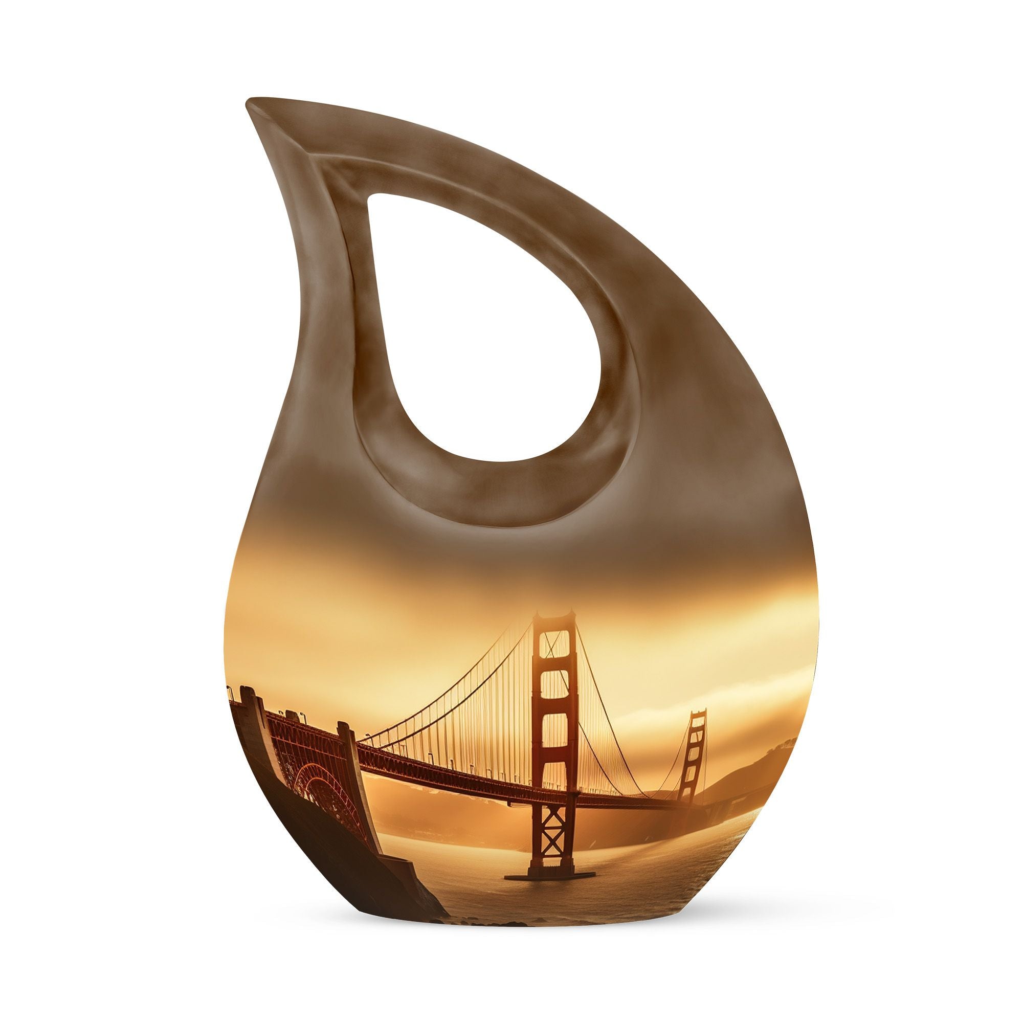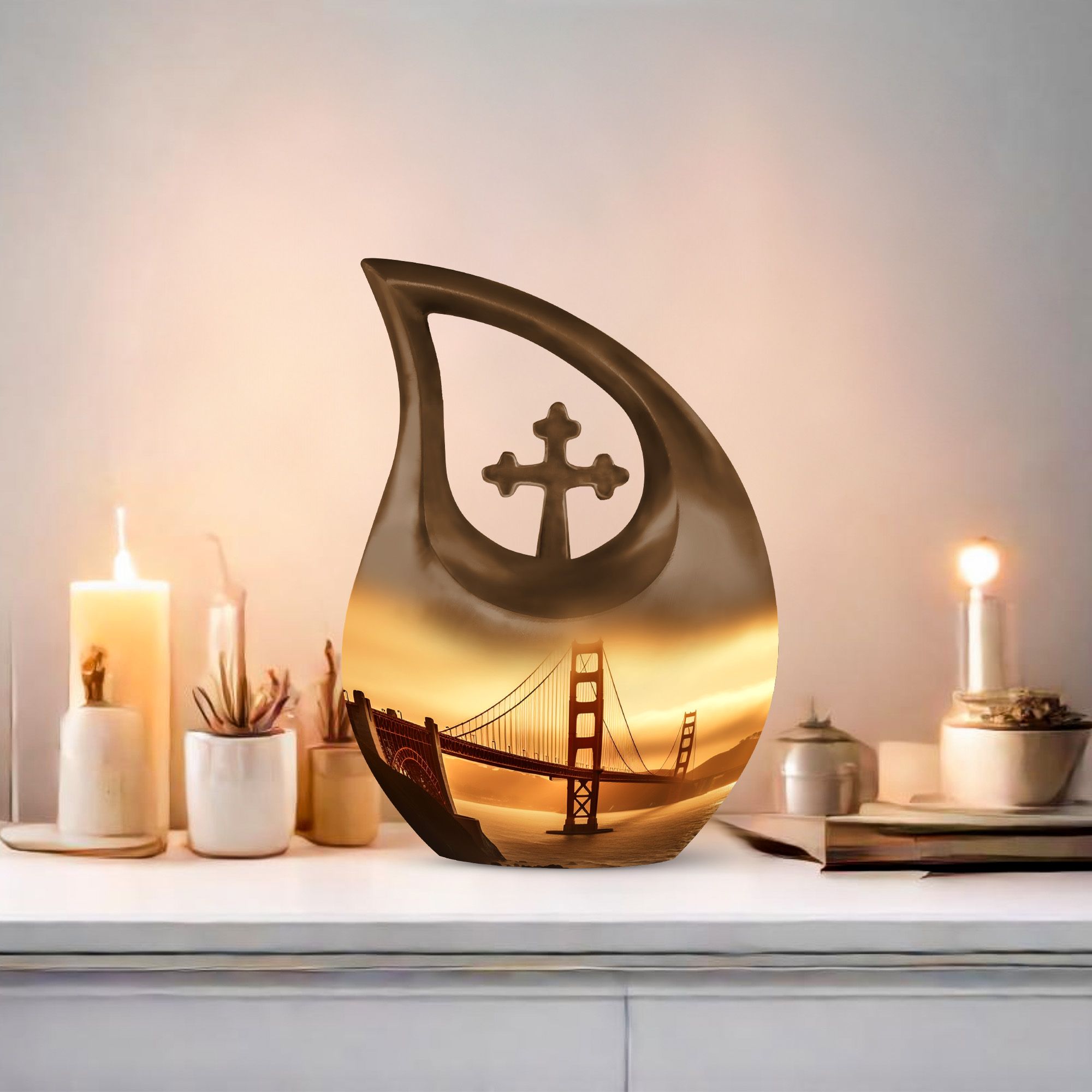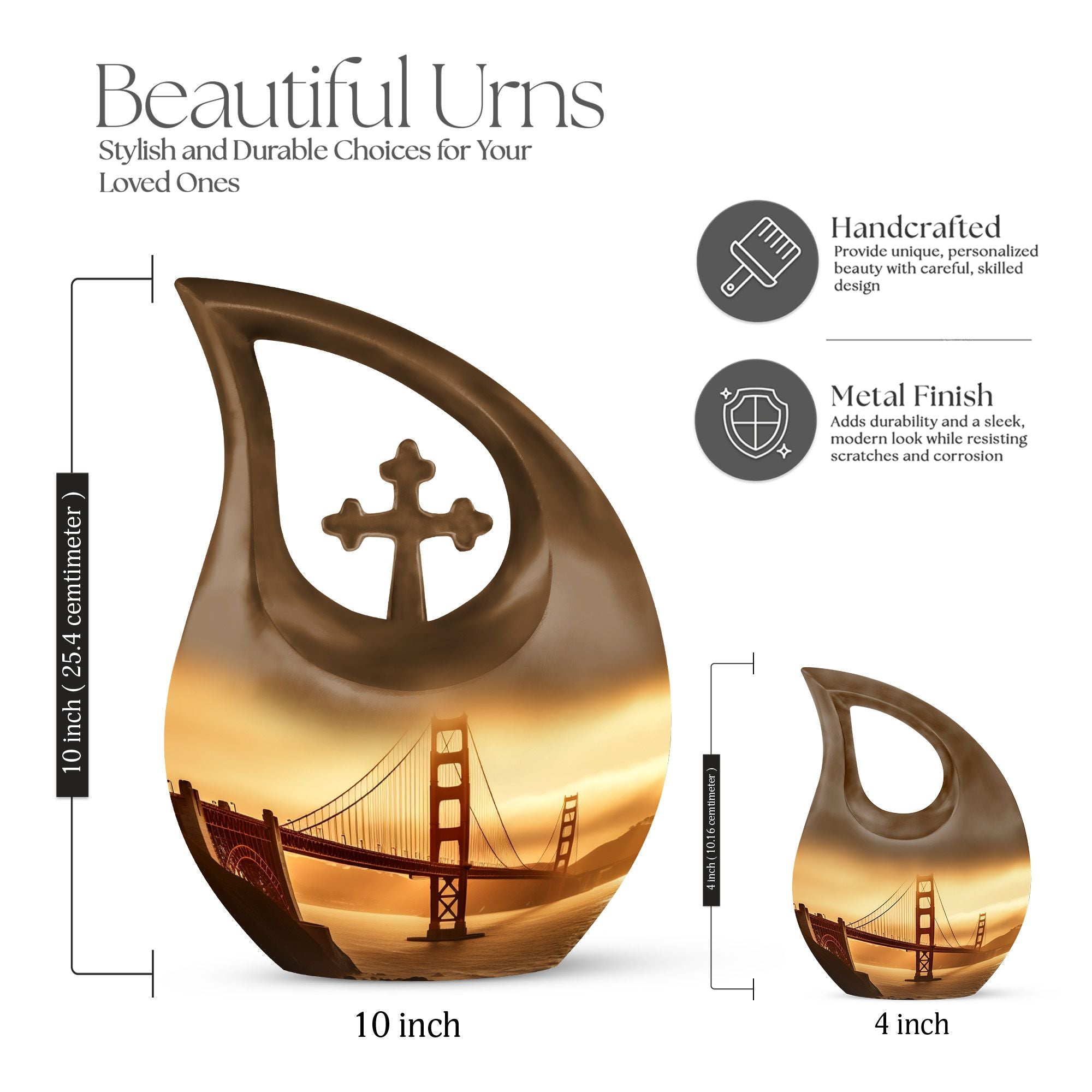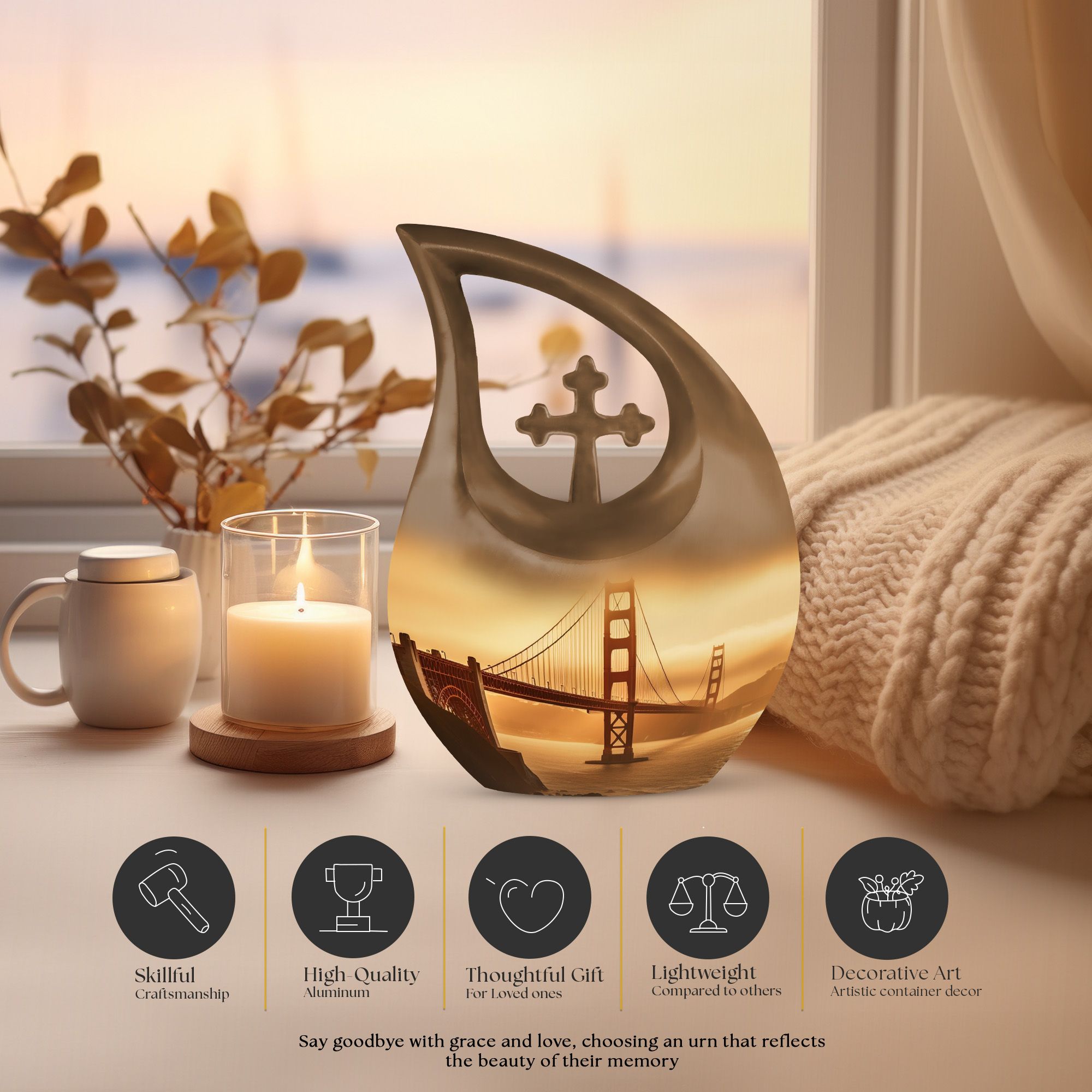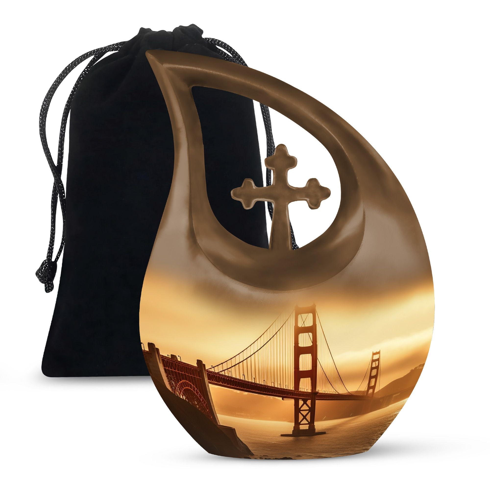 Embrace a reverent remembrance with our Golden Gate Bridge Urn, exquisitely crafted for adult memorial ceremonies. This substantial 10-inch urn weighs 3.3 pounds and features an elegant Cross Drop motif, symbolizing tranquility and the spiritual journey beyond. A touching tribute, the urn offers a capacity of 200 cubic inches, spacious enough to honor loved ones in a meaningful way. Crafted from durable aluminium, the urn's quality and longevity offer peace of mind. Each purchase includes a velvet pouch, ensuring safe containment of ashes. Personalize your urn with engraved names, adding a sentimental touch to this heartfelt keepsake. This urn balances tradition with unique flair, perfect for those seeking memorial urns or cremation urn vaults. As a part of your ceremony or as a comforting presence in your home, the Golden Gate Bridge Urn delivers respectful remembrance with elegance and grace.