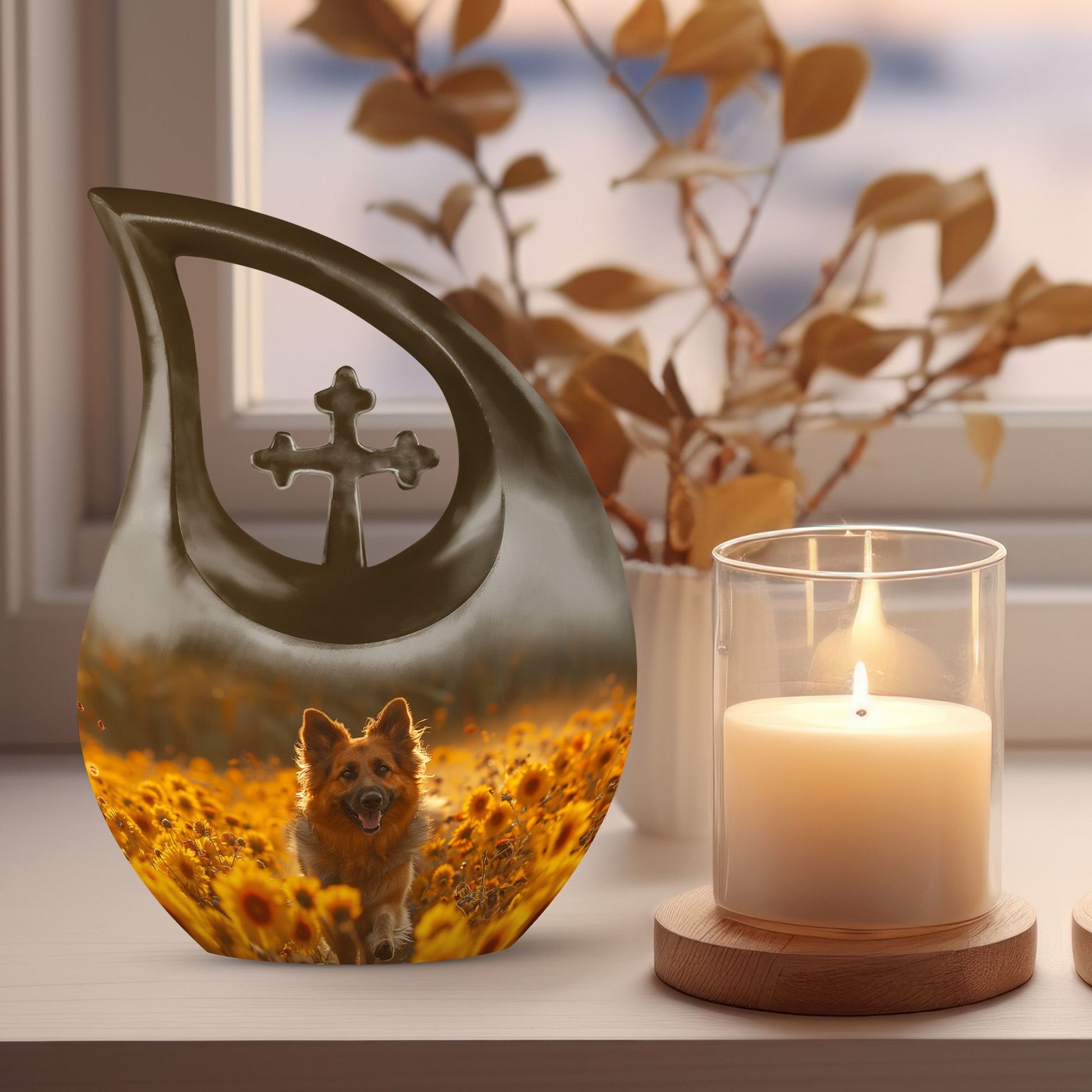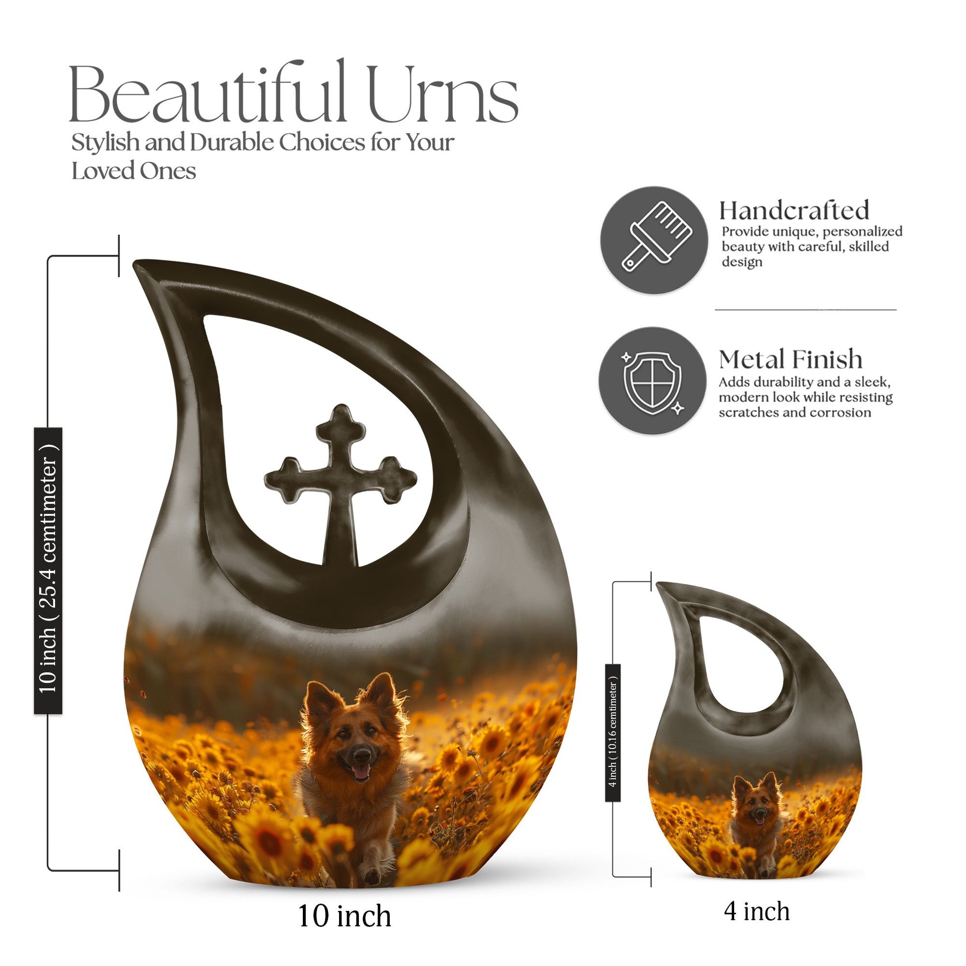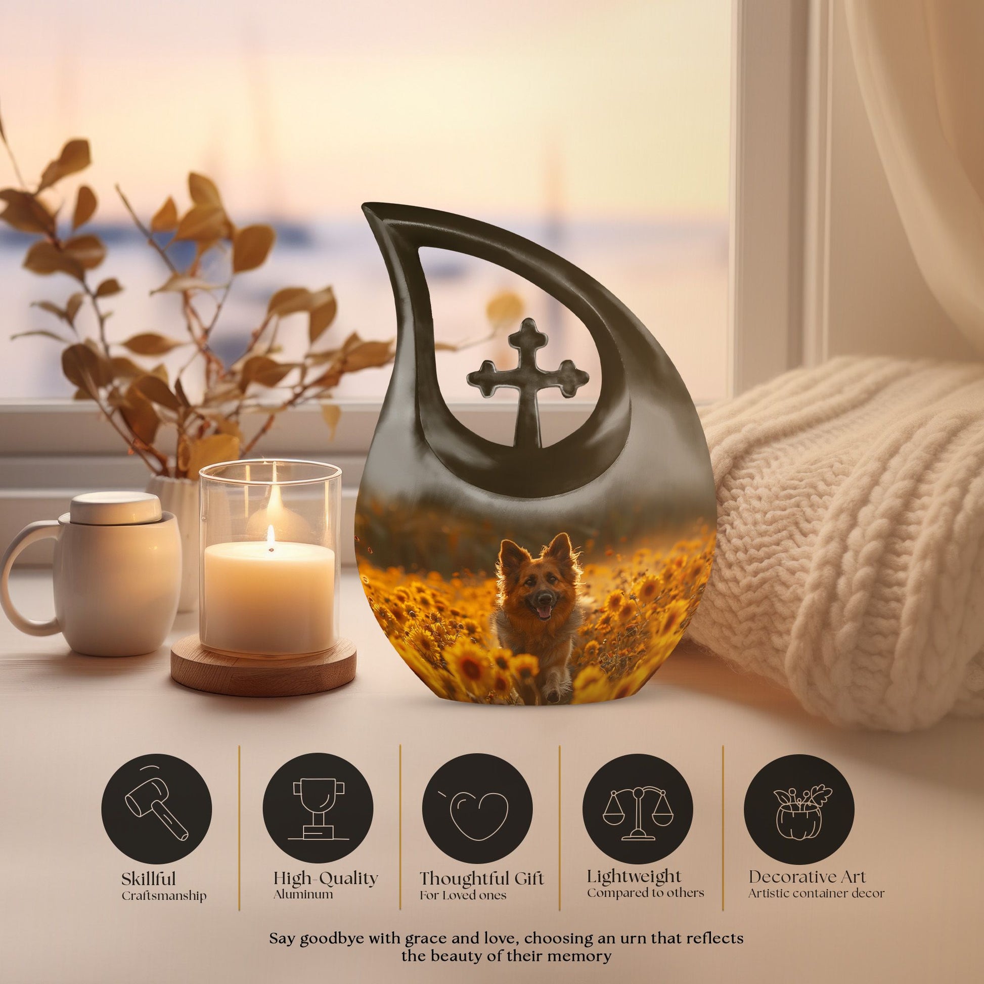 Find solace in remembrance with our Golden Hour Delight Urn, a unique token crafted specifically for the intent of containment and preservation of precious memories. With the formidable dimensions of a 10-inch height, and a respectable weight of 3.3 pounds, our urn manifests as an exceptional artifact, given its capacity of 200 cubic inches. Each package includes a luxurious velvet pouch ensuring the delicate accommodation of your loved one’s ashes. Forged with high-quality aluminium, this adult size urn is imbued with a 'Cross Drop' theme, resonating with the soothing tranquility of the golden hour. To make this more personal, we offer the service of engraving names on the urn. Searching with keywords such as 'Urns for Women's Ashes', 'Pet Urn Vase', or 'Outdoor Cremation Urns' will lead you to our exquisite collection of large urns. Honour your loved ones with the magnificent symbol of fond memories and pay tribute to their lasting footprint.