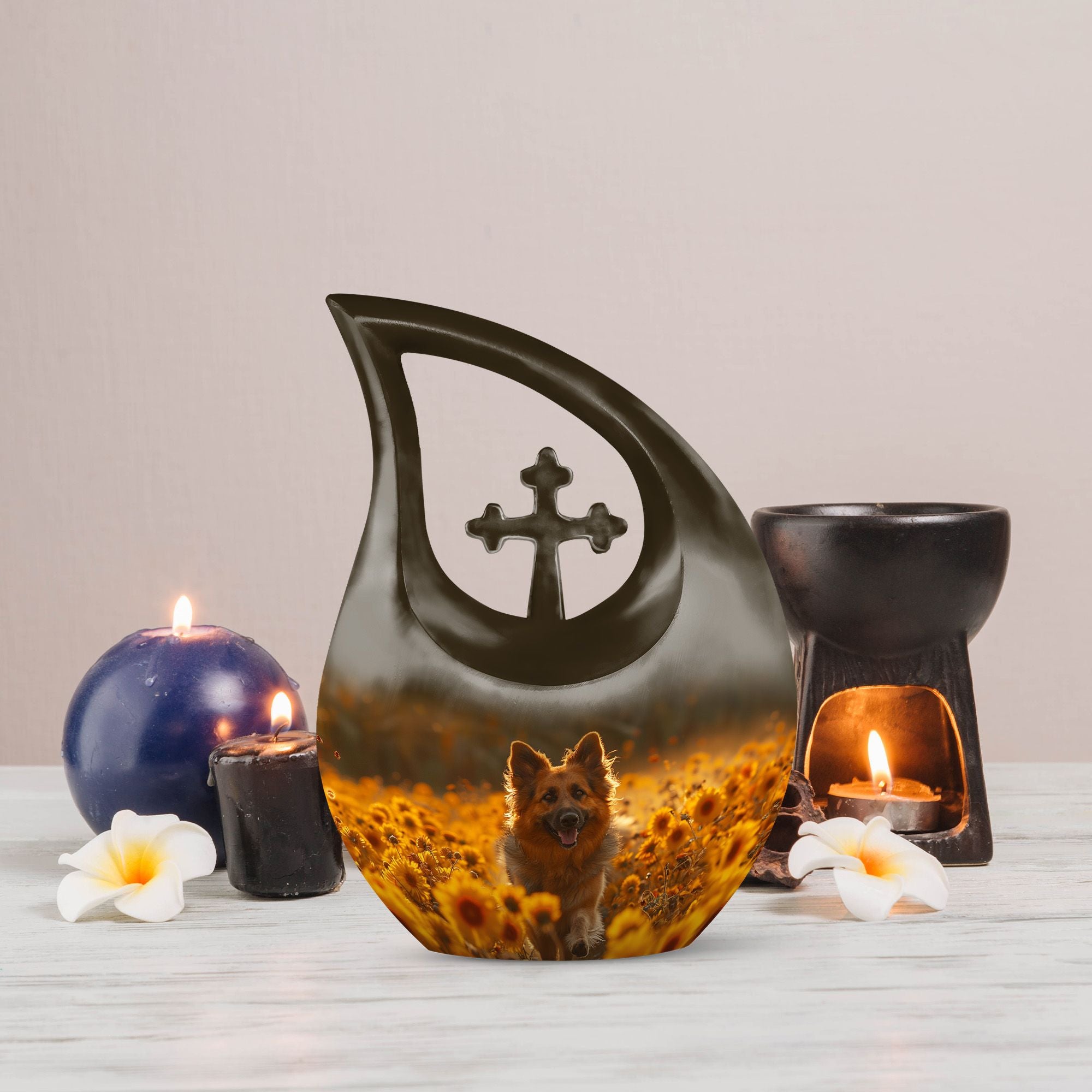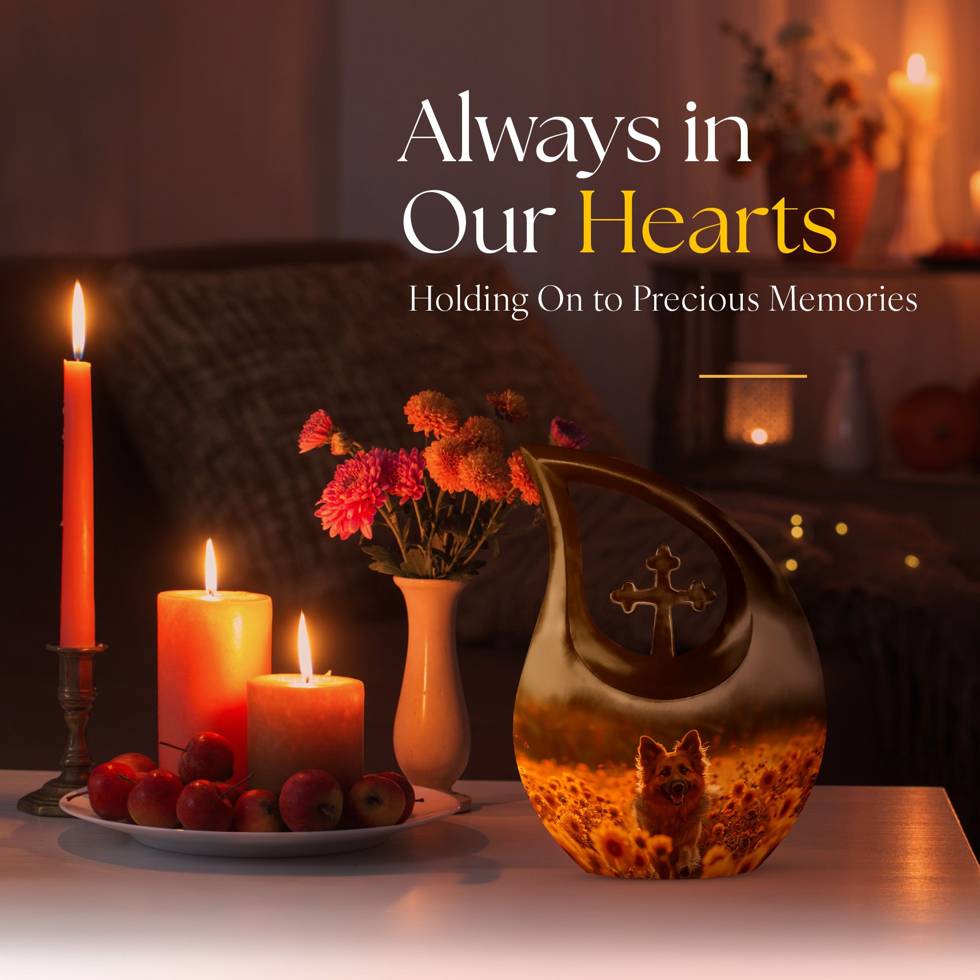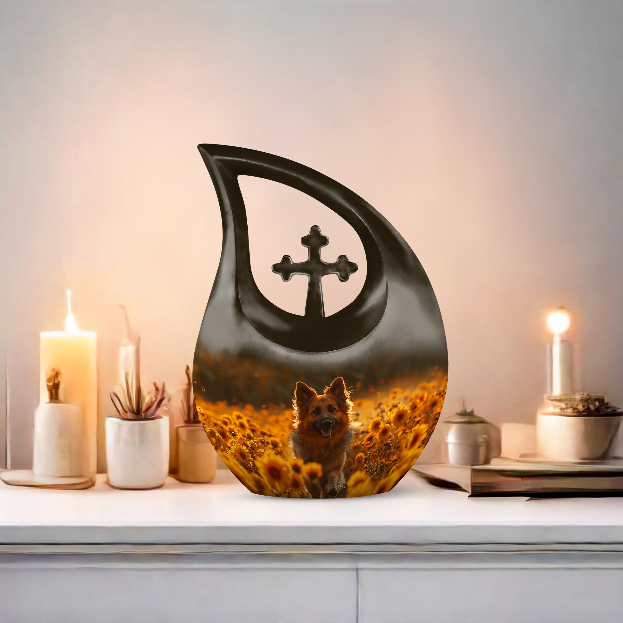 Find solace in remembrance with our Golden Hour Delight Urn, a unique token crafted specifically for the intent of containment and preservation of precious memories. With the formidable dimensions of a 10-inch height, and a respectable weight of 3.3 pounds, our urn manifests as an exceptional artifact, given its capacity of 200 cubic inches. Each package includes a luxurious velvet pouch ensuring the delicate accommodation of your loved one’s ashes. Forged with high-quality aluminium, this adult size urn is imbued with a 'Cross Drop' theme, resonating with the soothing tranquility of the golden hour. To make this more personal, we offer the service of engraving names on the urn. Searching with keywords such as 'Urns for Women's Ashes', 'Pet Urn Vase', or 'Outdoor Cremation Urns' will lead you to our exquisite collection of large urns. Honour your loved ones with the magnificent symbol of fond memories and pay tribute to their lasting footprint.