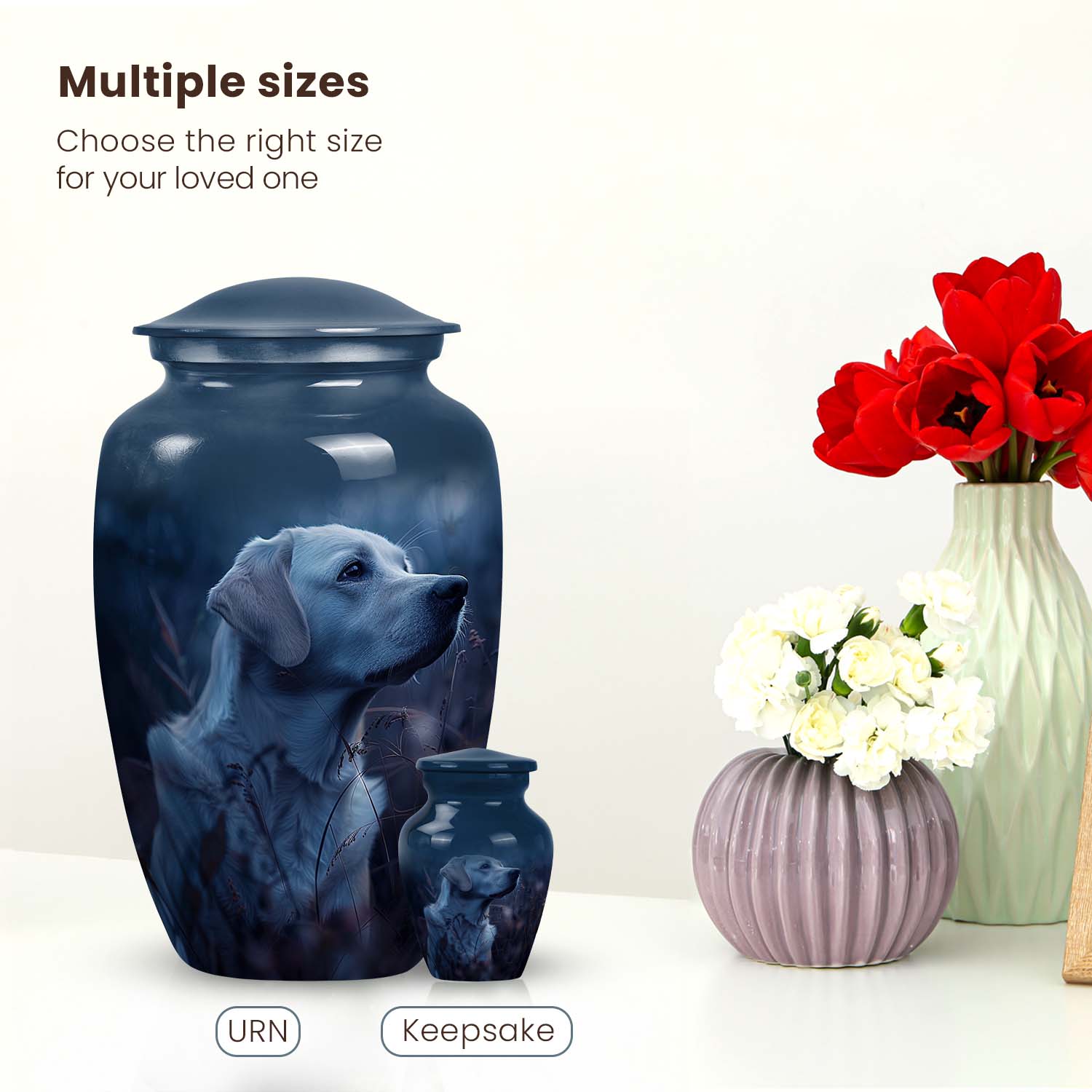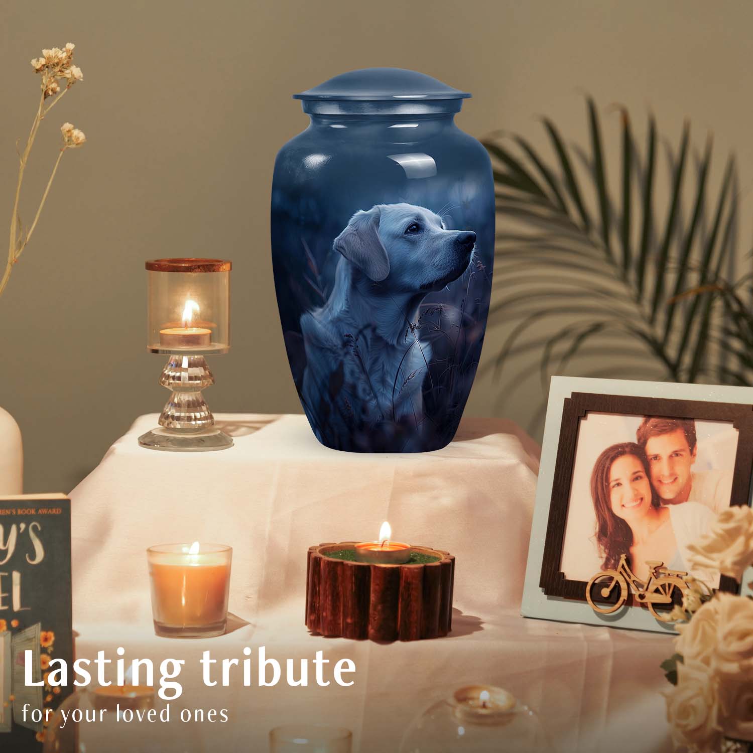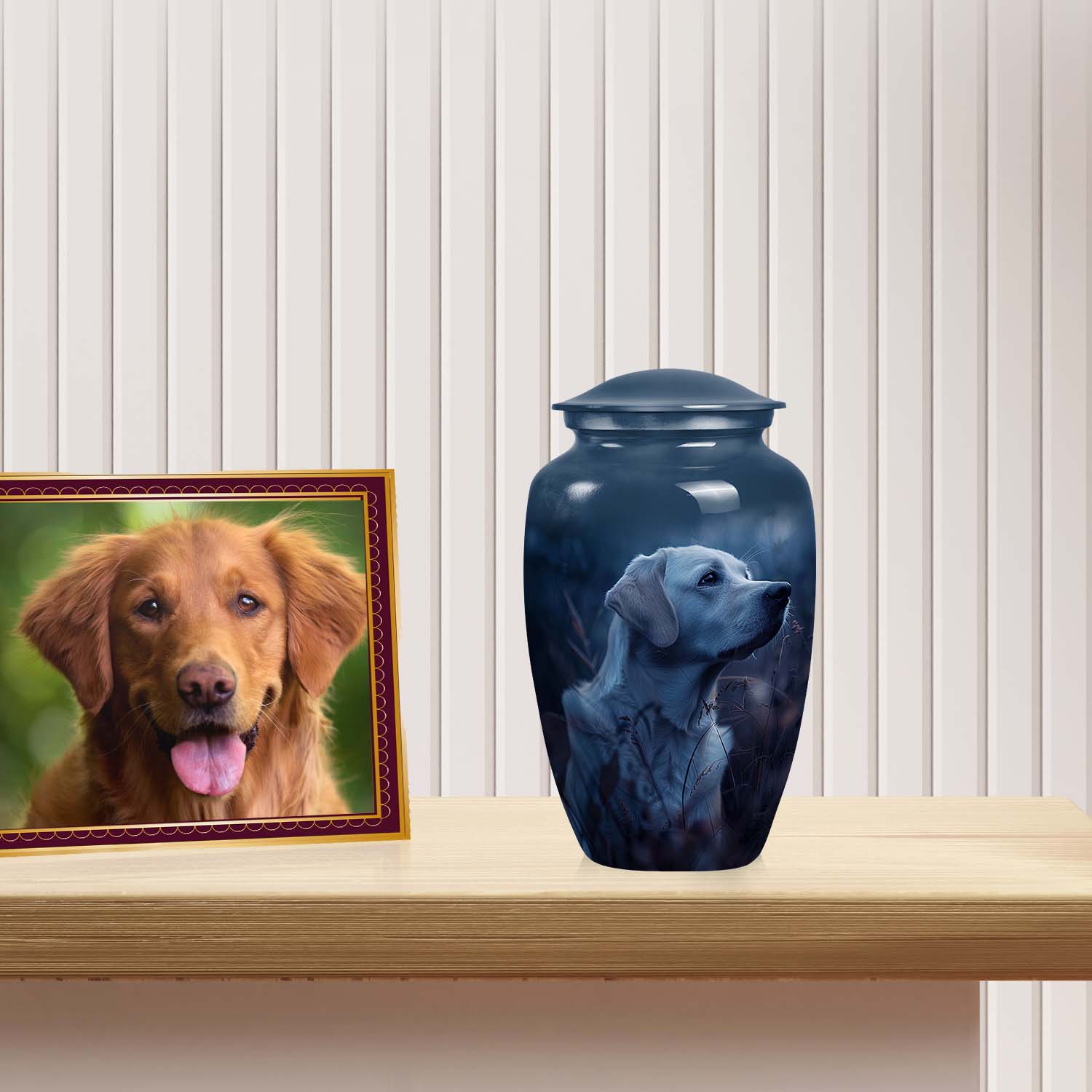 Cherish your beloved companion’s memory with the Dark Blue Memorial with Pensive Dog Portrait. This elegant piece captures the depth of your love and loss, offering a gentle reminder that their spirit will always stay close. Thoughtfully designed as a Pet Ash Memorial, it serves as both a comforting tribute and a beautiful display of everlasting devotion.