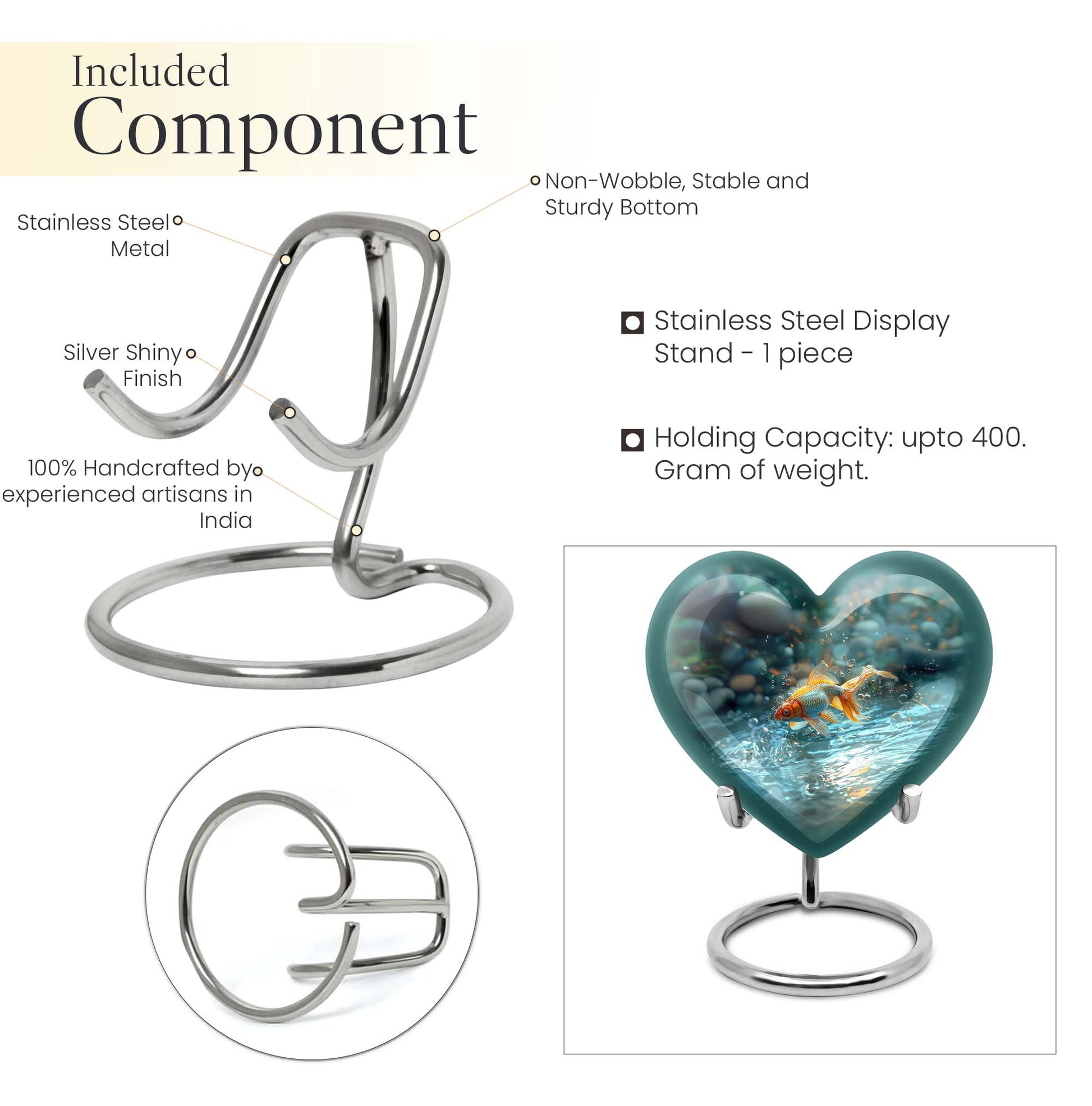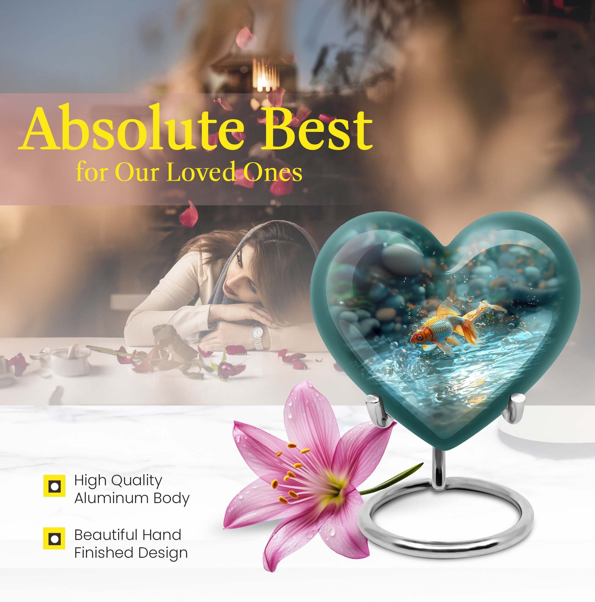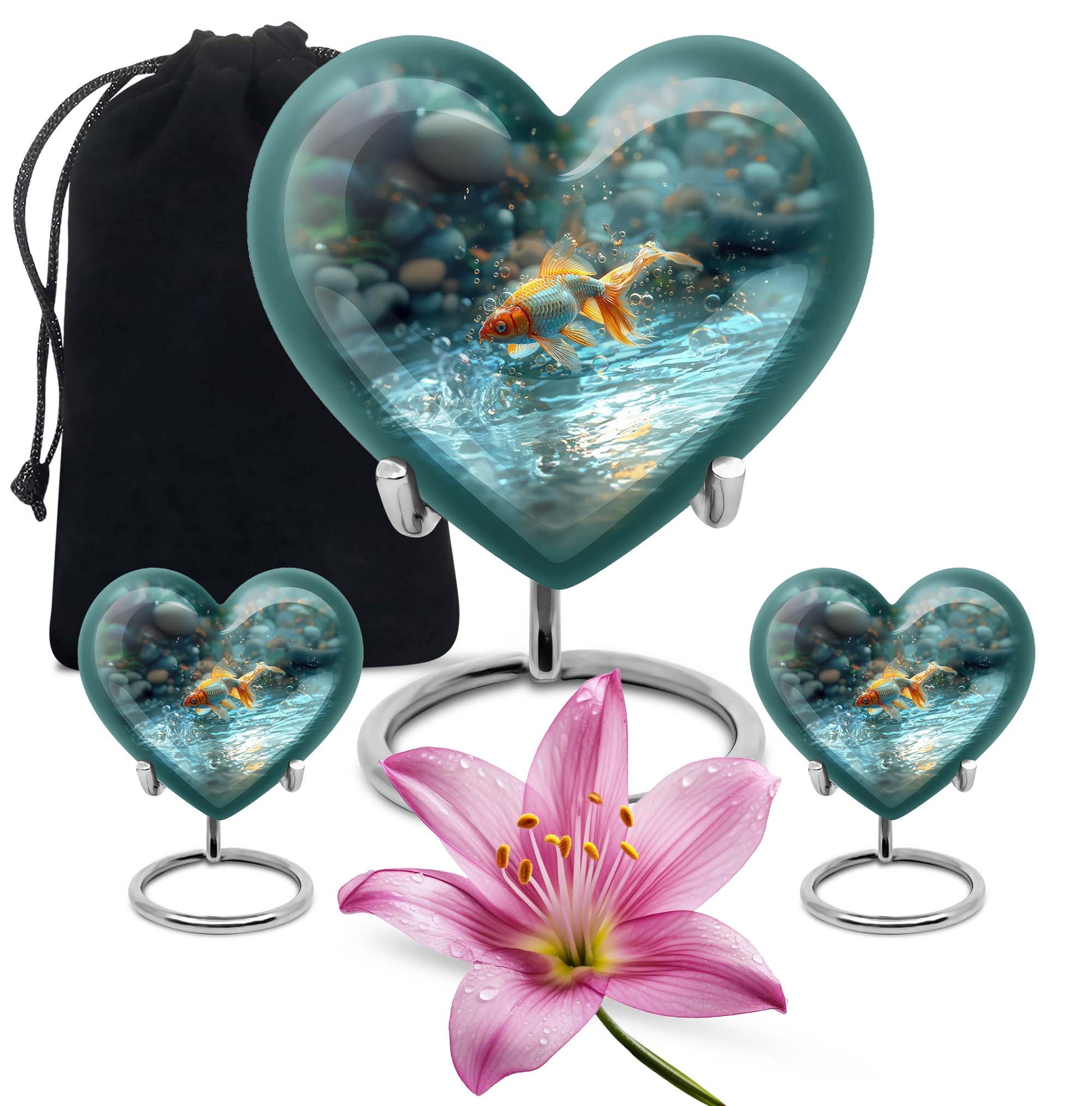Presenting our handcrafted gold fish urn, a heartfelt memento to honor and remember your loved ones. This large urn showcases a symbolic butterfly theme, adding a serene and peaceful touch. It is carefully created from robust aluminium material which stands 10 inches tall, weighing only a mere 3.3 pounds. With a remarkable capacity of 200 cubic inches, this urn for cremation ashes is roomy enough to hold ashes securely. The product comes with a delicate velvet pouch, assuring containment of ashes and easy transportation. Personalize this piece further with engraved names, elevating its uniqueness and sentimental value. This cremation urn is not only just an urn, but a memorable keepsake that forever encapsulates the love and affection you hold. The urn mirrors the infinite bond you shared, making it a perfect tribute to your loved one. Commonly searched terms for our product include 'memorial urns', 'burial large urn', 'ash adult funeral urns', and 'funeral cremation urn'.