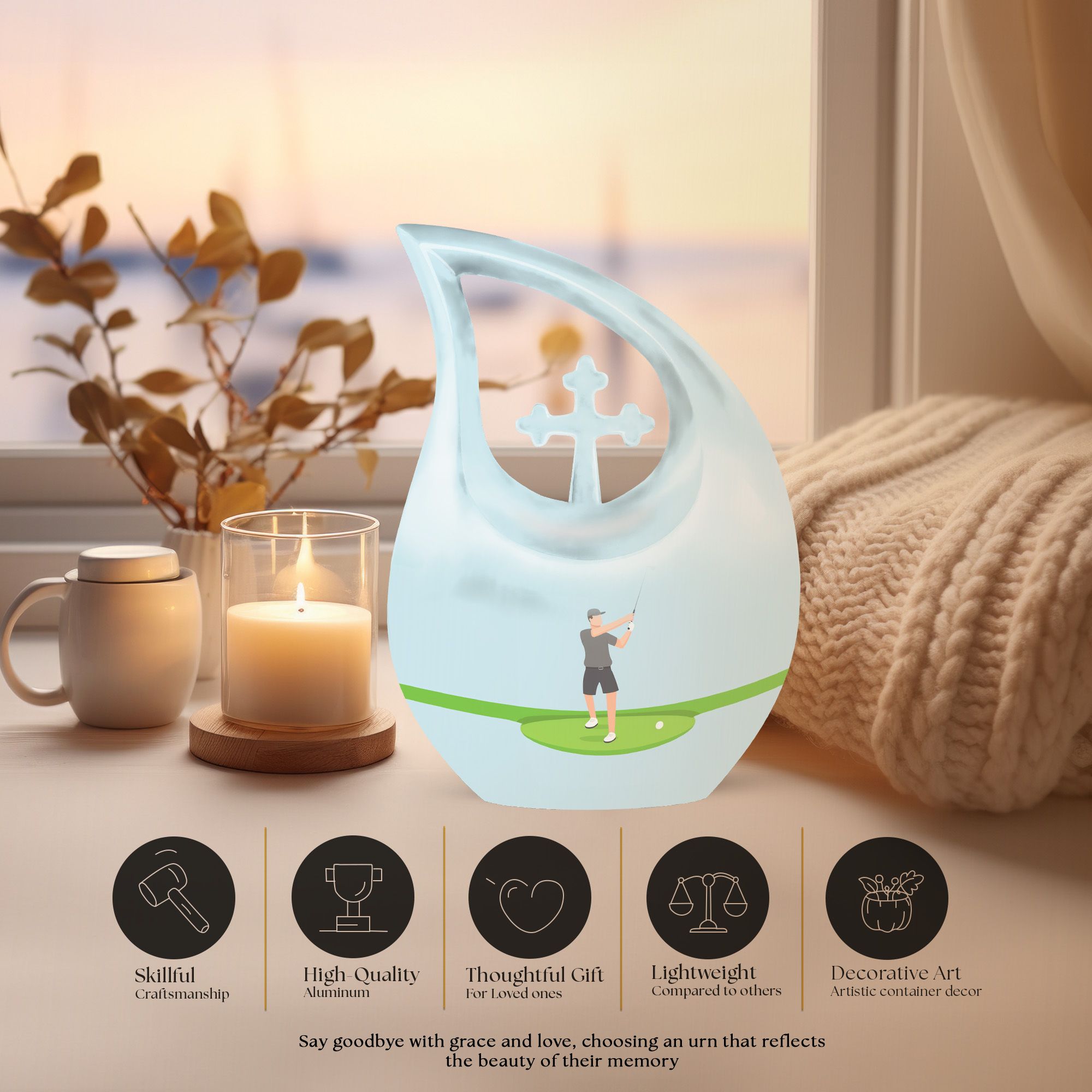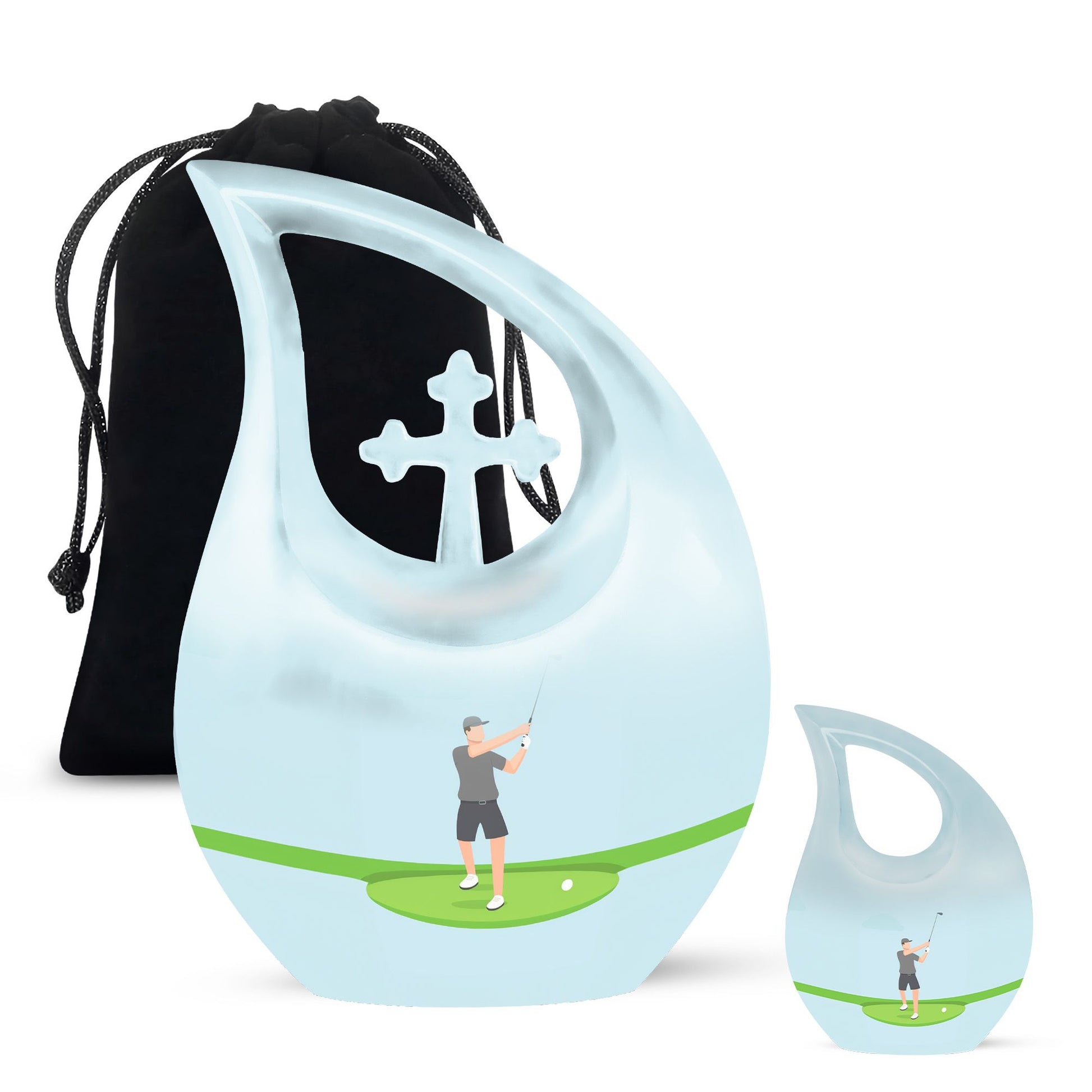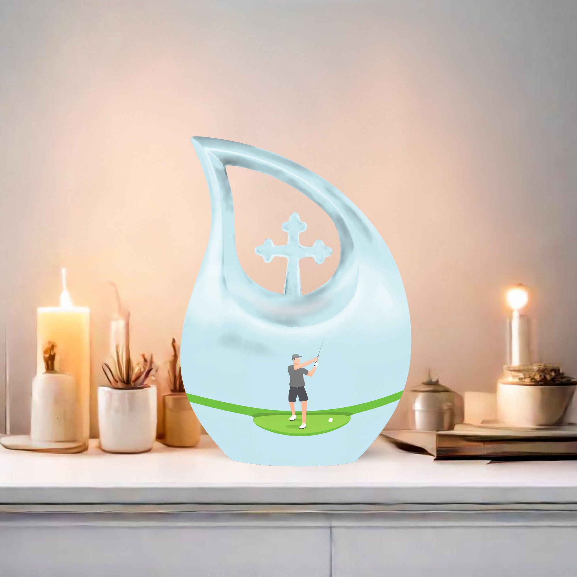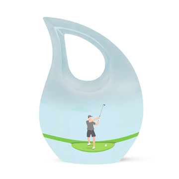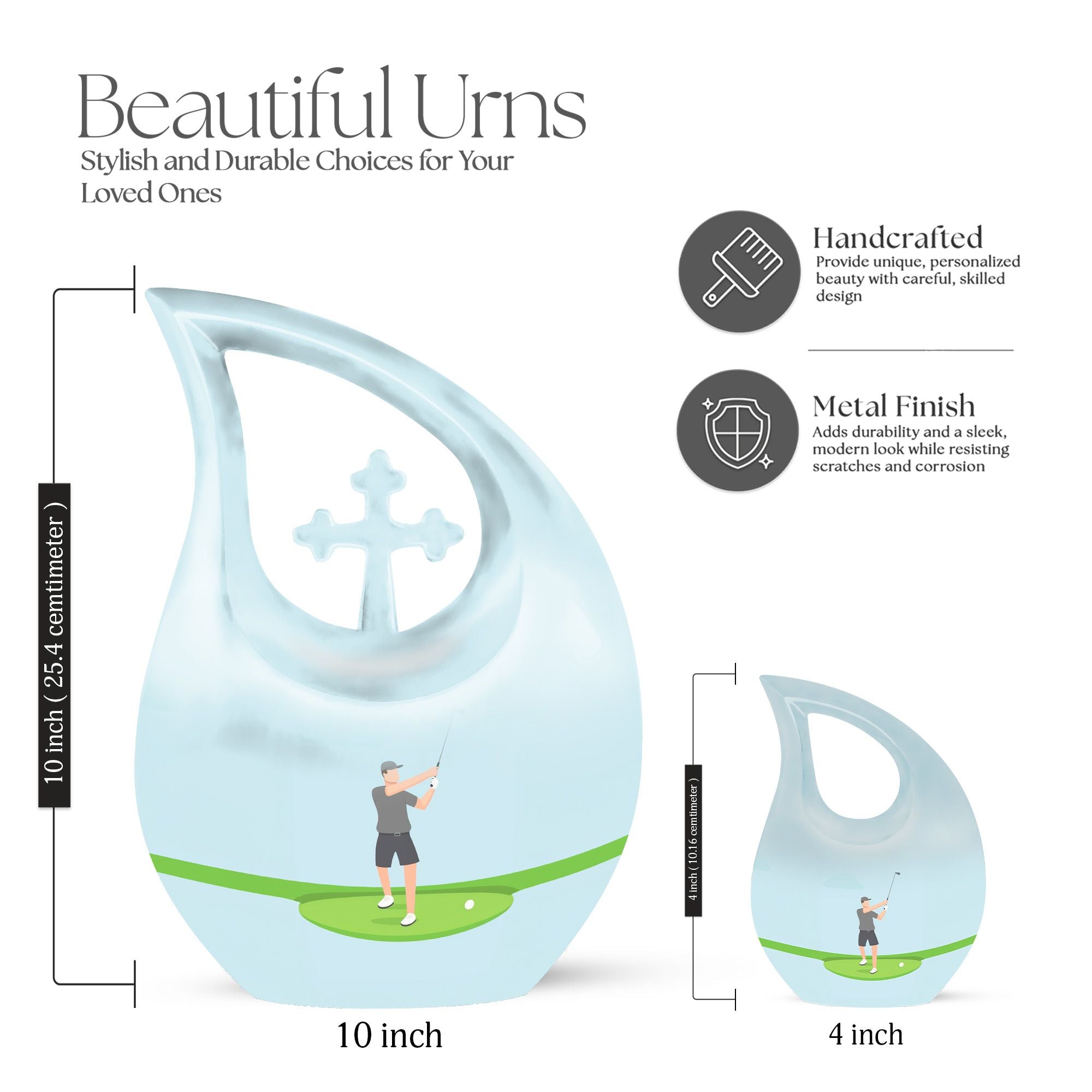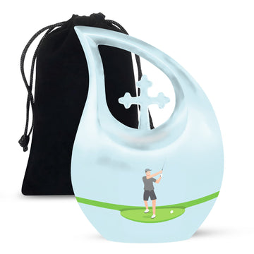 Commemorate the life of your lost loved ones with our carefully crafted 10-inch Golf Urn. As a tribute to the departed who adored the game of golf, the design showcases an iconic cross drop theme. Substantially constructed from aluminium, it elegantly holds the memories while weighing just 3.3 pounds. With a capacity of 200 cubic inches, this large urn boldly personifies the physical presence of your loved ones. We offer an element of personal touch, allowing the urn to be engraved with names which deepens the connection even more. This package comes with a delicately textured velvet pouch, especially for safe containment of the cremated remains. The words 'Golf Urn' or 'Urns For Cremated Remains' fail to fully describe the beauty of this urn, a piece of our Memorial Ceremony Supplies collection. Looking for Cremation Urns For Human Ashes, Beautiful Urns, Outdoor Urns, or inexpensive Urns will guide you to our doorsteps.
