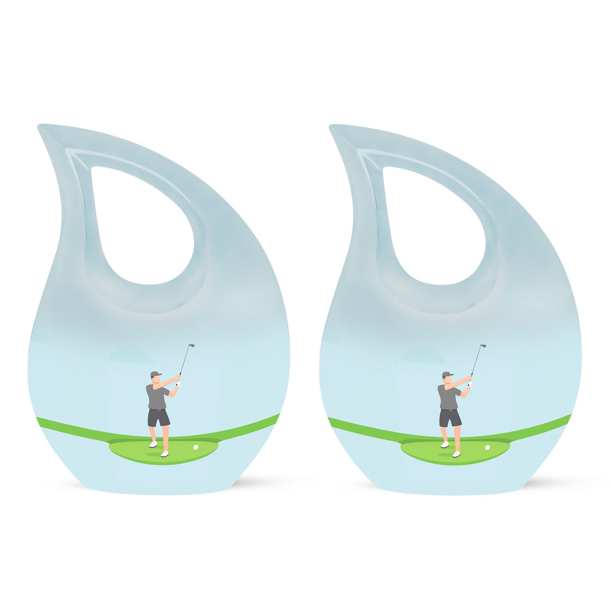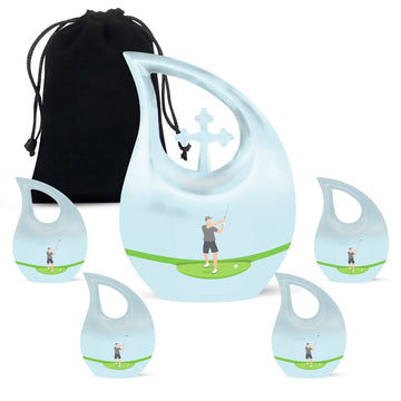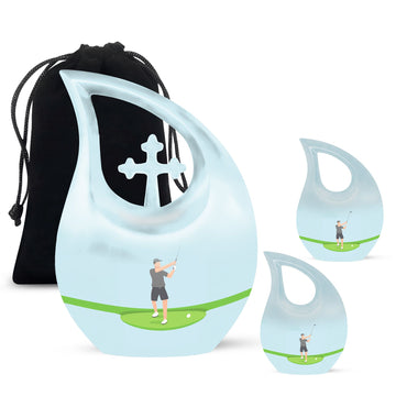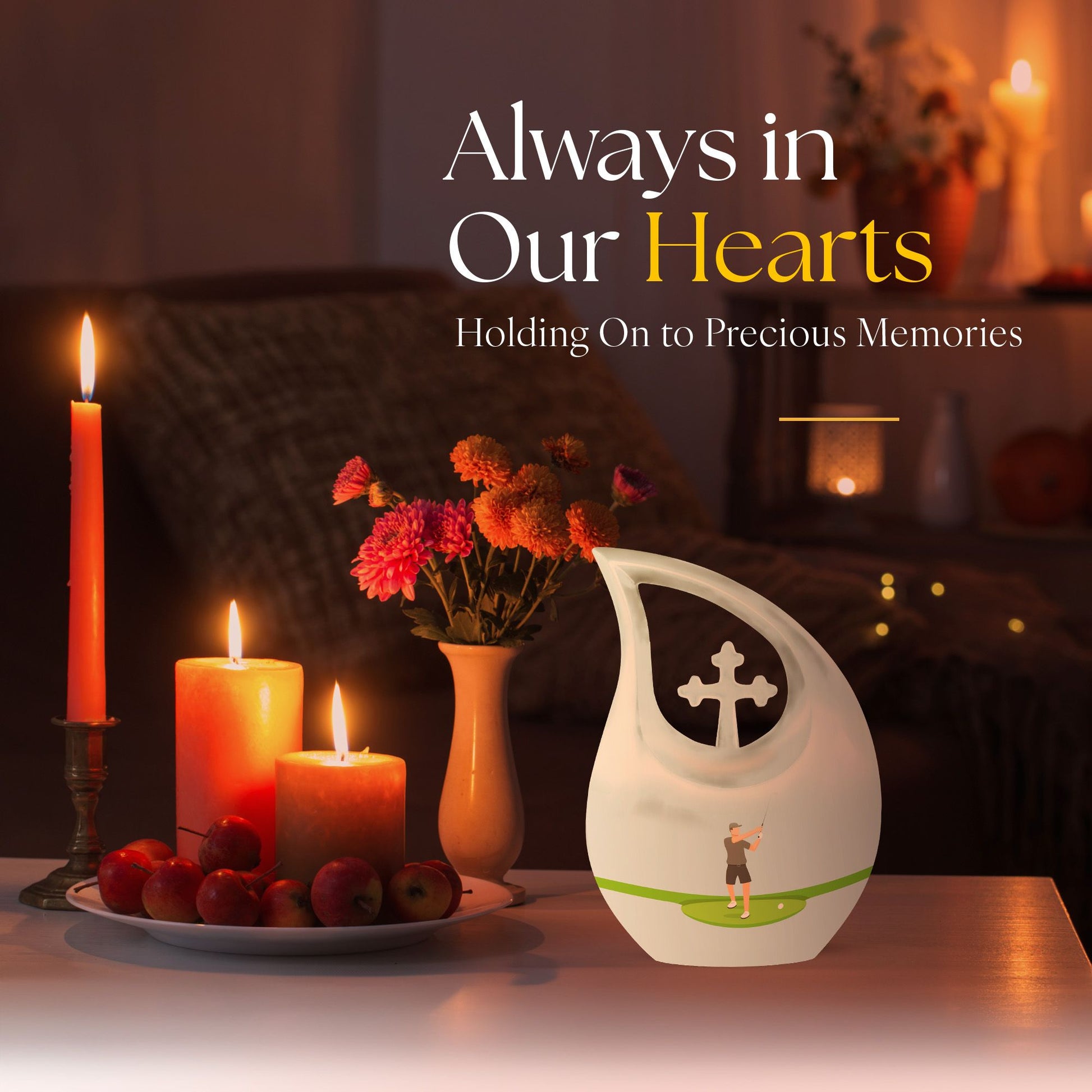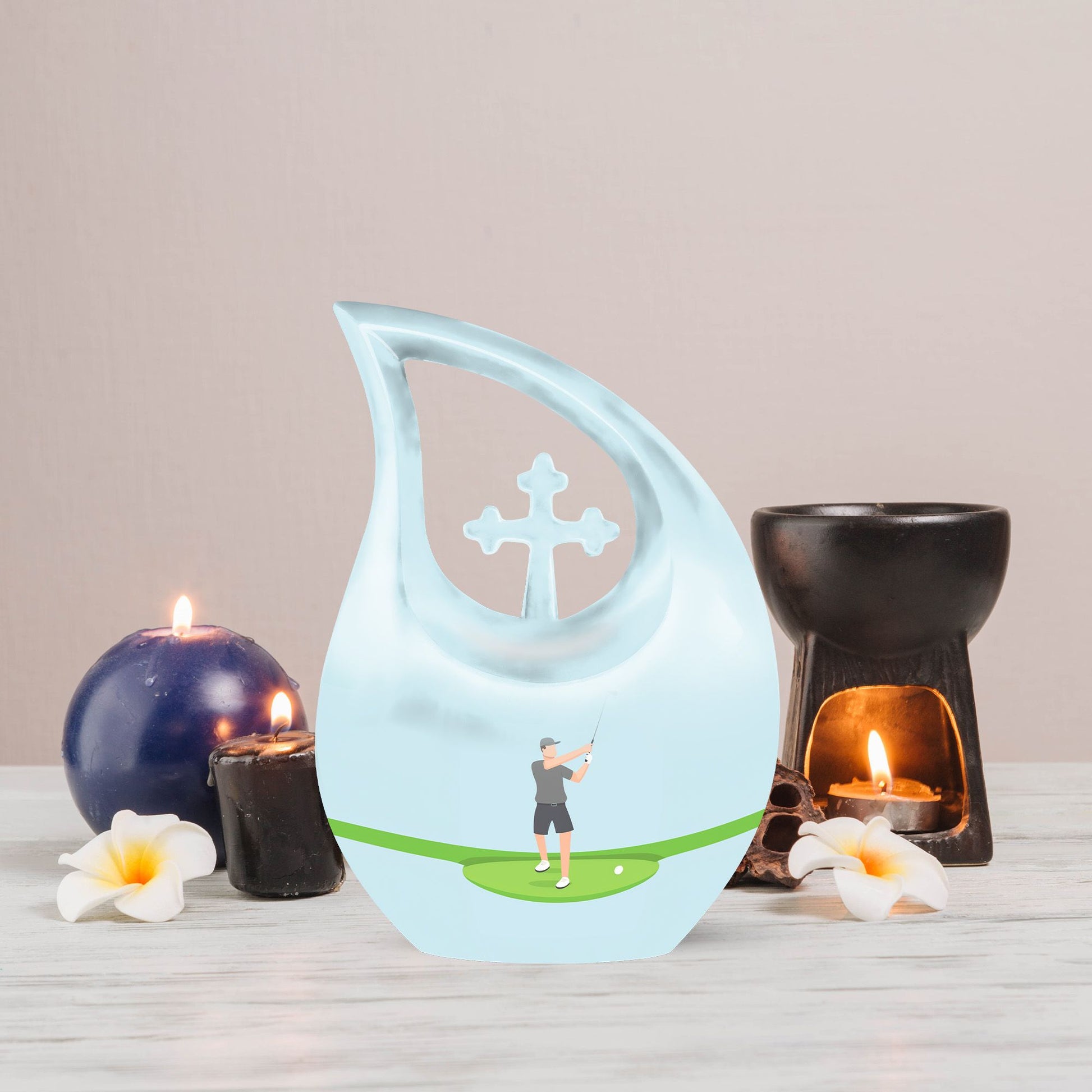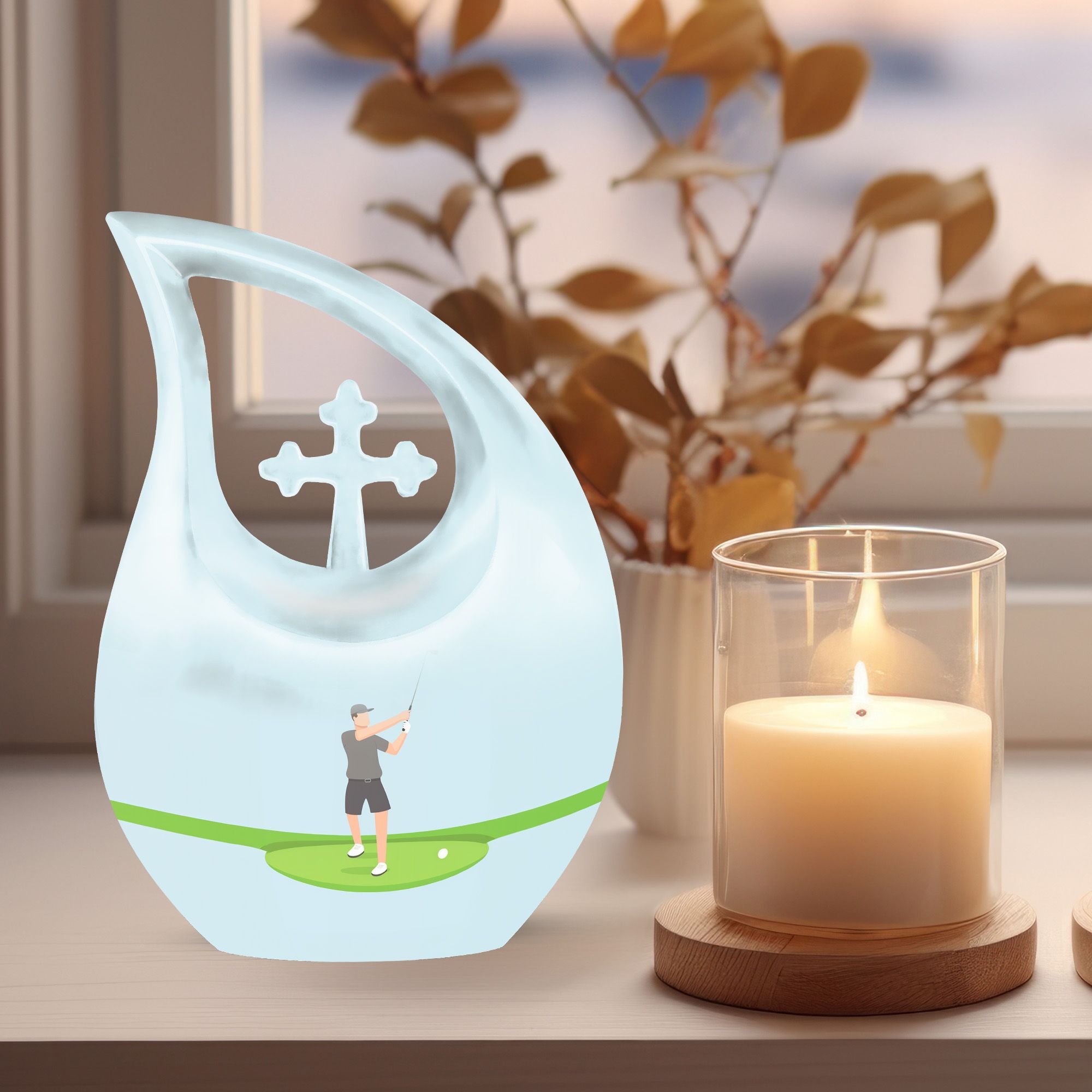 Commemorate the life of your lost loved ones with our carefully crafted 10-inch Golf Urn. As a tribute to the departed who adored the game of golf, the design showcases an iconic cross drop theme. Substantially constructed from aluminium, it elegantly holds the memories while weighing just 3.3 pounds. With a capacity of 200 cubic inches, this large urn boldly personifies the physical presence of your loved ones. We offer an element of personal touch, allowing the urn to be engraved with names which deepens the connection even more. This package comes with a delicately textured velvet pouch, especially for safe containment of the cremated remains. The words 'Golf Urn' or 'Urns For Cremated Remains' fail to fully describe the beauty of this urn, a piece of our Memorial Ceremony Supplies collection. Looking for Cremation Urns For Human Ashes, Beautiful Urns, Outdoor Urns, or inexpensive Urns will guide you to our doorsteps.