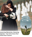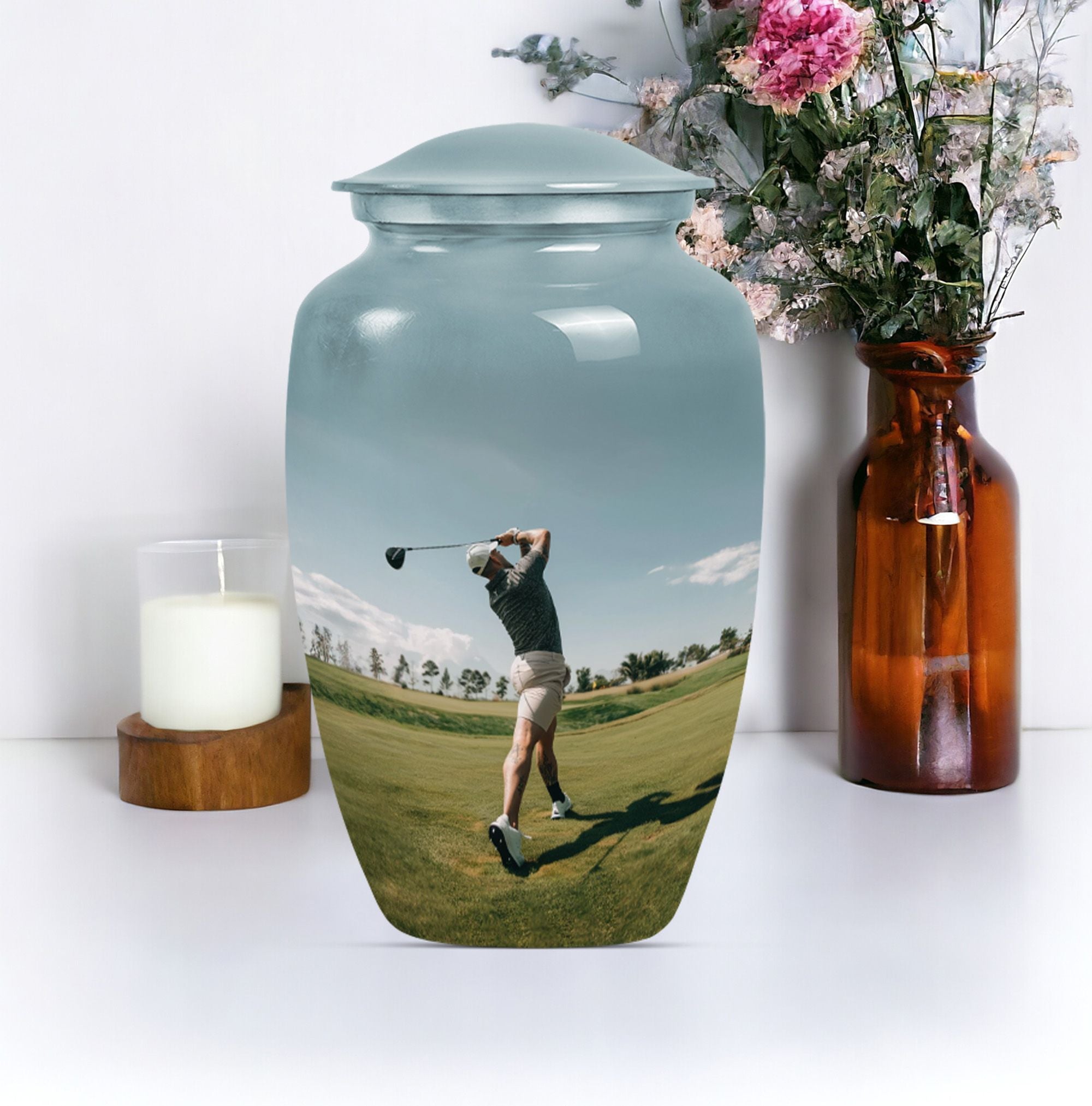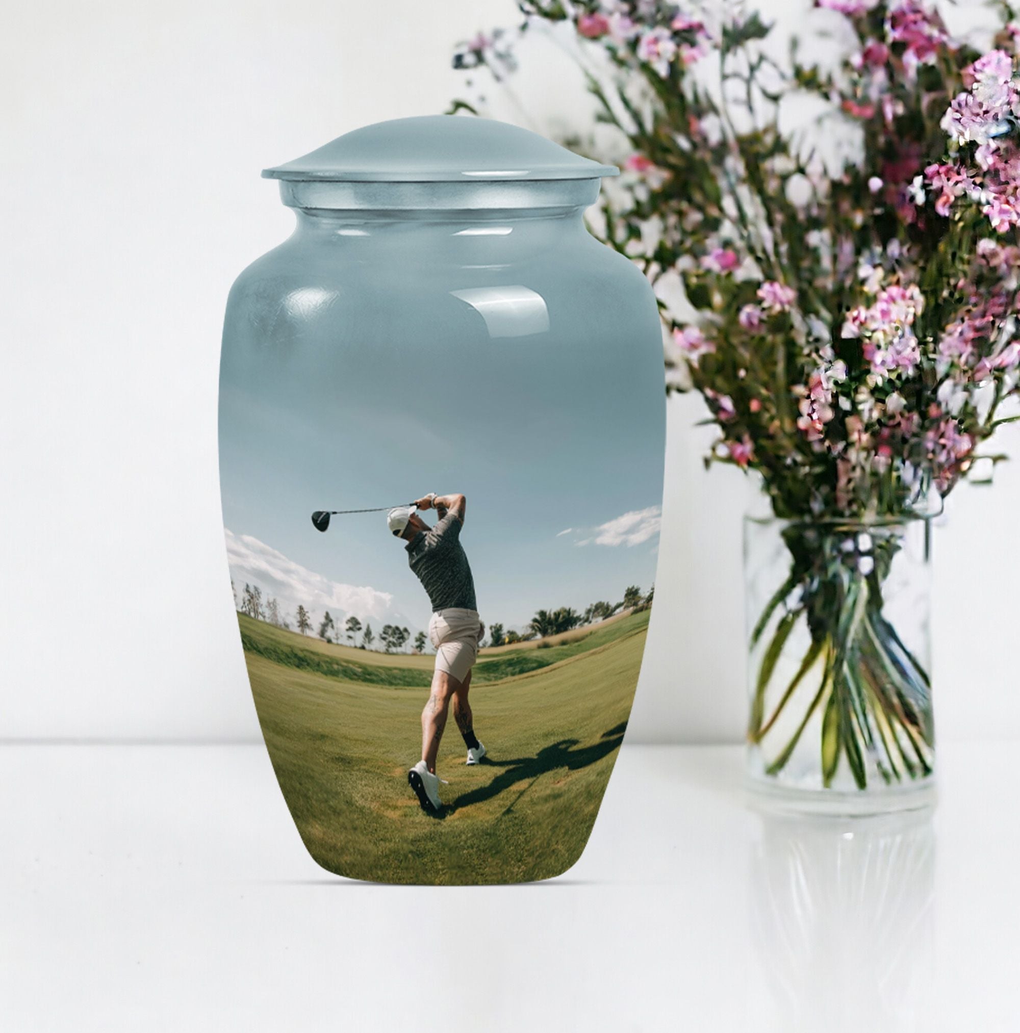 This elegantly-crafted Aluminium 10-inch urn is not just a simple vessel, but a thoughtful commemoration designed to house the ashes of your loved ones. Within its heaviness weighing 3.3 pounds, it signifies the preciousness and delicacy of the memories it holds inside. Its generous capacity of 200 cubic inches allows it to accommodate the remains of a loved one comfortably. Along with the classic urn, you also receive a soft velvet pouch, adding an extra layer of protection and respect to the ashes' containment. The abstract theme that this large urn embodies offers a timeless appeal, acting as a physical reminder of spiritual connections. Our golf Urn incorporates options for customizations, letting you personalize with engraved names, making it a unique memento. This cremation memorial urn offers an excellent way to honor and remember your loved ones. Often searched for as burial urn for human ashes, this is a perfect choice cremation urn man, urn for ashes for women or cremation urns large. Embrace this loving way to express your respect, love, and remembrance.