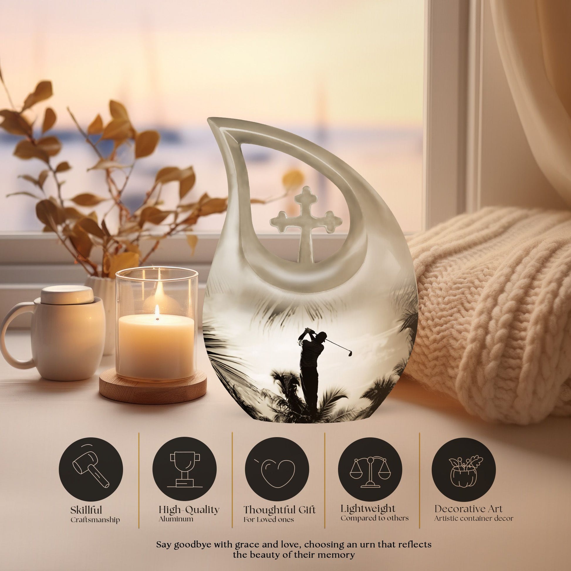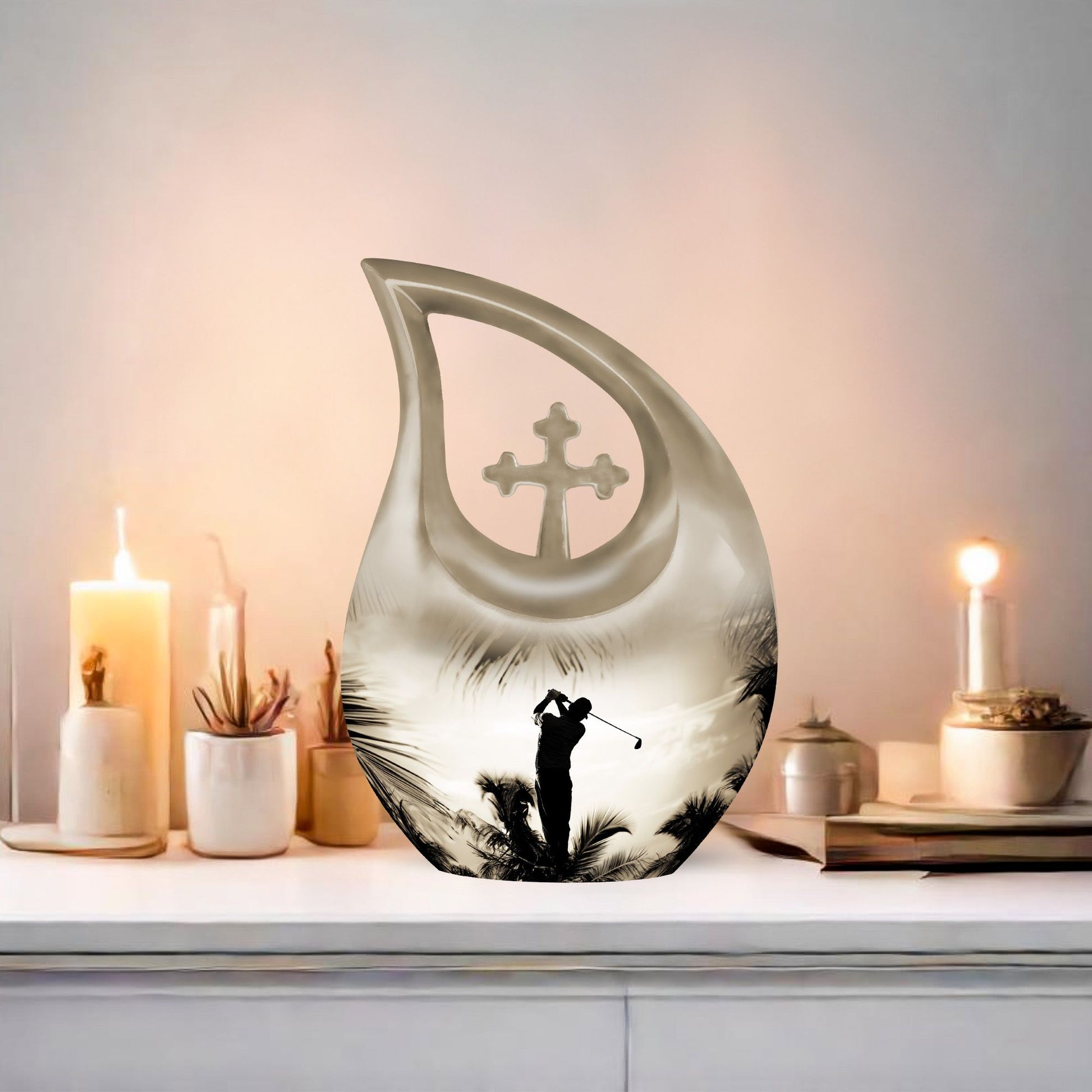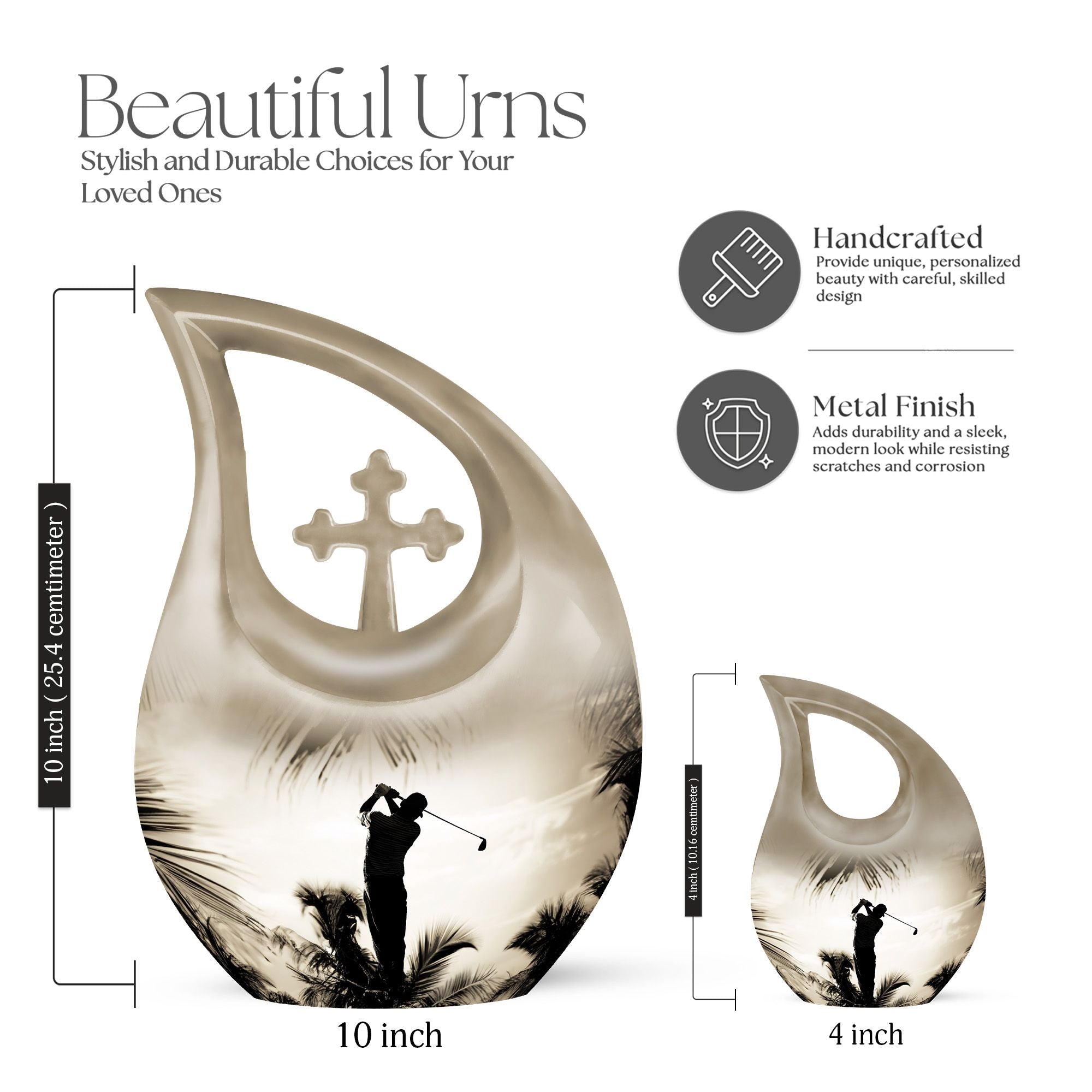 Embrace this heartfelt and poignant way of remembering your dearest one with this Golf-themed Urn, an exquisite piece within our category of Funeral Urns for Ashes. Crafted with finesse, this 10-Inch large urn is perfect for Adults and Seniors seeking a tangible commemoration. Showcasing a unique 'Cross Drop' emblem in an intricate golf motif, this Aluminium Urn weighs 3.3 pounds and is robust, rendering an impactful testament of lasting love. Along with a comfortable capacity of 200 cubic inches, the urn comes with an elegant velvet pouch, ensuring a compassionate containment of ashes. Add to its uniqueness by personalizing it with engraved names, offering a special touch to this memorial urn. Escape the generic urn types with this bespoke Funeral urn option, a tender remembrance of your beloved.