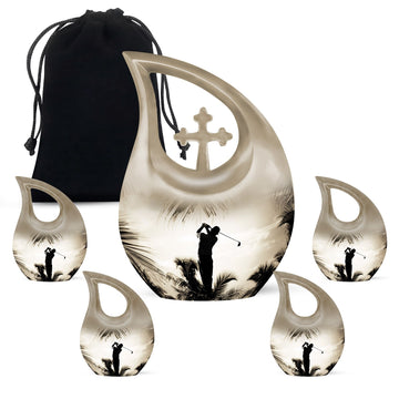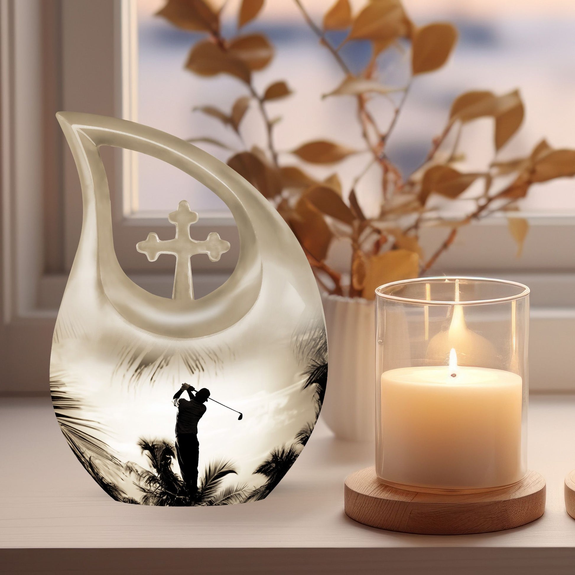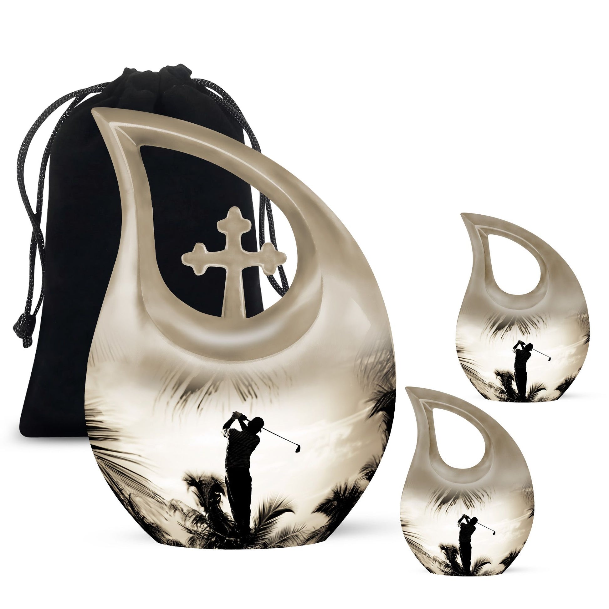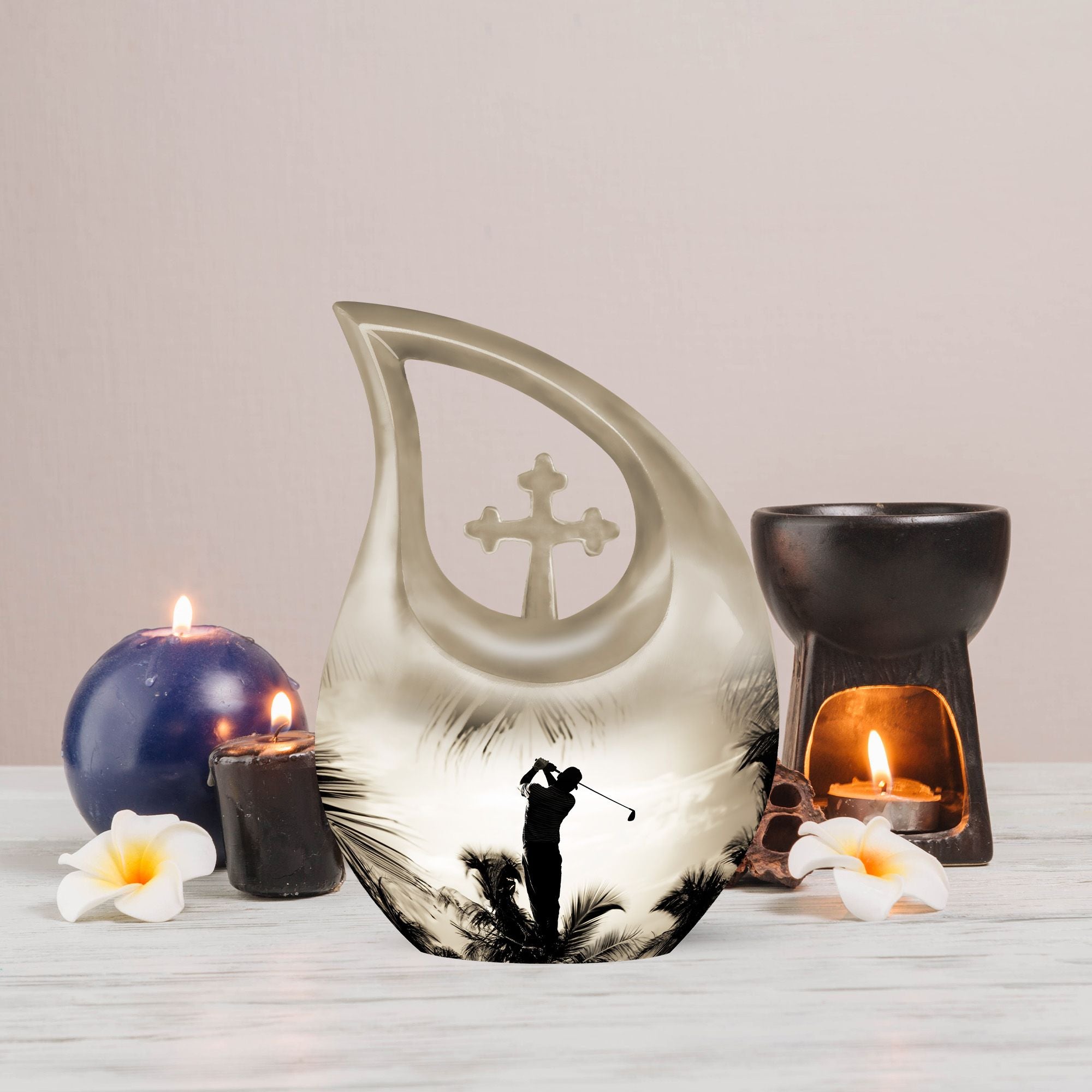 Embrace this heartfelt and poignant way of remembering your dearest one with this Golf-themed Urn, an exquisite piece within our category of Funeral Urns for Ashes. Crafted with finesse, this 10-Inch large urn is perfect for Adults and Seniors seeking a tangible commemoration. Showcasing a unique 'Cross Drop' emblem in an intricate golf motif, this Aluminium Urn weighs 3.3 pounds and is robust, rendering an impactful testament of lasting love. Along with a comfortable capacity of 200 cubic inches, the urn comes with an elegant velvet pouch, ensuring a compassionate containment of ashes. Add to its uniqueness by personalizing it with engraved names, offering a special touch to this memorial urn. Escape the generic urn types with this bespoke Funeral urn option, a tender remembrance of your beloved.