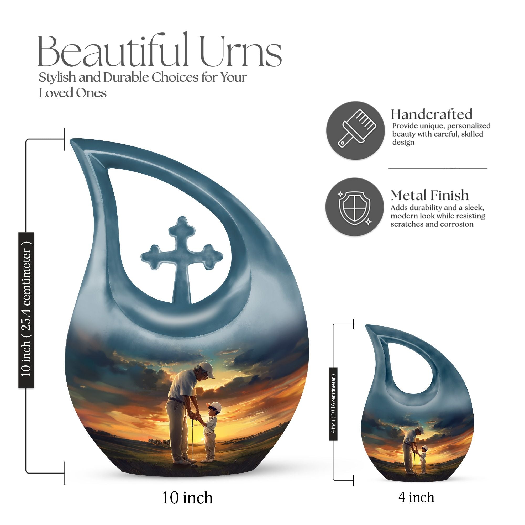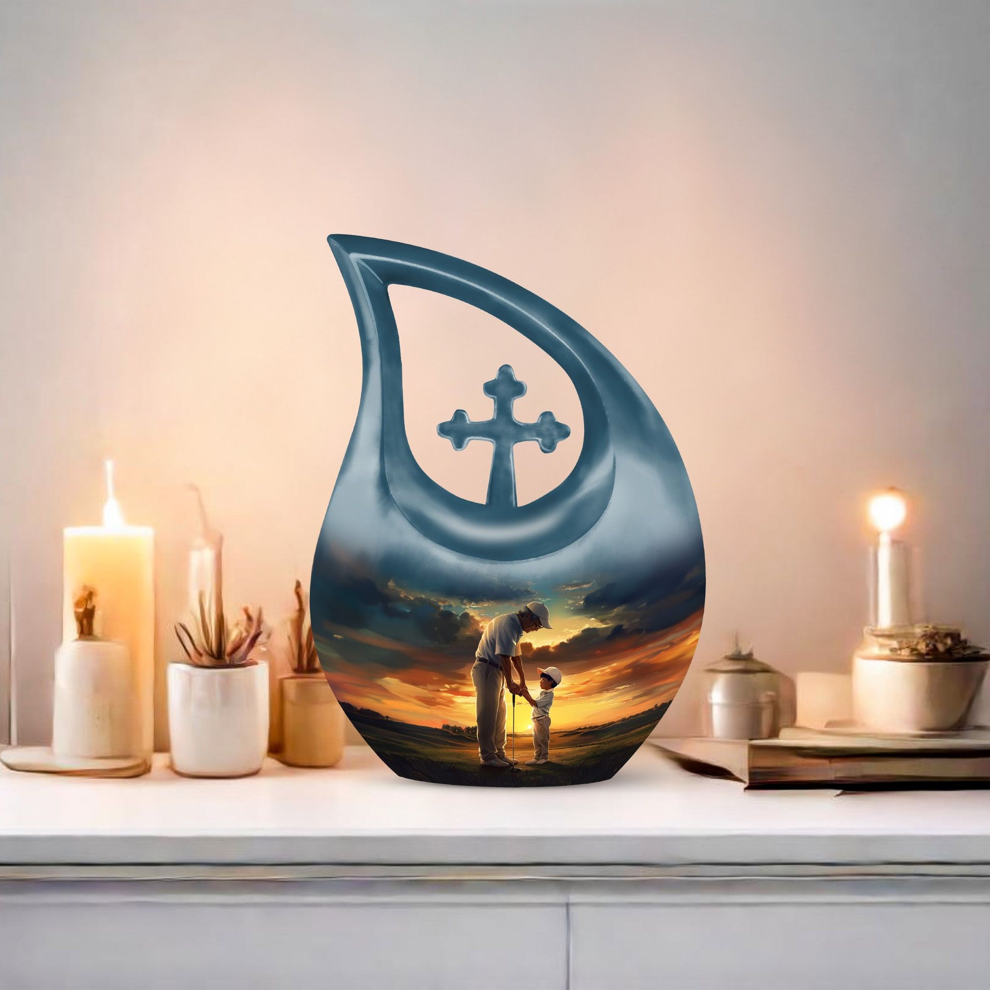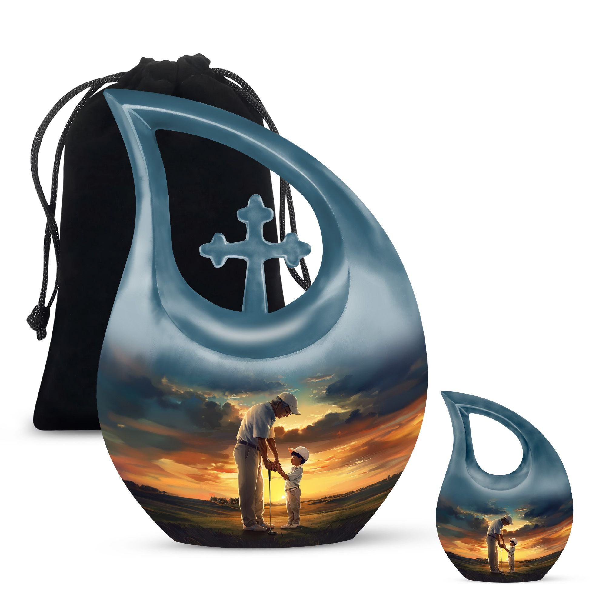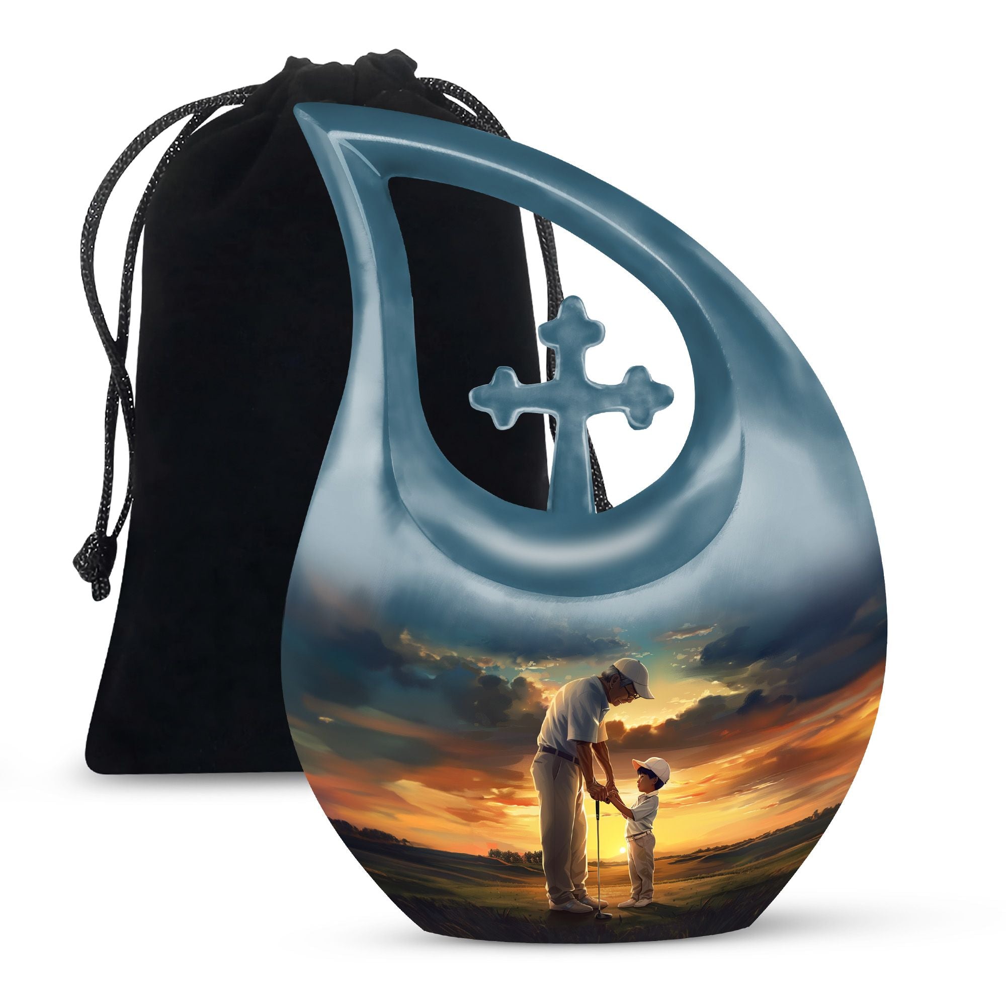 Cherish the memory of your dearly departed with our dignified Golf Urn, a distinctive selection in the realm of memorial urns. This item is not merely an affordable cremation and burial urn, but a detailed piece of art. The intricate 'Cross Drop' shape is lovingly crafted from sturdy aluminium, ensuring a lifespan that befits its pivotal role. Our large urn stands 10 inches tall, has a weight of 3.3 pounds, and a capacity of 200 cubic inches. Suitable for adult or senior individuals, this memorable Golf urn serves as an enduring home for ashes, carefully contained within a complimentary velvet pouch provided in the package. Personalize this urn by engraving names across the exterior surface, a feature that adds a unique and heart-warming touch. Carry the essence of your beloved closer, preserving memories while contributing to the sustainability of the planet with this biodegradable urn. Experience a soulful blend of reverence and elegance with our Golf Urn, an affordable keepsake for cremation ashes that forms a perfect tribute to your departed loved one.