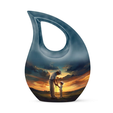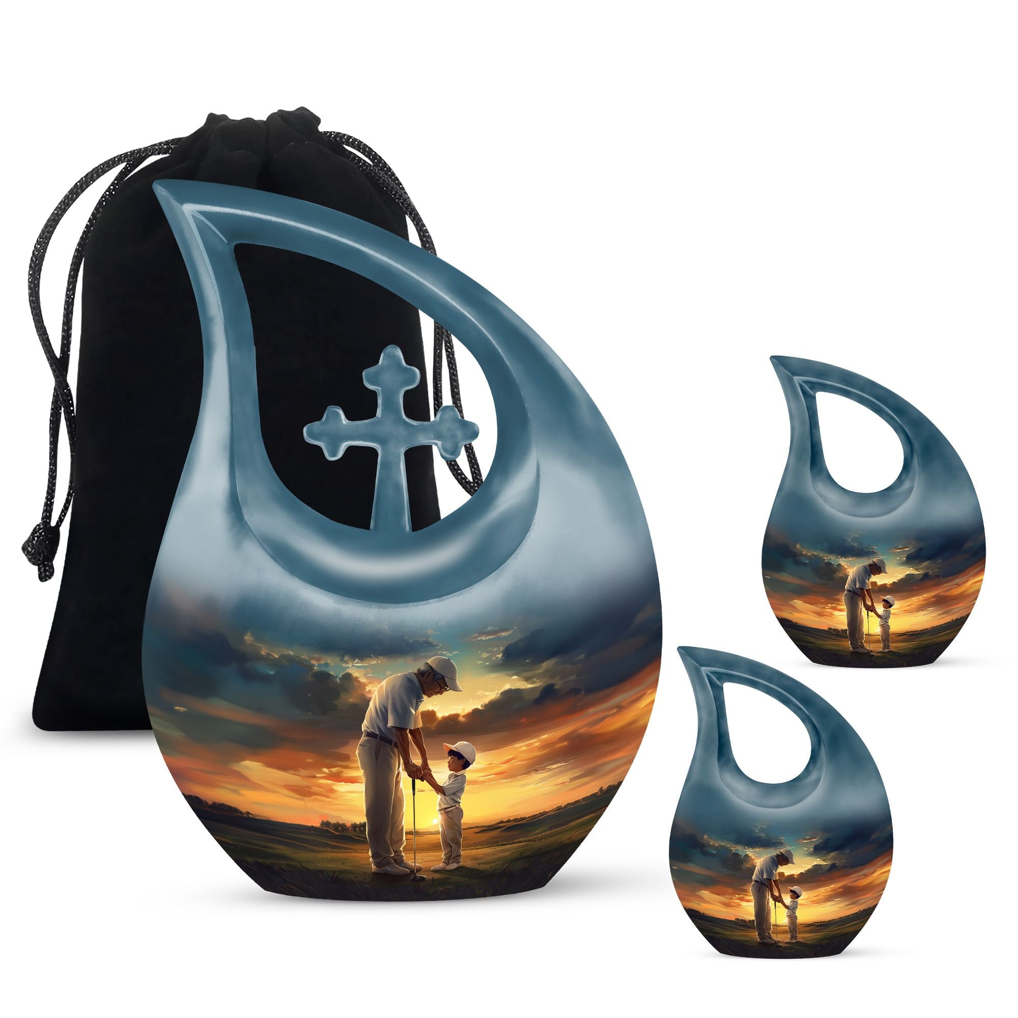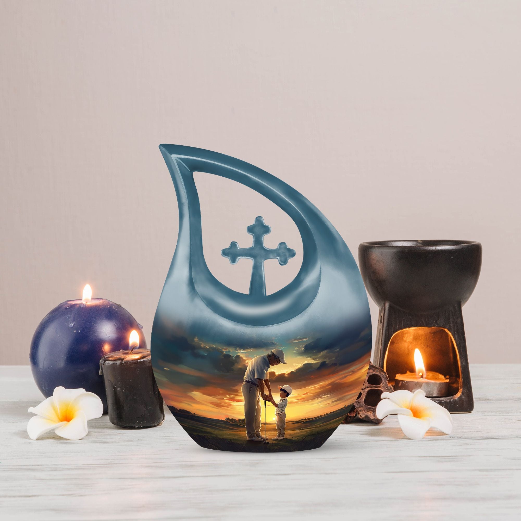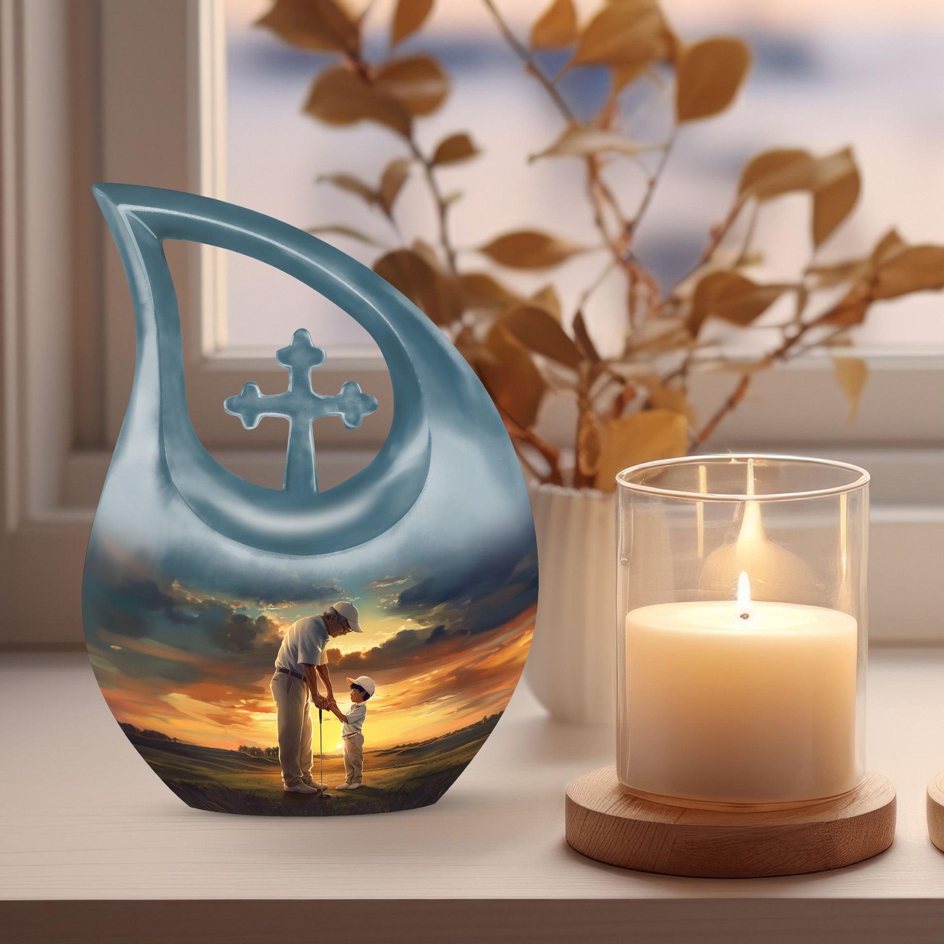Cherish the memory of your dearly departed with our dignified Golf Urn, a distinctive selection in the realm of memorial urns. This item is not merely an affordable cremation and burial urn, but a detailed piece of art. The intricate 'Cross Drop' shape is lovingly crafted from sturdy aluminium, ensuring a lifespan that befits its pivotal role. Our large urn stands 10 inches tall, has a weight of 3.3 pounds, and a capacity of 200 cubic inches. Suitable for adult or senior individuals, this memorable Golf urn serves as an enduring home for ashes, carefully contained within a complimentary velvet pouch provided in the package. Personalize this urn by engraving names across the exterior surface, a feature that adds a unique and heart-warming touch. Carry the essence of your beloved closer, preserving memories while contributing to the sustainability of the planet with this biodegradable urn. Experience a soulful blend of reverence and elegance with our Golf Urn, an affordable keepsake for cremation ashes that forms a perfect tribute to your departed loved one.