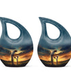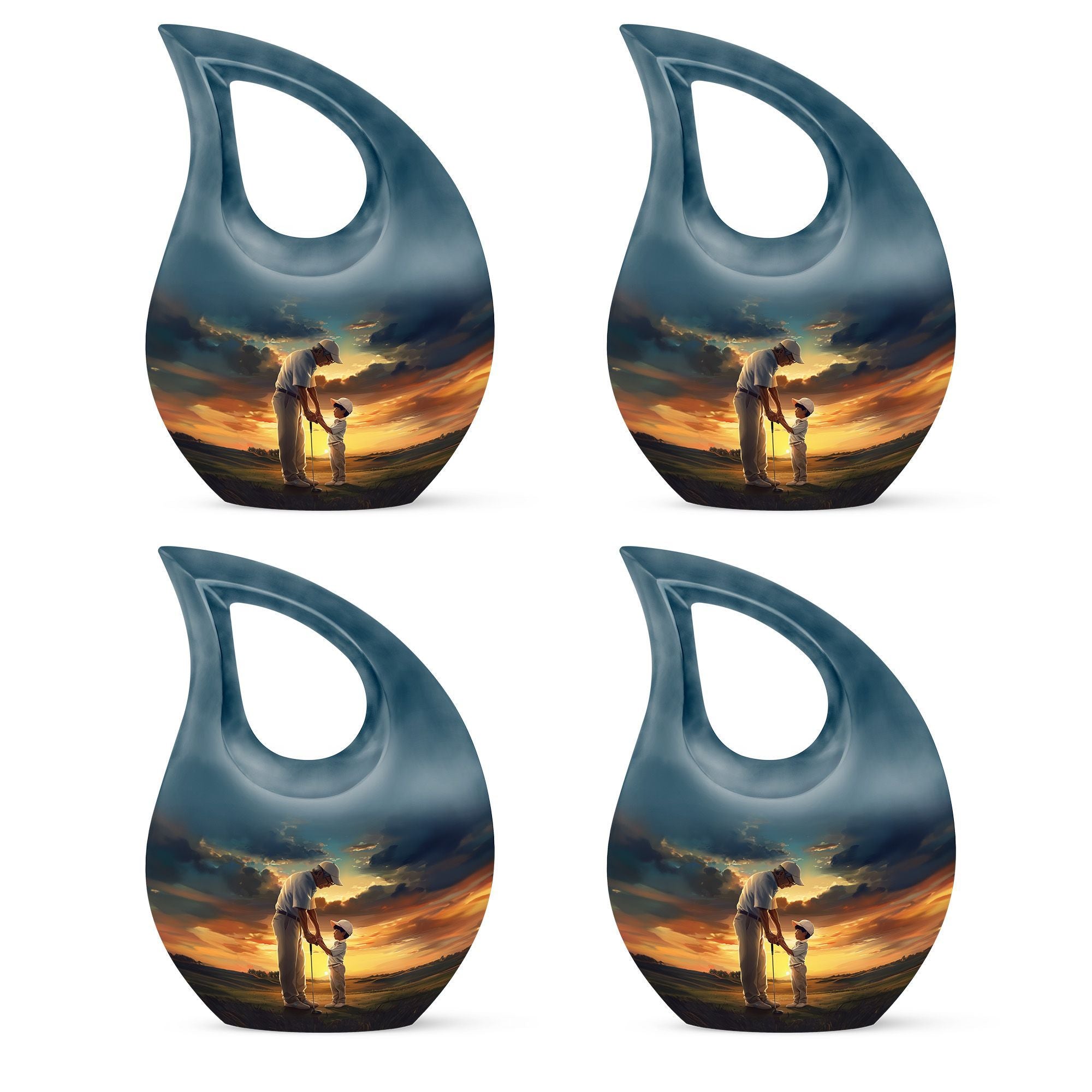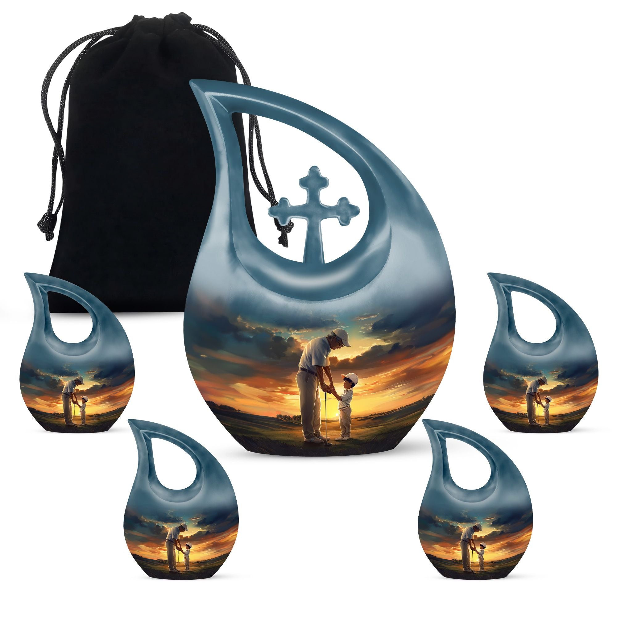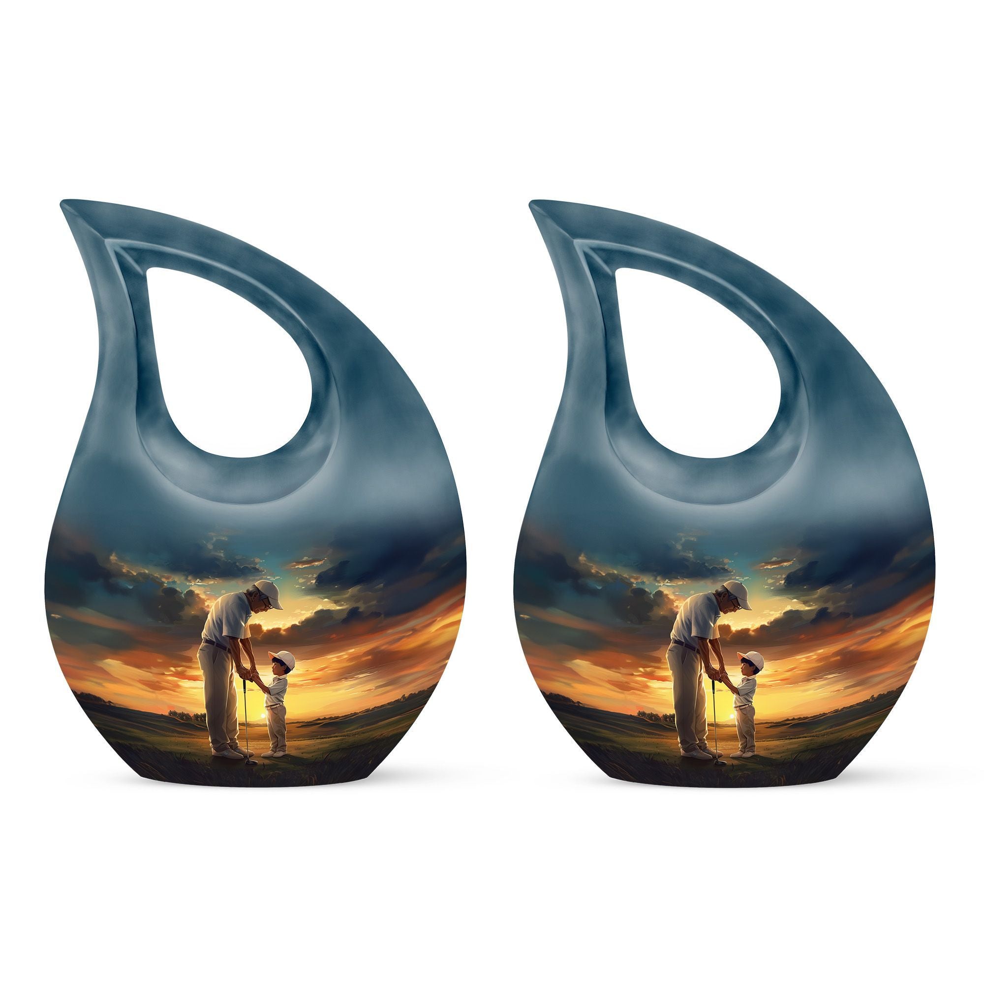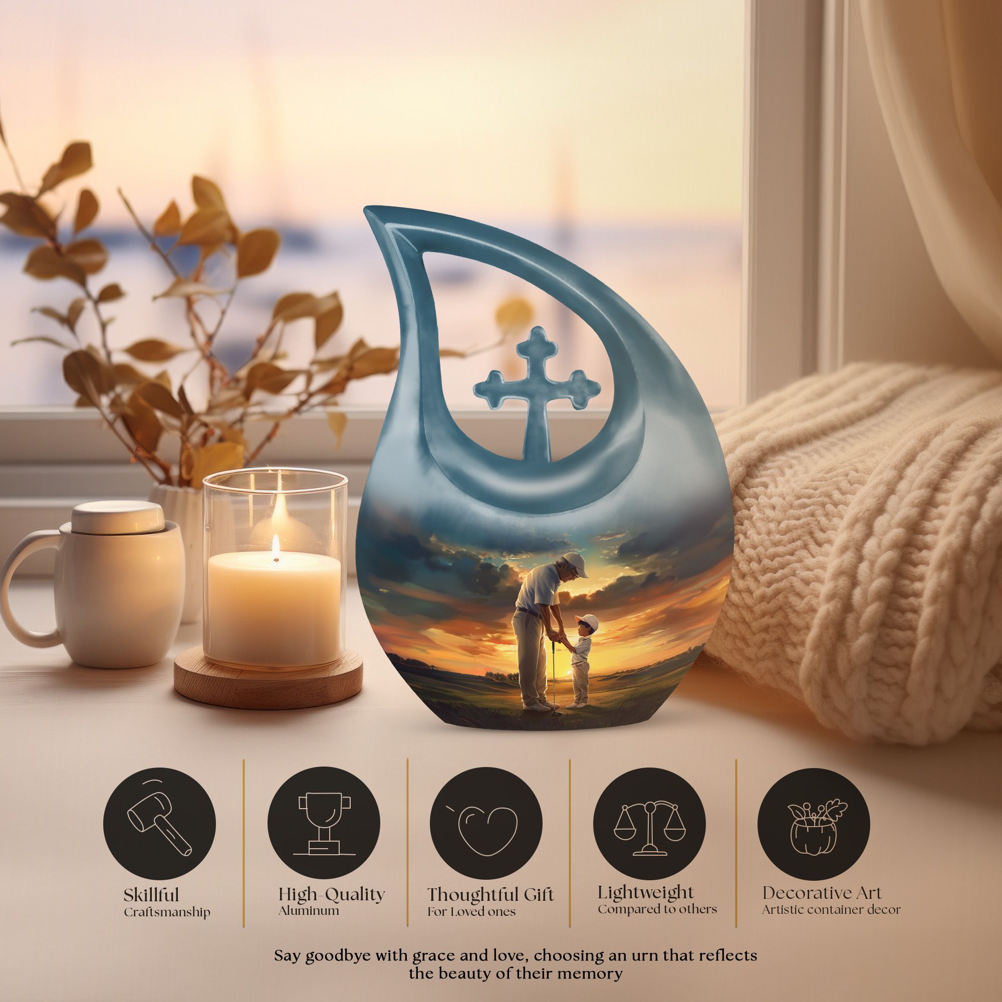Cherish the memory of your dearly departed with our dignified Golf Urn, a distinctive selection in the realm of memorial urns. This item is not merely an affordable cremation and burial urn, but a detailed piece of art. The intricate 'Cross Drop' shape is lovingly crafted from sturdy aluminium, ensuring a lifespan that befits its pivotal role. Our large urn stands 10 inches tall, has a weight of 3.3 pounds, and a capacity of 200 cubic inches. Suitable for adult or senior individuals, this memorable Golf urn serves as an enduring home for ashes, carefully contained within a complimentary velvet pouch provided in the package. Personalize this urn by engraving names across the exterior surface, a feature that adds a unique and heart-warming touch. Carry the essence of your beloved closer, preserving memories while contributing to the sustainability of the planet with this biodegradable urn. Experience a soulful blend of reverence and elegance with our Golf Urn, an affordable keepsake for cremation ashes that forms a perfect tribute to your departed loved one.