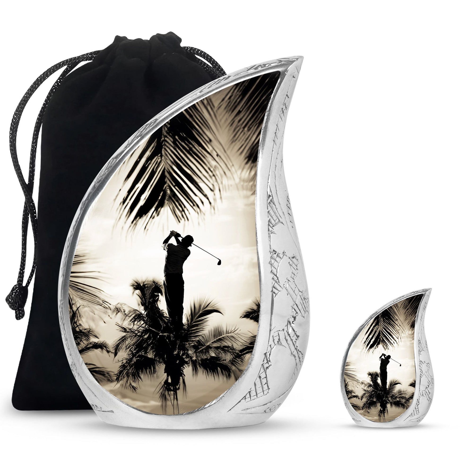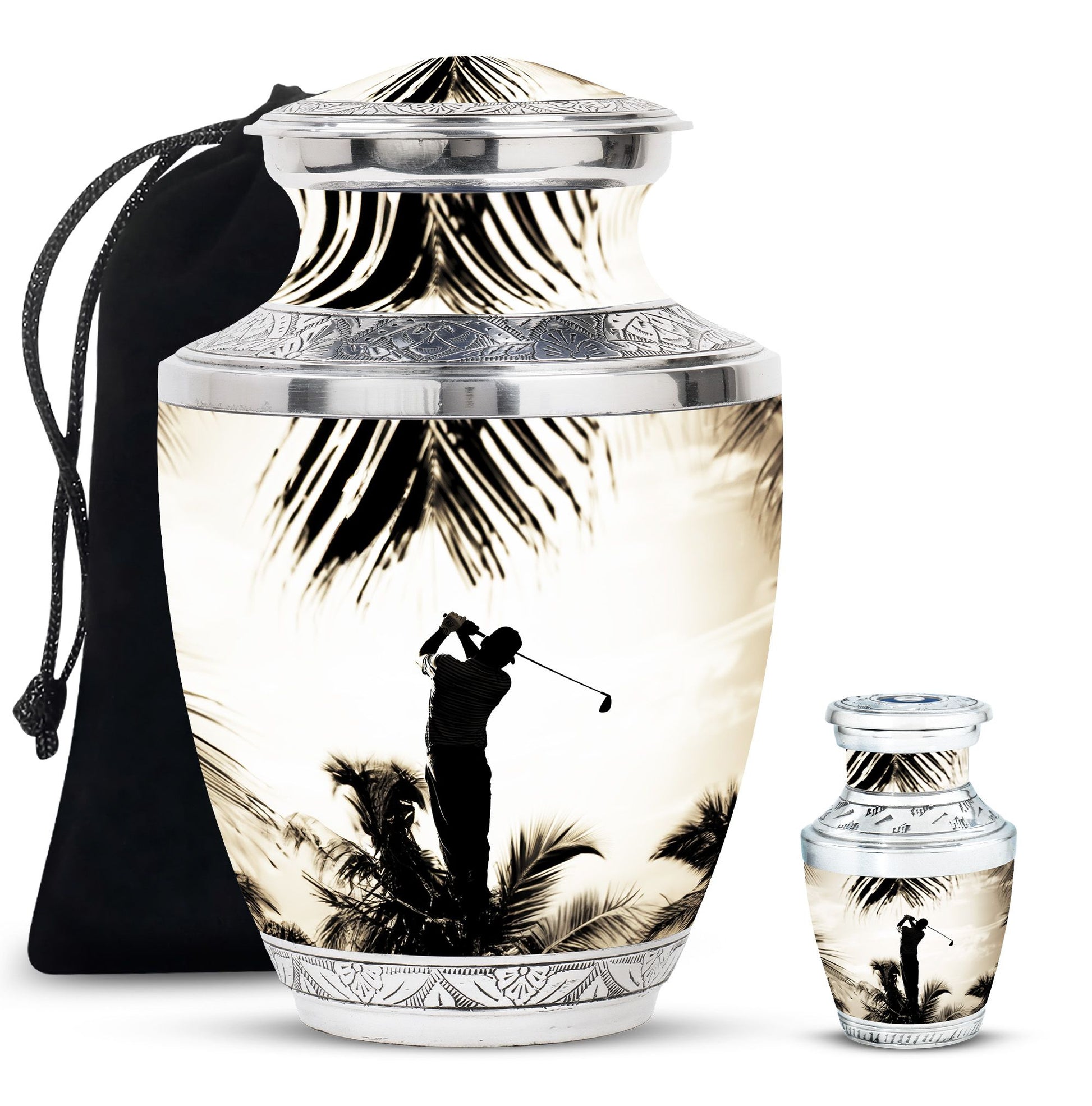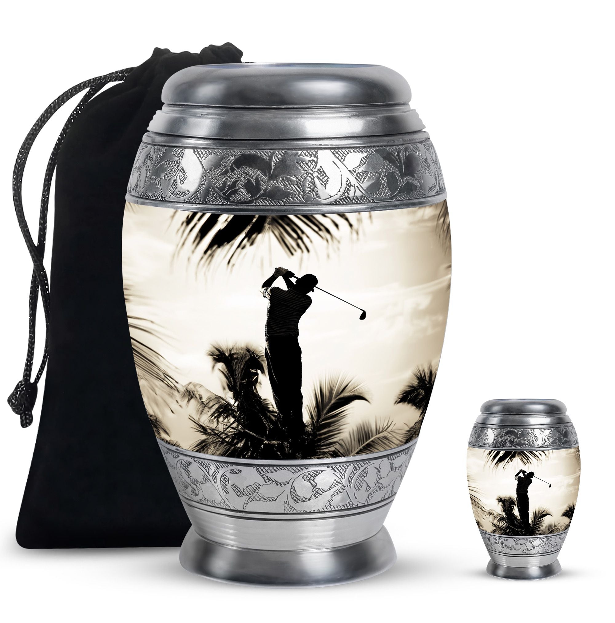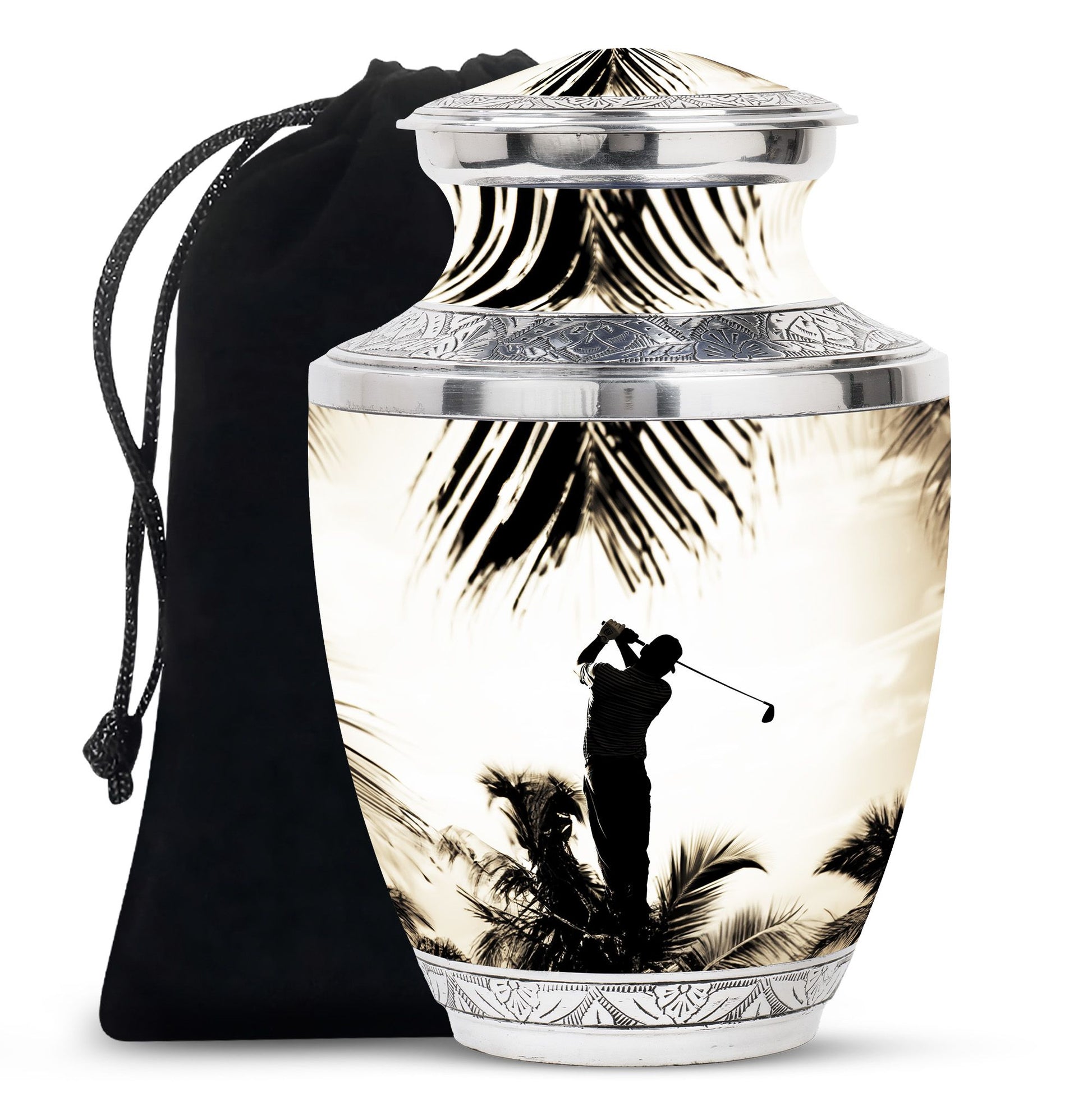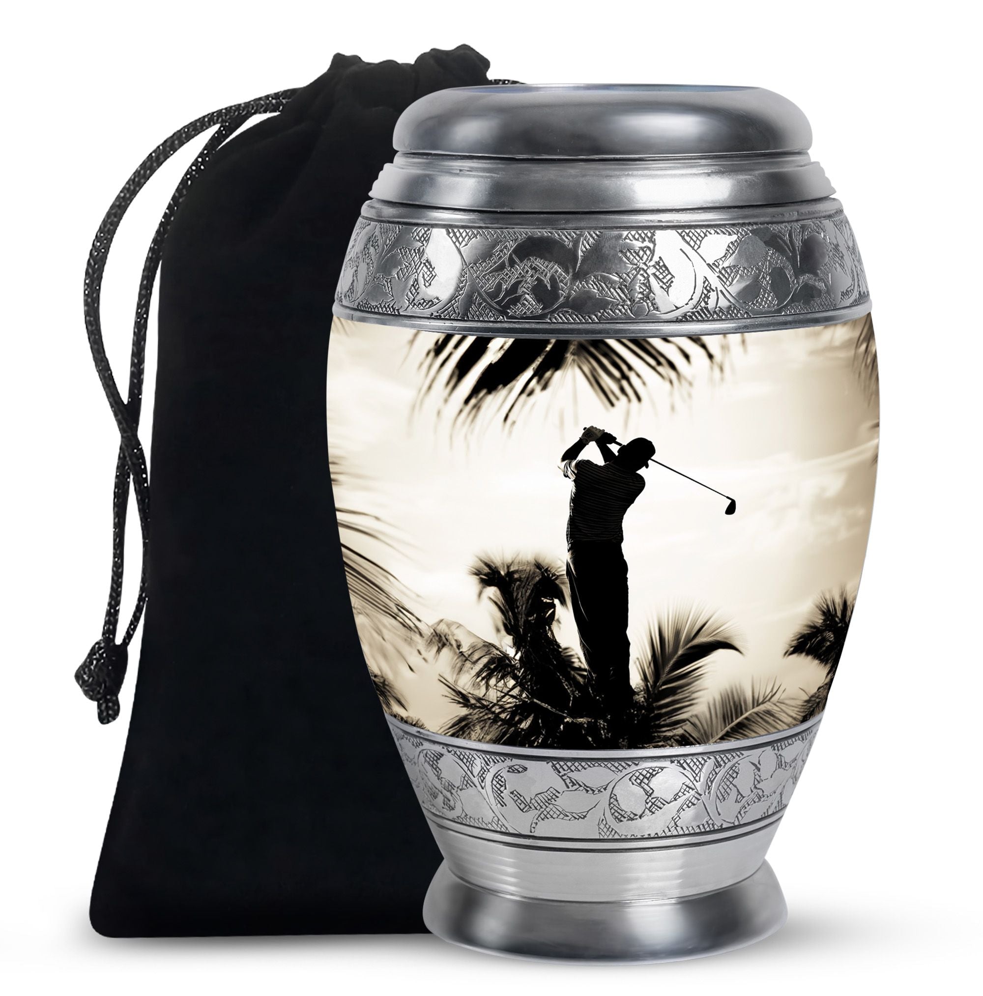 Crafted from durable aluminum, this urn showcases strength, elegance, and artistry. The polished surface and golf motif make it a distinctive large decorative urn, perfect for those who lived with a passion for the game. With a secure screw-top lid and generous capacity, it functions as a large funeral urn for home or burial, while the keepsake urns offer a way to hold memories close.