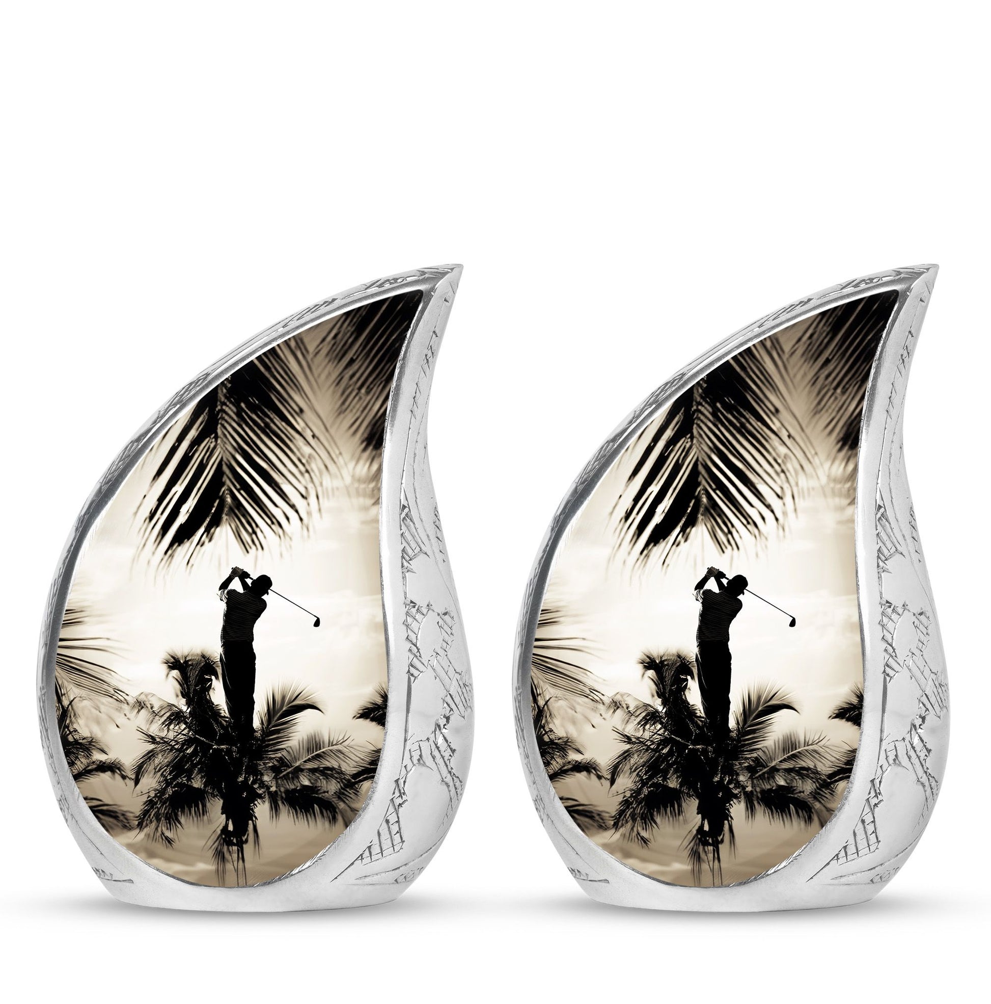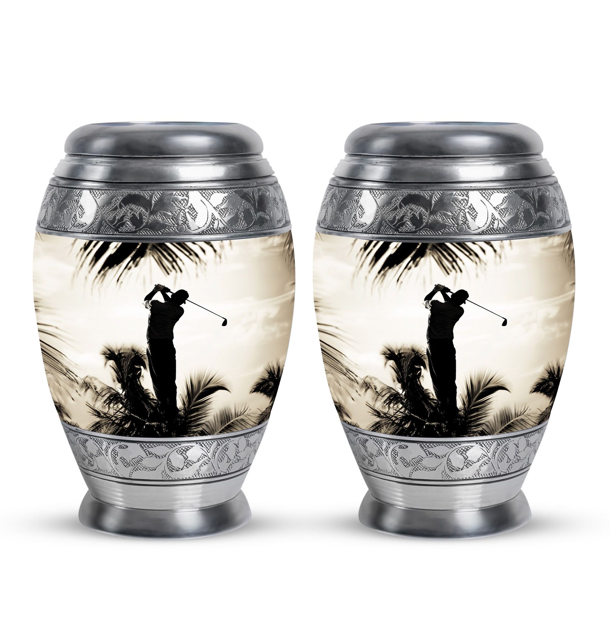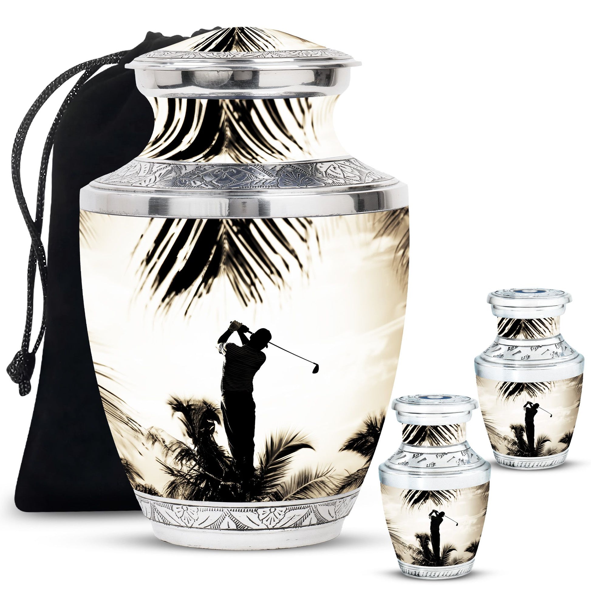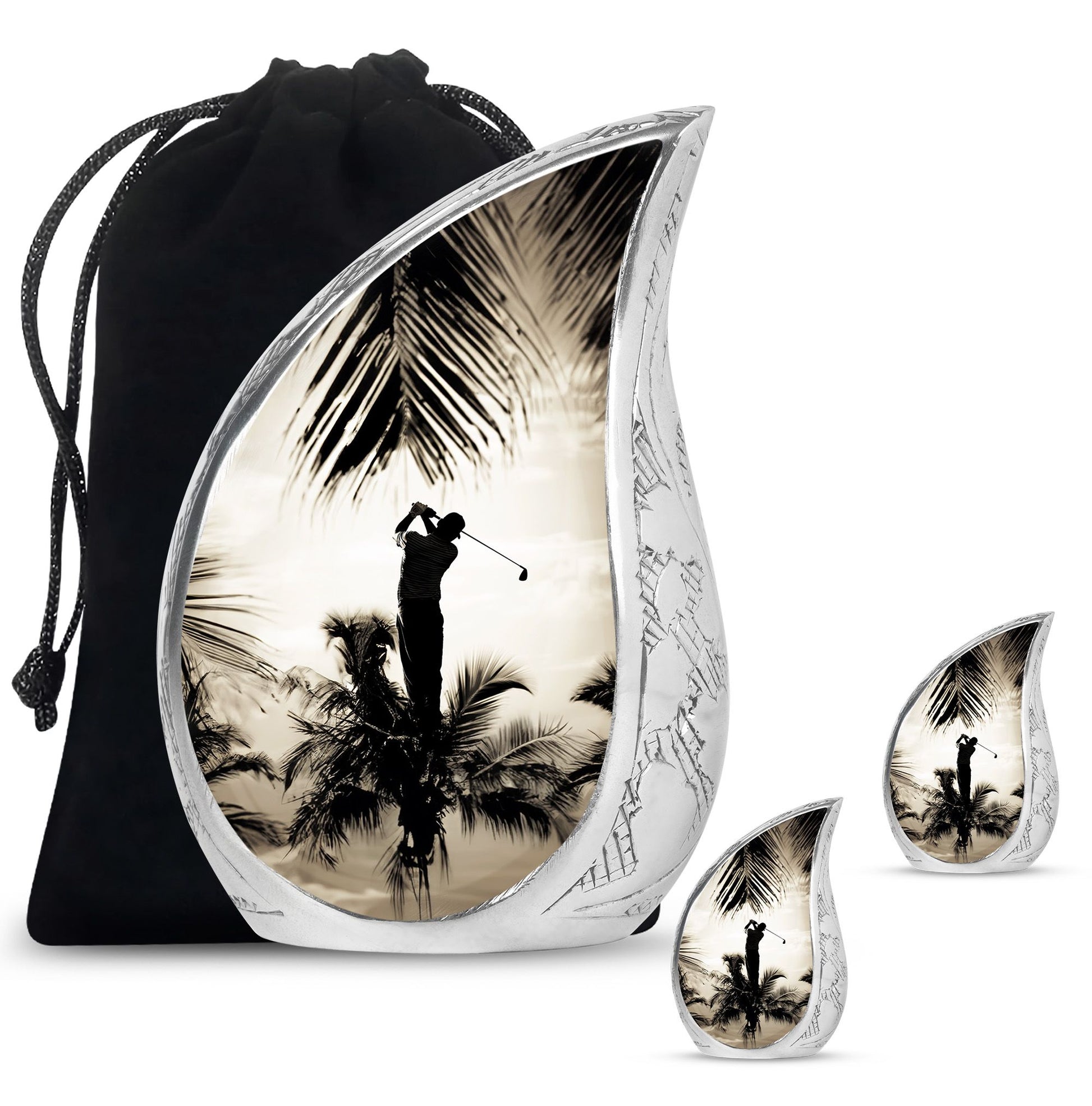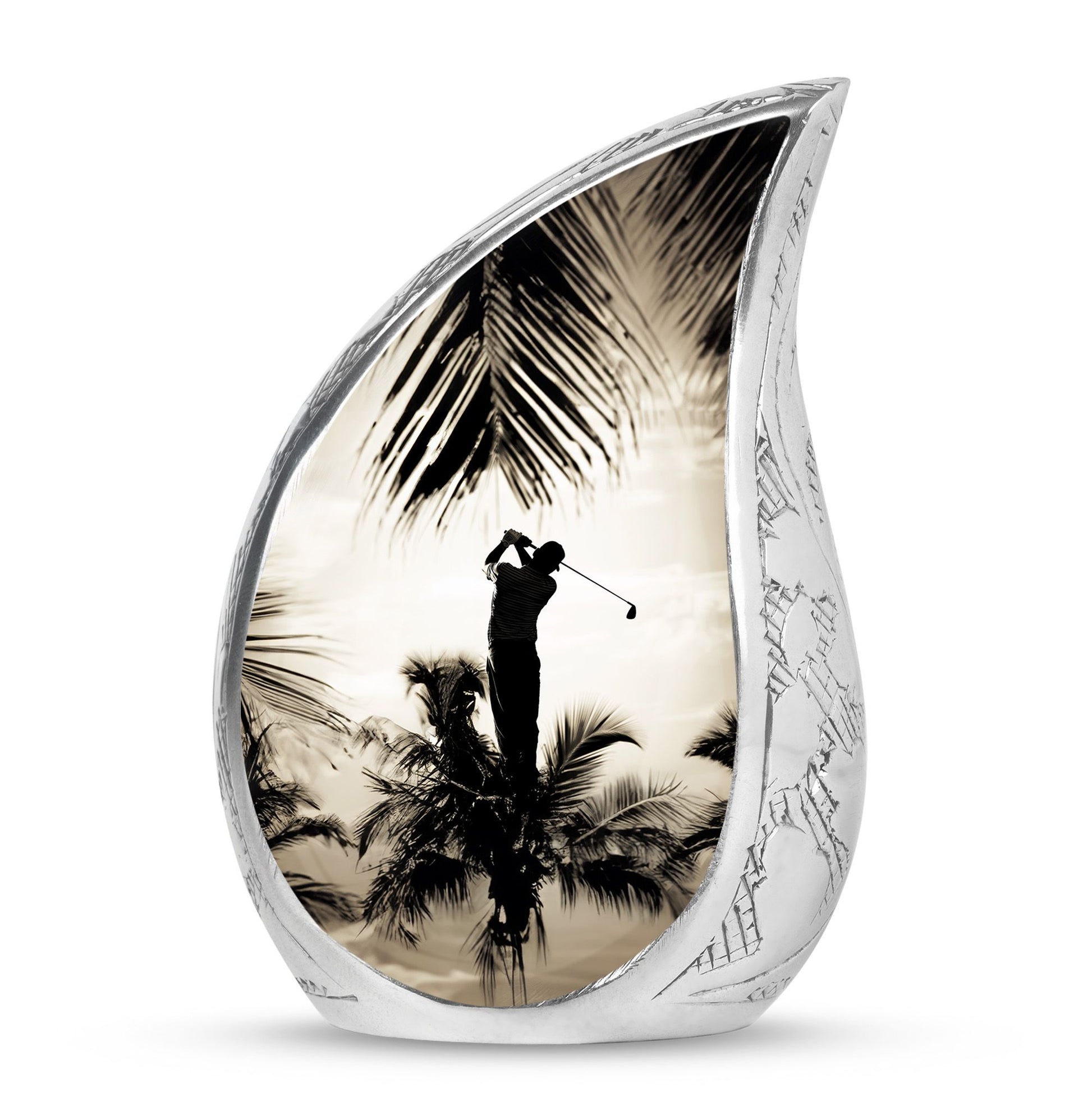 Crafted from durable aluminum, this urn showcases strength, elegance, and artistry. The polished surface and golf motif make it a distinctive large decorative urn, perfect for those who lived with a passion for the game. With a secure screw-top lid and generous capacity, it functions as a large funeral urn for home or burial, while the keepsake urns offer a way to hold memories close.