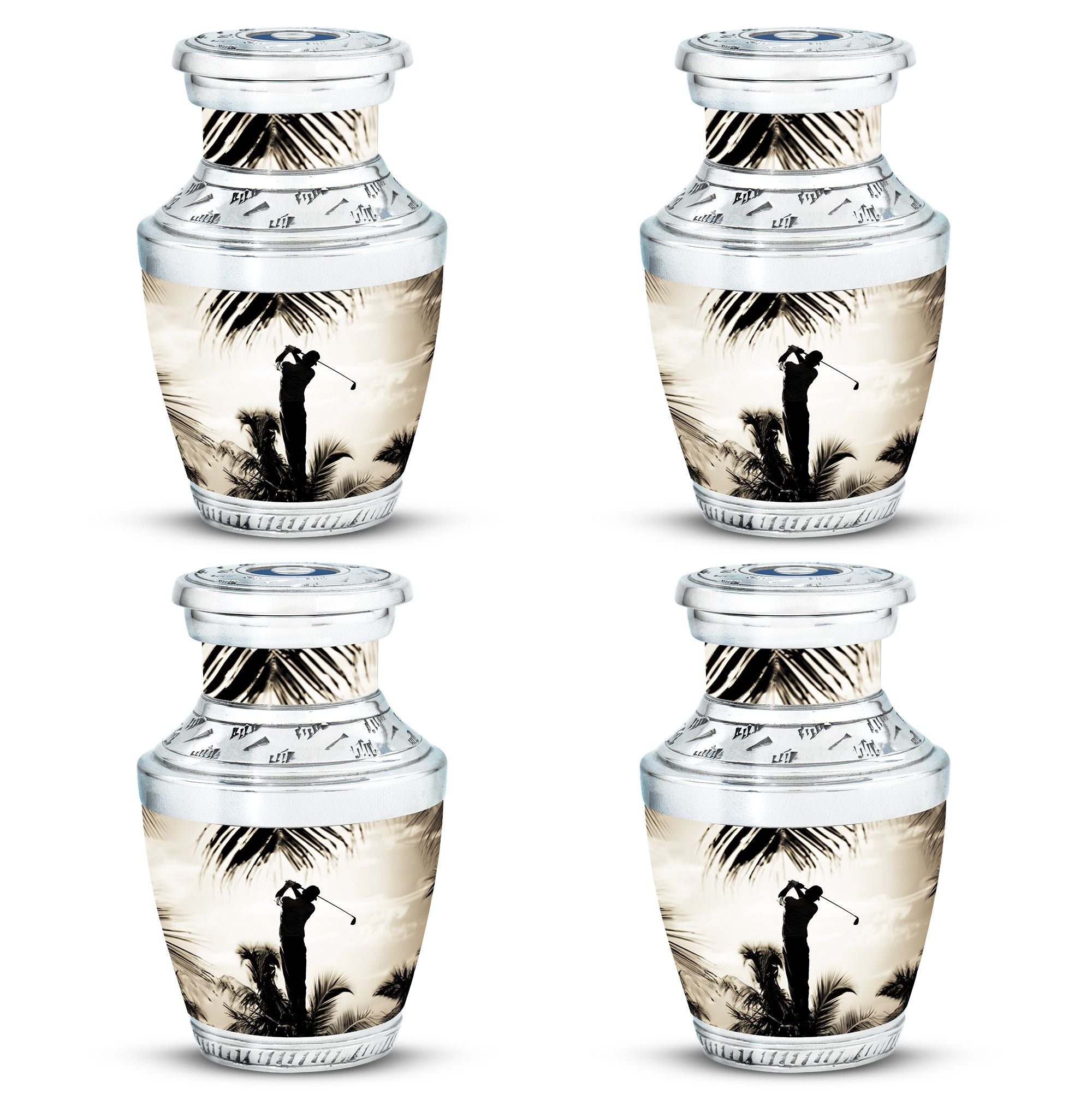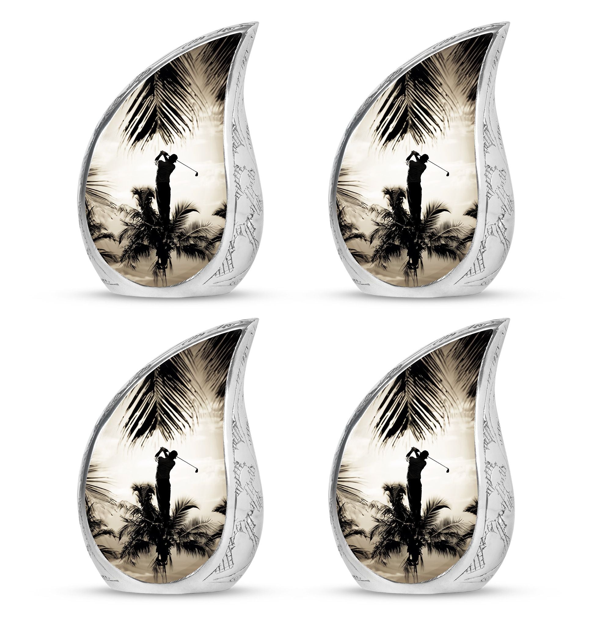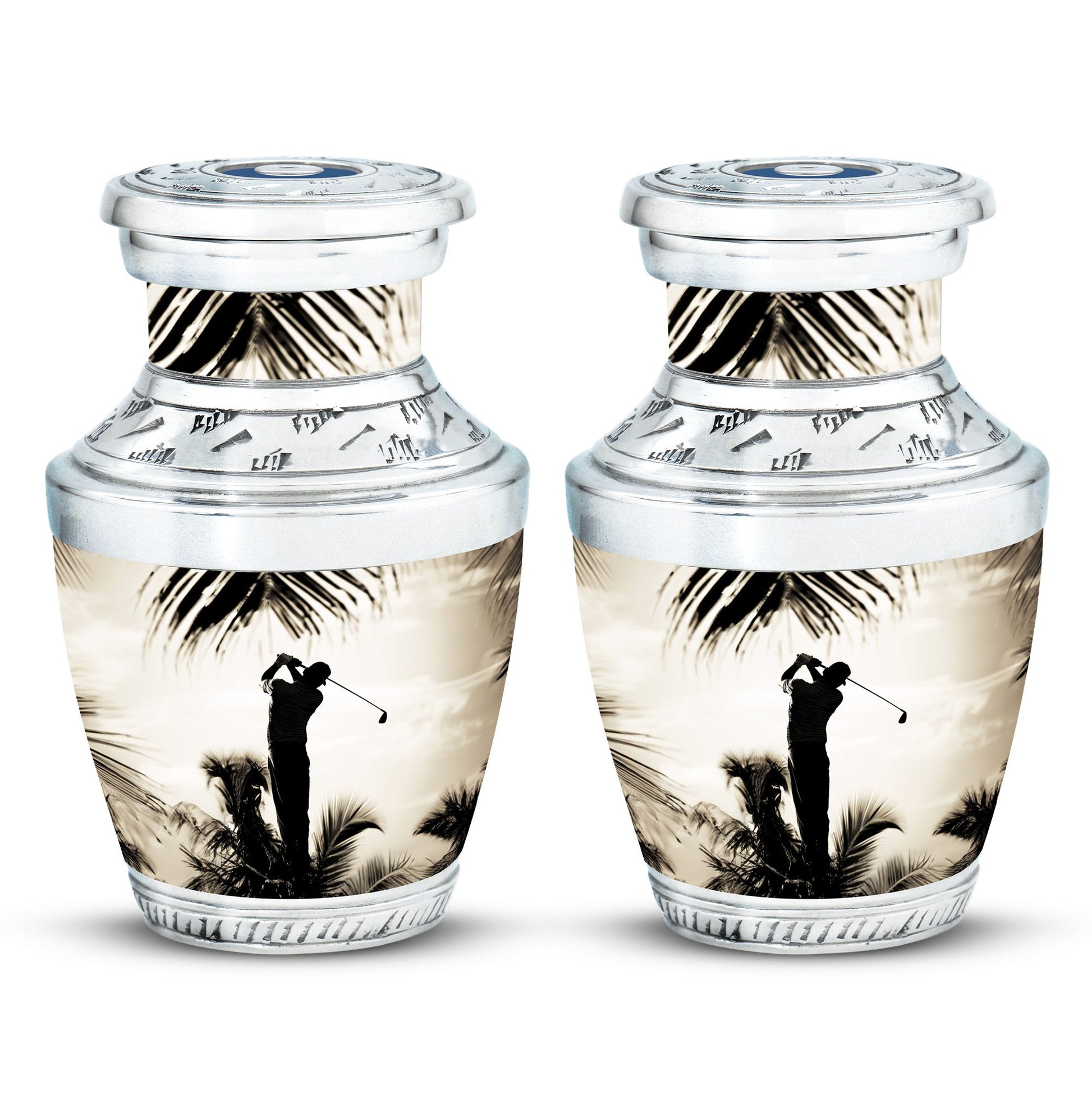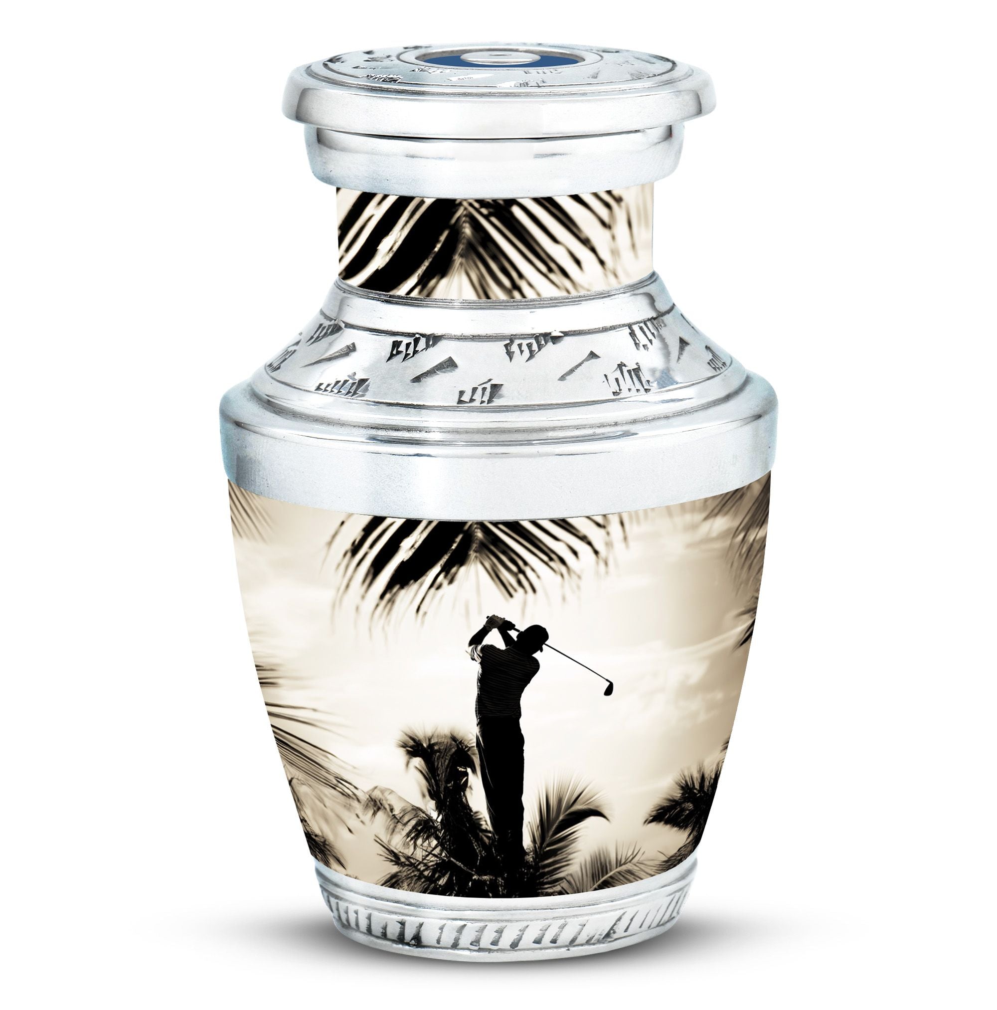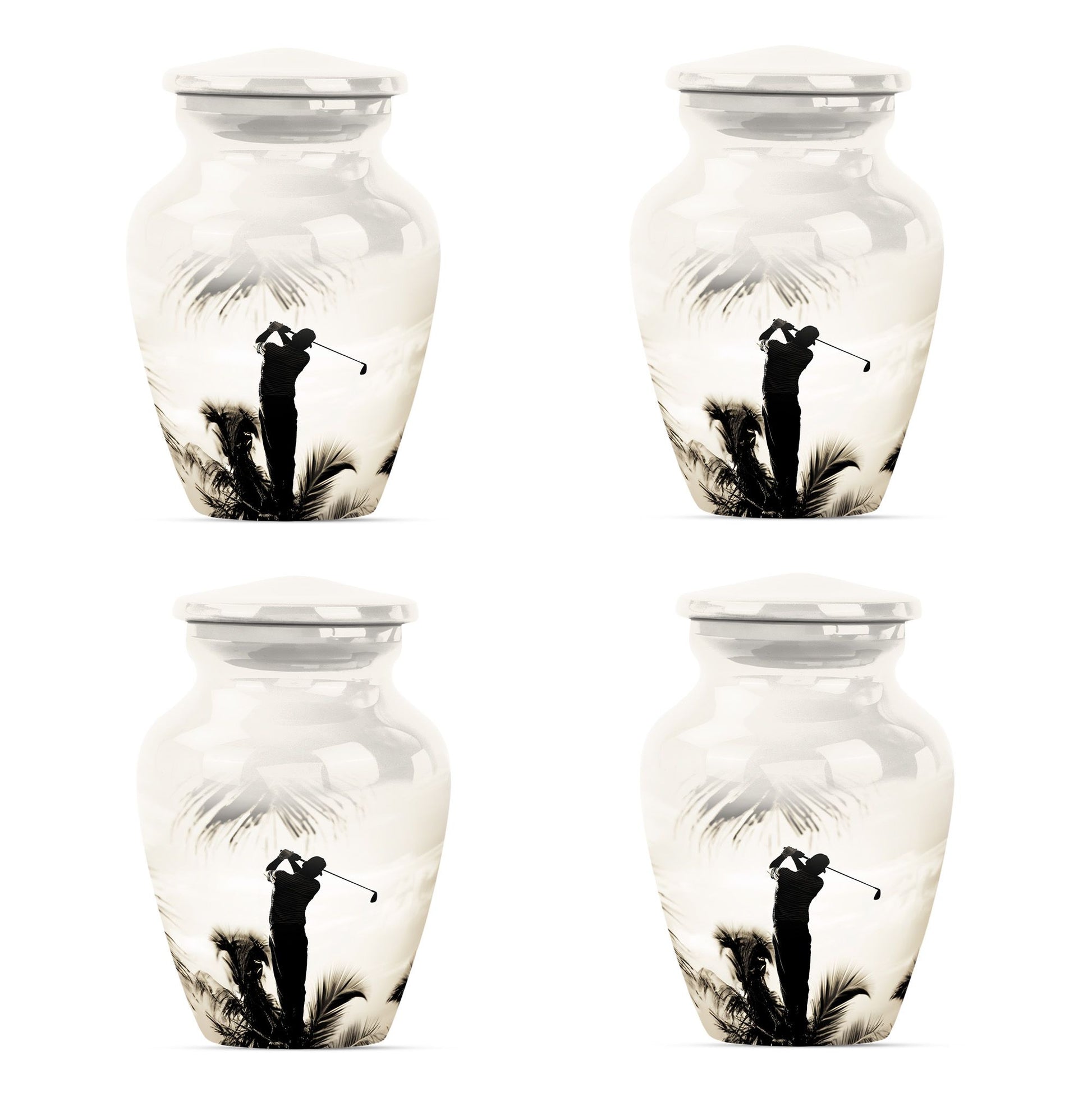 Crafted from durable aluminum, this urn showcases strength, elegance, and artistry. The polished surface and golf motif make it a distinctive large decorative urn, perfect for those who lived with a passion for the game. With a secure screw-top lid and generous capacity, it functions as a large funeral urn for home or burial, while the keepsake urns offer a way to hold memories close.