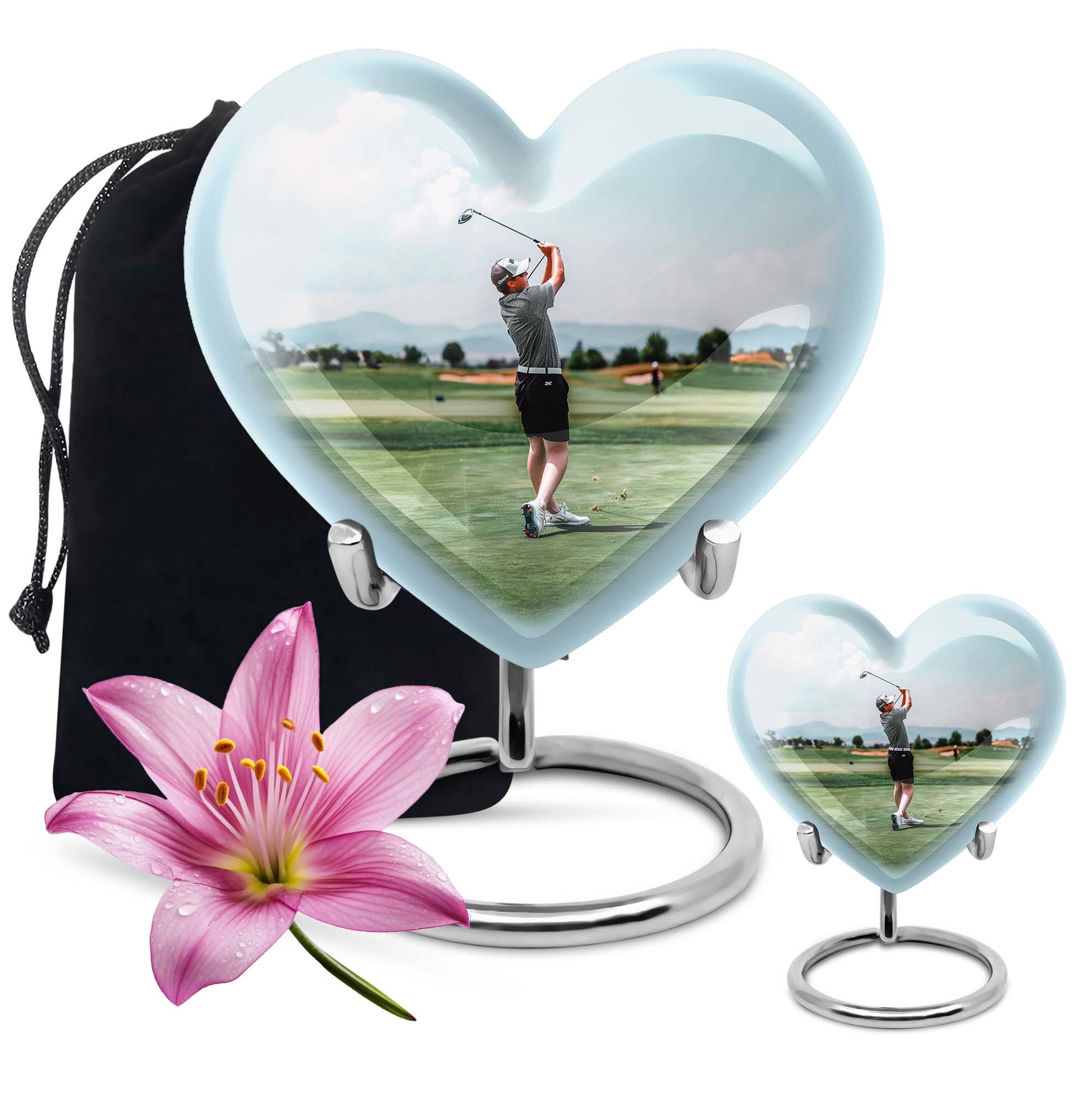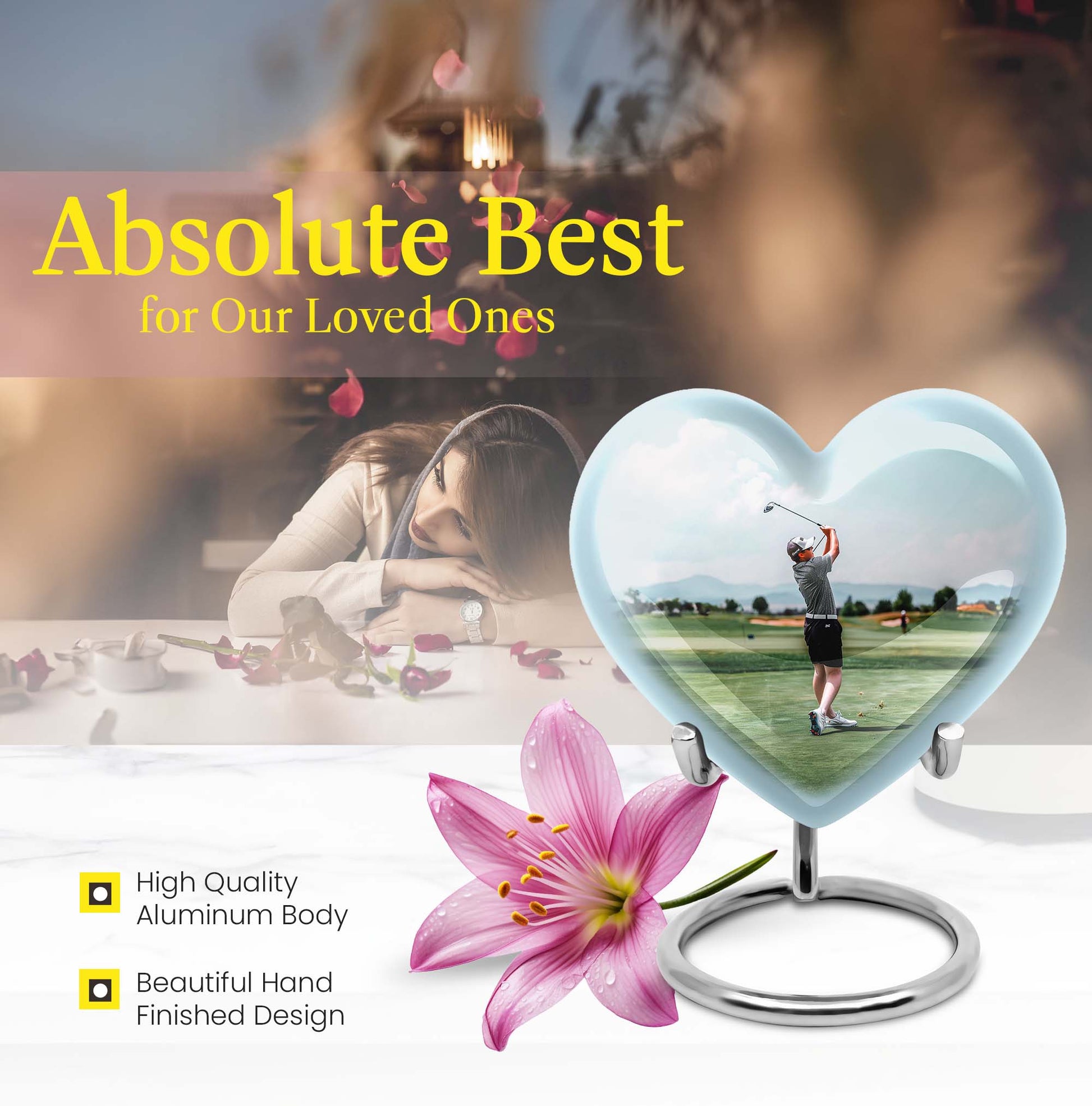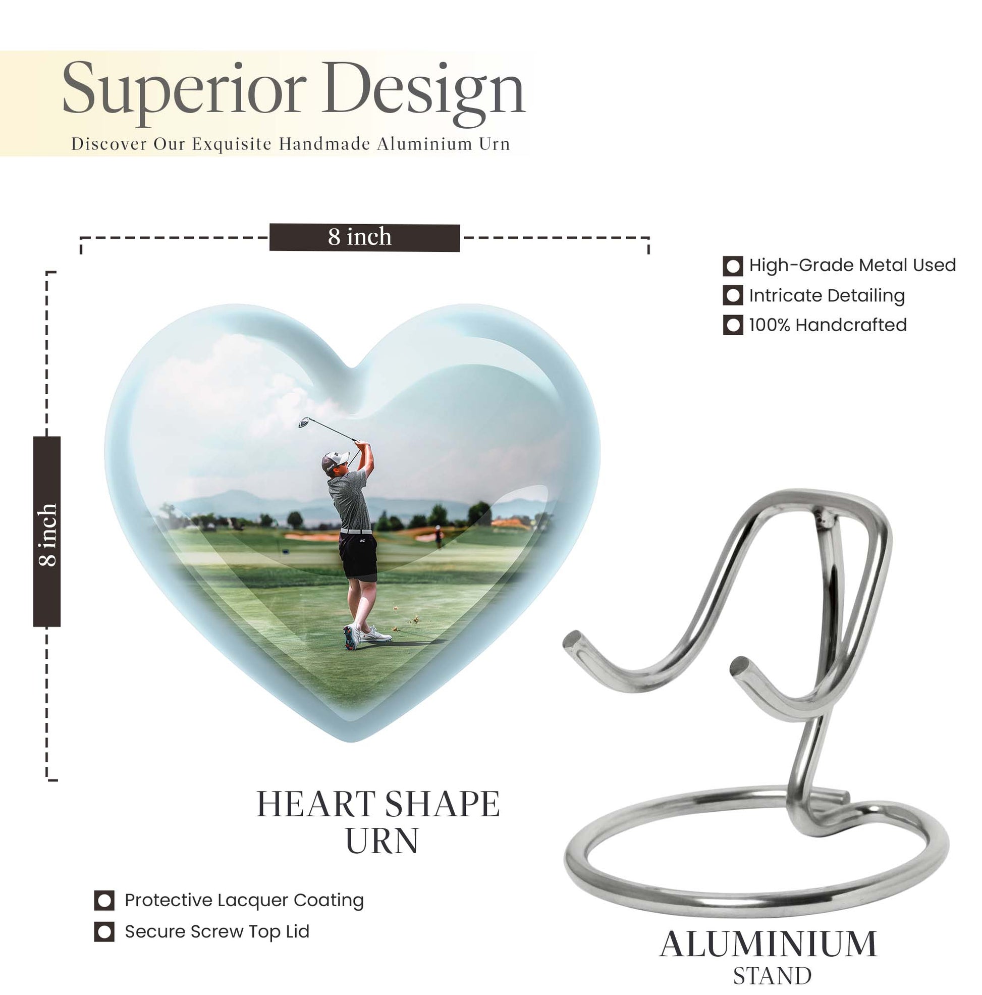 Introduce an element of sublime distinctiveness to your cherished ceremonies with this uniquely crafted Large Urn. Crafted for adults and seniors, this 10-inch heart urn combines artistic abstraction with profound significance. Made with prime quality aluminium for an enduring legacy, it weighs a convenient 3.3 pounds and offers abundant capacity of 200 cubic inches. It's large enough to respectfully hold the ashes of your loved ones. This urn exhibits thoughtful personalization options, enabling you to engrave names for a deeply personal touch. Included with your purchase is a velvet pouch, providing a respectful containment for the precious remains. As a stand-out choice among funeral unique urns for human ashes, this cremation urn adds somber grace to memorial proceedings. The heart urn, elegantly linking the themes of love and remembrance, suits those seeking golf urn or a cremation urn burial. This is not just a vessel, but a tribute resplendent with memory, love, and dignity.