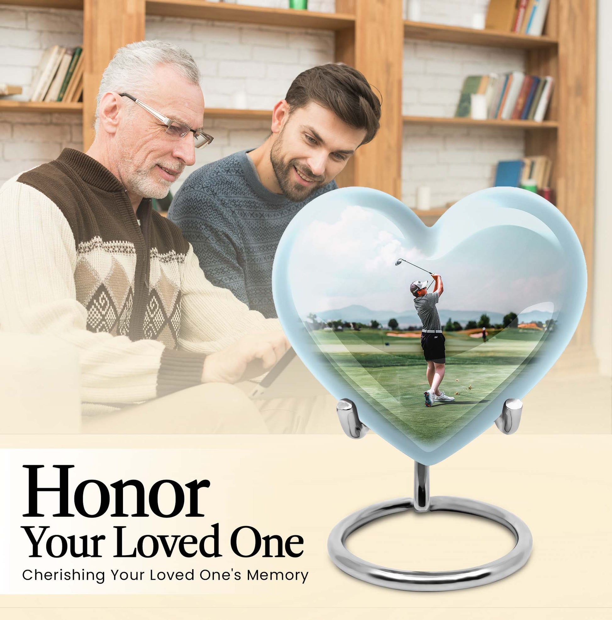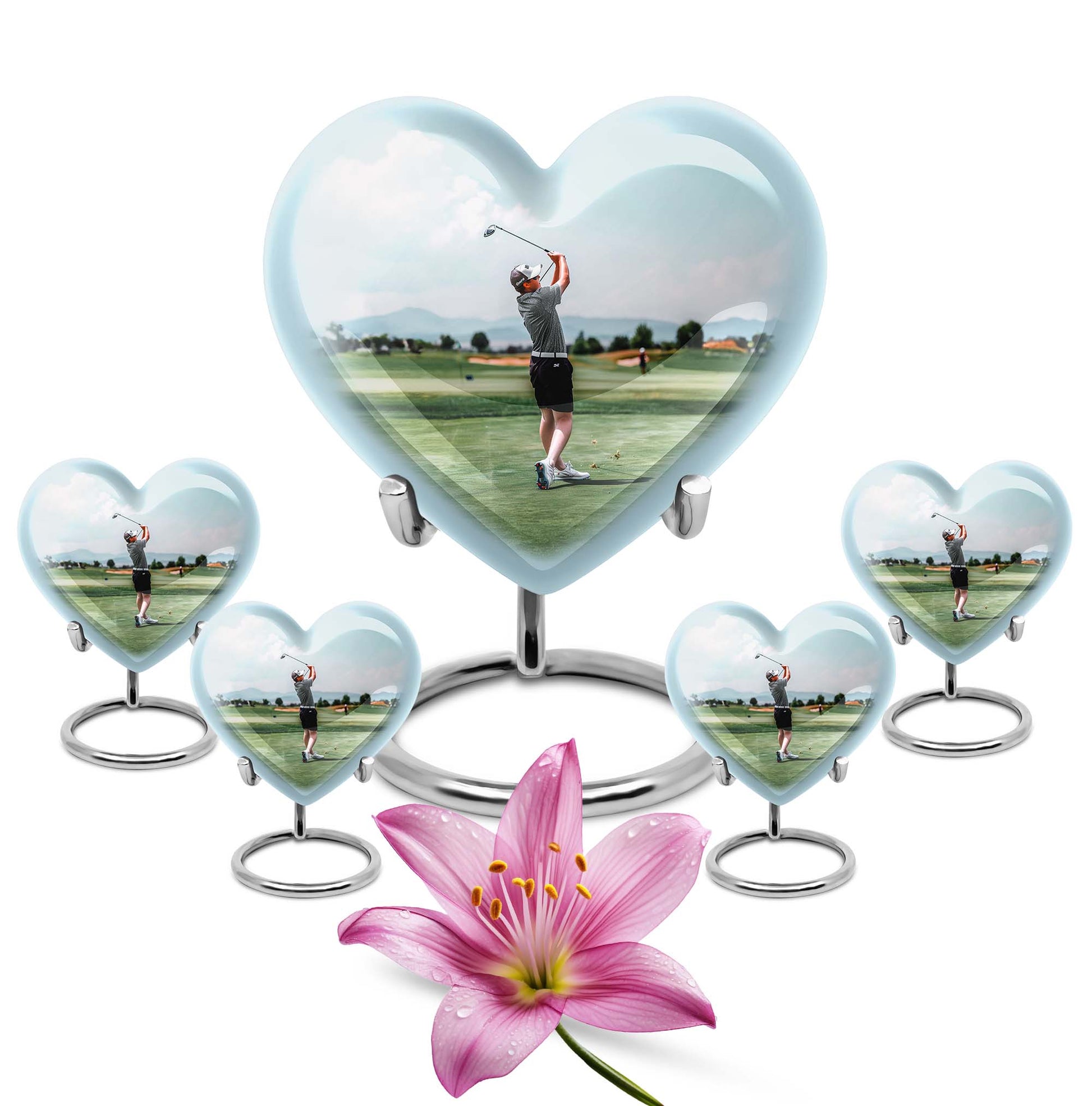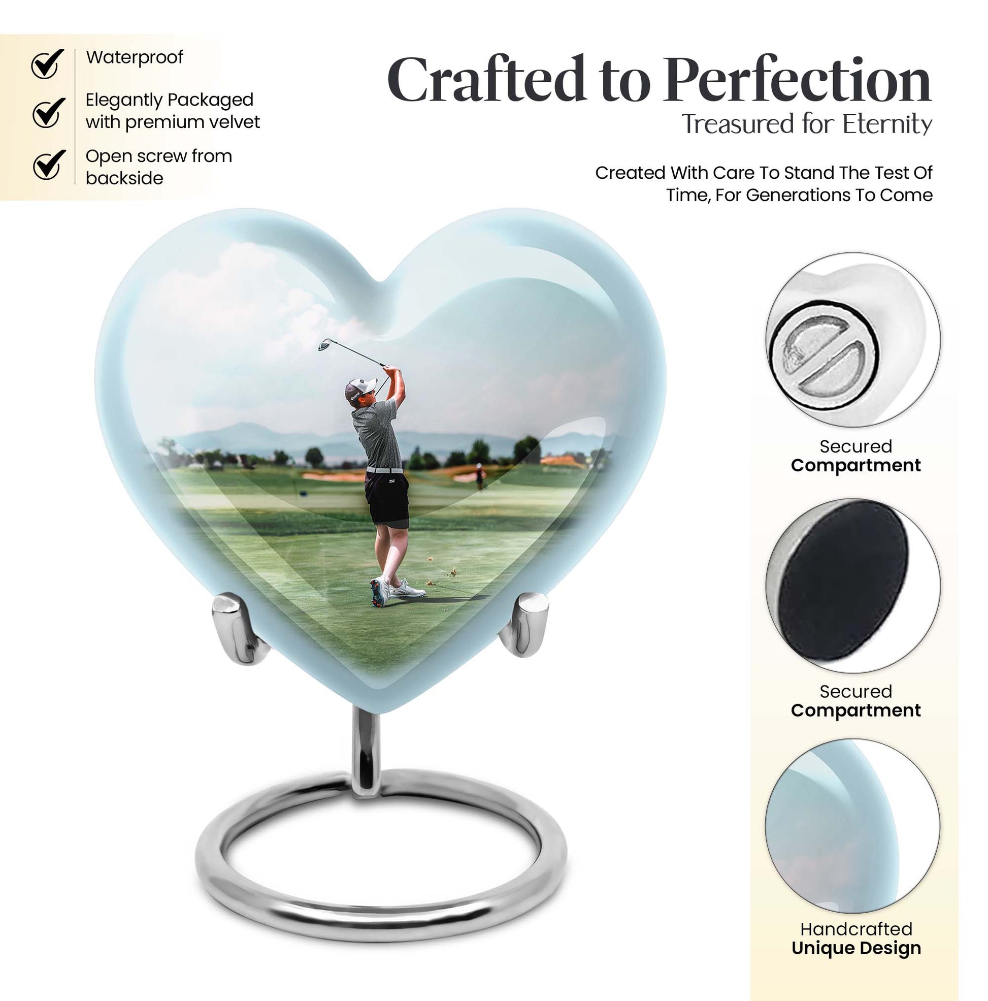 Introduce an element of sublime distinctiveness to your cherished ceremonies with this uniquely crafted Large Urn. Crafted for adults and seniors, this 10-inch heart urn combines artistic abstraction with profound significance. Made with prime quality aluminium for an enduring legacy, it weighs a convenient 3.3 pounds and offers abundant capacity of 200 cubic inches. It's large enough to respectfully hold the ashes of your loved ones. This urn exhibits thoughtful personalization options, enabling you to engrave names for a deeply personal touch. Included with your purchase is a velvet pouch, providing a respectful containment for the precious remains. As a stand-out choice among funeral unique urns for human ashes, this cremation urn adds somber grace to memorial proceedings. The heart urn, elegantly linking the themes of love and remembrance, suits those seeking golf urn or a cremation urn burial. This is not just a vessel, but a tribute resplendent with memory, love, and dignity.