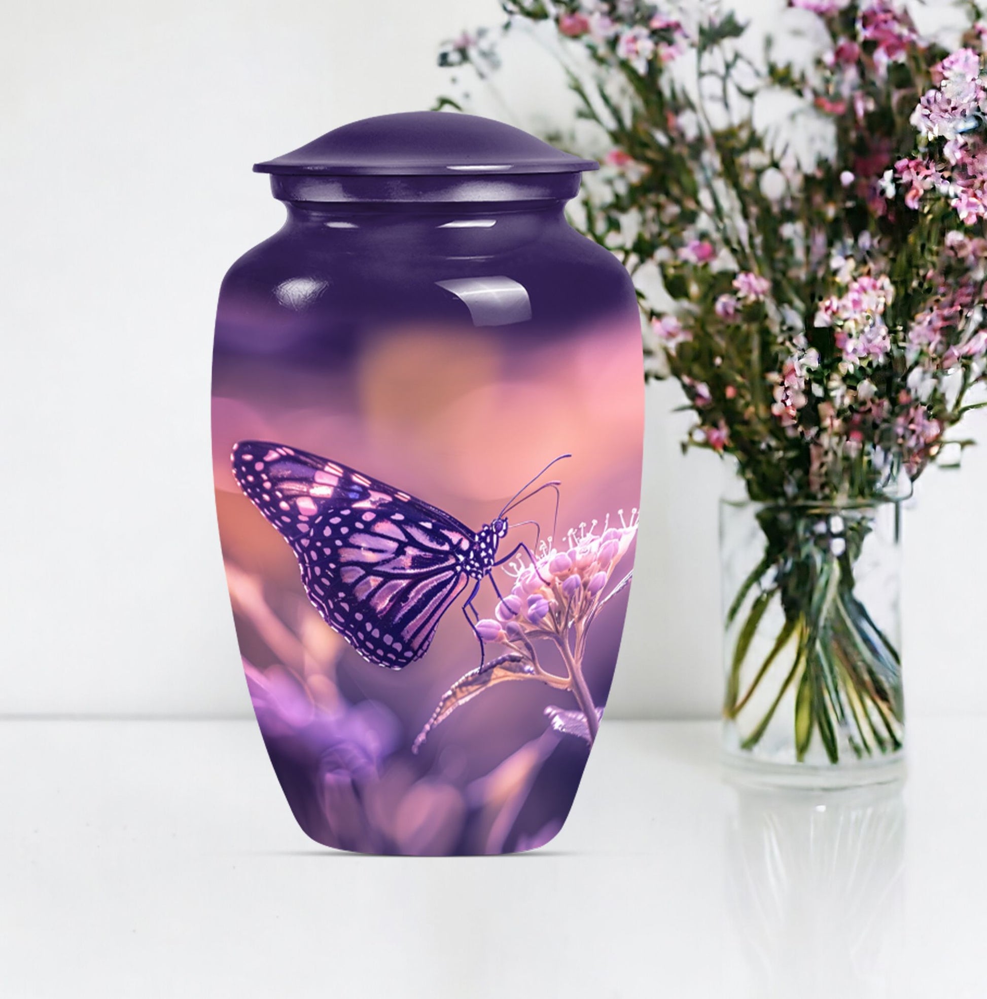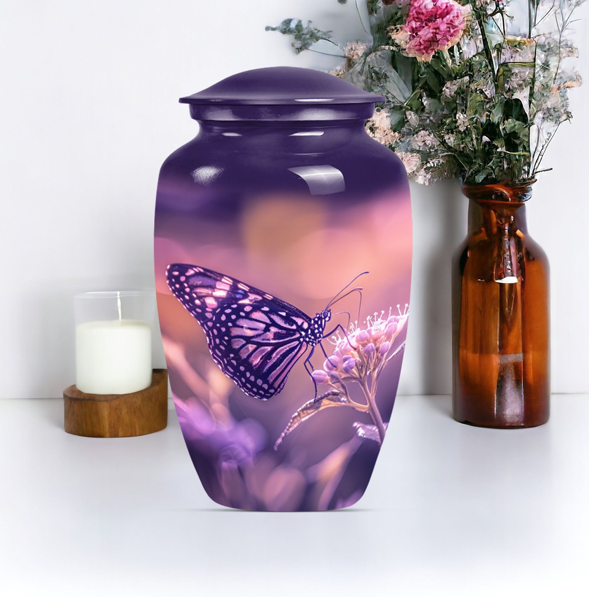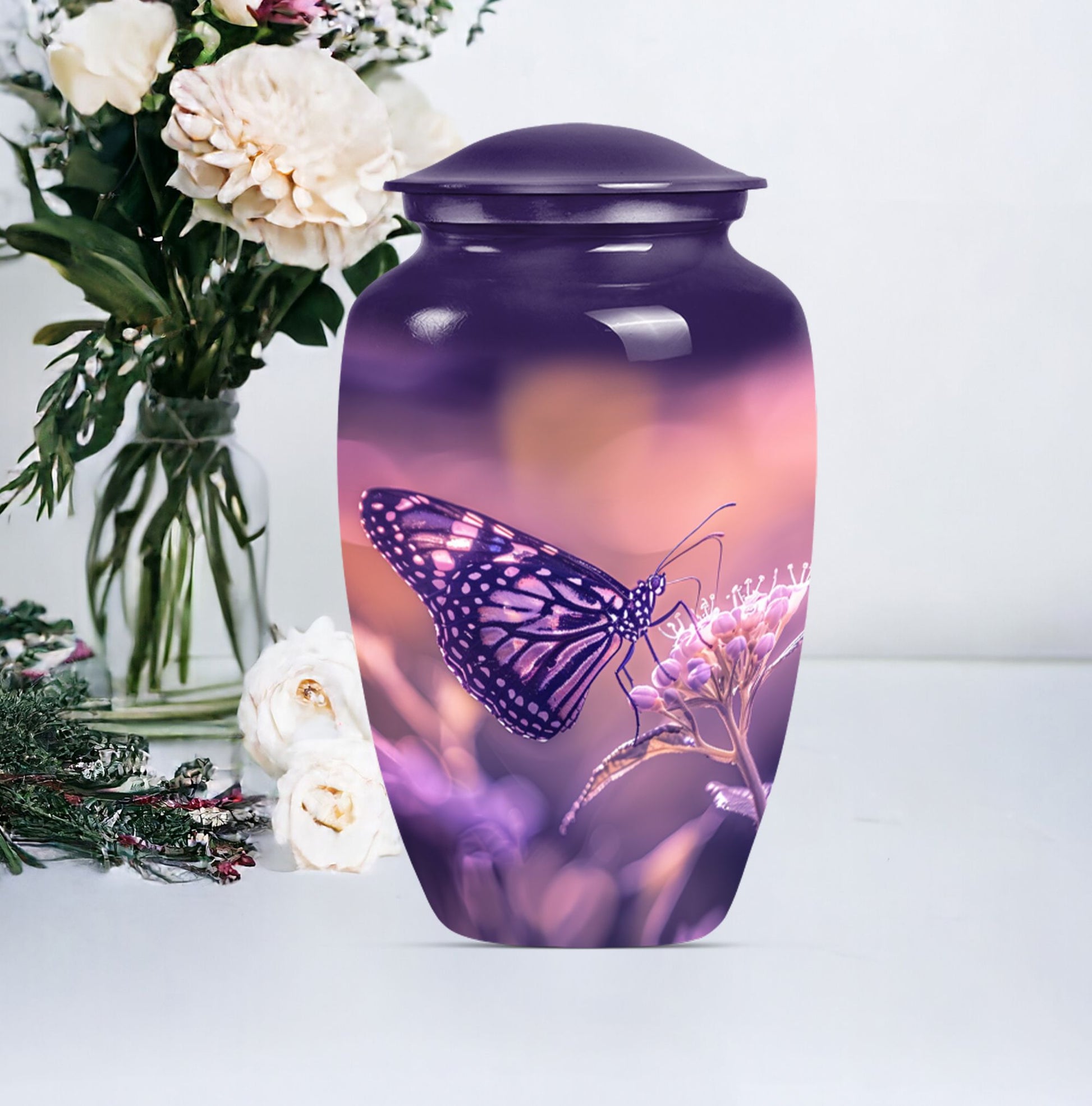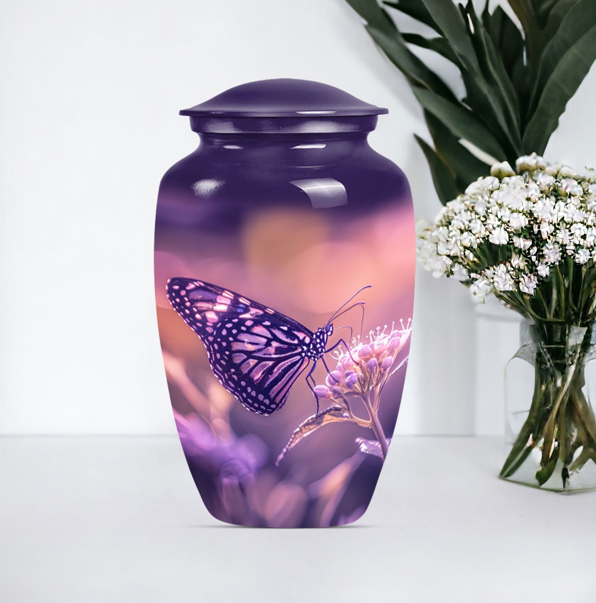 Our Butterfly Urn, designed for those wishing to honor their loved ones in a distinctive way, blends tradition with innovation. This 10-inch masterpiece, crafted from robust aluminium, stands as an immortal commemoration of an extraordinary life. Weighing in at 3.3 pounds, its dimensional framework allows for the containment of up to 200 cubic inches of ashes, ensuring an appropriate memorial for an adult male or a larger proportioned woman. Complete with a velvet pouch for the respectful containment of remains, the urn is not only a symbol of remembrance but also a piece of decor that subtly complements your interior design. Even more distinctly, it offers personalization options that allow you to engrave names, adding a touch of intimacy to your memorial. Echoing the graceful transition emblematic of a butterfly, this memorial urn transforms mourning into an eternal celebration of life. A harmonious blend of aesthetics and sentimentality lies at the heart of our urn, offering a comforting presence in times of sorrow.