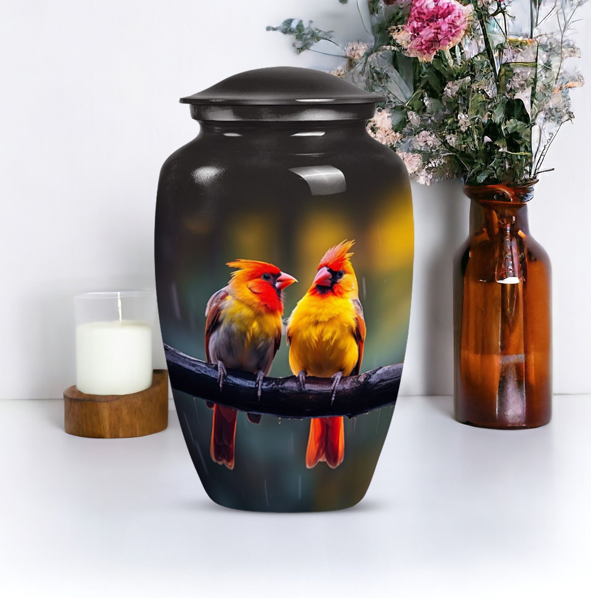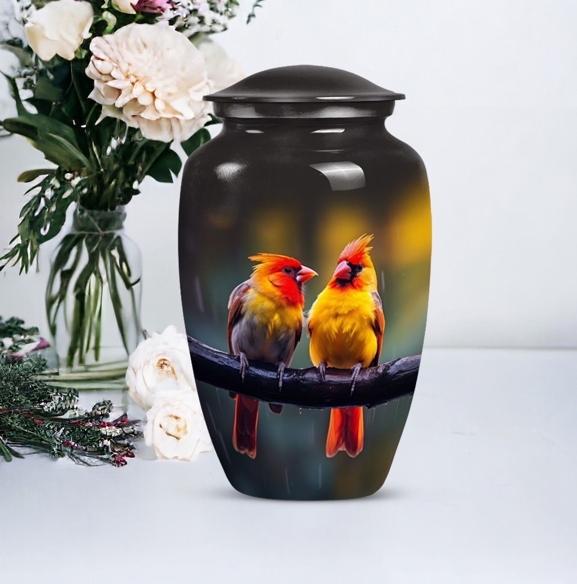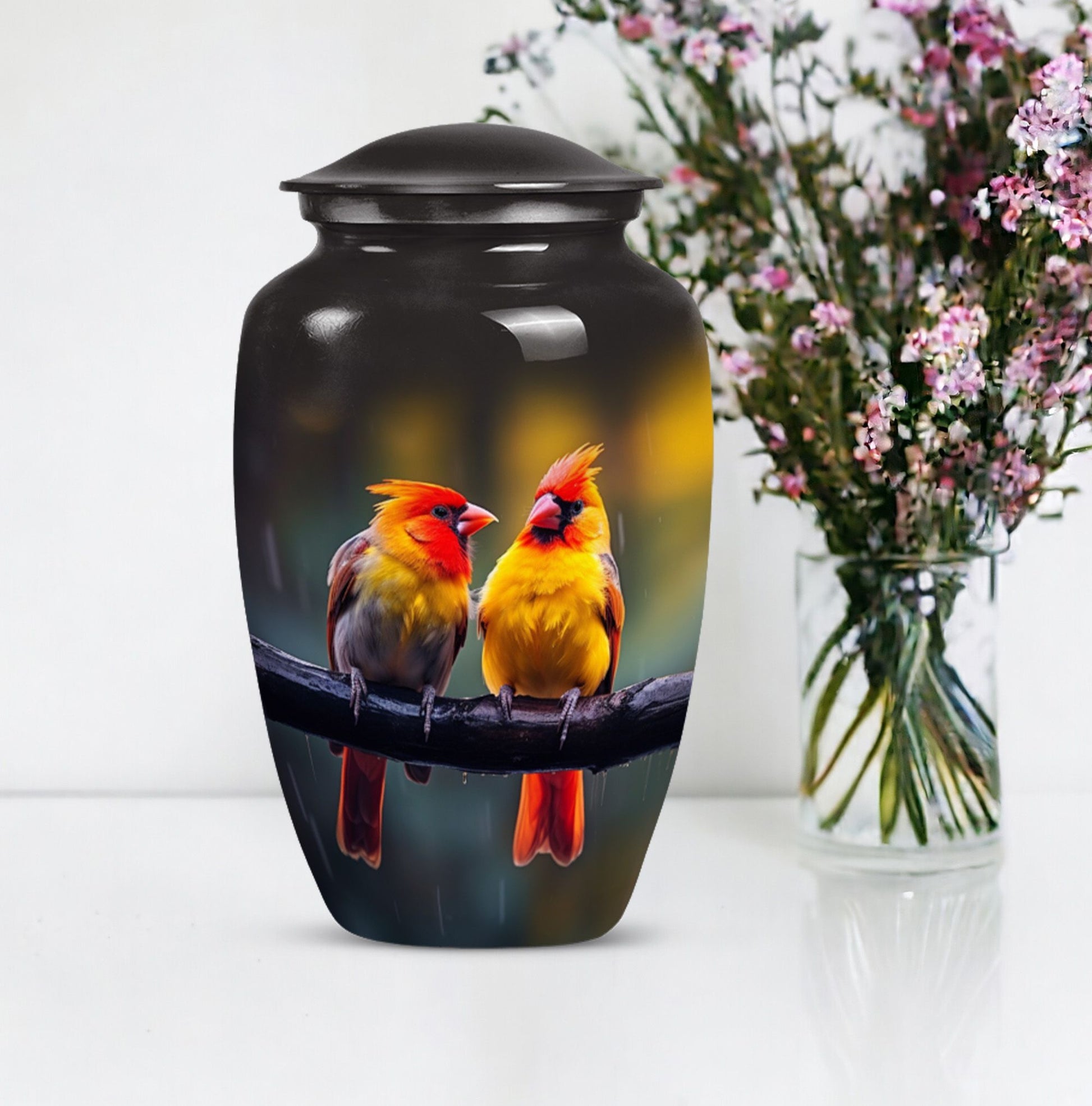 Crafted with care and encrusted with the enigmatic symbolism of a cardinal bird, this 10-inch classic urn serves as the perfect sanctity for your loved one's ashes. Weighing a sturdy 3.3 pounds, this urn is composed of durable aluminium sure to endure the cycles of time. With a generous capacity of 200 cubic inches, it graciously accommodates adult human ashes, juxtaposing abstract themes with tangible comfort. Each of our large urns comes with a velvet pouch, providing additional safe containment. The cardinal bird urn can be personalized, allowing you to engrave the names of your loved ones, adding a heartfelt touch to this solemn possession. Uncommon phrases to consider when seeking such commemorative items might be 'human ash adult,' 'cremation medium urns for human ashes,' or 'funeral cremation urns.' Reflect on the moments, cherish the memories, and honor your treasured ones with this exquisite memorial urn.