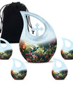 Expertly handcrafted from premium aluminium, this set includes one adult size cremation urn and matching mini cremation urns, each adorned with a beautiful green hummingbird motif surrounded by delicate floral details. The serene green hue symbolizes nature, peace, and everlasting connection. Both urns feature secure screw-top lids to ensure ashes remain safely protected. Ideal for home display, burial, or sharing among family members, this combo embodies both artistry and emotion.