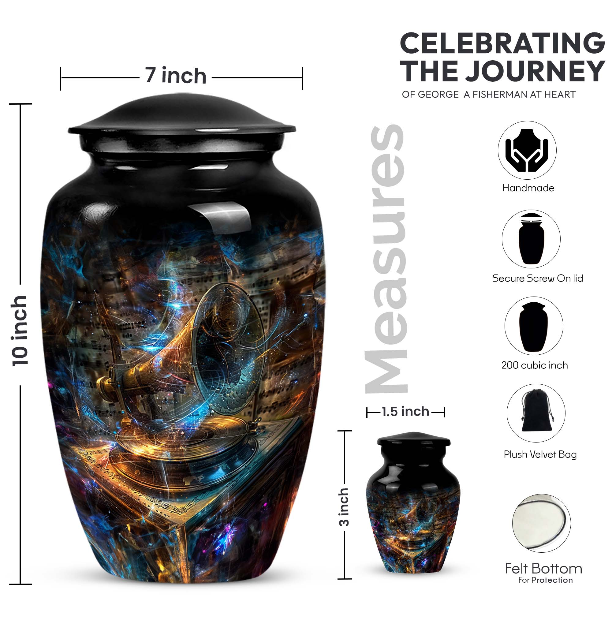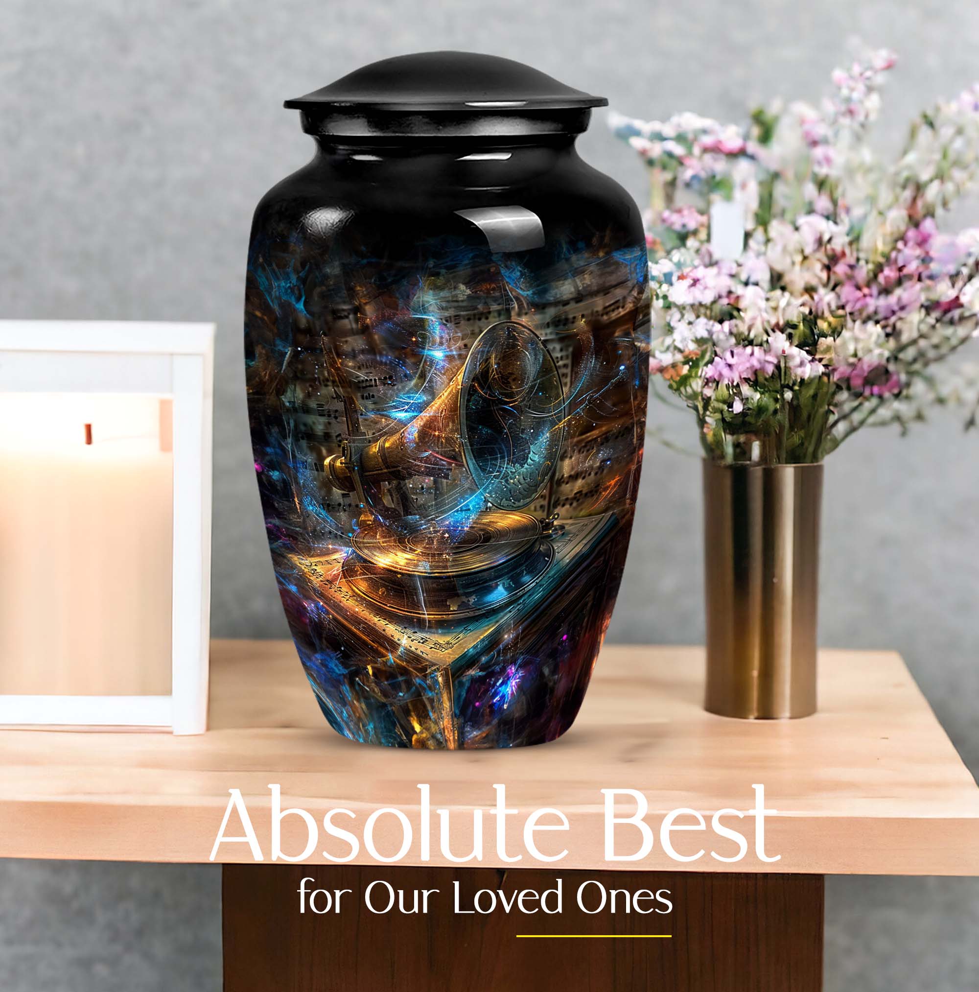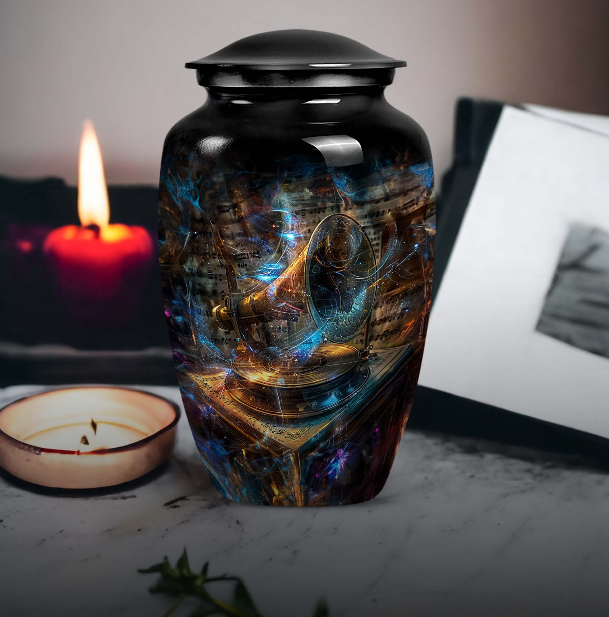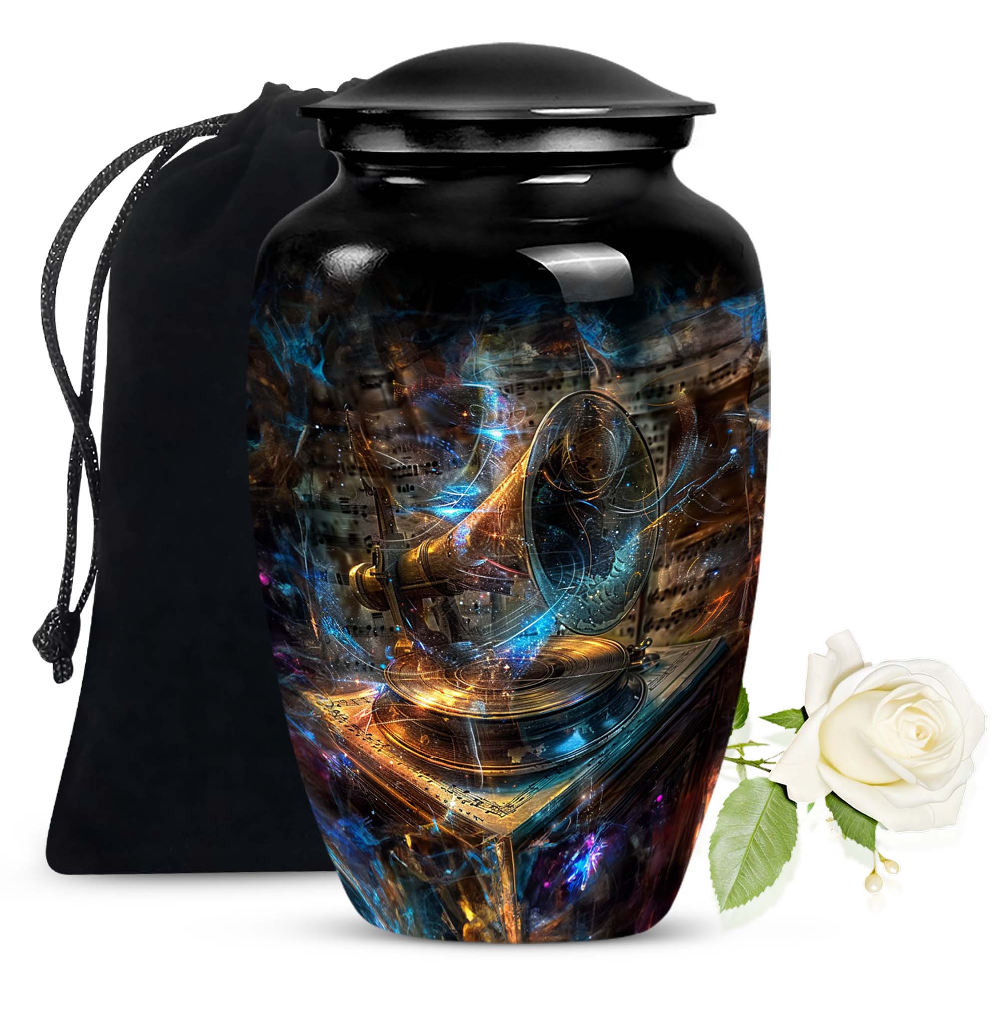 Reflect your loved one's unique personality and cherish their memory with our Gramophone Urn. A standout among cremation personalized urns for human ashes adult, this high-capacity large urn is crafted from sturdy Aluminium, ensuring long-lasting protection while remaining lightweight at 3.3 pounds. Standing a majestic 10 inches tall, this urn can securely contain ashes up to 200 cubic inches, making it an ideal choice for many. The urn is enveloped with a prominent, melancholic theme of a gramophone, a classic symbol of the music of life and the timeless rhythm of memories. The urn comes elegantly housed in a velvet pouch, ensuring secure containment and a touch of sophistication. We understand the importance of memorializing loved ones in a meaningful way; hence this urn has an added feature allowing for the personalization with engraved names. Making it not just an urn, but a personalized memorial tribute to your loved one. Search phrases like 'cremation large urn', 'urns for cremation ashes for men' or 'personalized urns for cremation ashes mother' to find our customizable Gramophone Urn and celebrate the unique melody of your loved one's life.