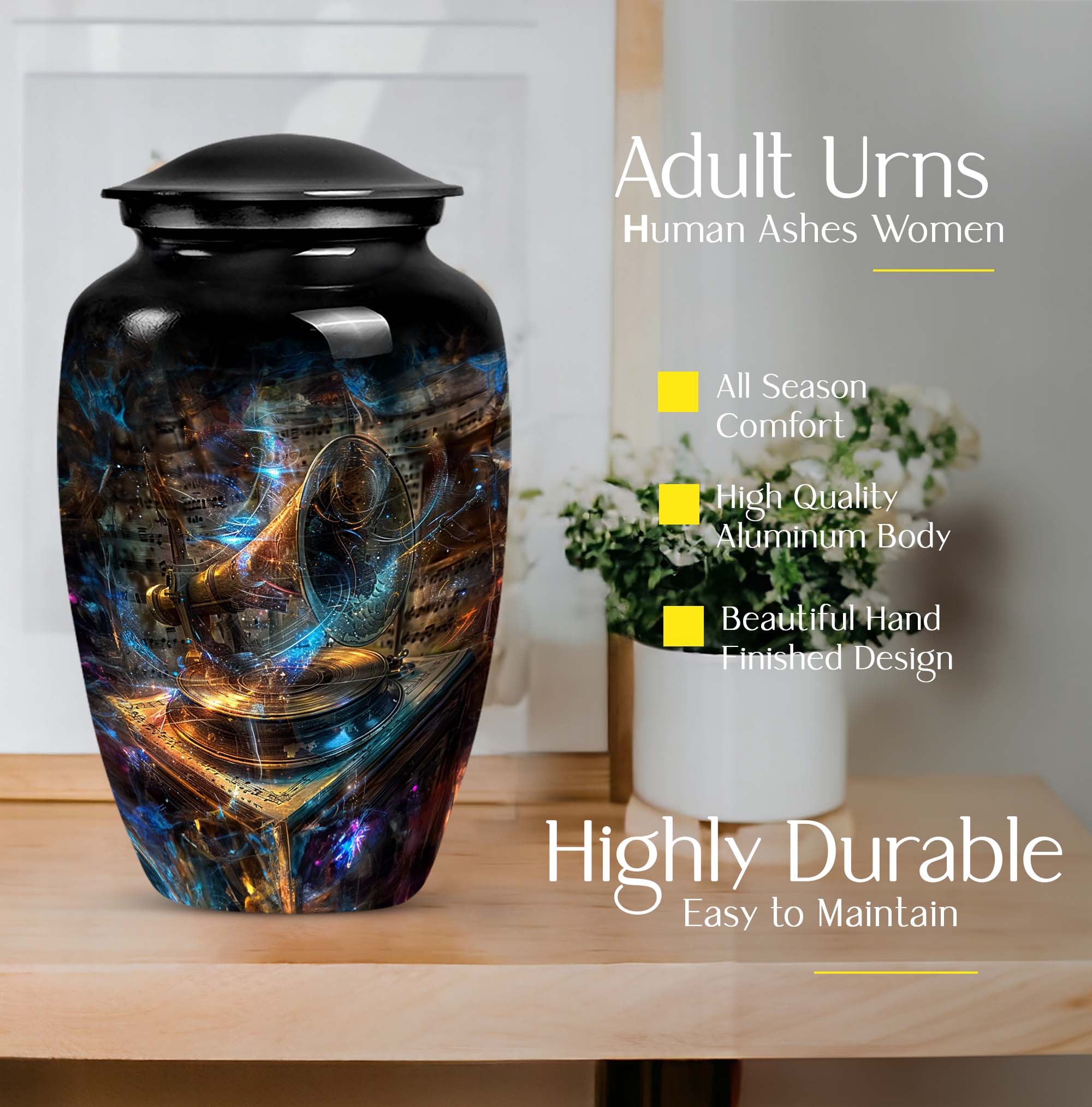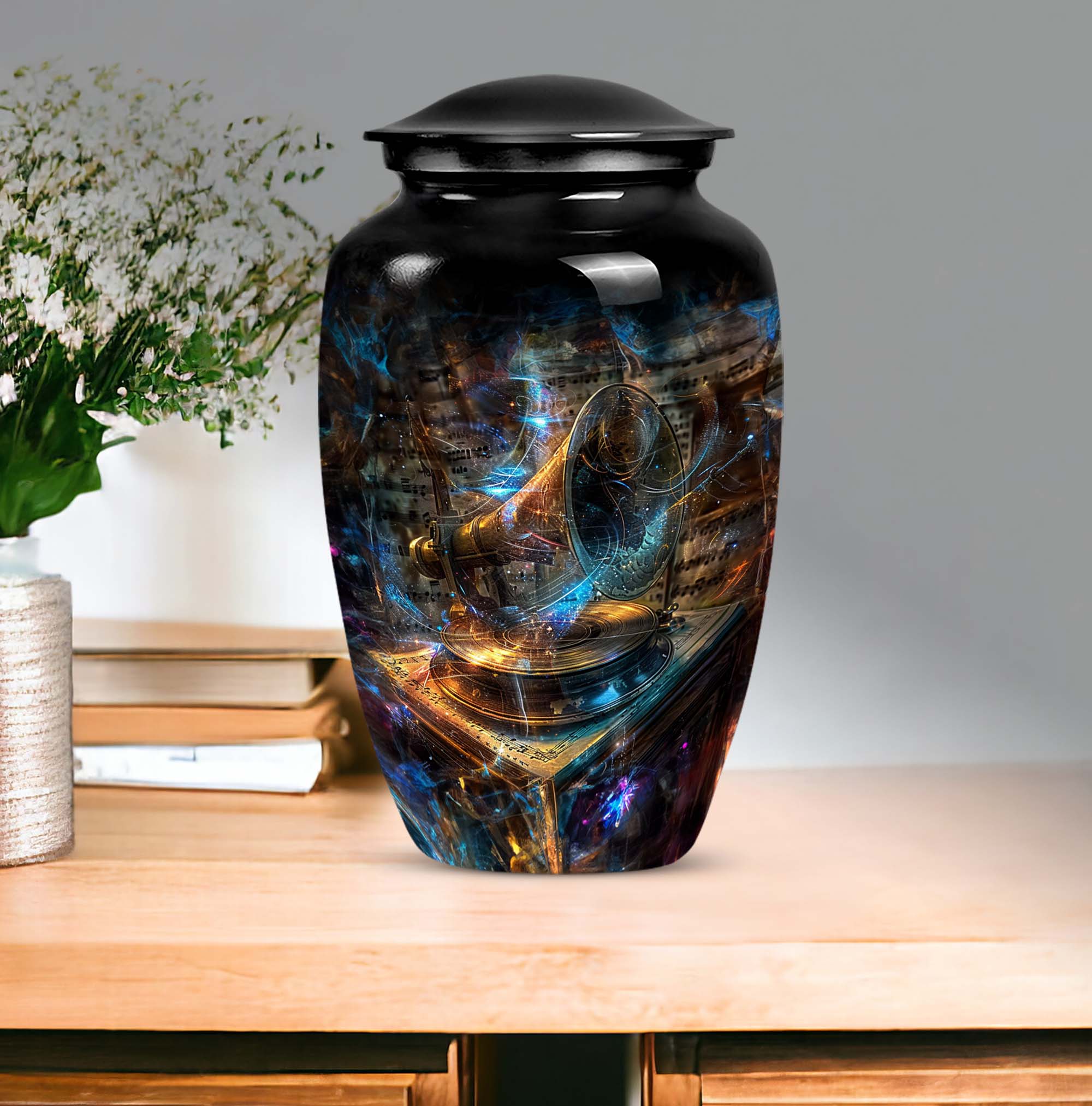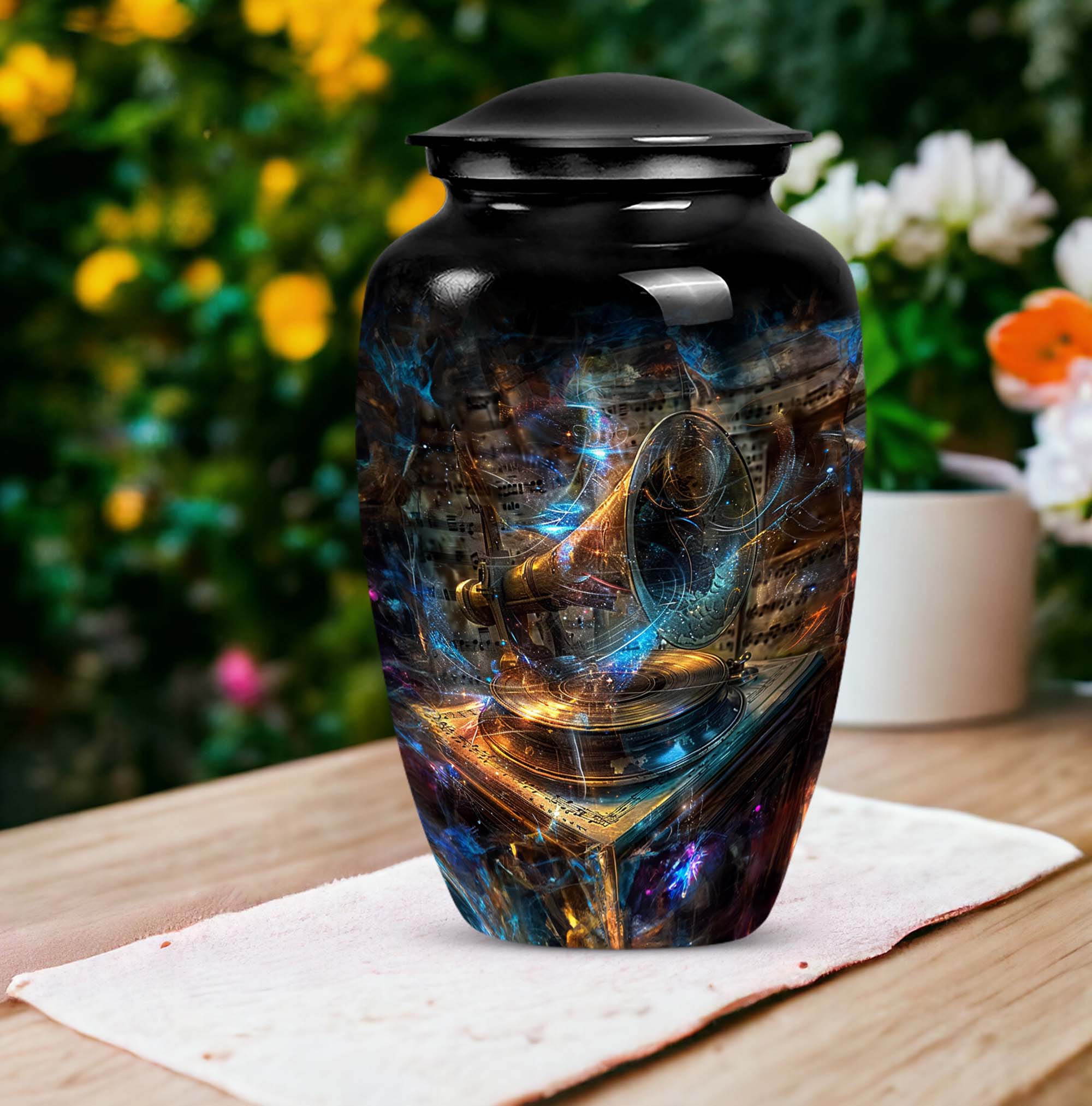 Reflect your loved one's unique personality and cherish their memory with our Gramophone Urn. A standout among cremation personalized urns for human ashes adult, this high-capacity large urn is crafted from sturdy Aluminium, ensuring long-lasting protection while remaining lightweight at 3.3 pounds. Standing a majestic 10 inches tall, this urn can securely contain ashes up to 200 cubic inches, making it an ideal choice for many. The urn is enveloped with a prominent, melancholic theme of a gramophone, a classic symbol of the music of life and the timeless rhythm of memories. The urn comes elegantly housed in a velvet pouch, ensuring secure containment and a touch of sophistication. We understand the importance of memorializing loved ones in a meaningful way; hence this urn has an added feature allowing for the personalization with engraved names. Making it not just an urn, but a personalized memorial tribute to your loved one. Search phrases like 'cremation large urn', 'urns for cremation ashes for men' or 'personalized urns for cremation ashes mother' to find our customizable Gramophone Urn and celebrate the unique melody of your loved one's life.