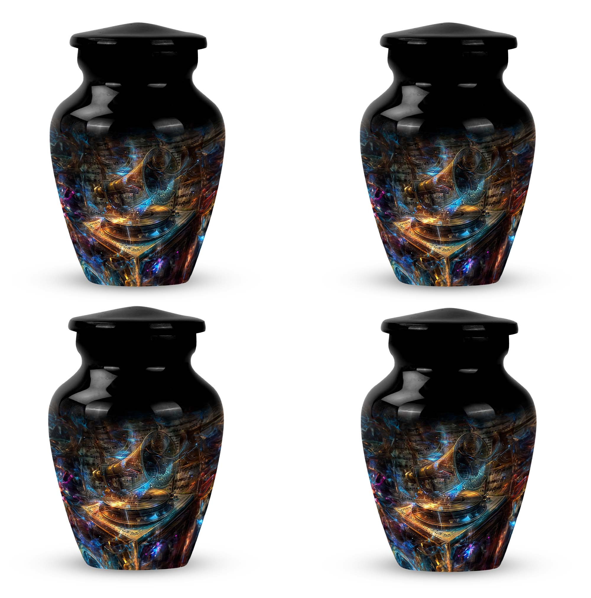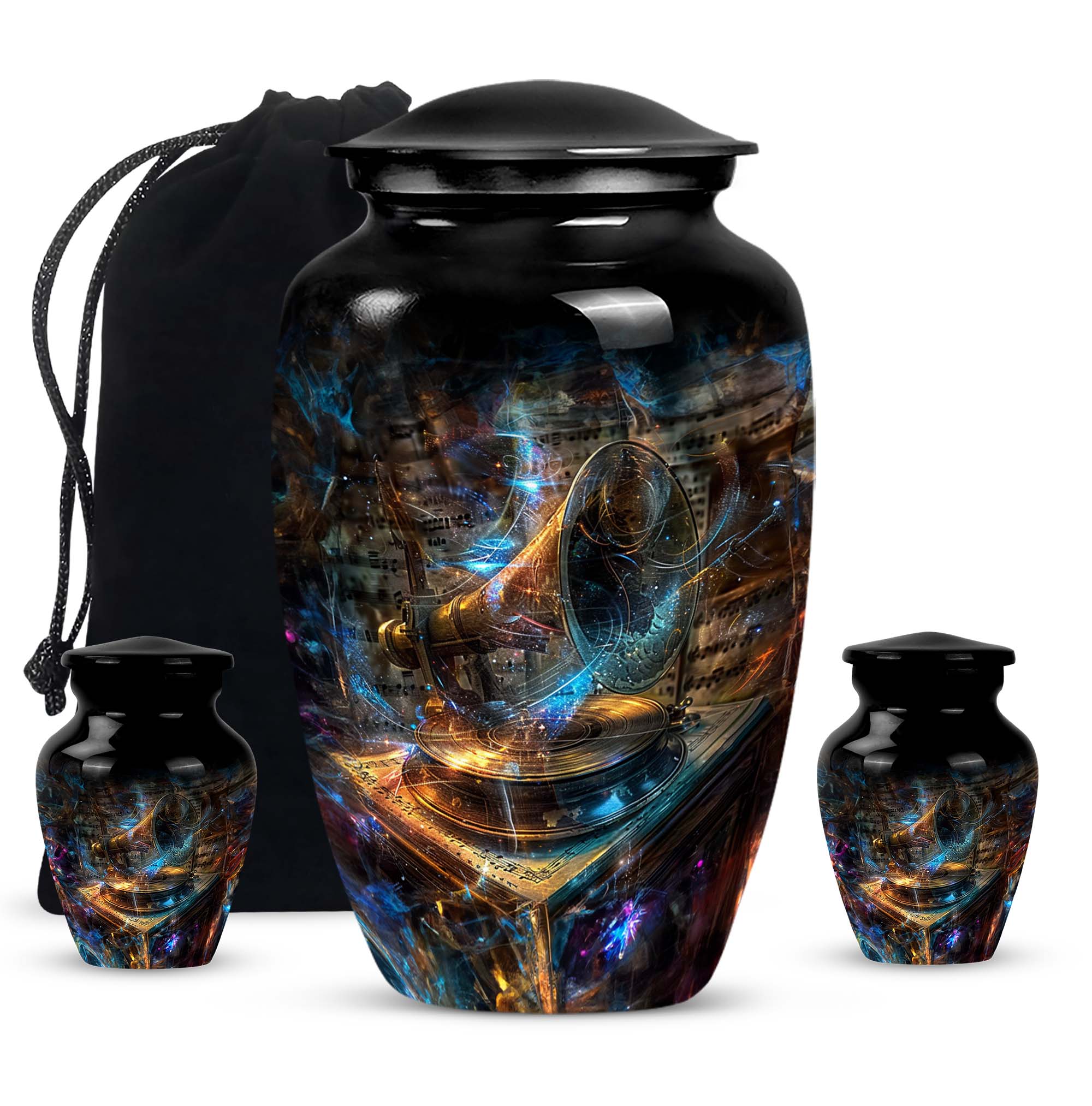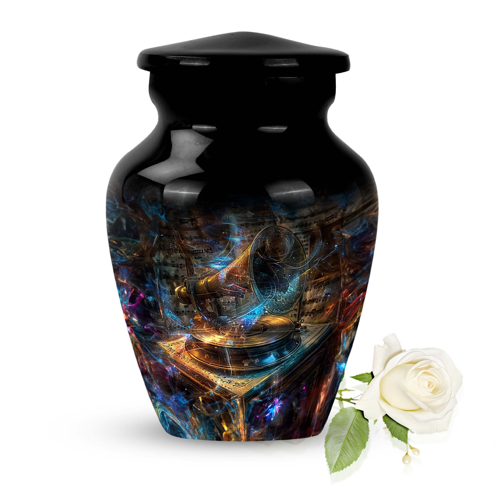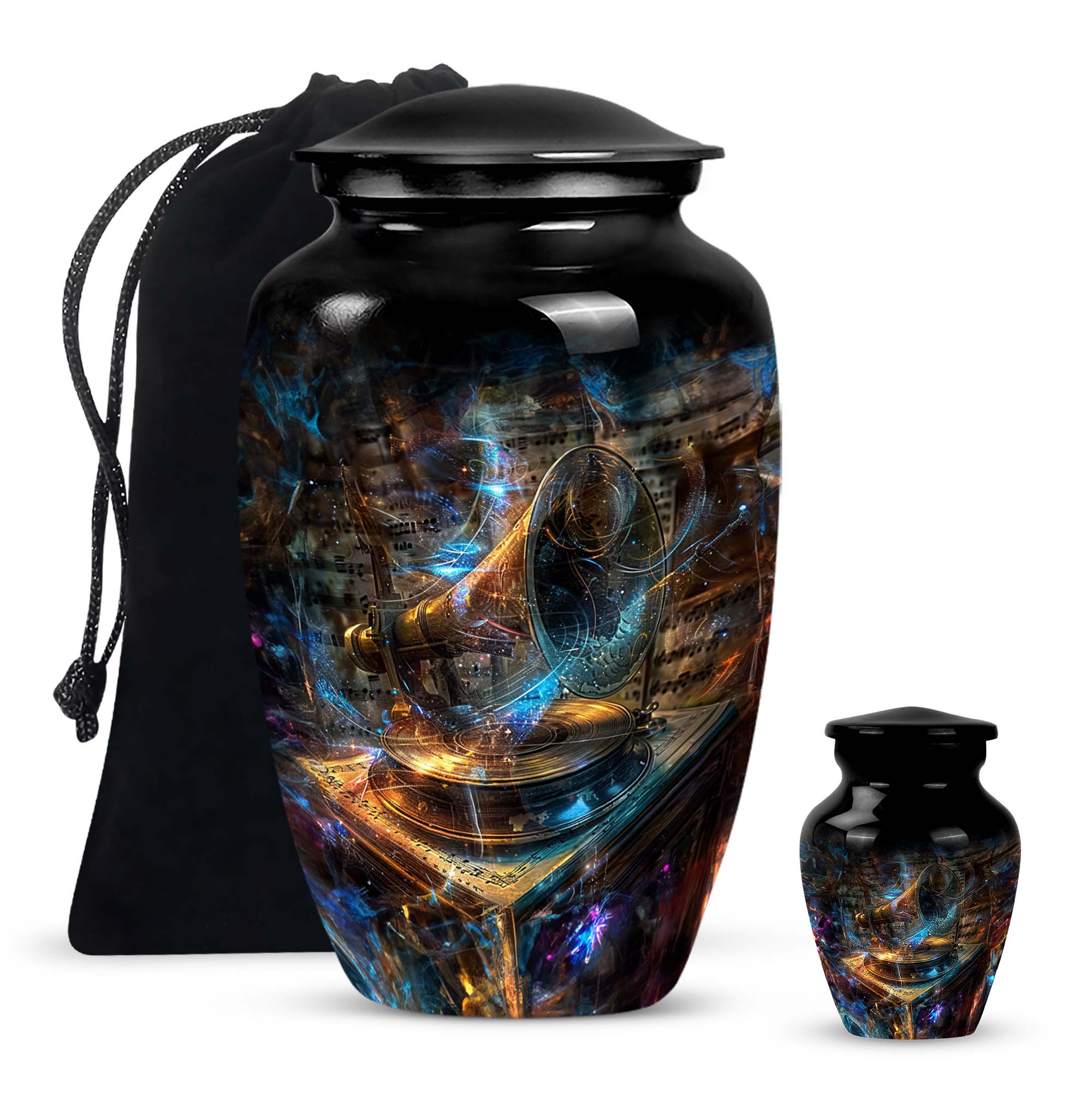 Reflect your loved one's unique personality and cherish their memory with our Gramophone Urn. A standout among cremation personalized urns for human ashes adult, this high-capacity large urn is crafted from sturdy Aluminium, ensuring long-lasting protection while remaining lightweight at 3.3 pounds. Standing a majestic 10 inches tall, this urn can securely contain ashes up to 200 cubic inches, making it an ideal choice for many. The urn is enveloped with a prominent, melancholic theme of a gramophone, a classic symbol of the music of life and the timeless rhythm of memories. The urn comes elegantly housed in a velvet pouch, ensuring secure containment and a touch of sophistication. We understand the importance of memorializing loved ones in a meaningful way; hence this urn has an added feature allowing for the personalization with engraved names. Making it not just an urn, but a personalized memorial tribute to your loved one. Search phrases like 'cremation large urn', 'urns for cremation ashes for men' or 'personalized urns for cremation ashes mother' to find our customizable Gramophone Urn and celebrate the unique melody of your loved one's life.