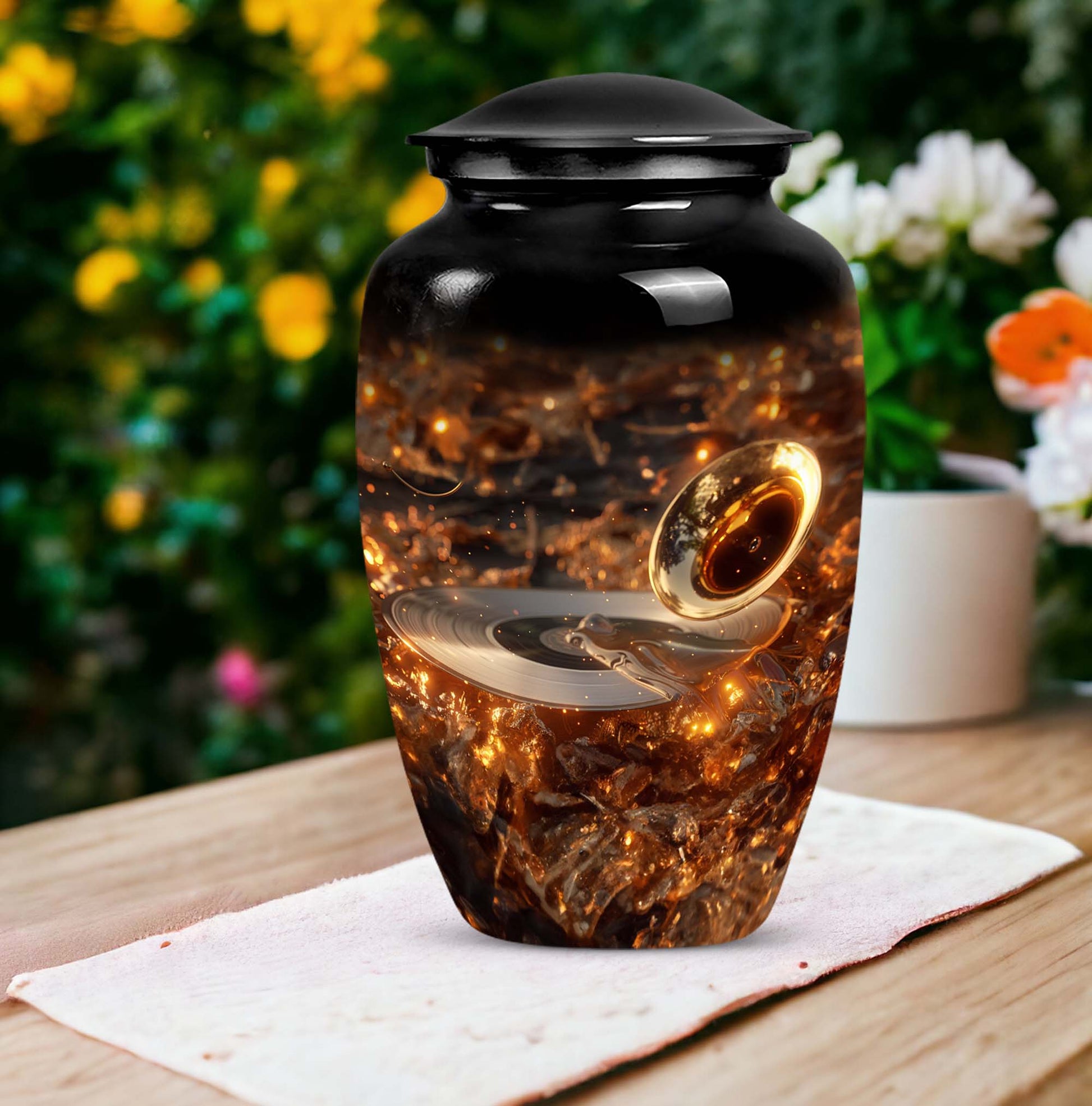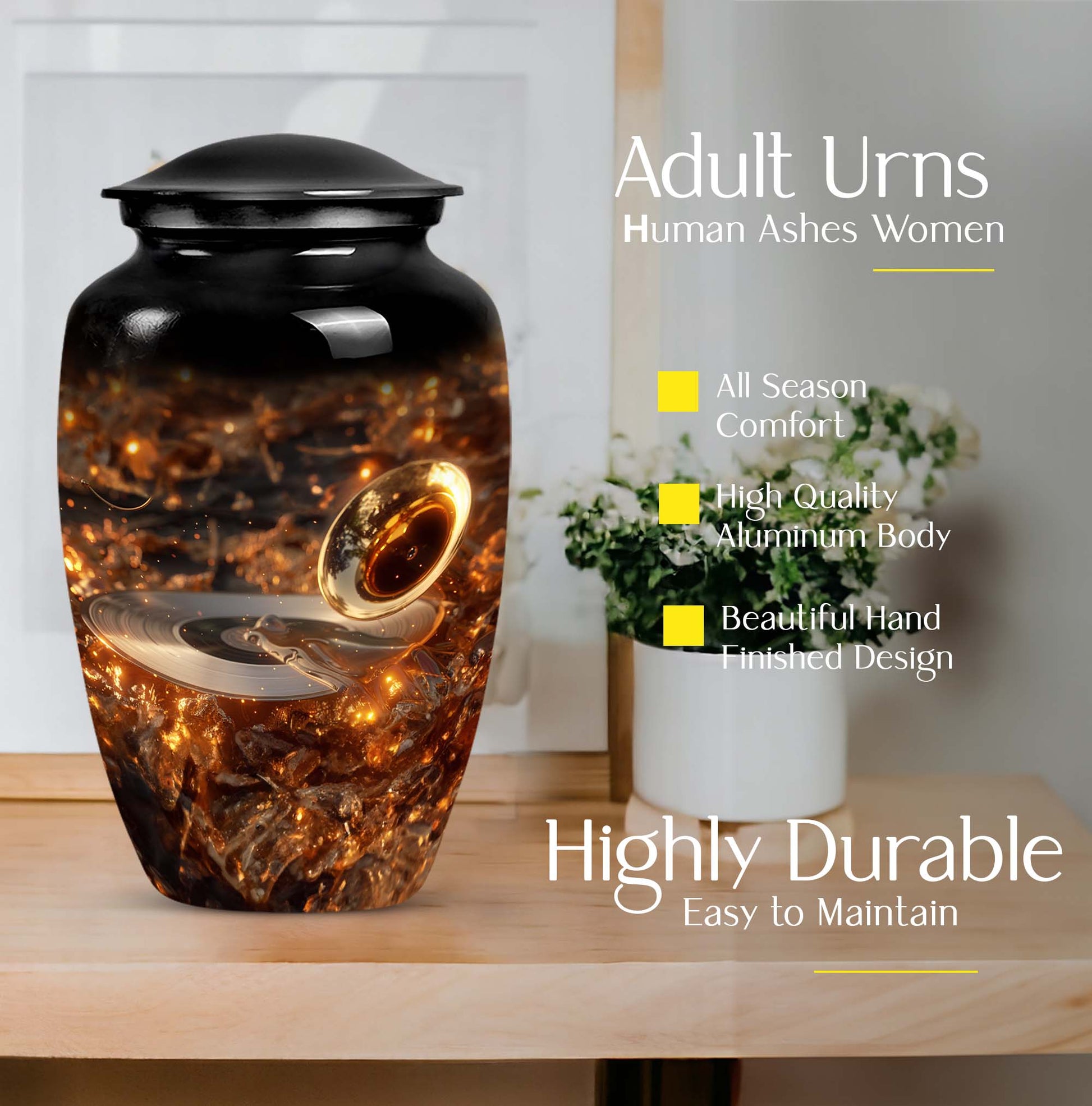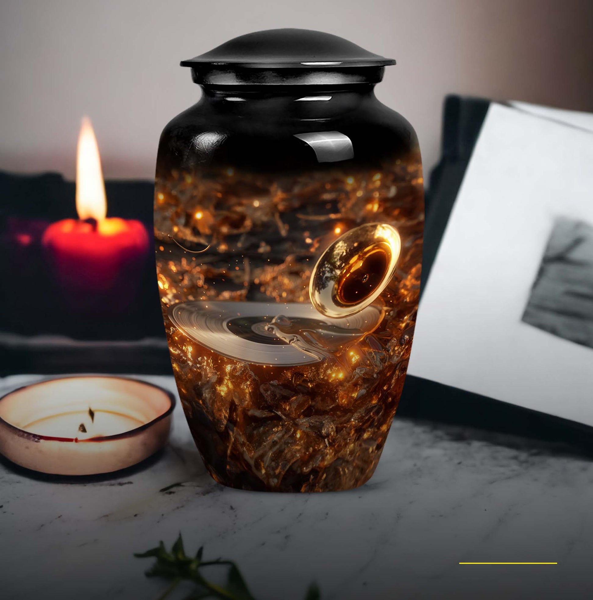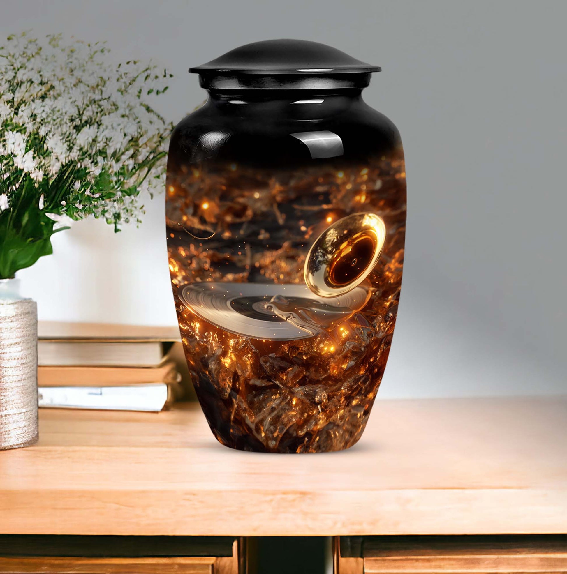 Experience the timeless symbolism of our 10-inch Gramophone Urn. Crafted from high-quality aluminium, this large urn stands 10 inches in height, with a remarkable capacity of 200 cubic inches–perfect for preserving the memory of your loved ones. Its weight is a substantial 3.3 pounds, embodying its solid construction and durability. The primary theme explores the old-world charm of a Gramophone, making it an unconventional and unique piece among memorial urns. The urn is perfect for those seeking cremation adult urns for human ashes men. It also comes with a velvet pouch to securely contain the ashes. With an option to personalize it with engraved names, it adds an intimate touch to a cherished keepsake. This product is a thoughtful choice among burial urns for cremation ashes, human ash adult urns, and ash urns, unique in its approach to commemorate the passing of a loved one.