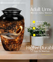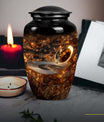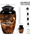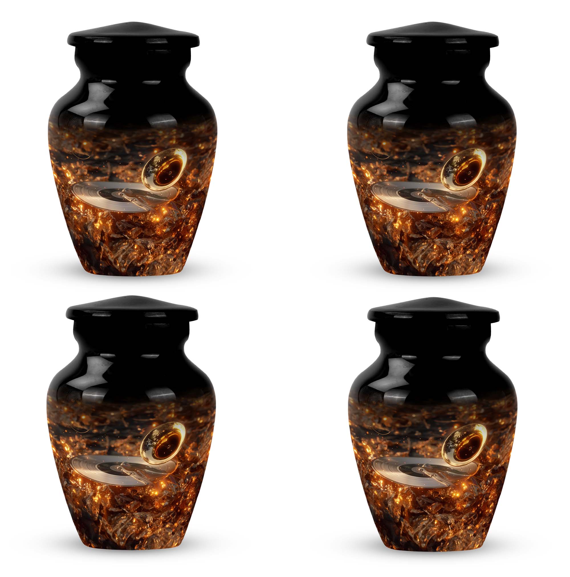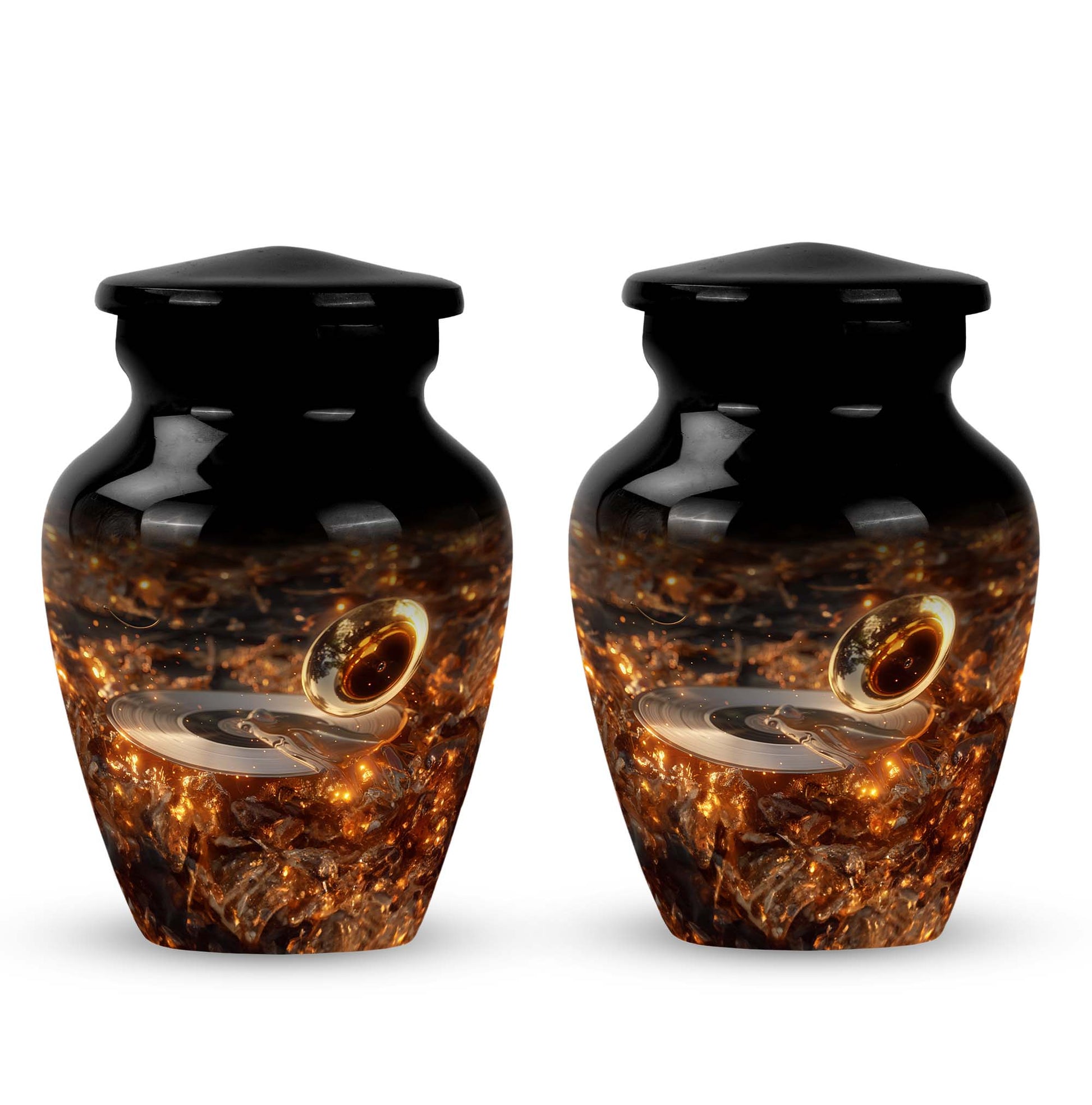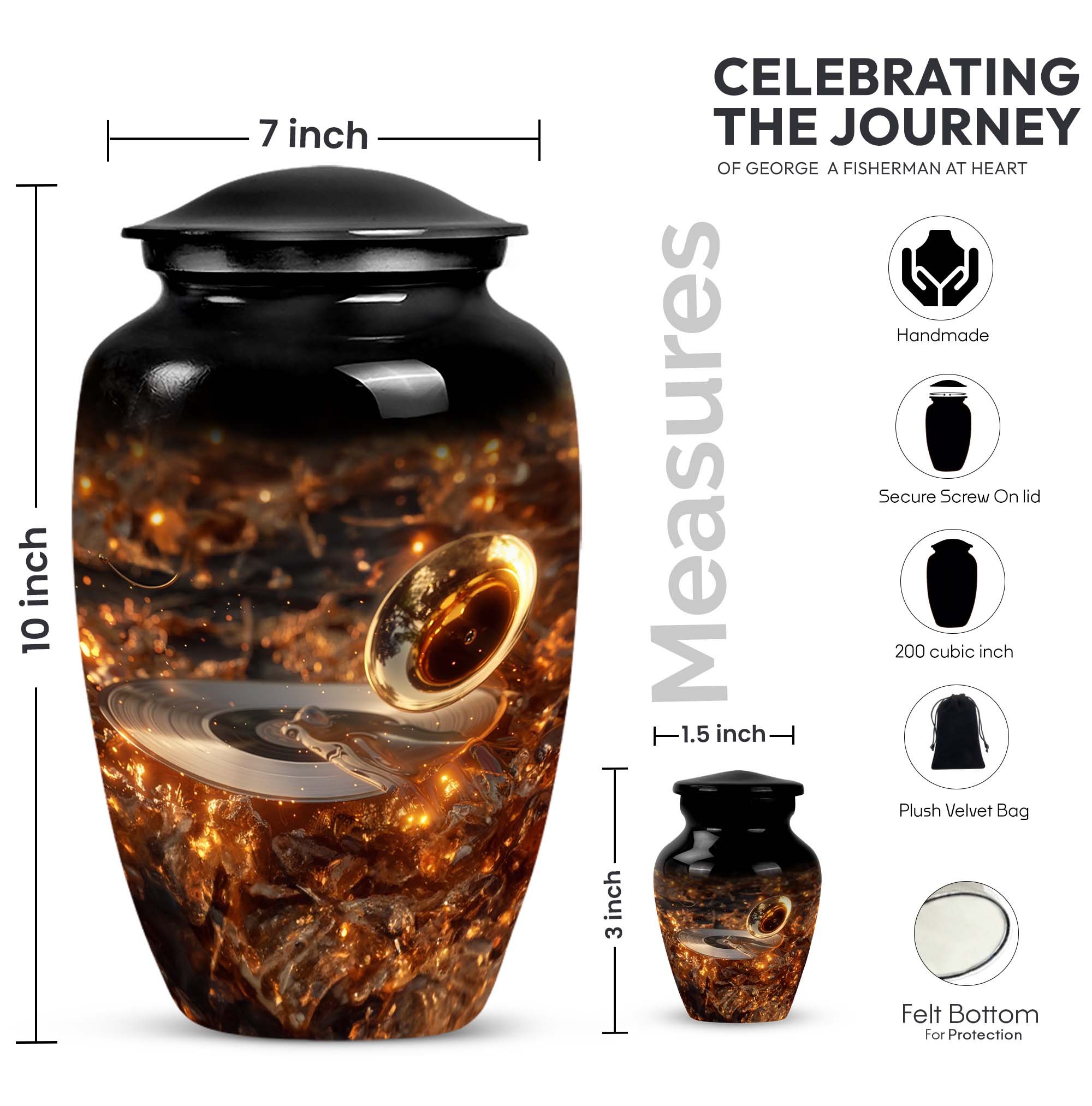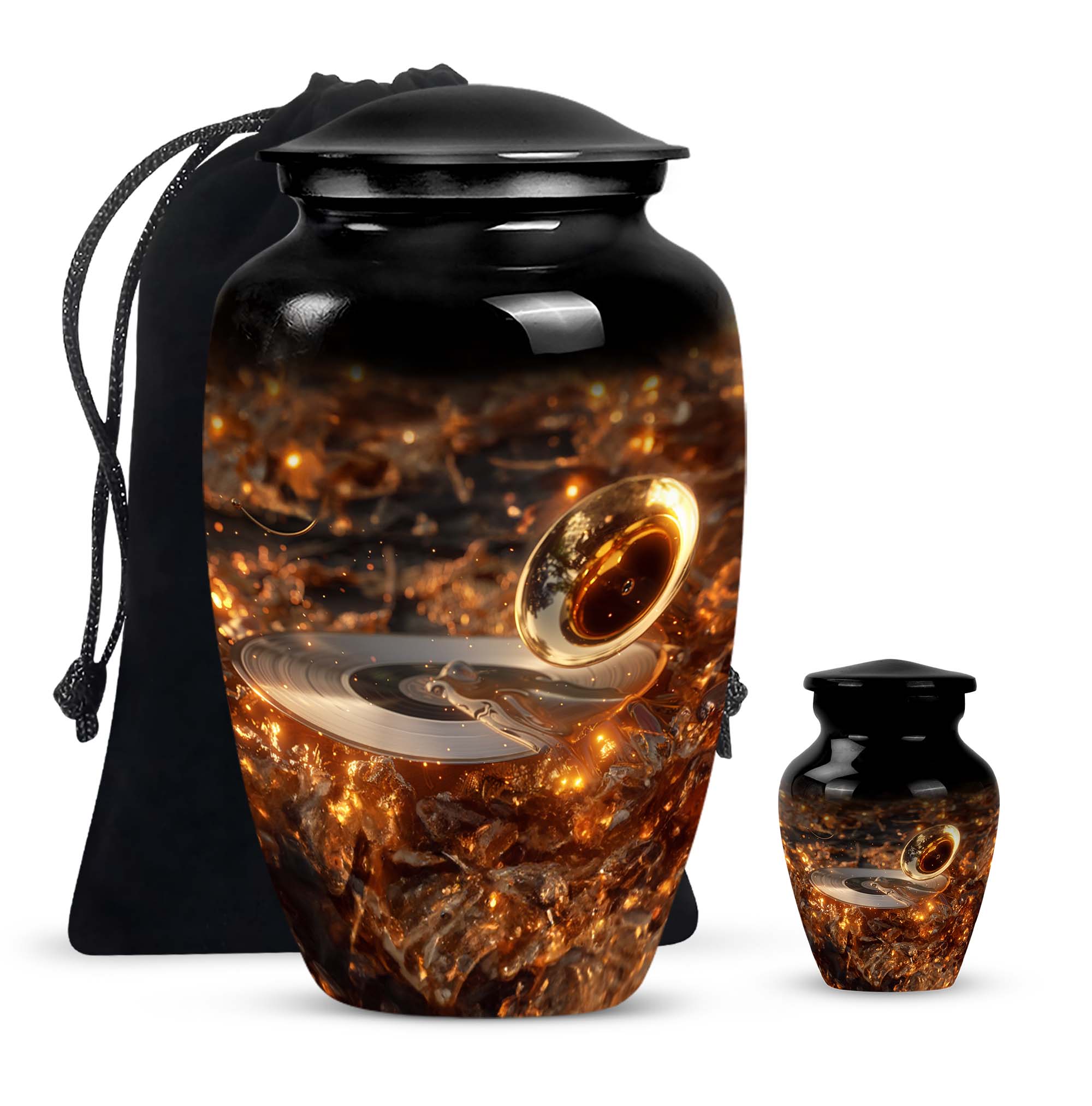 Experience the timeless symbolism of our 10-inch Gramophone Urn. Crafted from high-quality aluminium, this large urn stands 10 inches in height, with a remarkable capacity of 200 cubic inches–perfect for preserving the memory of your loved ones. Its weight is a substantial 3.3 pounds, embodying its solid construction and durability. The primary theme explores the old-world charm of a Gramophone, making it an unconventional and unique piece among memorial urns. The urn is perfect for those seeking cremation adult urns for human ashes men. It also comes with a velvet pouch to securely contain the ashes. With an option to personalize it with engraved names, it adds an intimate touch to a cherished keepsake. This product is a thoughtful choice among burial urns for cremation ashes, human ash adult urns, and ash urns, unique in its approach to commemorate the passing of a loved one.