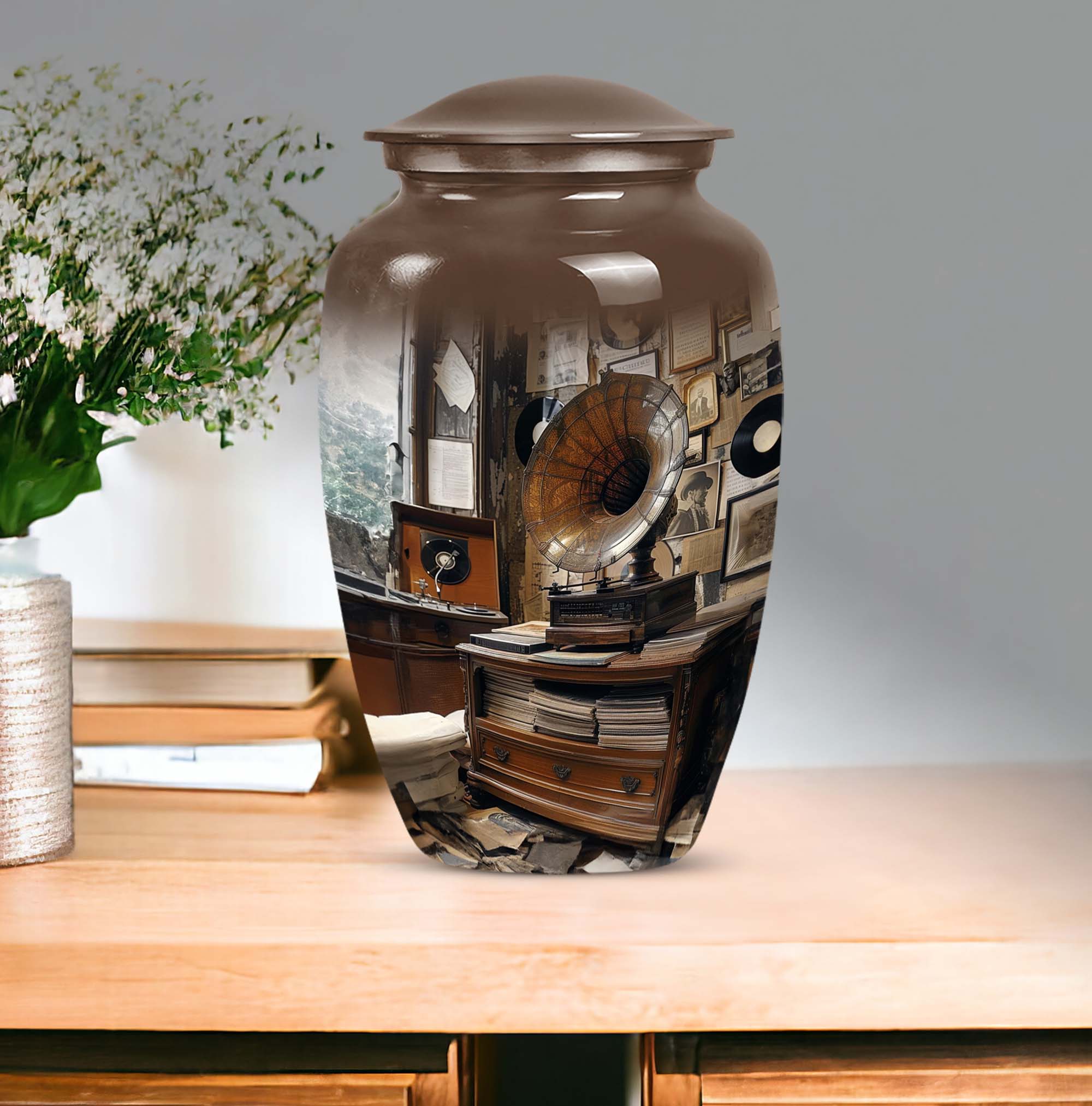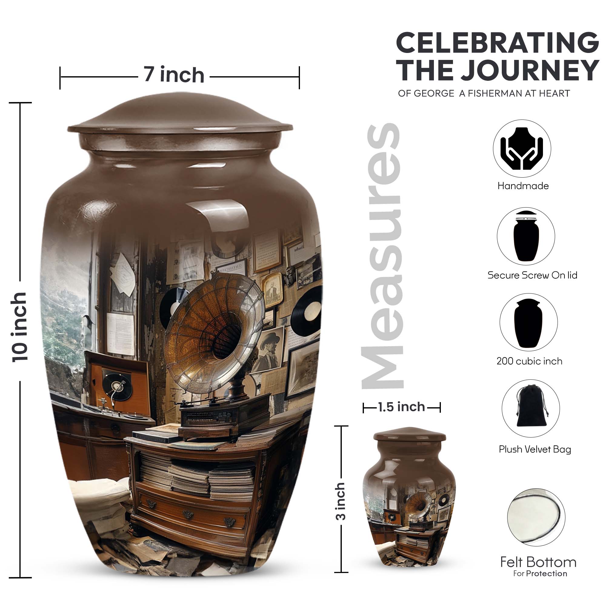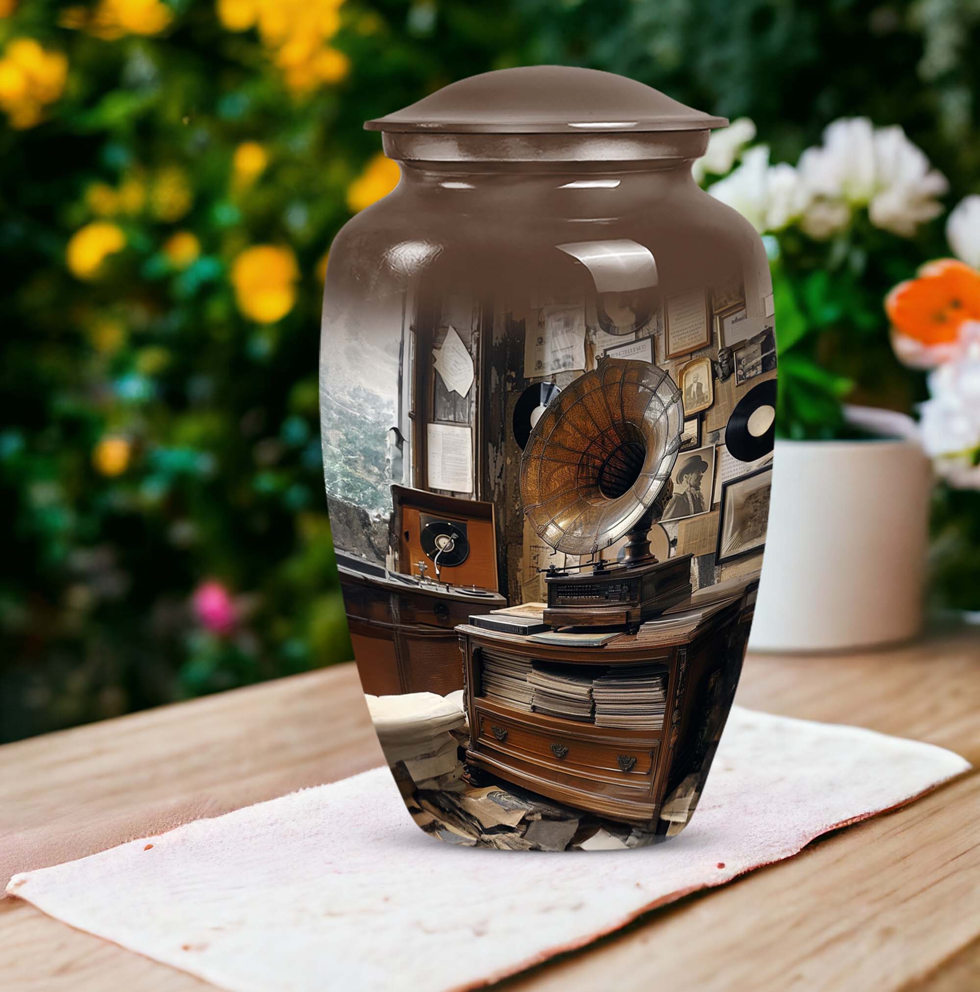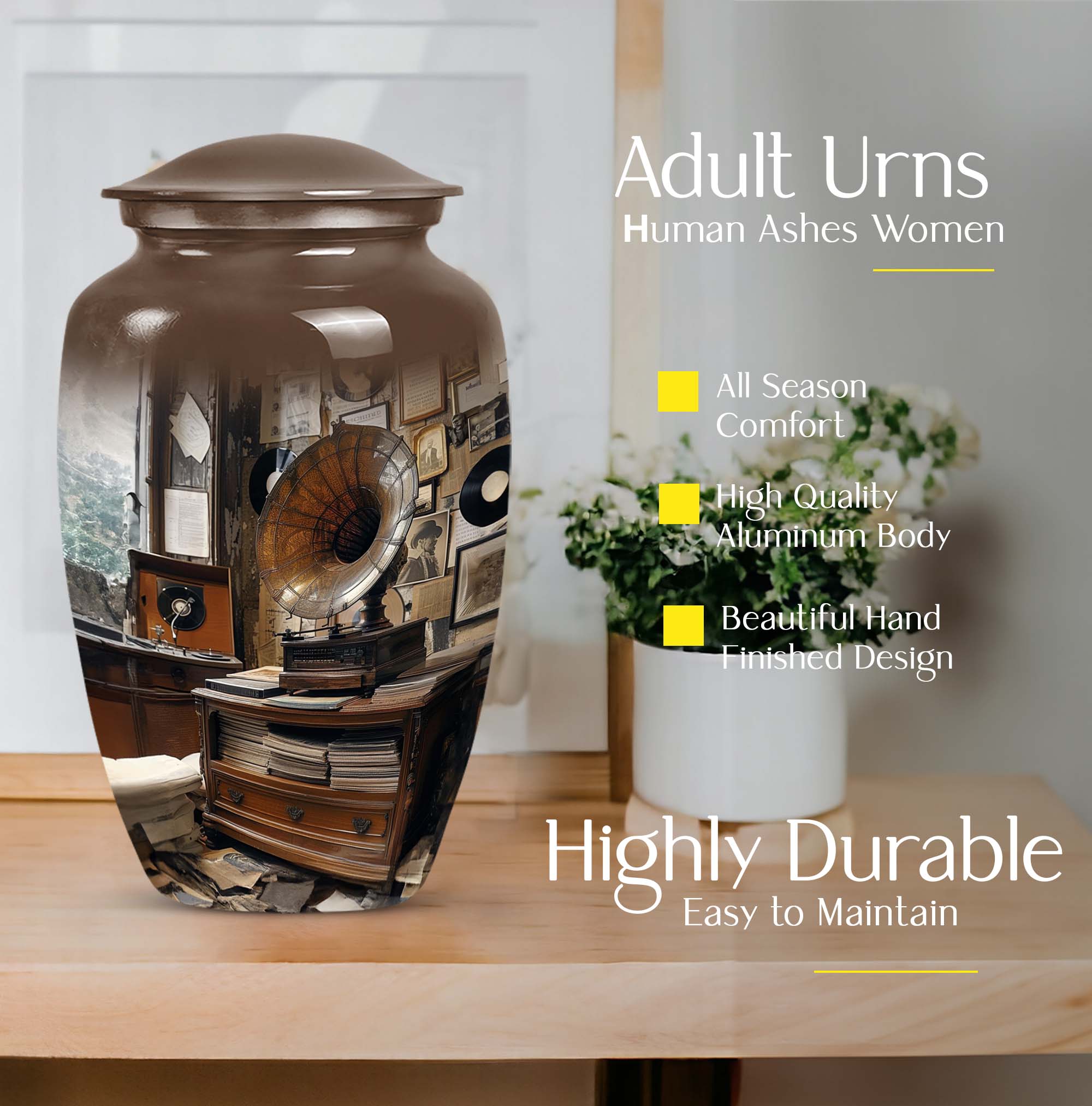 Discover a timeless keepsake for those cherished memories in our Gramophone Urn. This gem, among burial ash urns for humans, resurrects the elegance of a bygone era, through its exquisite 10 Inch stature. Crafted delicately from superior aluminium, the urn is robust and has a weight of 3.3 pounds. With dimensions standing proudly at 10 inches in height, it brings grandeur and respect to any memorial ceremony. This large urn can accommodate 200 cubic inches of cremated remains, ideal for an adult, either female or male. The urn encapsulates your tributes in a plush velvet pouch, providing a reverential containment for the ashes. With the capacity to personalize with engraved names, this urn ensures your monument is unique and sentimental. Abandon the ordinary, and embrace memorial urns that magnify your tribute with our gramophone-themed, classic urn.