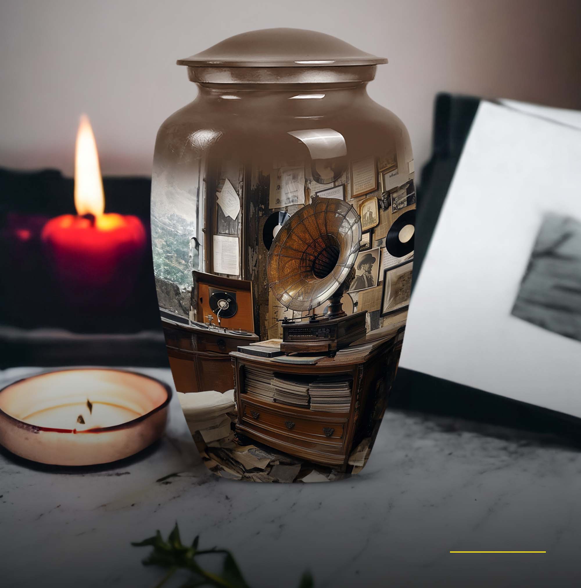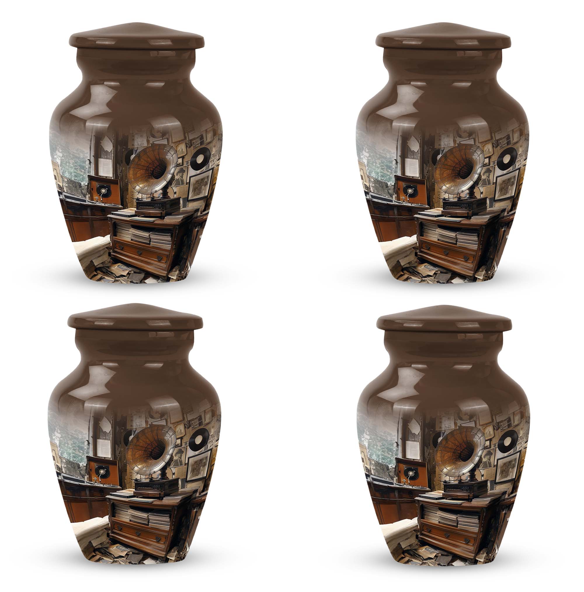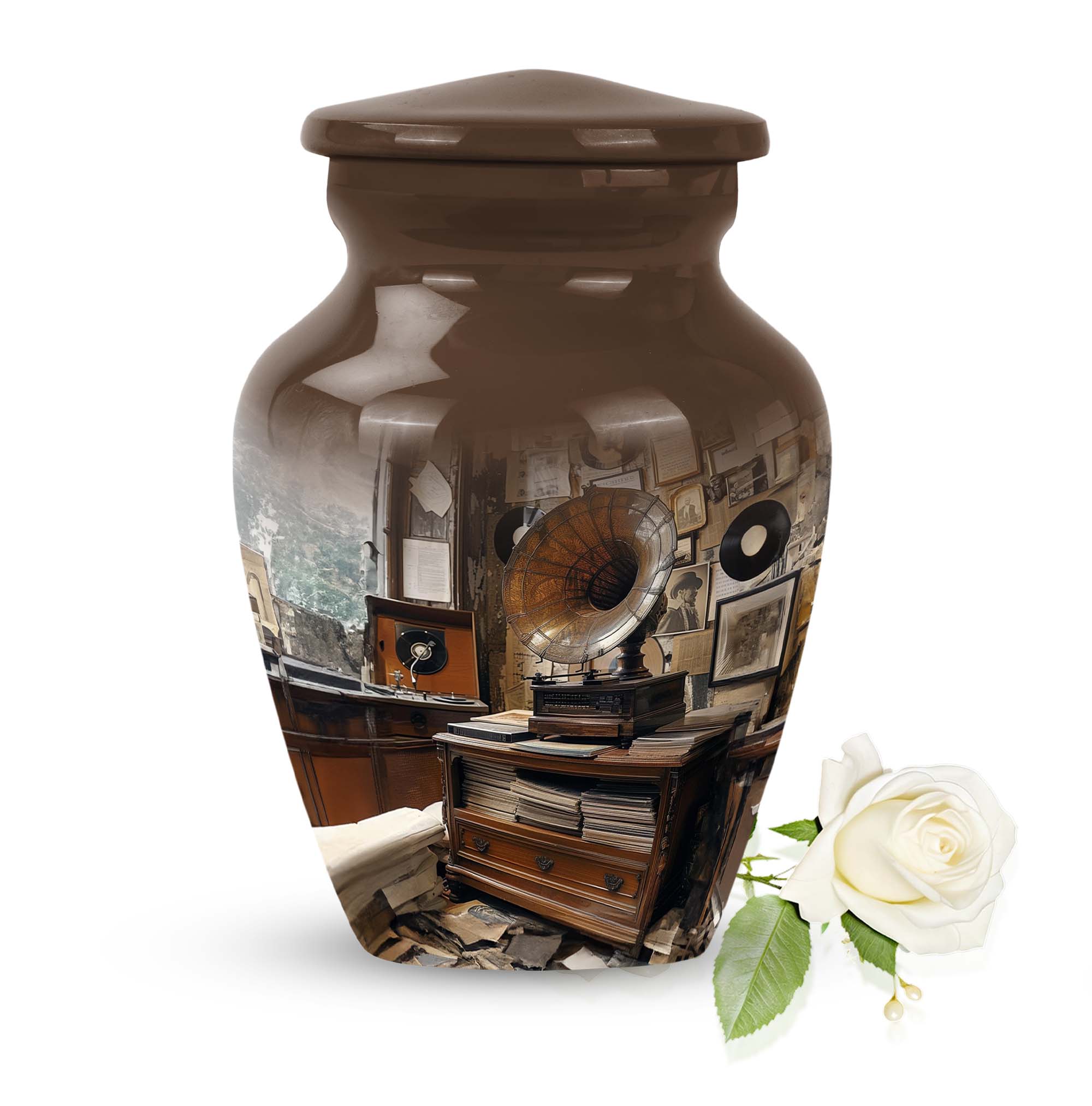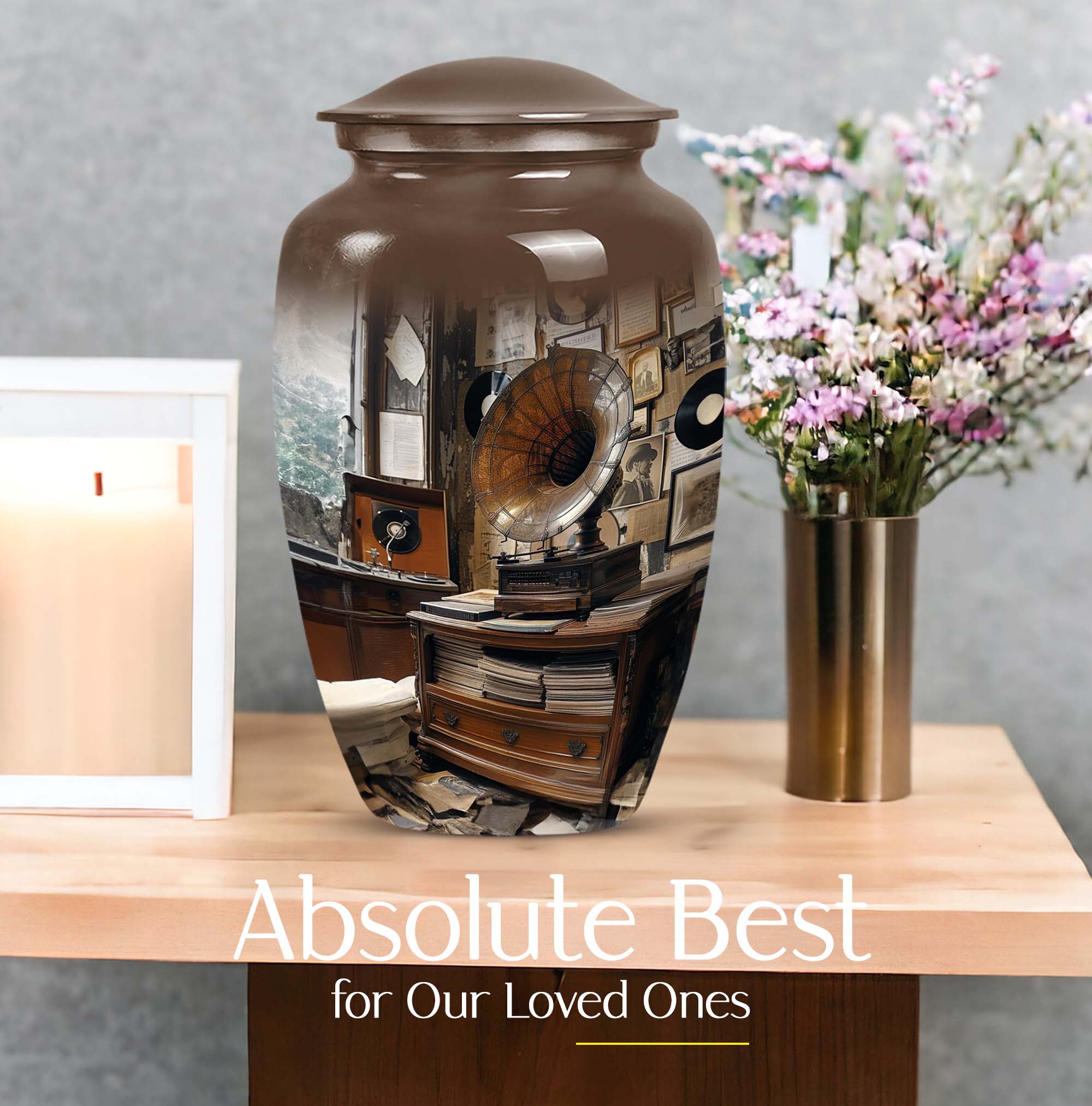 Discover a timeless keepsake for those cherished memories in our Gramophone Urn. This gem, among burial ash urns for humans, resurrects the elegance of a bygone era, through its exquisite 10 Inch stature. Crafted delicately from superior aluminium, the urn is robust and has a weight of 3.3 pounds. With dimensions standing proudly at 10 inches in height, it brings grandeur and respect to any memorial ceremony. This large urn can accommodate 200 cubic inches of cremated remains, ideal for an adult, either female or male. The urn encapsulates your tributes in a plush velvet pouch, providing a reverential containment for the ashes. With the capacity to personalize with engraved names, this urn ensures your monument is unique and sentimental. Abandon the ordinary, and embrace memorial urns that magnify your tribute with our gramophone-themed, classic urn.