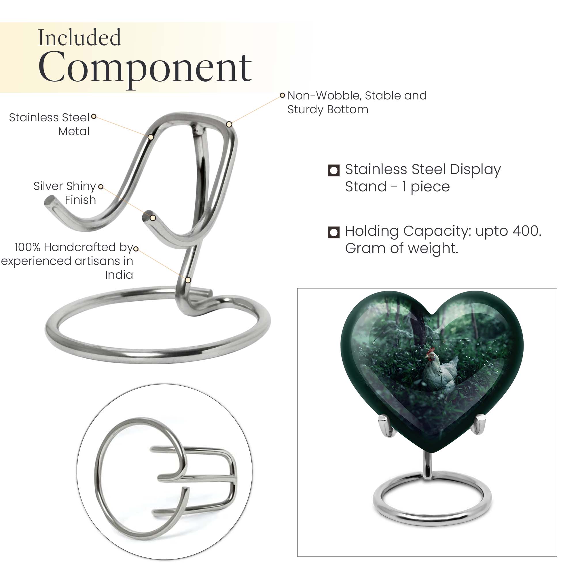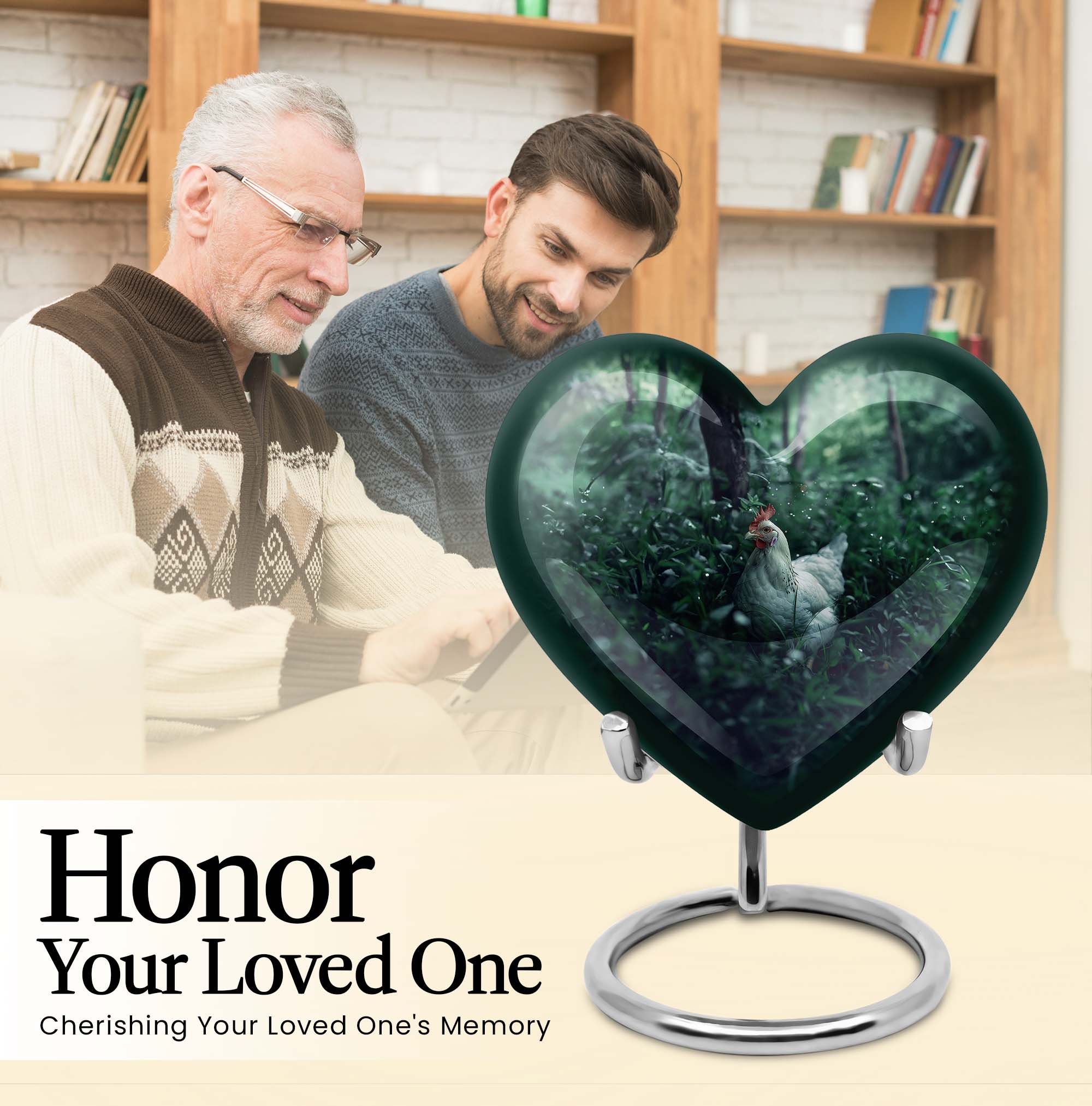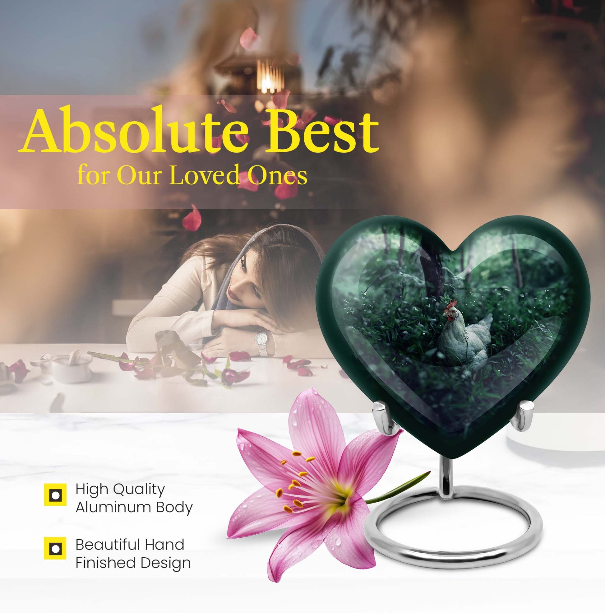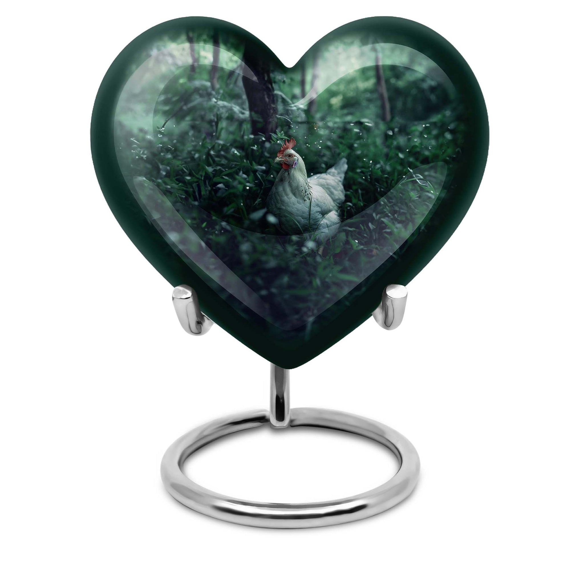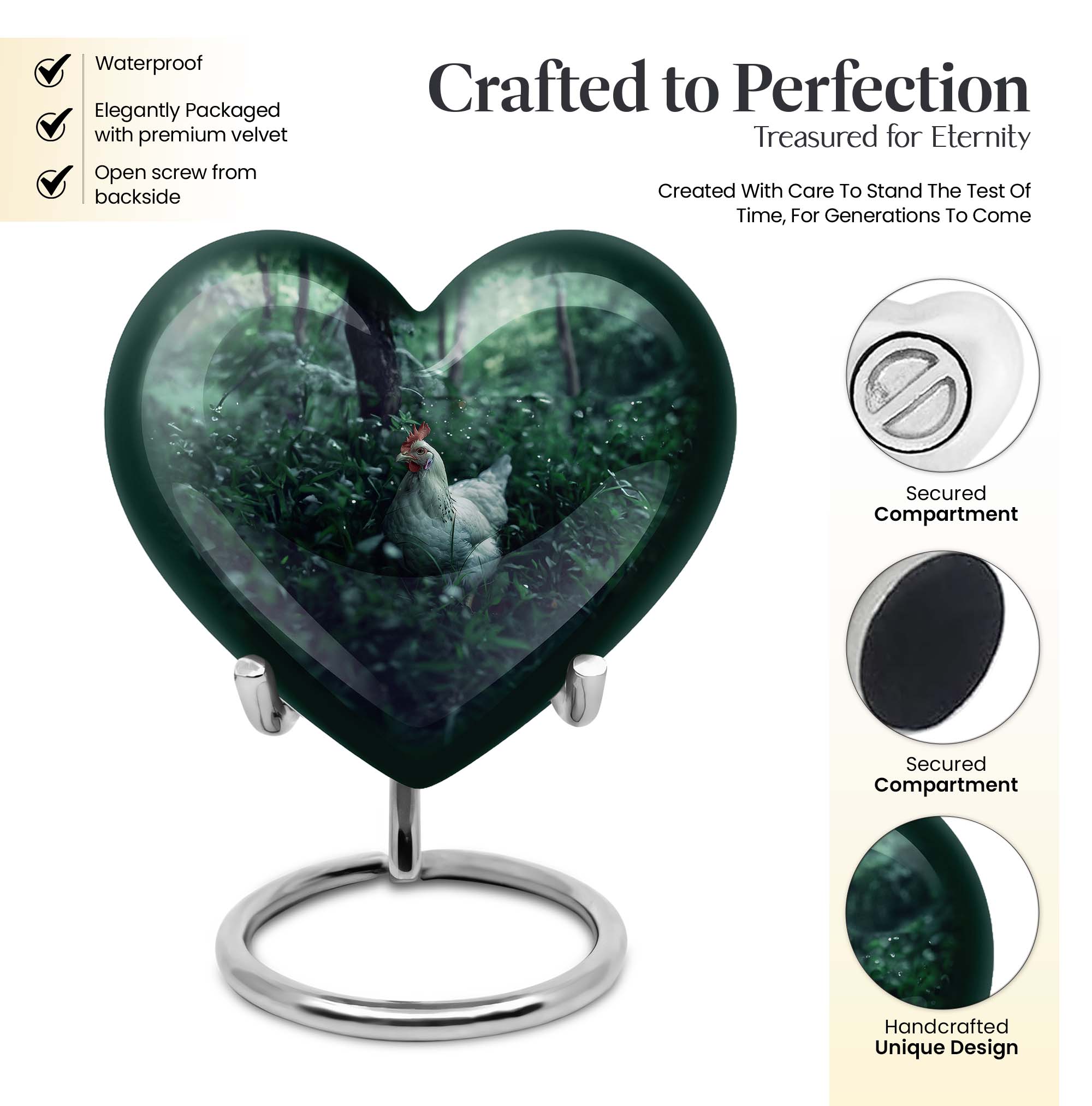 Embrace the memory of your loved ones with this beautifully crafted Chicken Urn that artfully serves as a memorable token. Crafted from resilient Aluminium, this cremation urn stands majestically at 10 inches in height, bearing the weight at a minimal 3.3 pounds. Themed with delicately designed flowers to add a heart-warming touch to this sacred vessel. With the capacity to hold up to 200 cubic inches, this cremation urn for men elegantly bridges the gap between style and sentimentality. Our Chicken Urn comes encased in a sophisticated velvet pouch, ensuring a respectful containment of ashes. Offering the convenience of customization, personalize this large urn with engraved names, further establishing its unmatched uniqueness. It's more than just an urn human burial urn; it's a dignified tribute. Whether you’re searching for memorial urns or a memorable 'urn for human ashes adult men', our Chicken Urn stands as a distinguished choice.