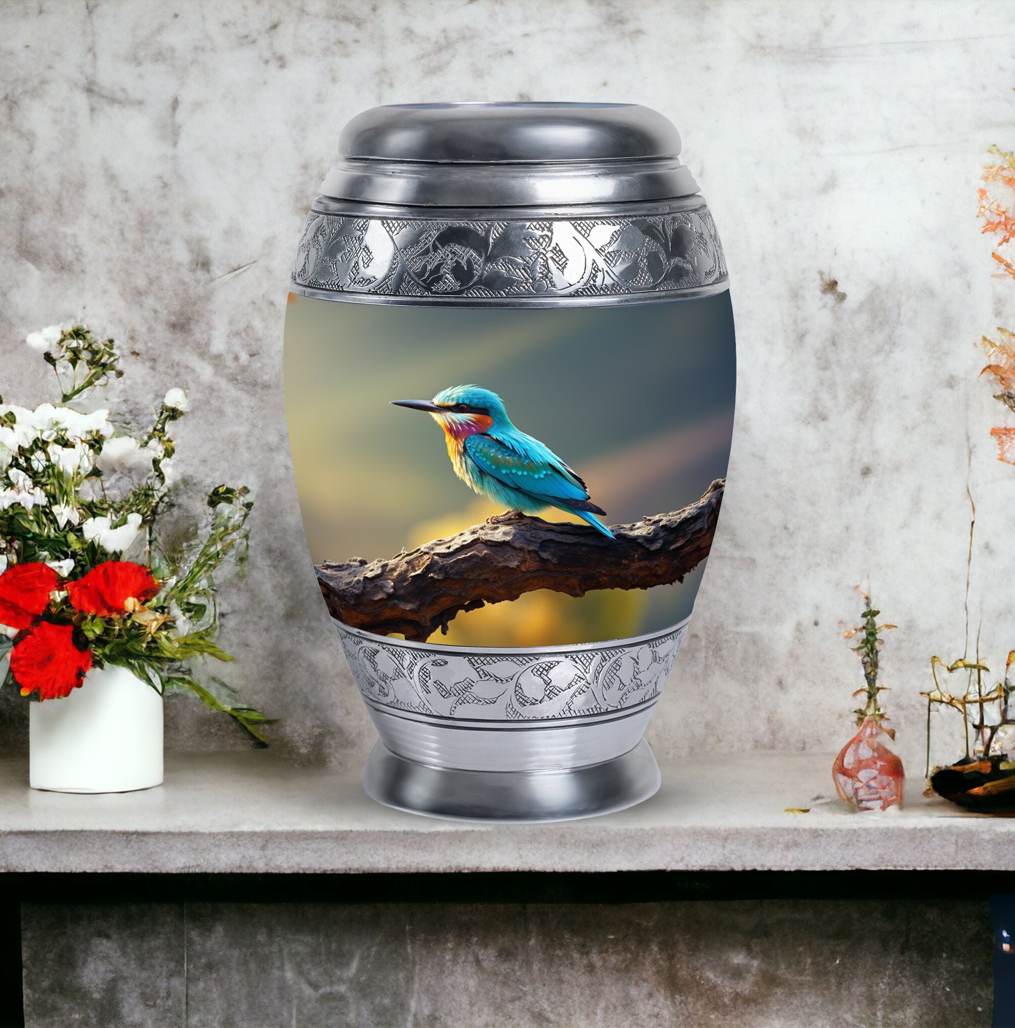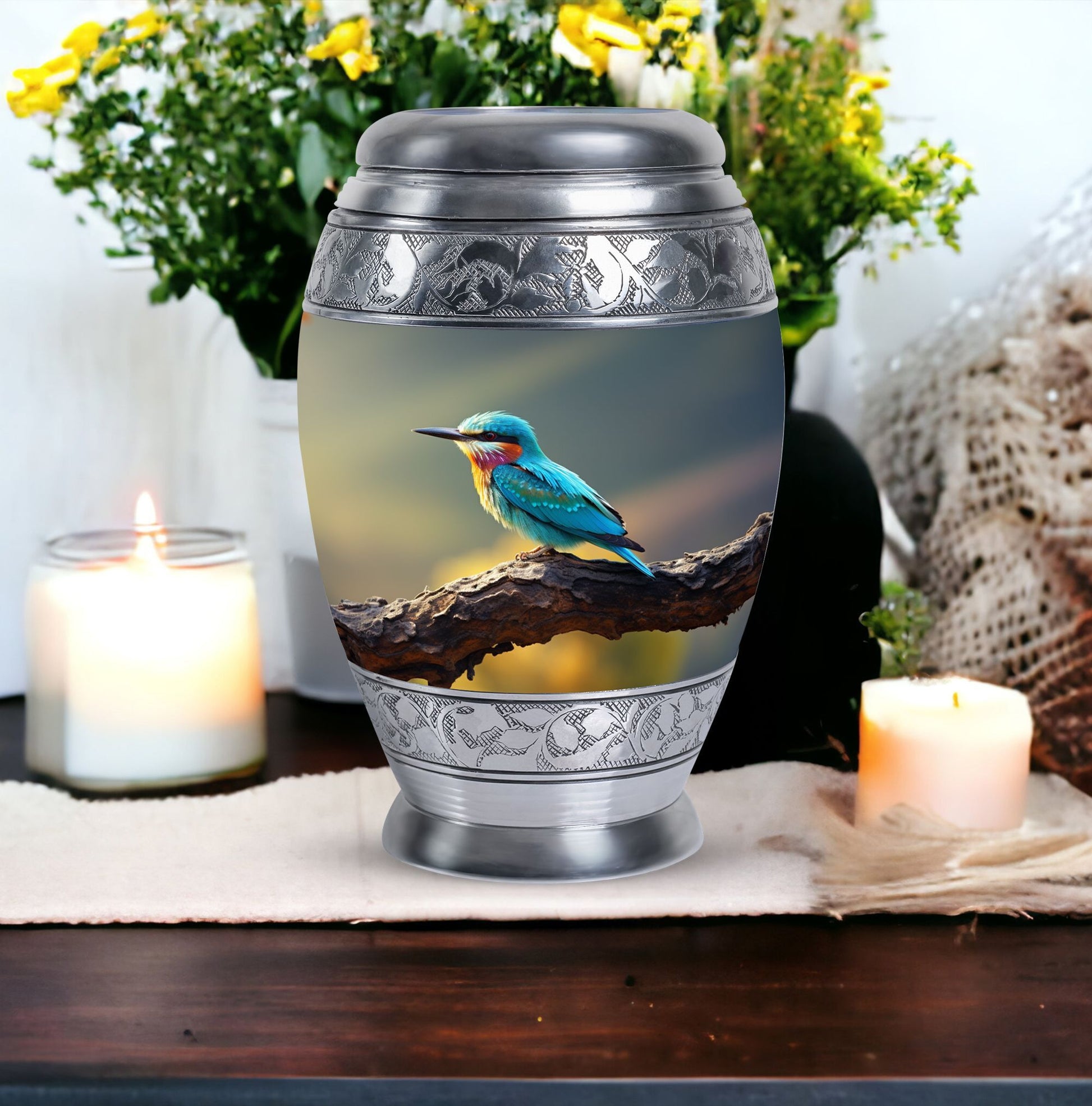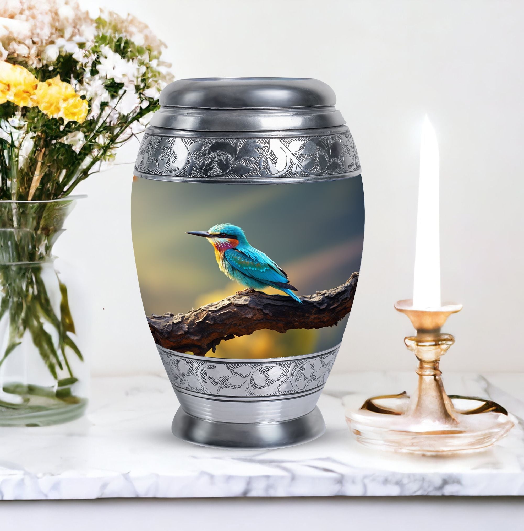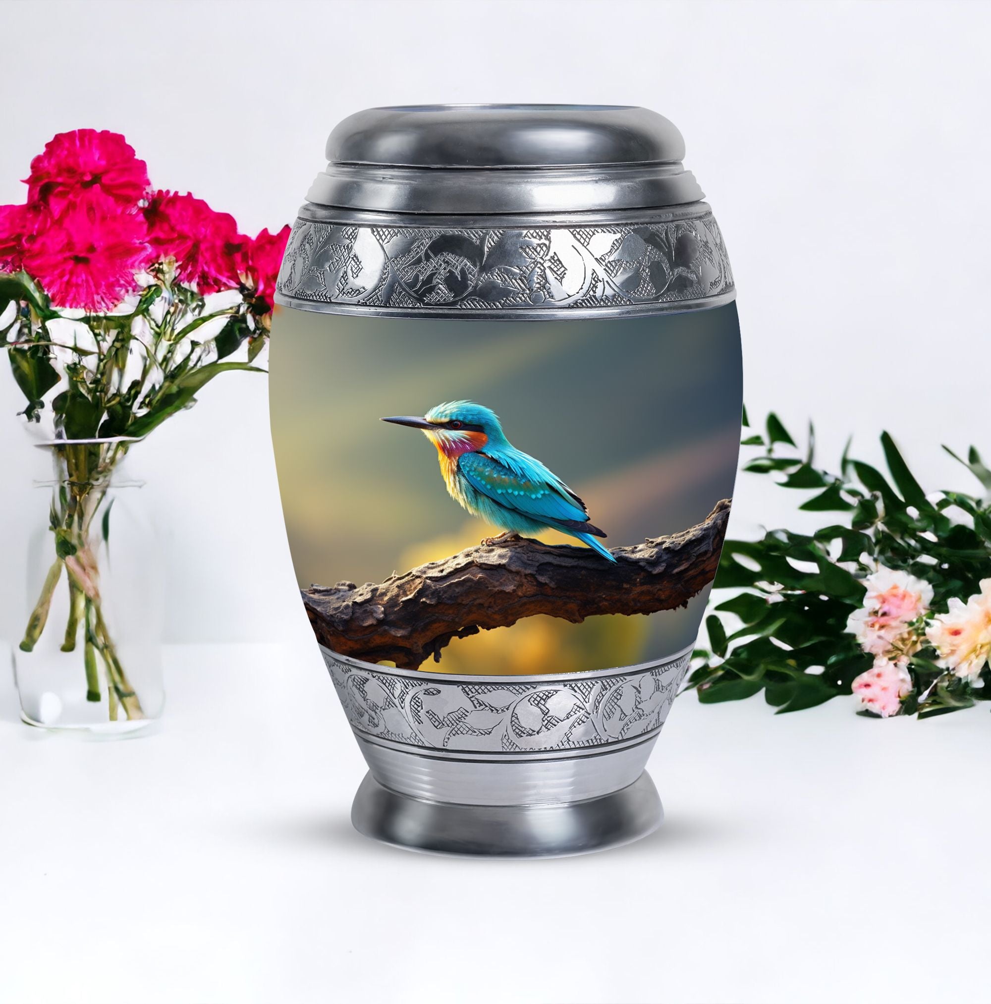 Experience the intimate tranquility of remembering your loved one with the Green Sparrow Memorial Urn. This large urn, crafted from durable Aluminium, houses a generous capacity of 200 cubic inches, serving as a worthy resting space for those we hold dear. With dimensions standing at 10 inches in height, the urn is designed to be unobtrusive yet poignant, a touchstone for moments of remembrance. We understand the solemnity of your search for 'memorial urns'. This eternity encapsulating urn comes with a velvet pouch for the containment of ashes, enhancing the reverence of the urn. Customizable features allow for personalization with engraved names, enabling you to create a befitting piece. Weighing at 3.3 pounds, this urn, nestled in a 3 Inch size, offers stability and gravity.