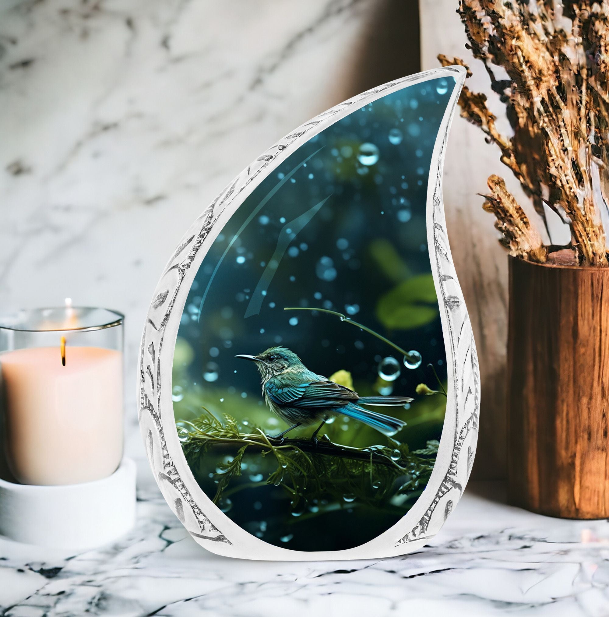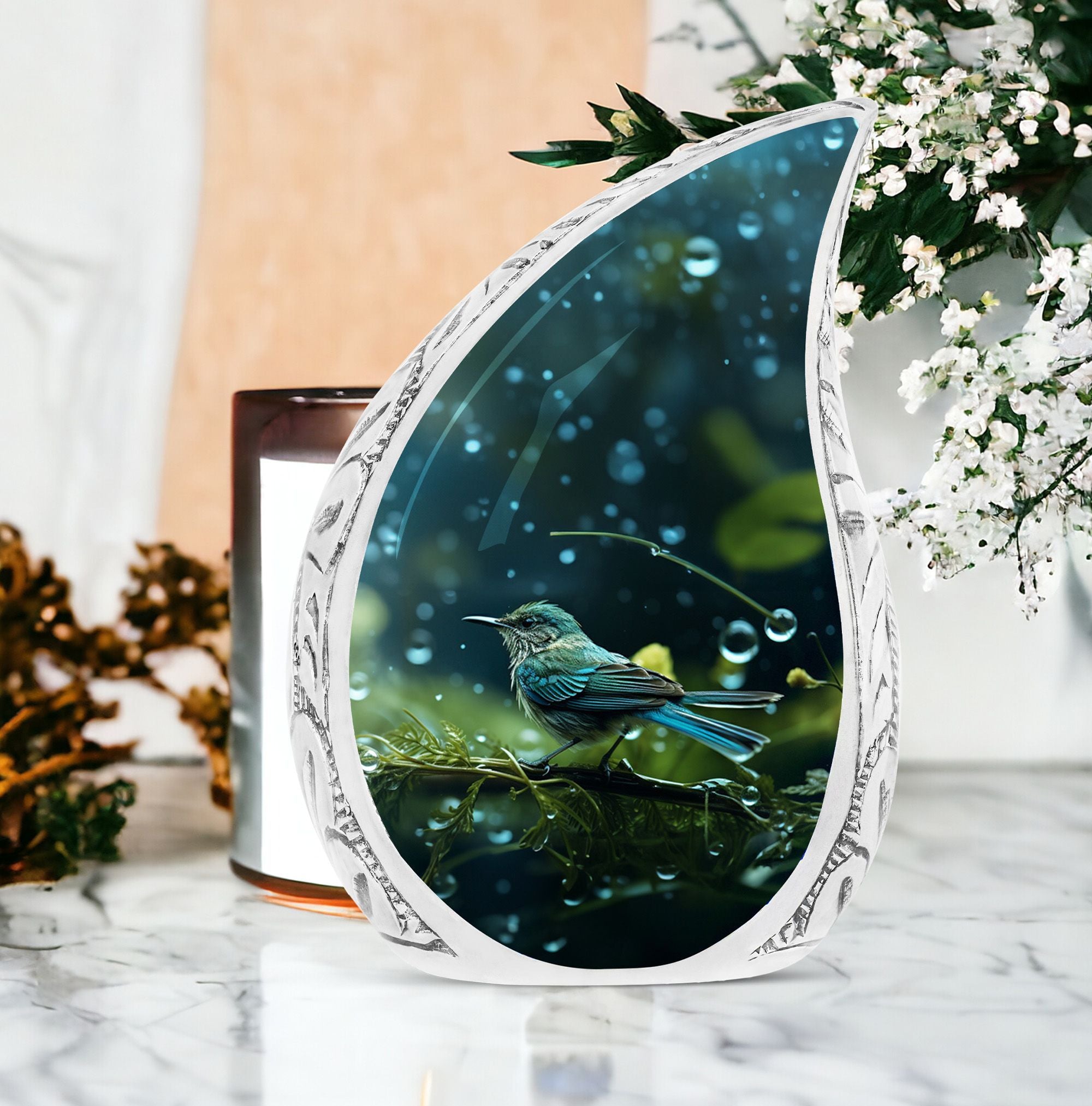 Pay tribute to your cherished loved one in a unique, time-honored way with the Green Sparrow Cremation Urn, a perfect urn for Mother or Father. This top-notch memorial urn will serve as a lasting remembrance, preserving the memory of your dearly departed. Made from sturdy Aluminum, this large urn is both durable and tastefully understated. Weighing 3.3 pounds, it stands 10 inches tall, with a 3-inch circumference, and can hold up to 200 cubic inches of ashes. This pragmatic yet elegant urn comes with a velvet pouch for containment of ashes, ensuring their secure and undisturbed storage. With the option to personalize with engraved names, this urn offers the opportunity to truly make this tribute your own. Keywords that express the essence of this container for human ashes are green sparrow, urn for ashes for men, and the like. Note that this does not include the urn's design detail. This memorial urn is more than a container - it is a heartfelt ode to the journey that you shared with your loved one.