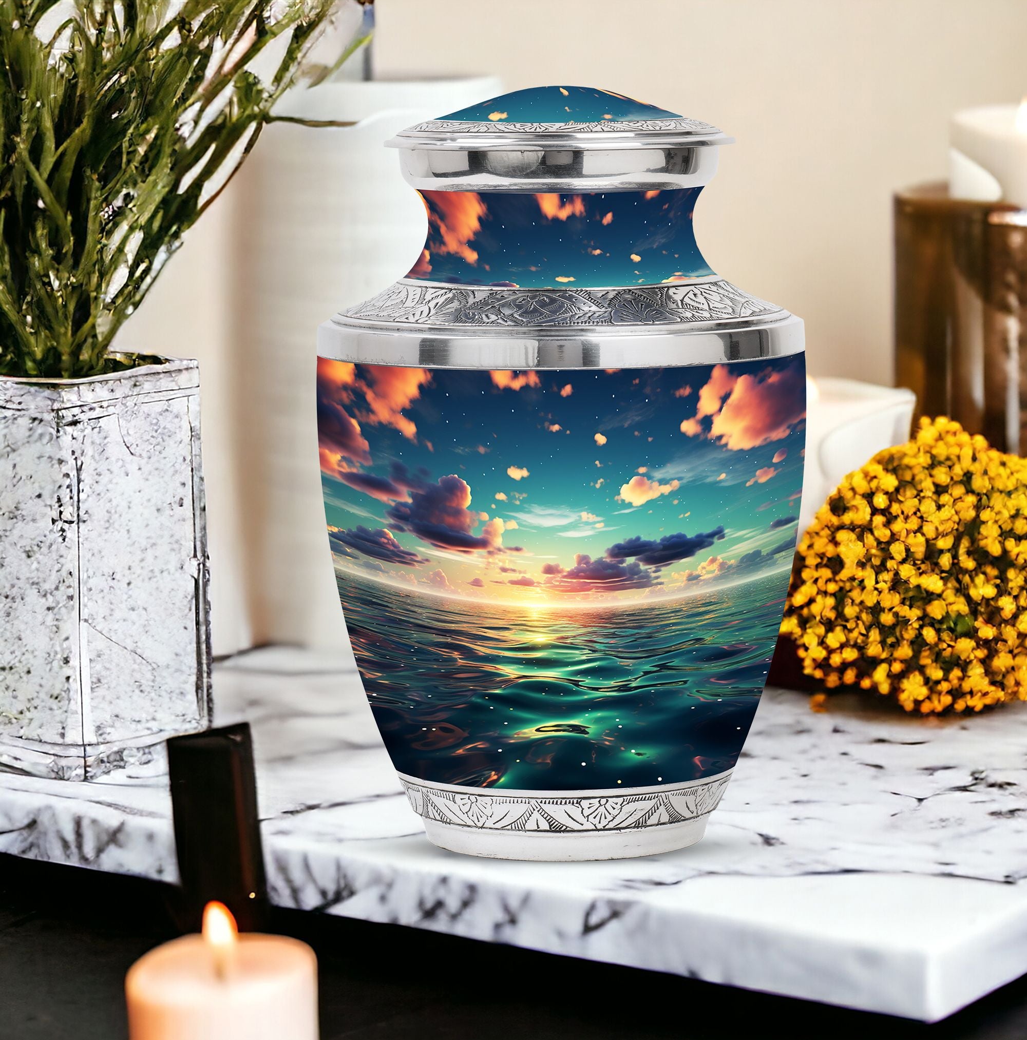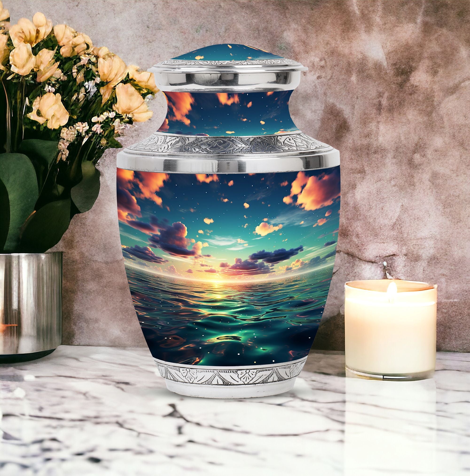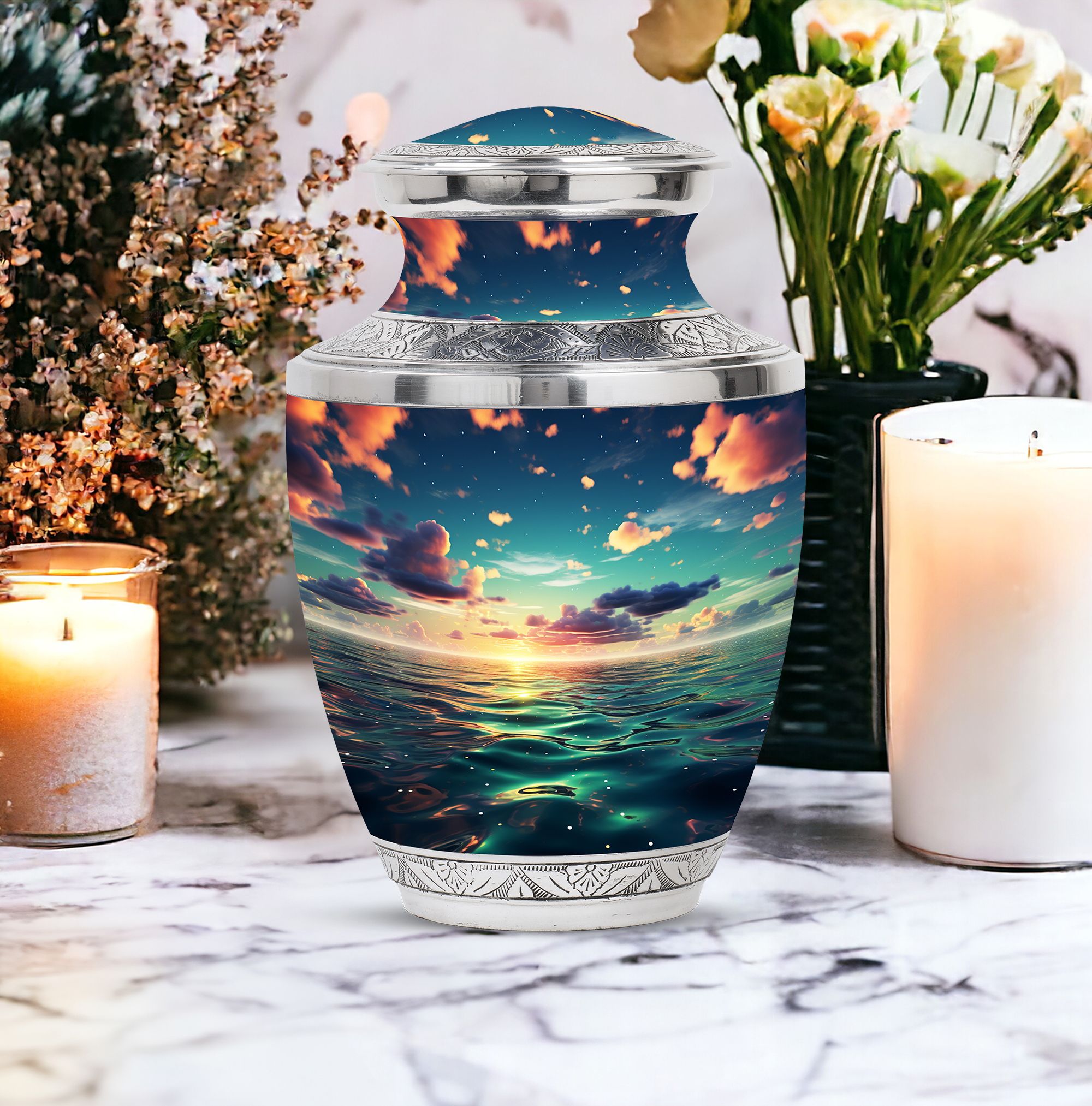 Cherish the memories of your loved ones with our selection of distinctive urns for sea burial. By harmoniously blending environmentally responsible materials and an exquisite green shade, these cremation urns proffer a serene, symbolic connection to the yonder open seas. Suitable for an adult male, our capacious urns delicately secure the precious ashes, offering peace and tranquility. To personalize the commemoration, combine these urns with your beloved's favorite urn decorations. Catering to varying needs, we also offer these sacred vessels in a medium size, making them an ideal choice even for the ladies. Embrace the cosmic cycle of life and honor your dearly departed with our elegant, purpose-specific cremation urns that echo the melody of beautiful, lasting tribute. Nestle your cherished memories in our embrace and find comfort in this spiritual journey.