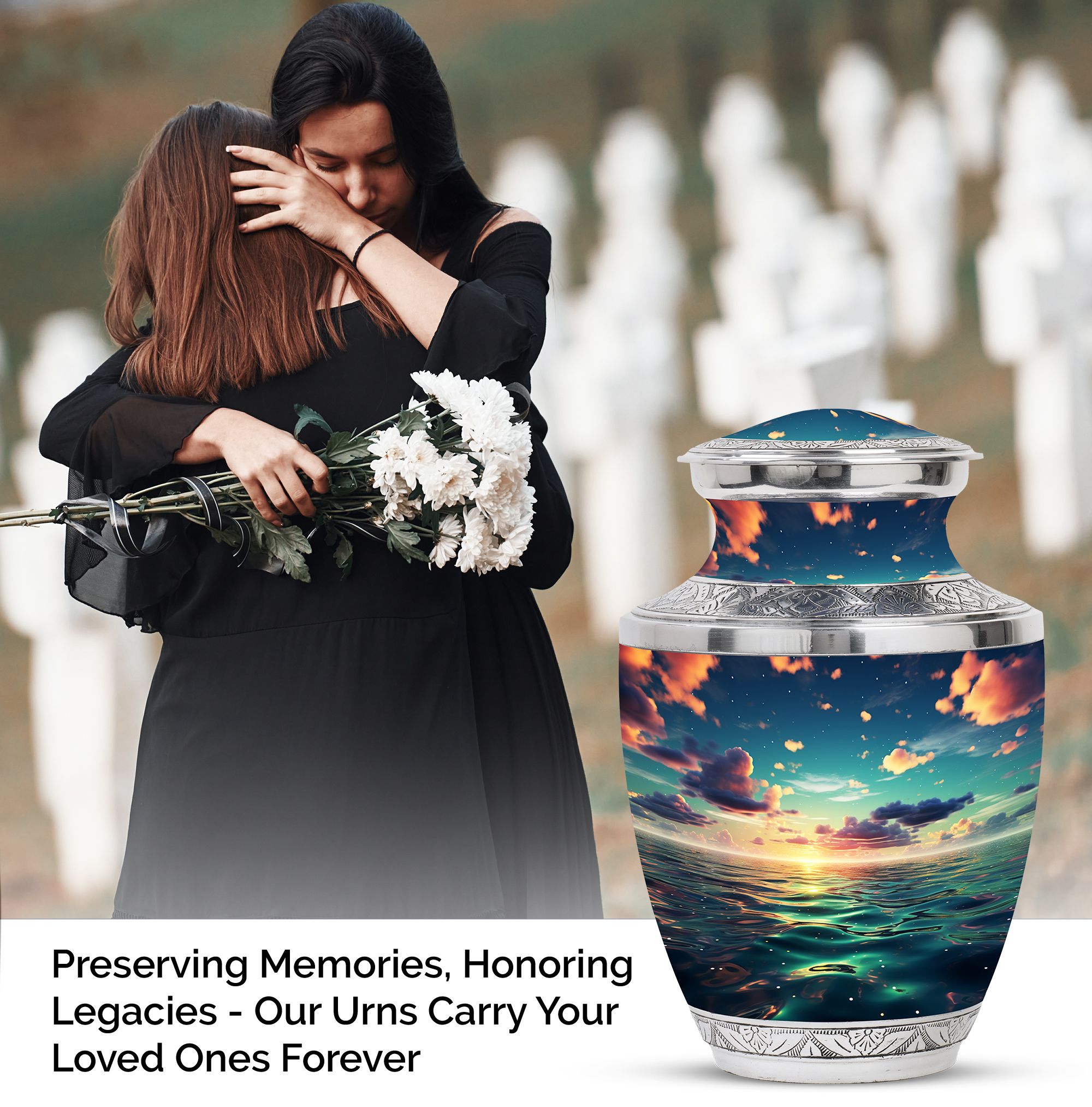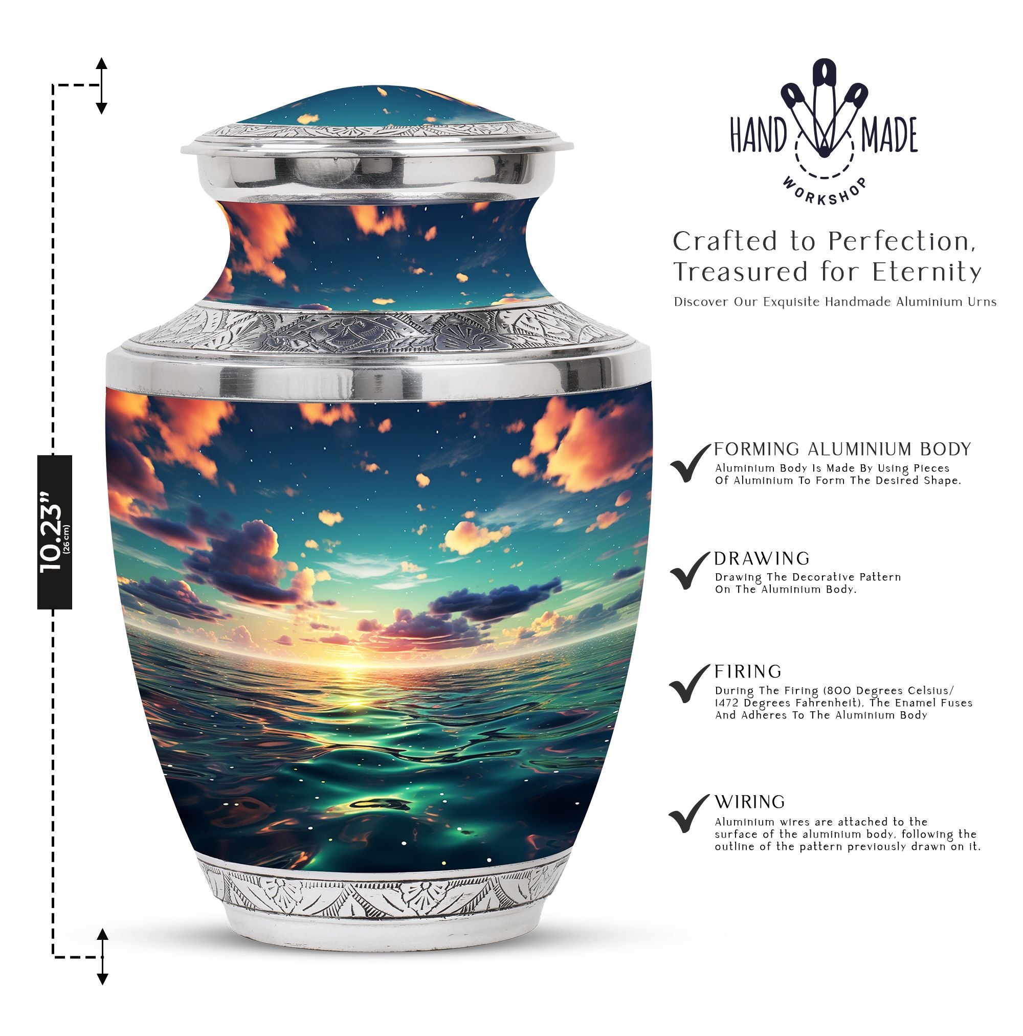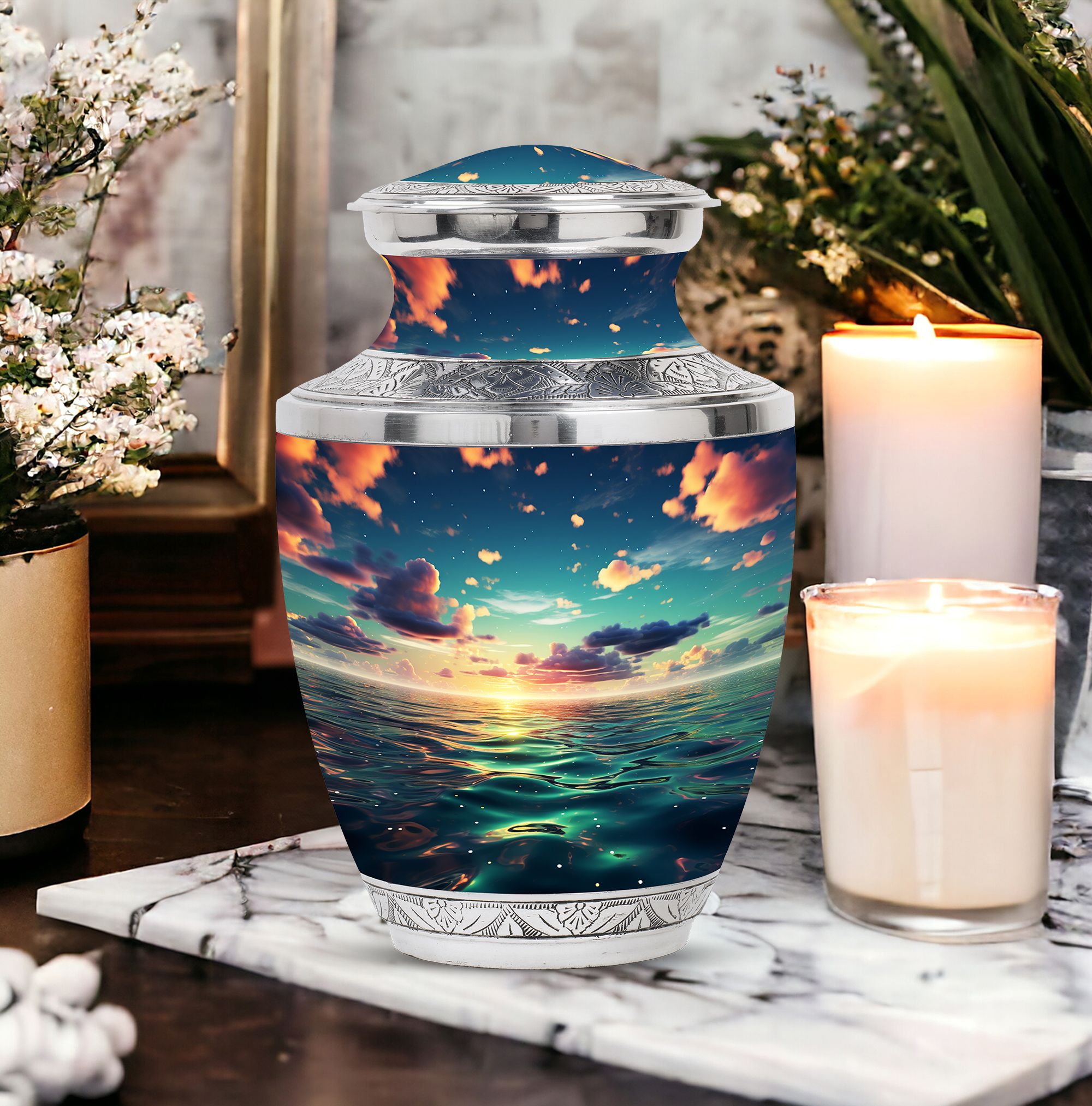 Cherish the memories of your loved ones with our selection of distinctive urns for sea burial. By harmoniously blending environmentally responsible materials and an exquisite green shade, these cremation urns proffer a serene, symbolic connection to the yonder open seas. Suitable for an adult male, our capacious urns delicately secure the precious ashes, offering peace and tranquility. To personalize the commemoration, combine these urns with your beloved's favorite urn decorations. Catering to varying needs, we also offer these sacred vessels in a medium size, making them an ideal choice even for the ladies. Embrace the cosmic cycle of life and honor your dearly departed with our elegant, purpose-specific cremation urns that echo the melody of beautiful, lasting tribute. Nestle your cherished memories in our embrace and find comfort in this spiritual journey.