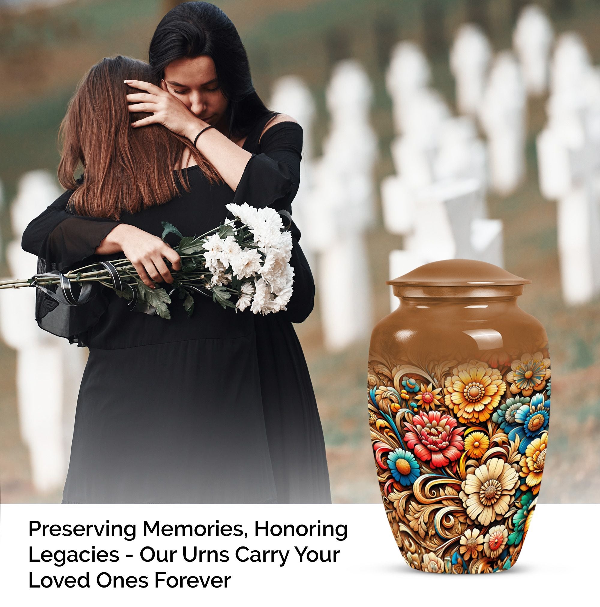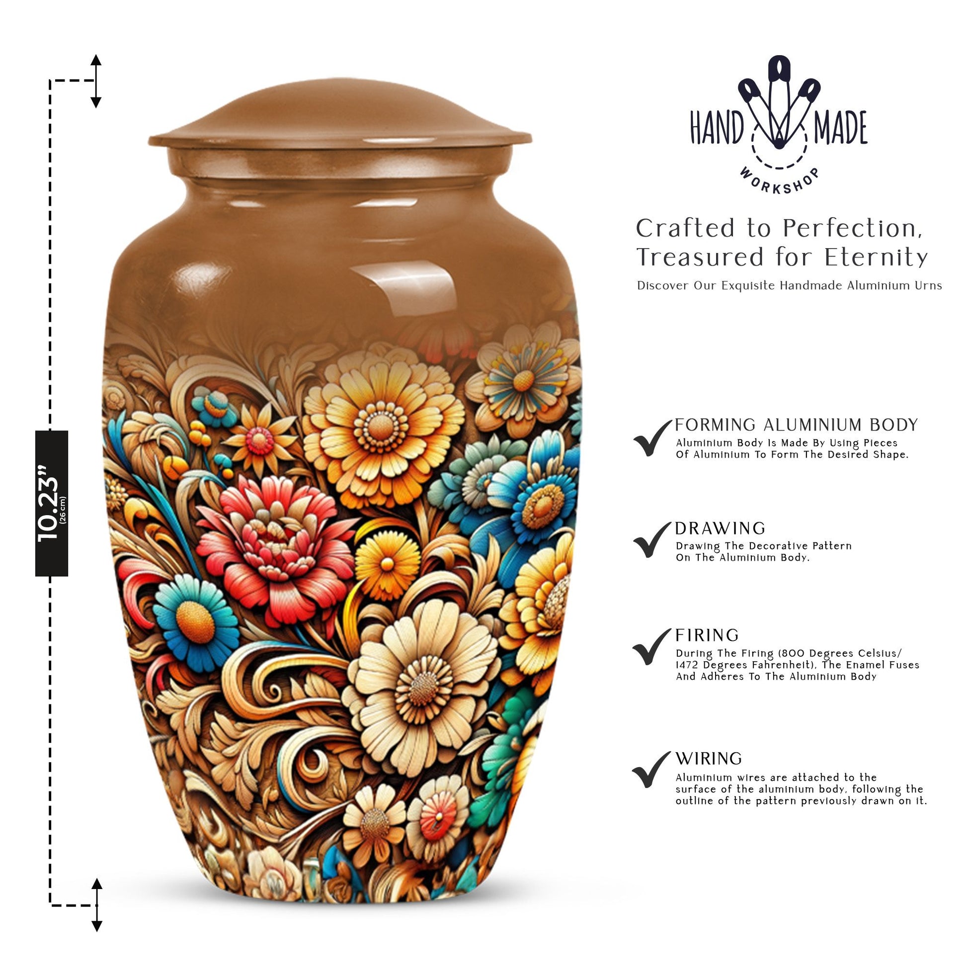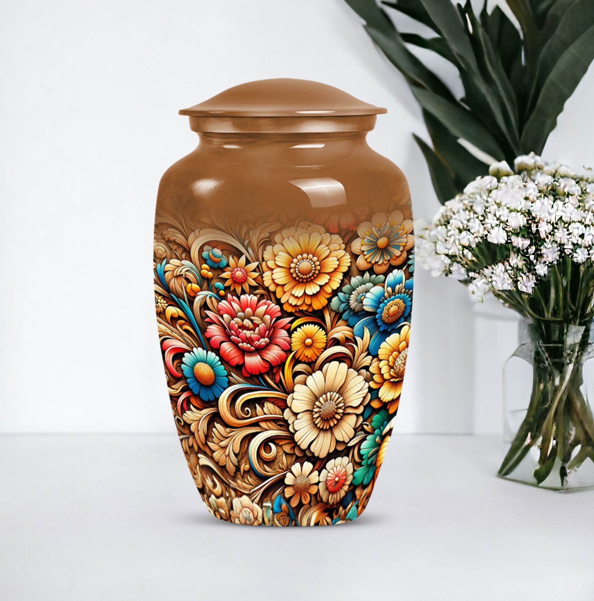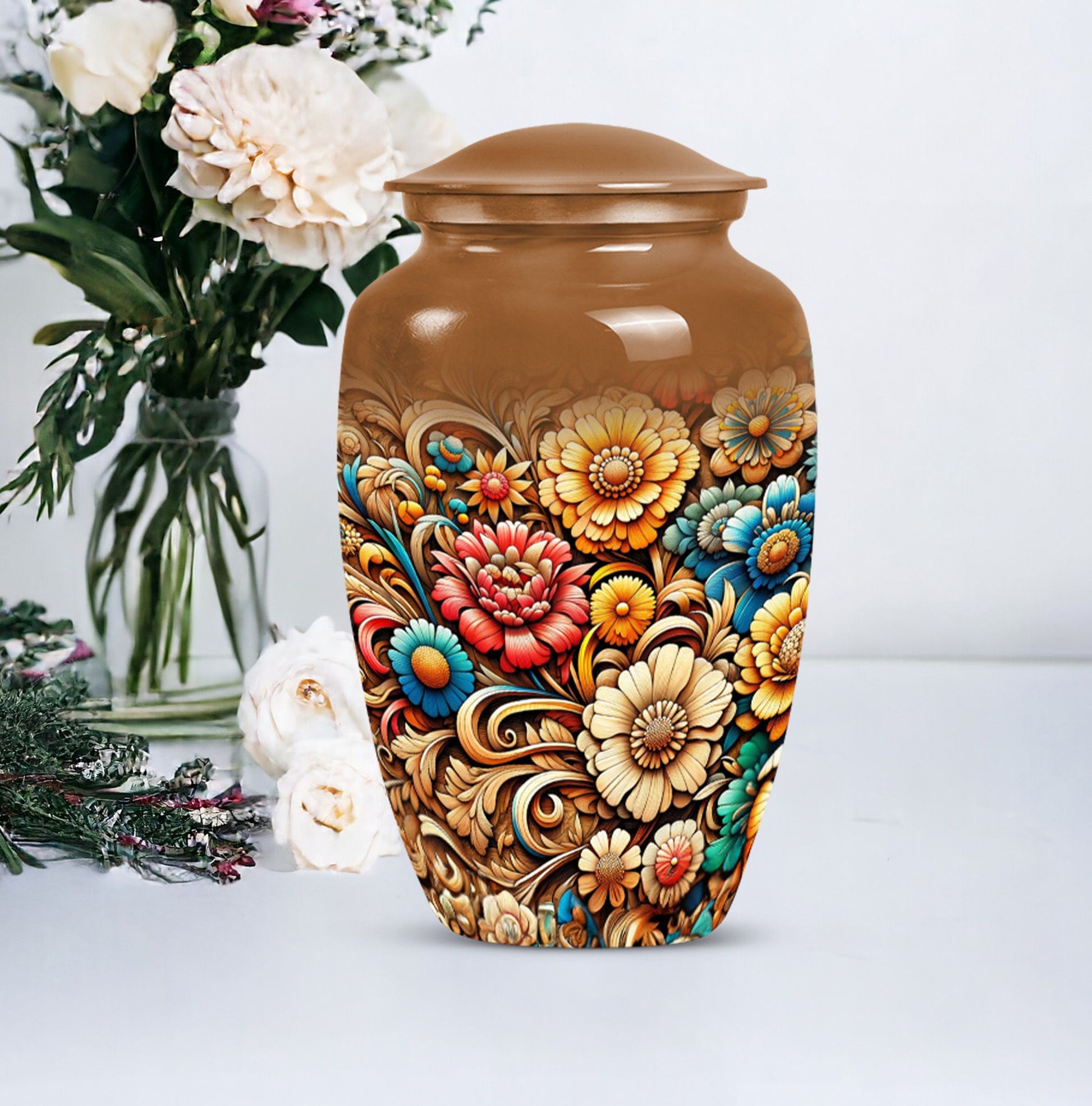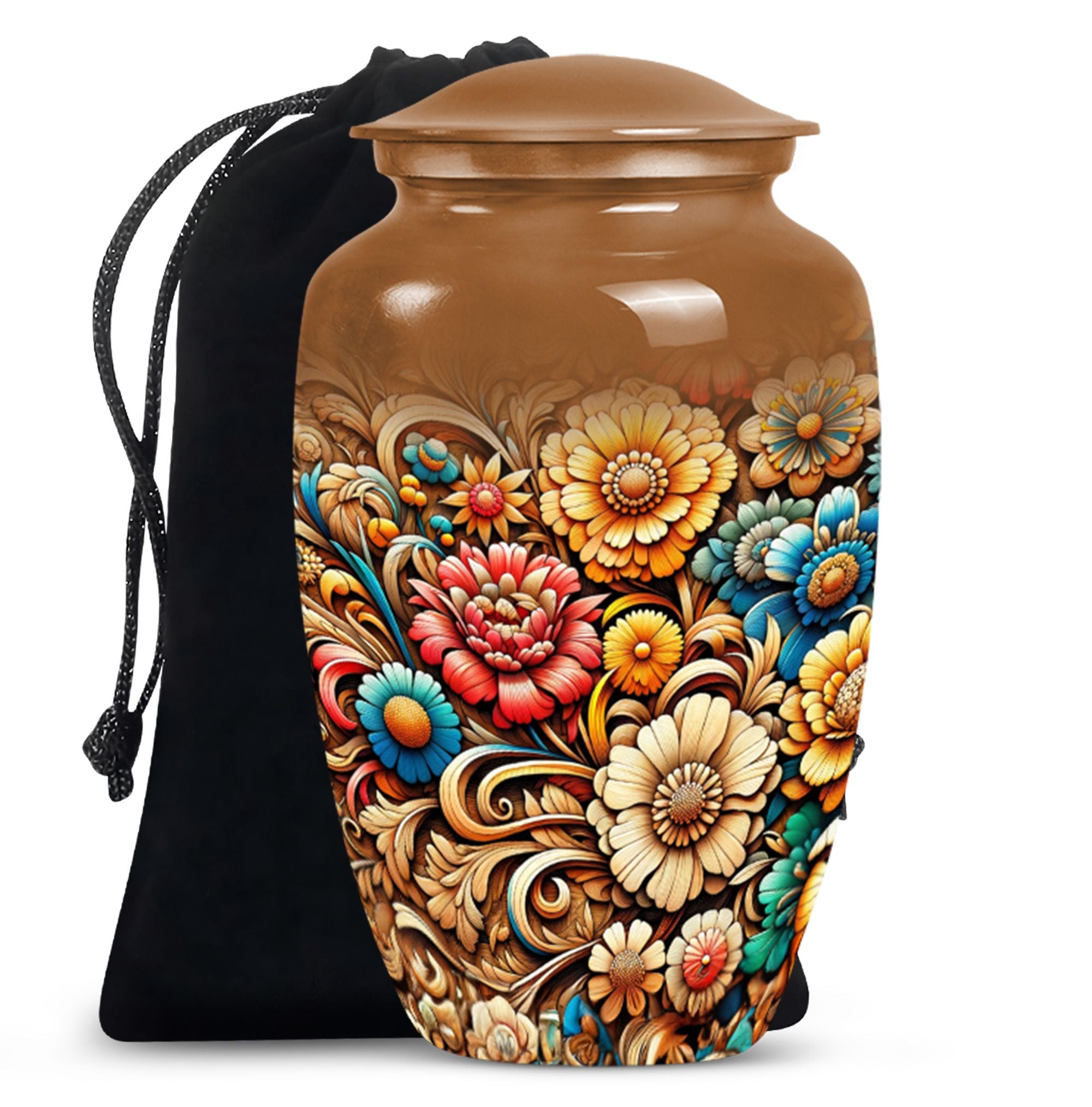 Cherish and memorialize your loved ones with our handcrafted 'Abstract Themed Flowers Urn'. Created from durable Aluminium, this cremation urn has an awe-inspiring persona. Its graceful 10-Inch size and weight of 3.3 pounds ensures a sustainable and robust testament to your departed. Furnished with a capacity of 200 cubic inches, it can securely hold the ashes of an adult, making it an optimal choice for funeral or burial urns. The urn is accompanied by a velvet pouch, designed especially for containing ashes. Personalize your token of remembrance with engraved names, adding an even deeper connection and individual touch to your memorial convention. This product aptly infuses the keywords, 'Cremation urn for dad, human adult urns, burial urns for cremation ashes' making it easy to search for seniors and adults looking for Memorial Ceremony Supplies. Choose our 'Flowers Urn' for a distinguished and timeless way to honor your loved ones.