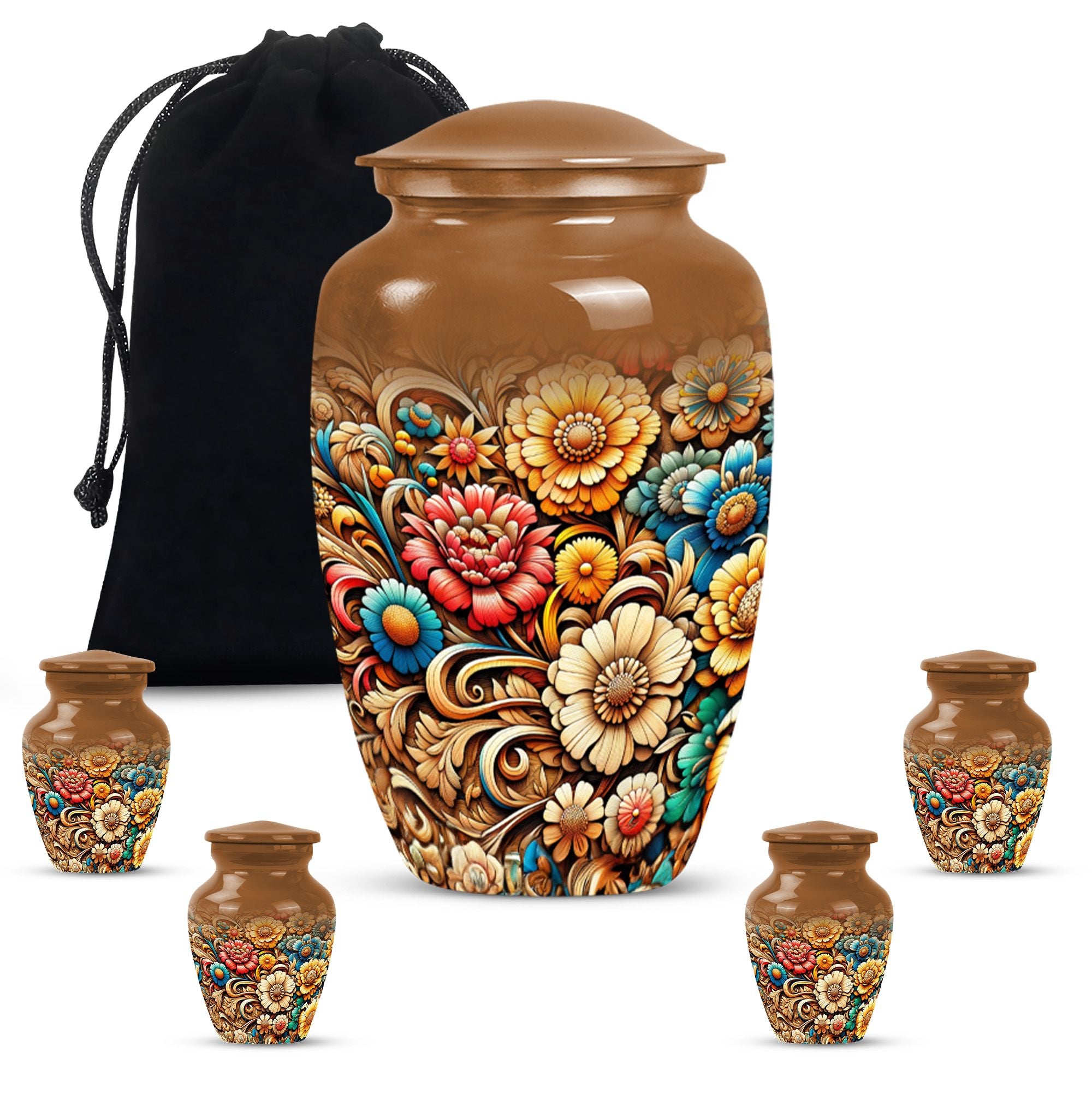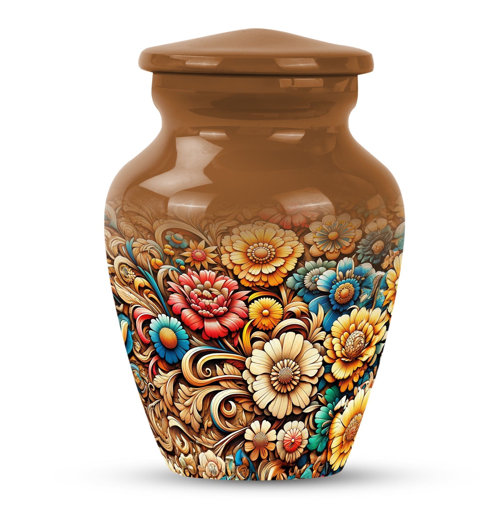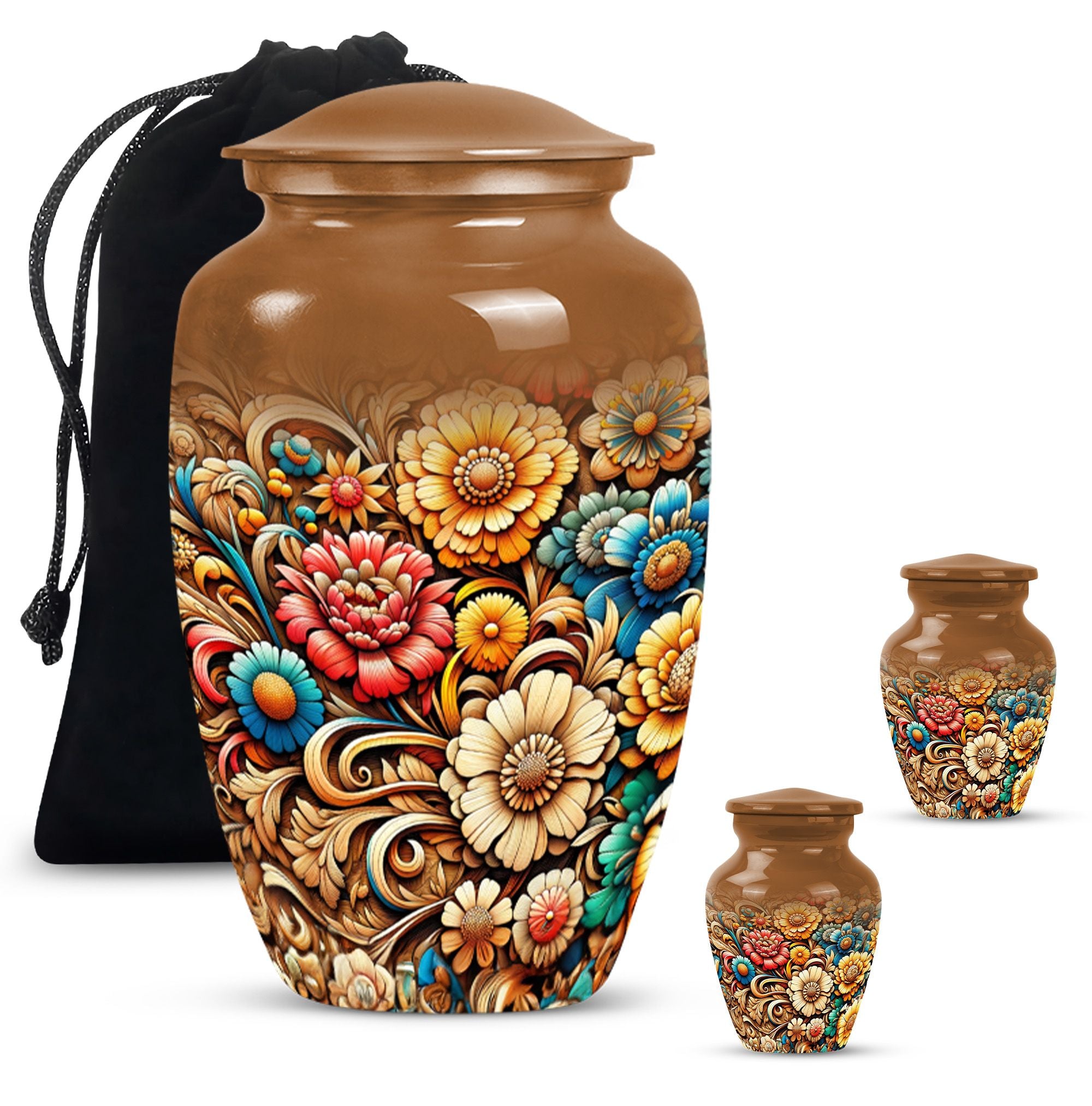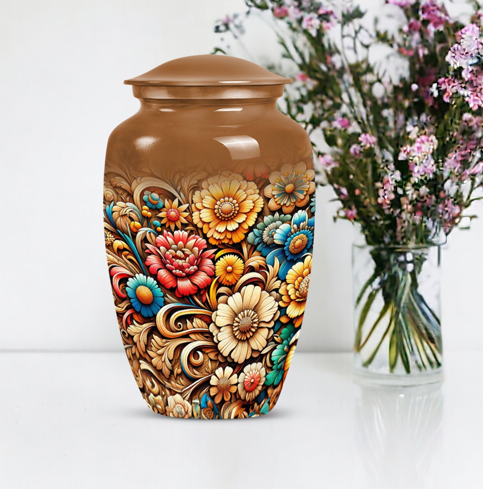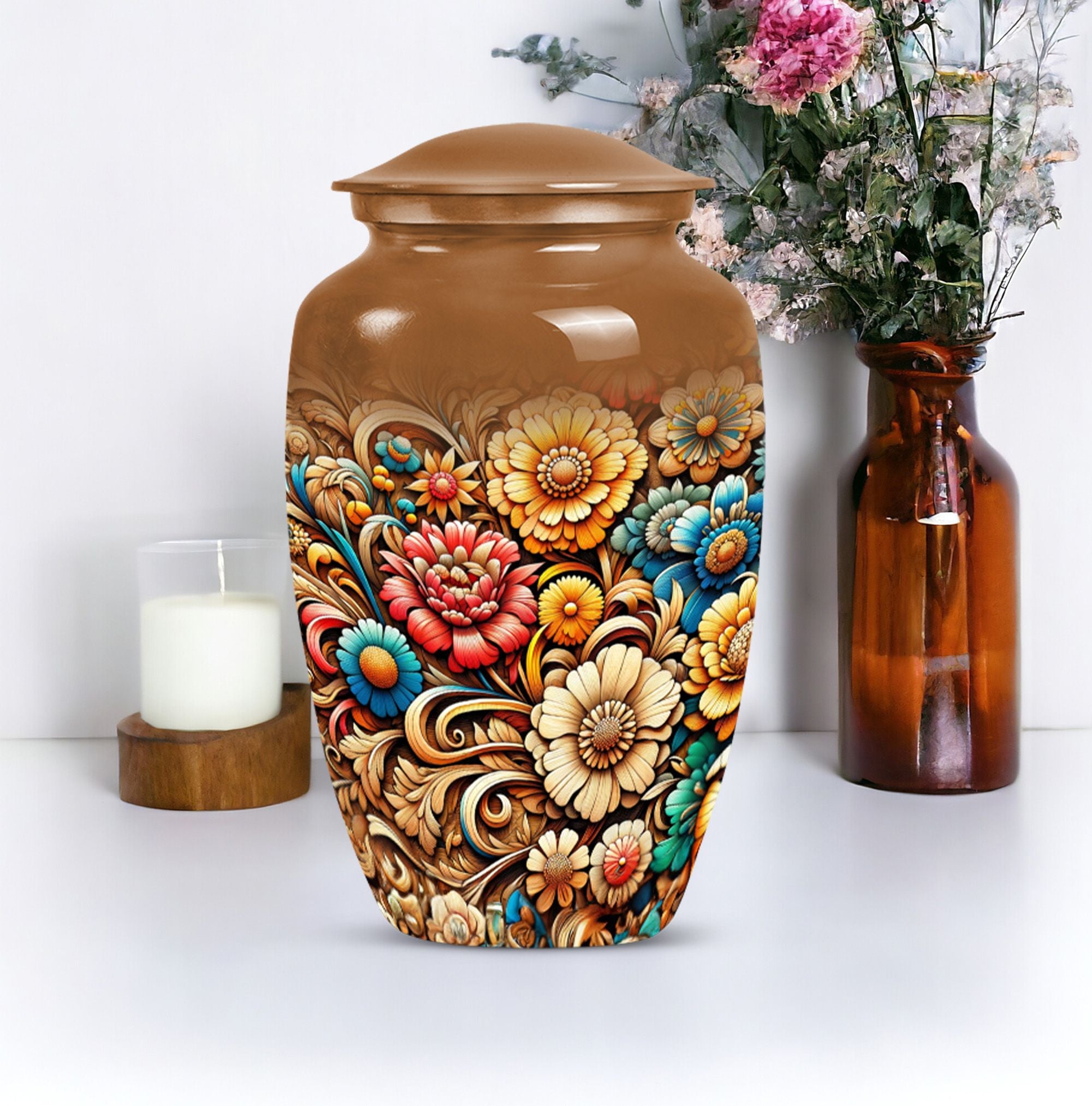 Cherish and memorialize your loved ones with our handcrafted 'Abstract Themed Flowers Urn'. Created from durable Aluminium, this cremation urn has an awe-inspiring persona. Its graceful 10-Inch size and weight of 3.3 pounds ensures a sustainable and robust testament to your departed. Furnished with a capacity of 200 cubic inches, it can securely hold the ashes of an adult, making it an optimal choice for funeral or burial urns. The urn is accompanied by a velvet pouch, designed especially for containing ashes. Personalize your token of remembrance with engraved names, adding an even deeper connection and individual touch to your memorial convention. This product aptly infuses the keywords, 'Cremation urn for dad, human adult urns, burial urns for cremation ashes' making it easy to search for seniors and adults looking for Memorial Ceremony Supplies. Choose our 'Flowers Urn' for a distinguished and timeless way to honor your loved ones.