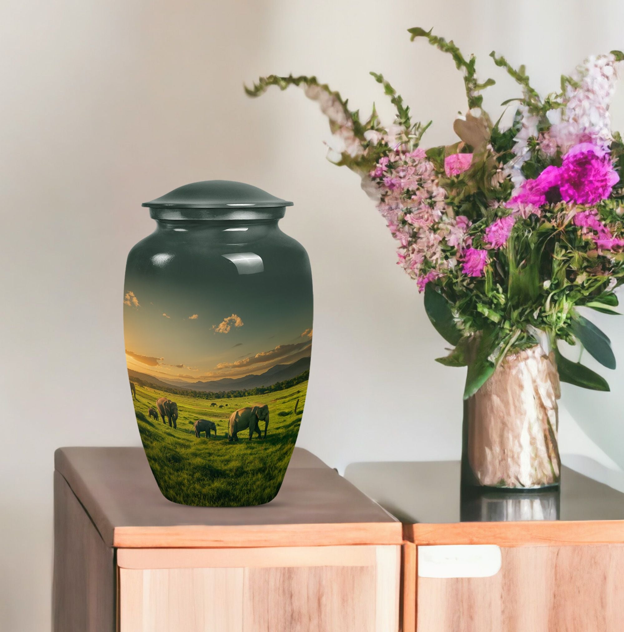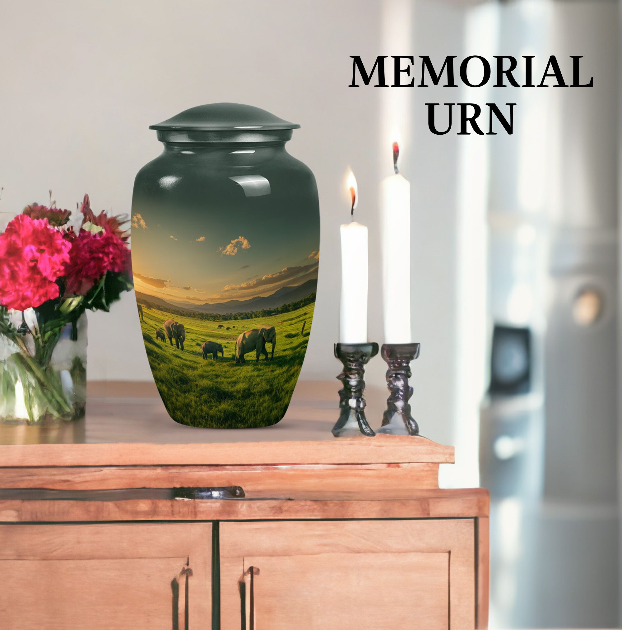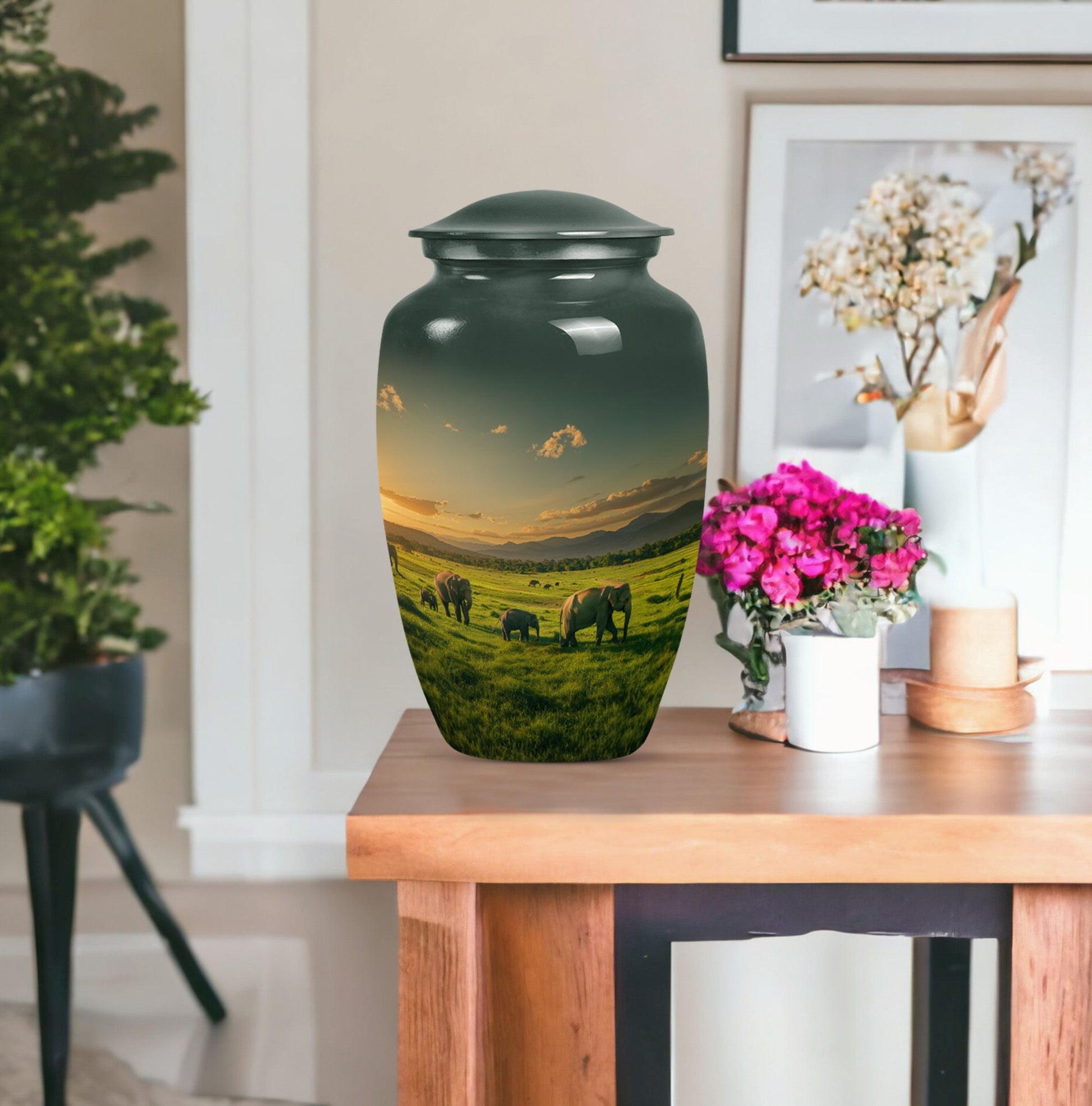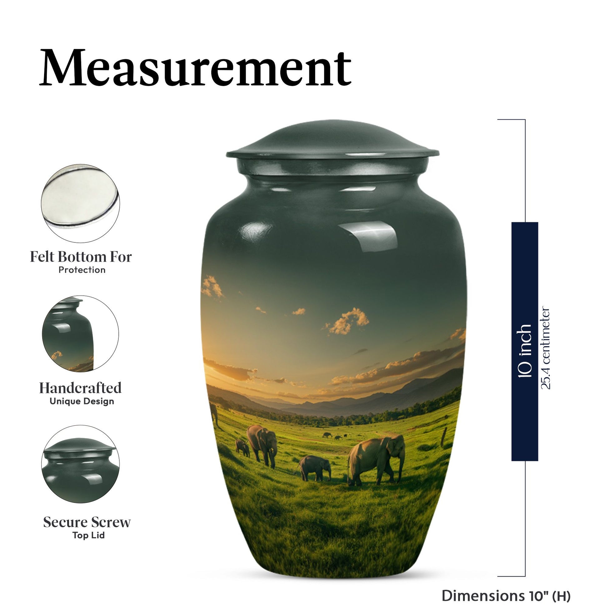 The Guardian Elephant Family Large Cremation Memorial Urn is a beautifully crafted tribute designed to honor the memory of your loved one with dignity and grace. This urn features an intricate design of a protective elephant family, symbolizing strength, loyalty, and eternal love. Made from high-quality materials, it offers a durable and secure resting place for the ashes of an adult. The large capacity ensures ample space, while the detailed artistry of the elephant family adds a touch of elegance and meaning to any memorial setting. This urn serves as a lasting tribute, providing comfort and peace as you cherish the memories of your loved one.