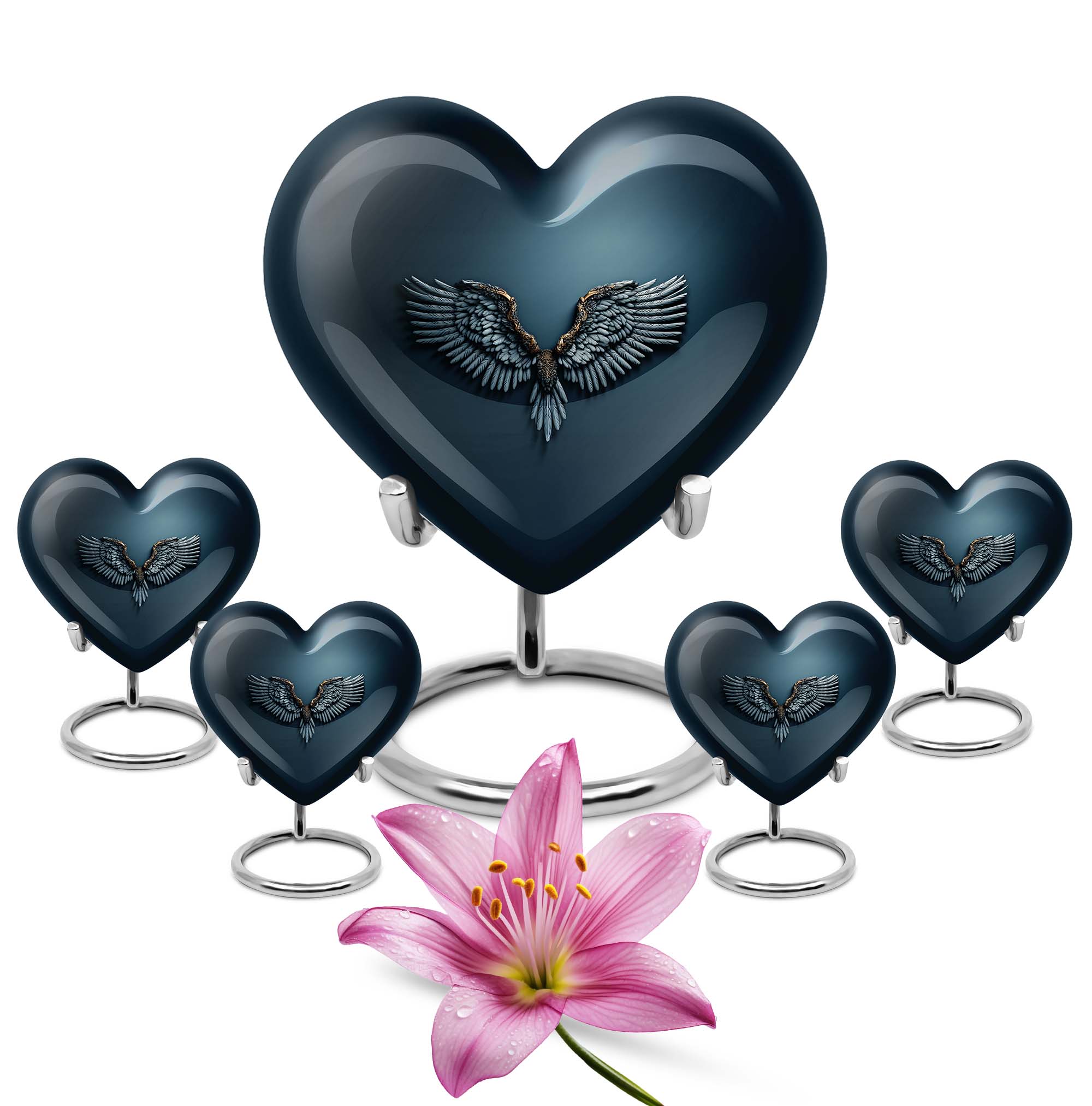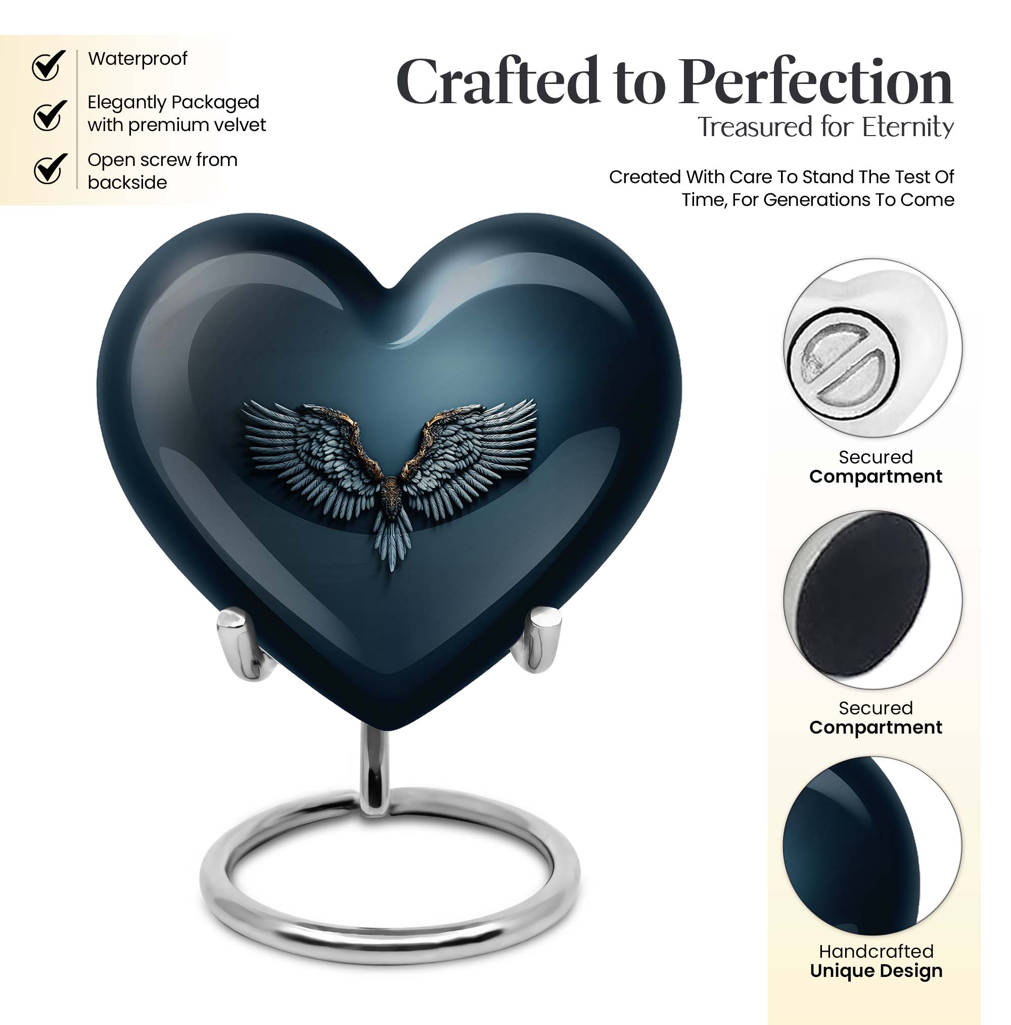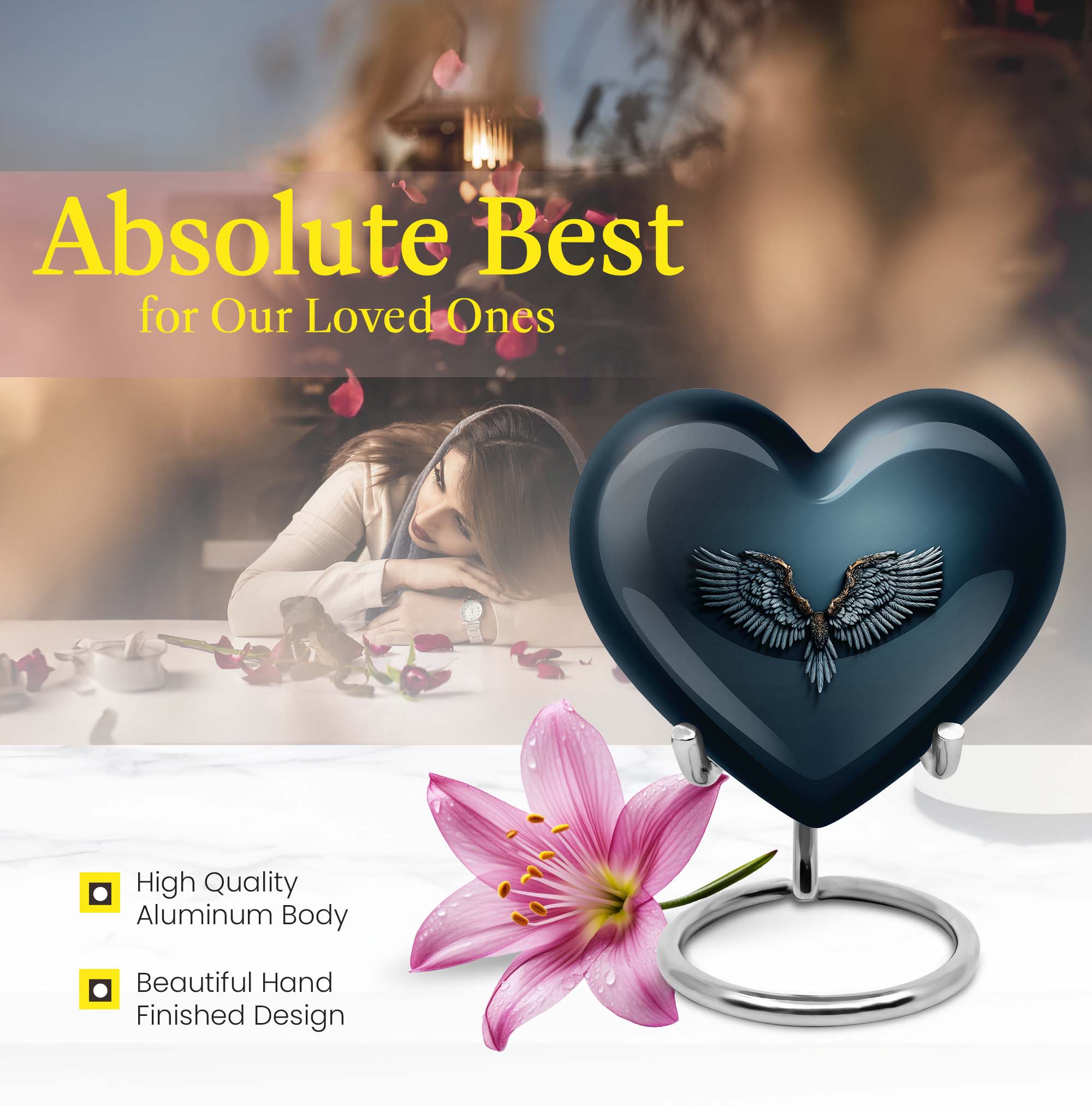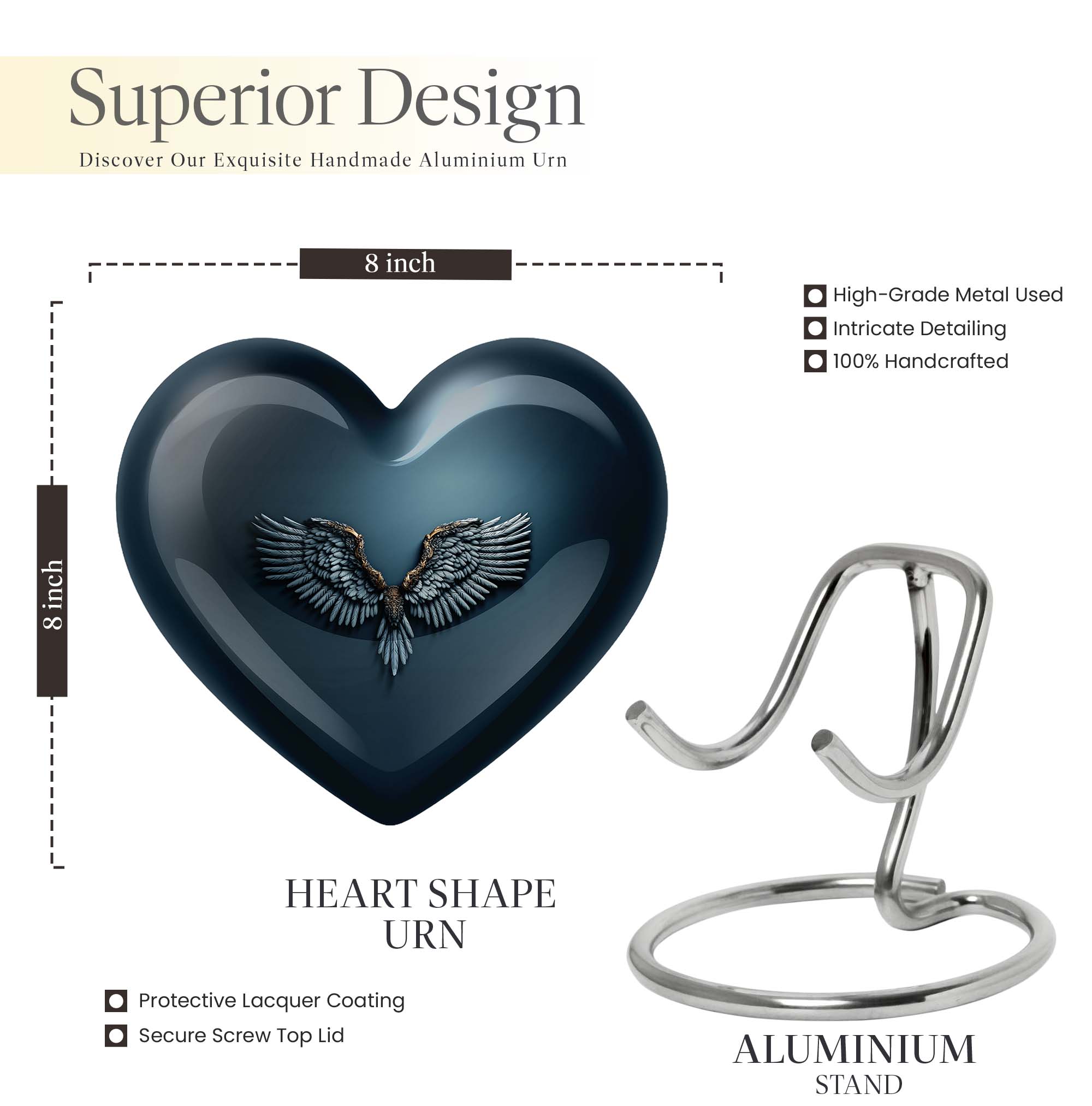 Celebrate and treasure the loving memories of your dear one with our Wings Blue Urn. This magnificent piece, a large urn designed for adults and seniors, is meticulously crafted from high-quality aluminum. It demonstrates an impressive weight of 3.3 pounds and surpassed expectations in the measurement department, standing tall at 10 inches high. Our Wings Blue Urn remarkably holds up to 200 cubic inches, deeming it perfect for preserving ashes. Exuding a heartshape, it carries a graceful butterfly theme symbolizing renewal, transformation, and eternal love. Your package will include a plush velvet pouch specifically intended for safe and dignified containment of ashes. Make it all the more special through our custom engraving service - you get the chance to personalize your memorial funeral urn with your cherished one's name. This cremation urn is not only for display but also ideal for burial. Tastefully designed, it underscores respect, love, and remembrance. Honour your loved one's memory uniquely and soothingly with our Wings Blue Urn.