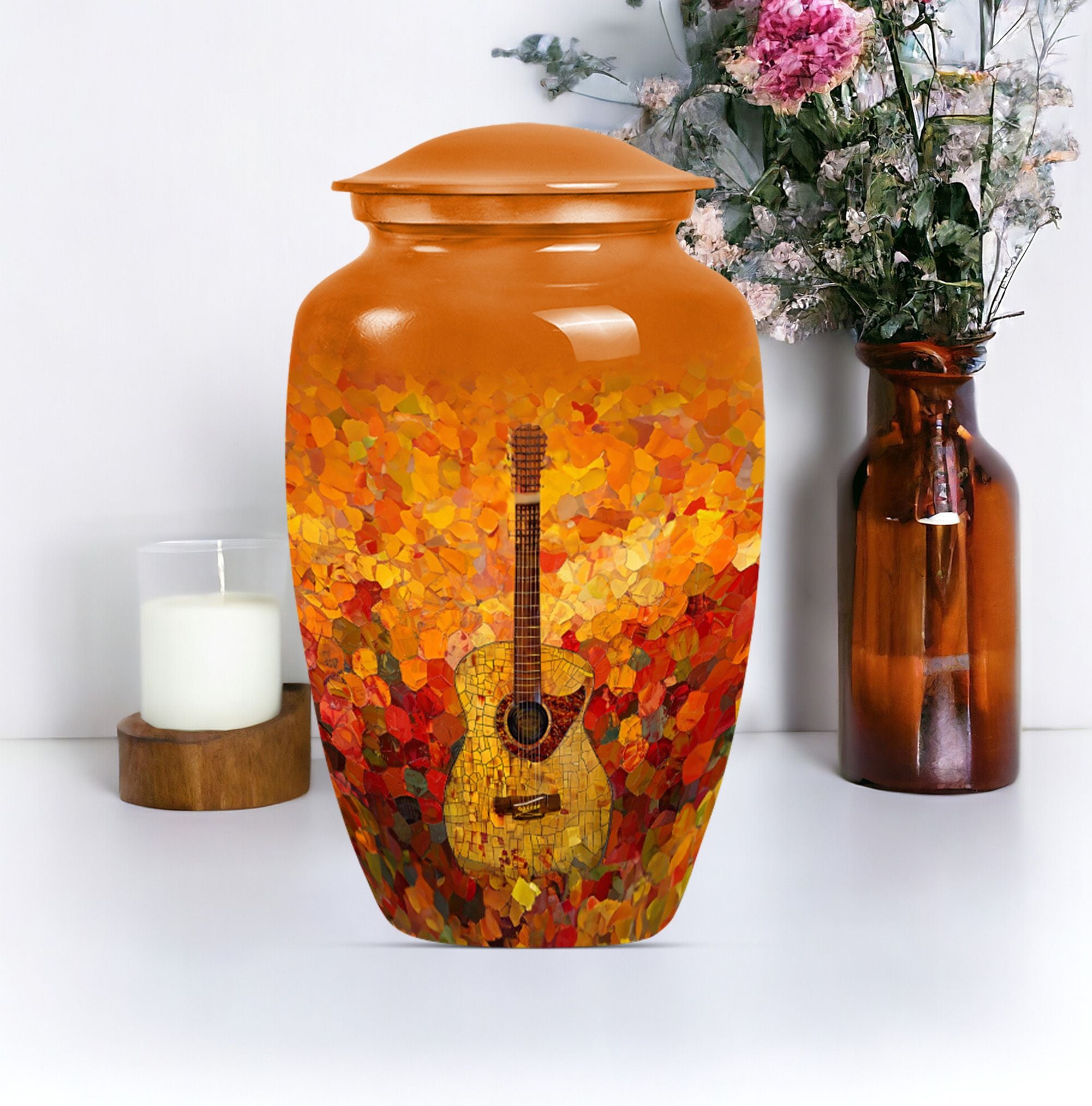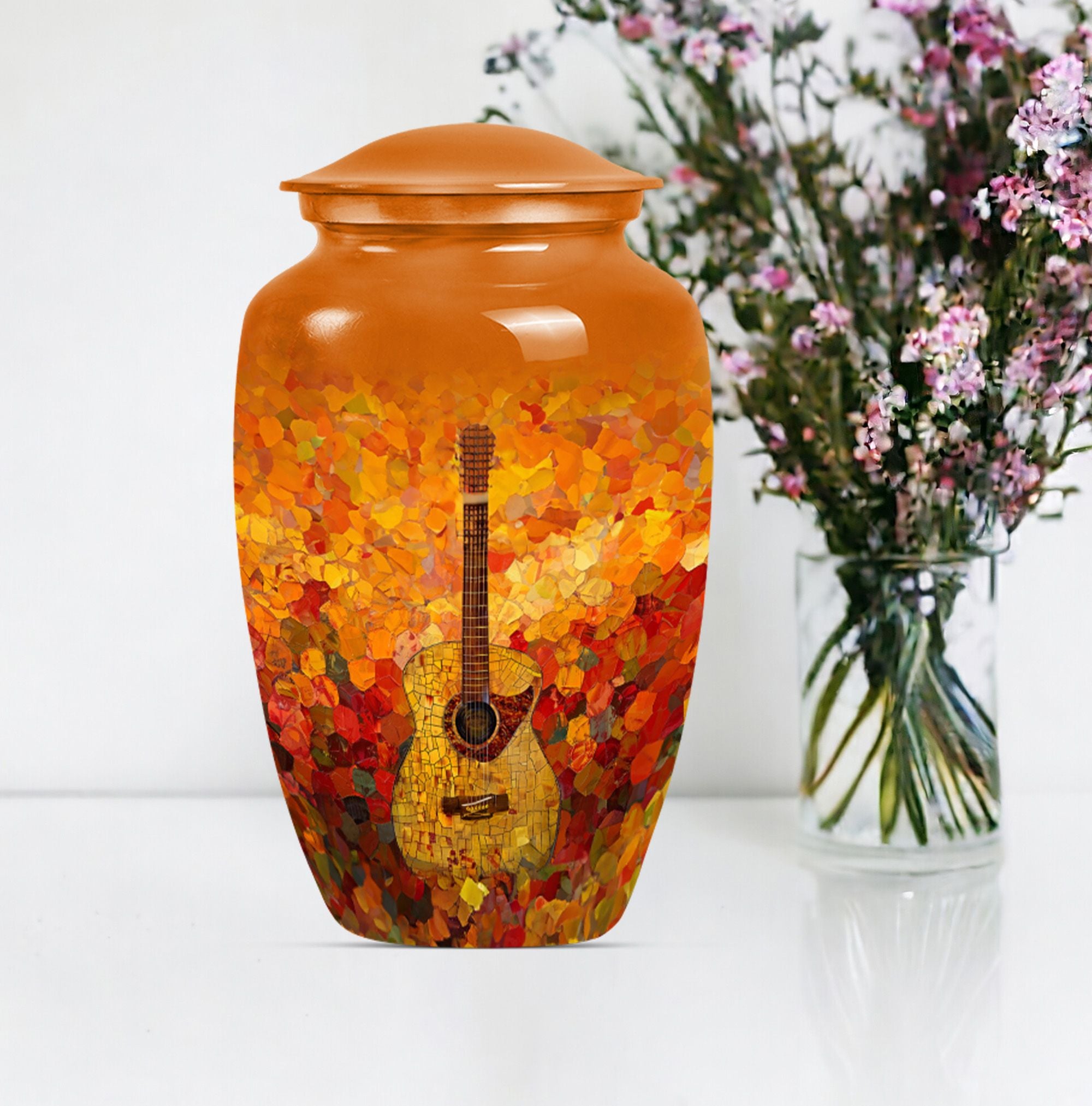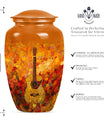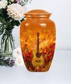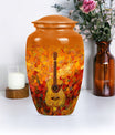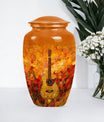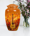Remember your loved one with an artefact as extraordinary as they were. This crowning 10-inch crafted 'Guitar Urn' is the perfect cremation urn for adults. At 3.3 pounds with a 200 cubic inches capacity, it's more than just an urn for ashes—it's about keeping memories alive. Exhibiting an abstract theme, this large urn is fabricated from sturdy and lasting aluminium, symbolizing everlasting love and remembrance. Uniquely catered towards both male and female, it also qualifies as an elegant companion urn for two adults. Its size is perfect for display, or secure storage in the included velvet pouch. Personalize it with engraved names, adding a touch of intimacy and uniqueness. Complementing every space, this classic urn encapsulates cherished memories with integrity. Celebrate your loved one's life with this large metal urn, a special container for those irreplaceable ashes and ineffable memories.